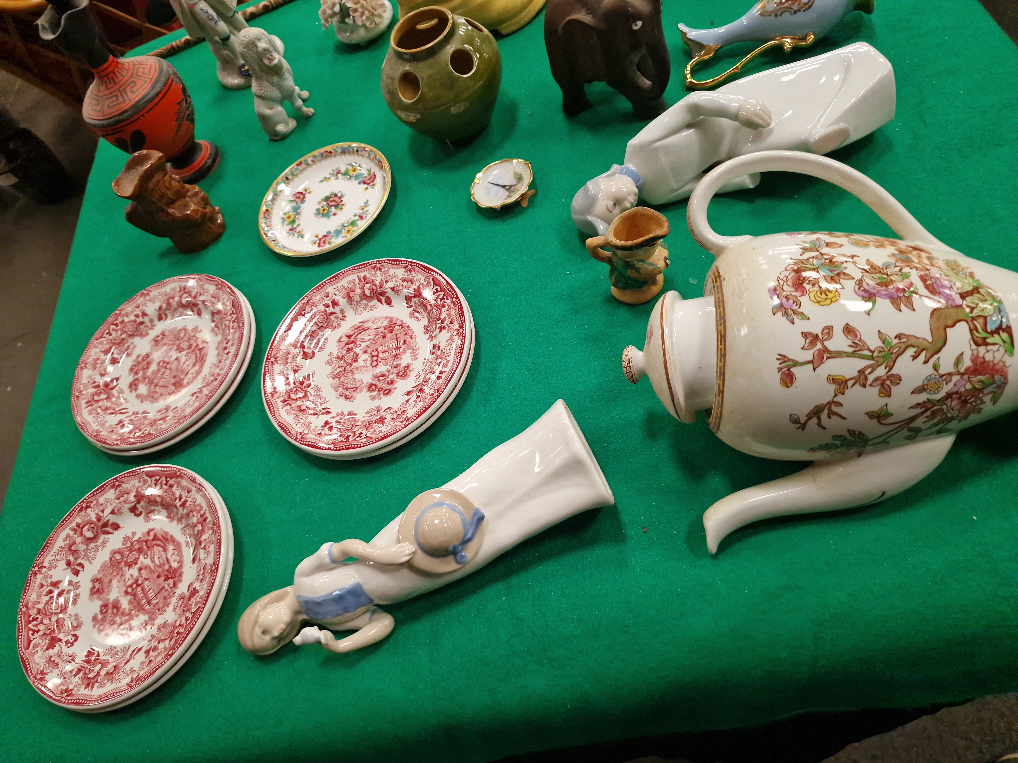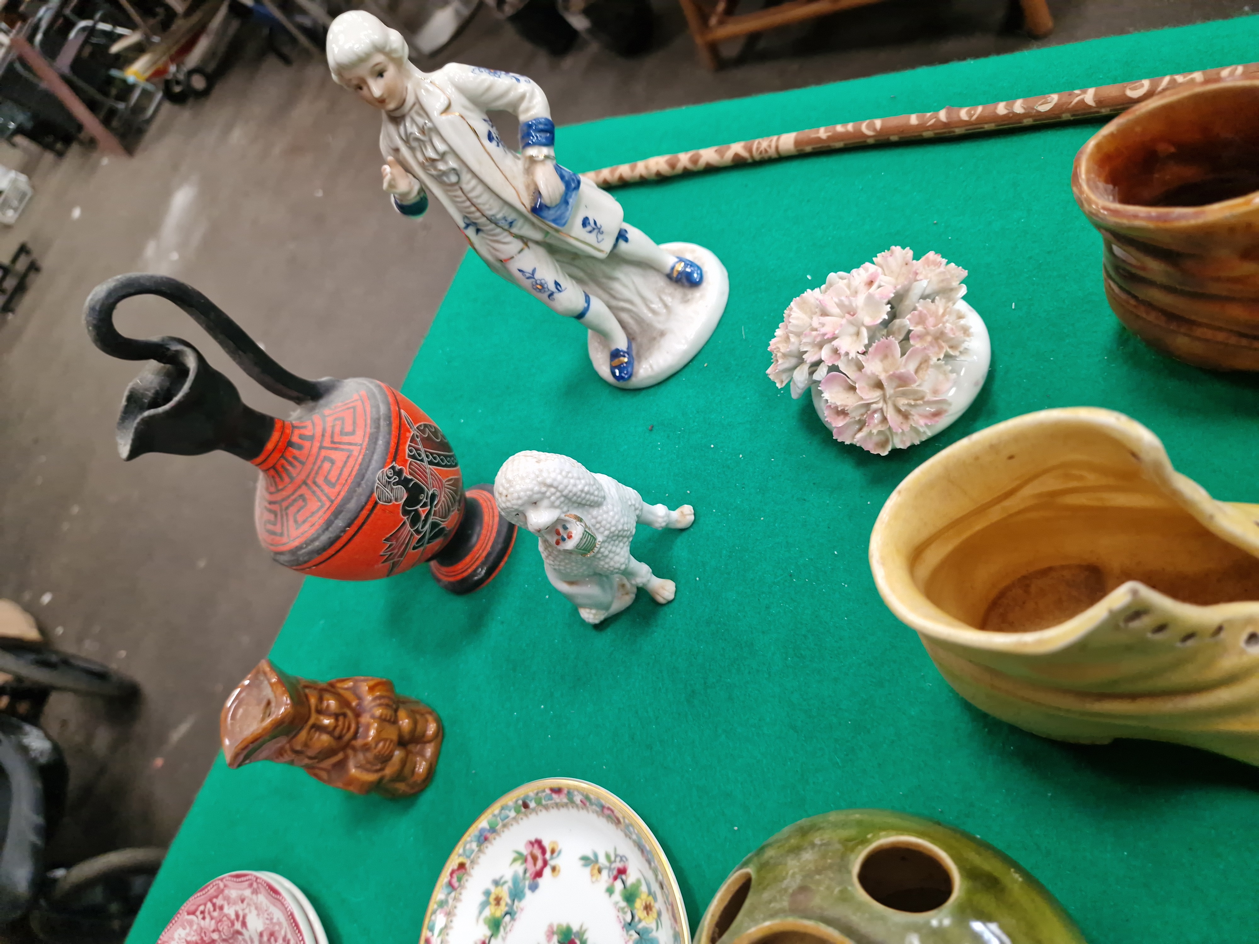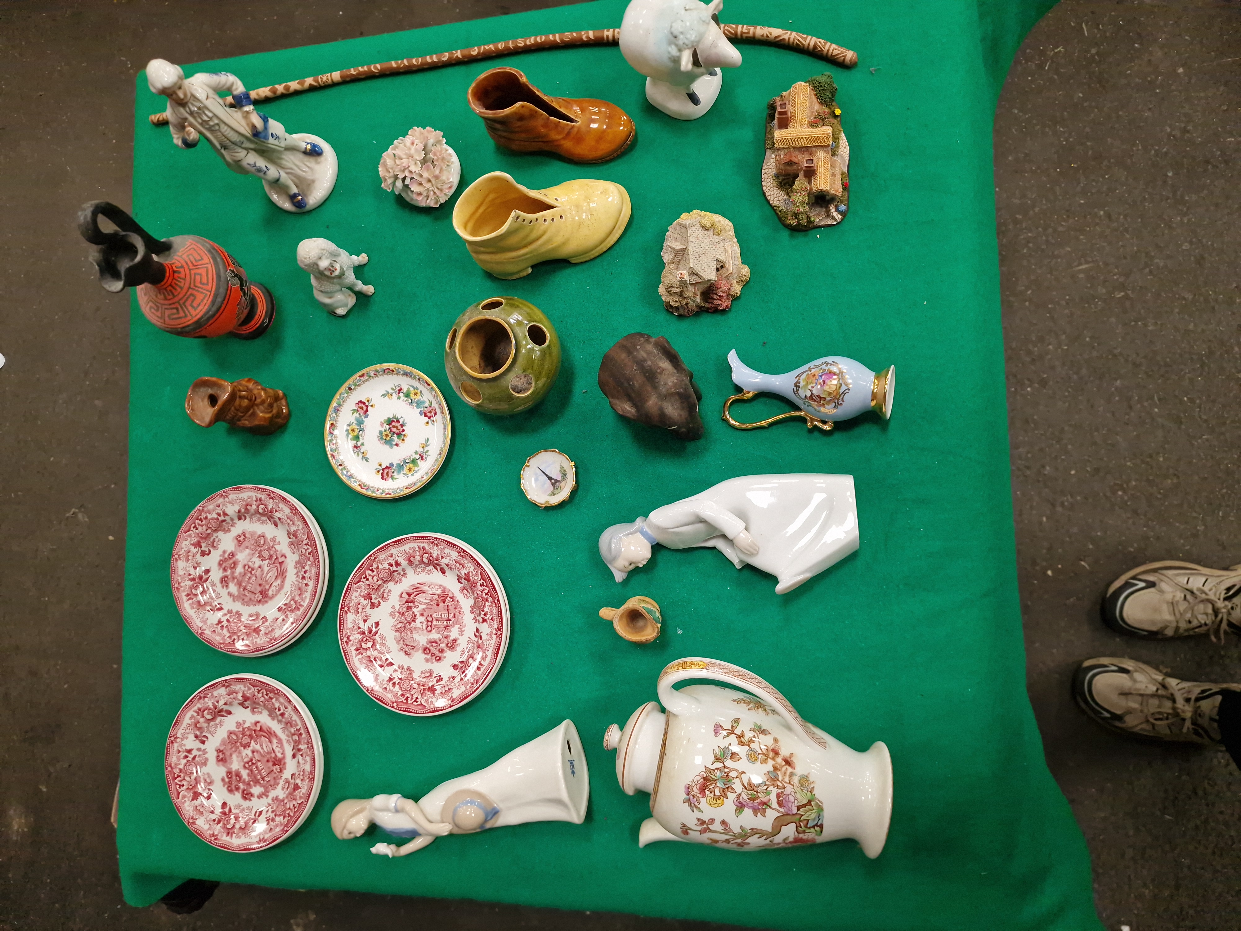 This lot comprises a diverse collection of decorative ceramics, miniature collectibles, and miscellaneous items. The ceramic selection includes a large porcelain teapot with a white ground, decorated with bird and flowering branch motifs and finished with gilt detailing to the handle, spout, and finial. Tableware consists of several earthenware plates featuring red transfer-printed pastoral scenes, a small circular porcelain dish with a scalloped gilt rim and central floral spray, and a light-blue glazed porcelain ewer with a central floral medallion. Figurines include an 18th-century style gentleman in a white and blue frock coat, two reclining female figures in white and blue attire, a small white porcelain poodle, and a sheep figurine. Decorative items feature a Greek-style red-figure lekythos with a meander pattern, a green-glazed earthenware flower frog, two glazed earthenware boot-form ornaments, a small character jug, and a porcelain floral ornament depicting pink carnations. The lot also contains two detailed polychrome resin architectural miniatures in the style of Lilliput Lane, depicting a thatched cottage and a stone building with a bay window. Additional items include a small circular gold-toned frame with an image of the Eiffel Tower, a dark-coloured figure of an elephant, and a wooden walking stick featuring a carved shaft with various symbols and patterns.