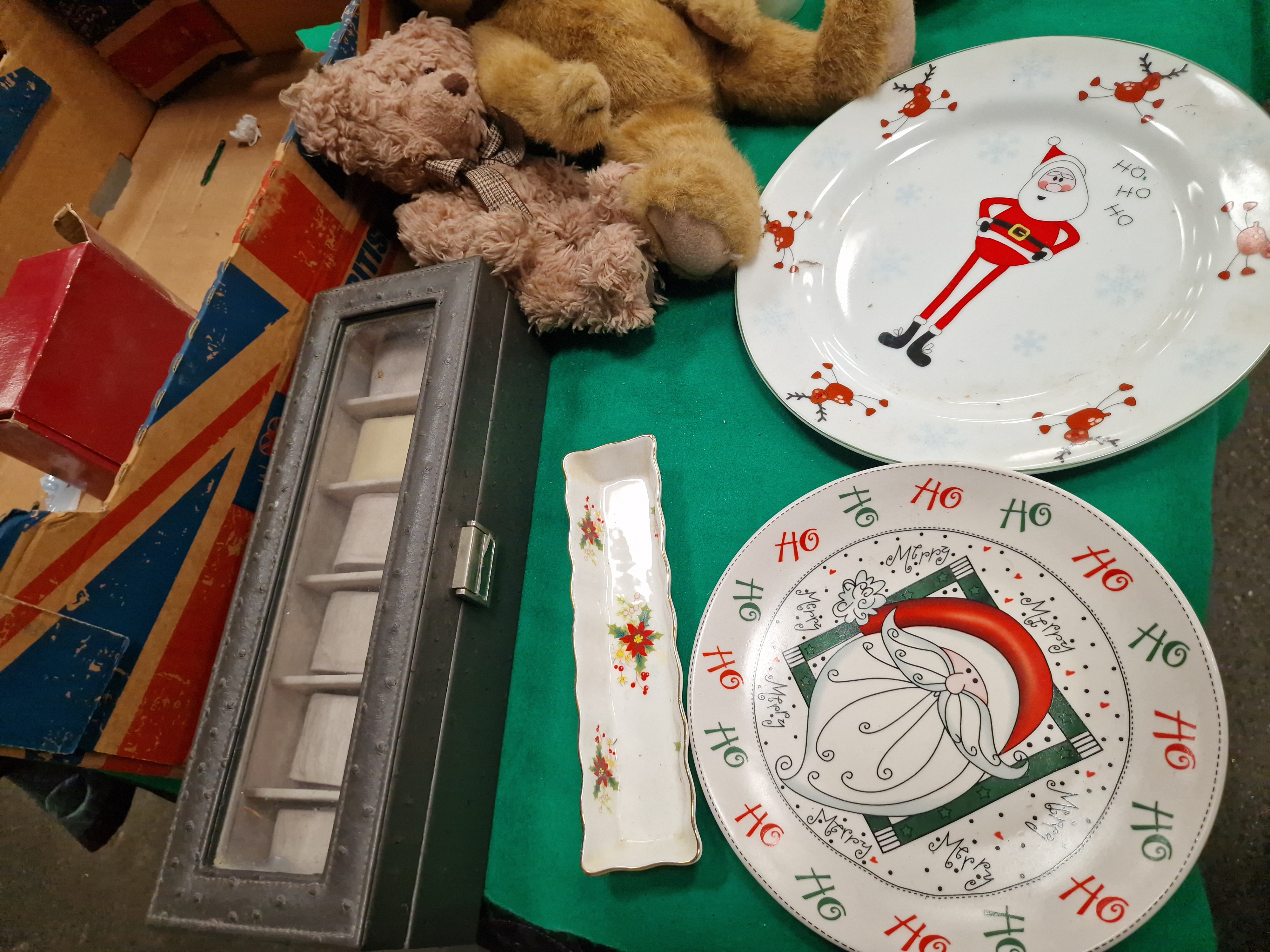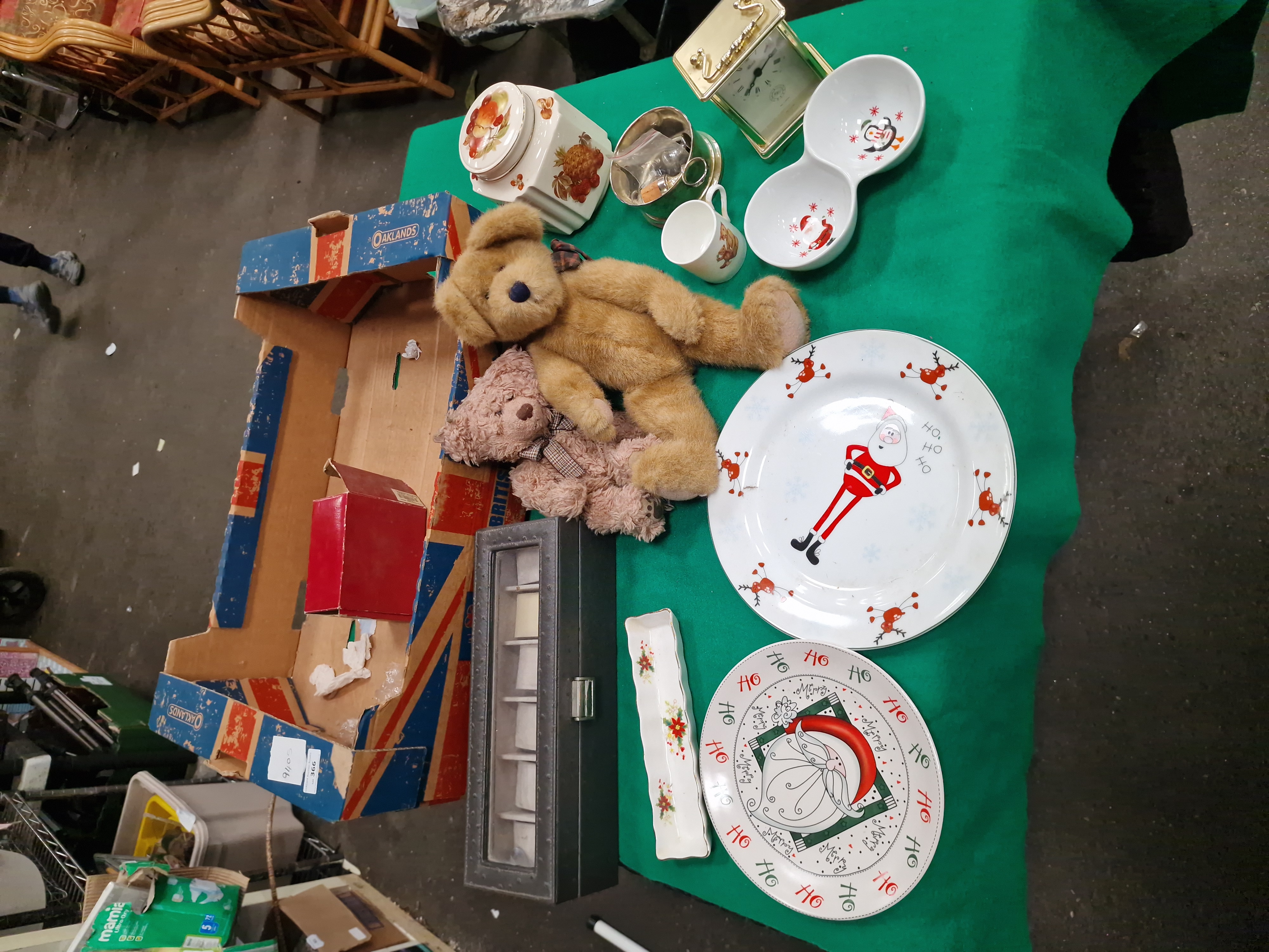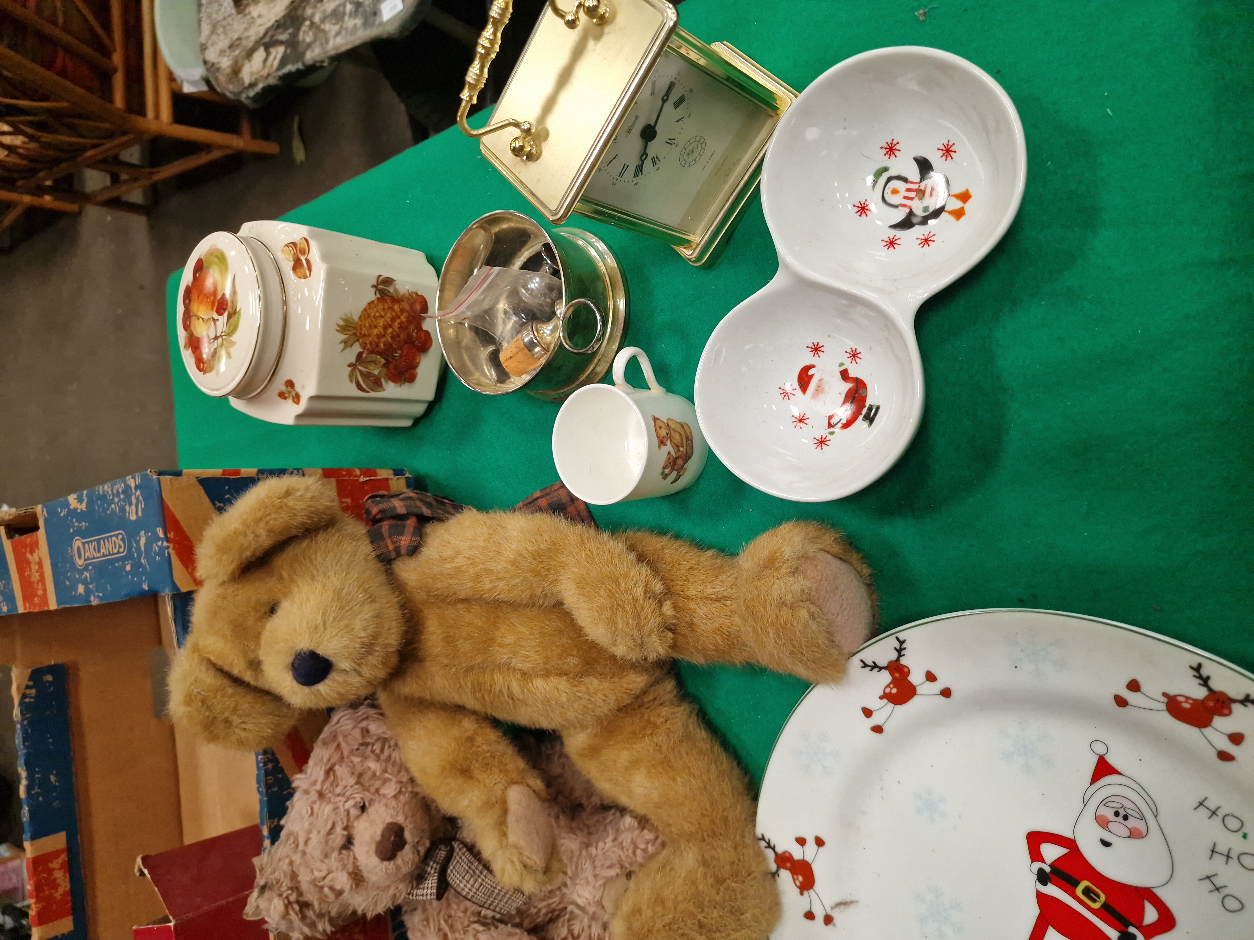 An assortment of decorative and household items, primarily featuring festive themes. The ceramic components include multiple white plates with transfer-printed Santa Claus motifs and HO HO HO text, a rectangular dish with a holly and poinsettia pattern, a double-well bowl with penguin and Santa decorations, and a small mug with a teddy bear illustration. The collection also contains a hexagonal white ceramic canister with fruit decals and a small silver-toned metal bowl. Horological items include a brass-cased carriage-style mantel clock with a white dial and Roman numerals, featuring markings to the face that are not clearly legible. The lot is accompanied by two plush teddy bears, one in golden-brown and one in textured pink. Storage solutions include a rectangular grey jewellery or watch display box with a glass lid and six interior compartments, a red cardboard box, and a large OAKLANDS branded cardboard crate with Union Jack graphics.