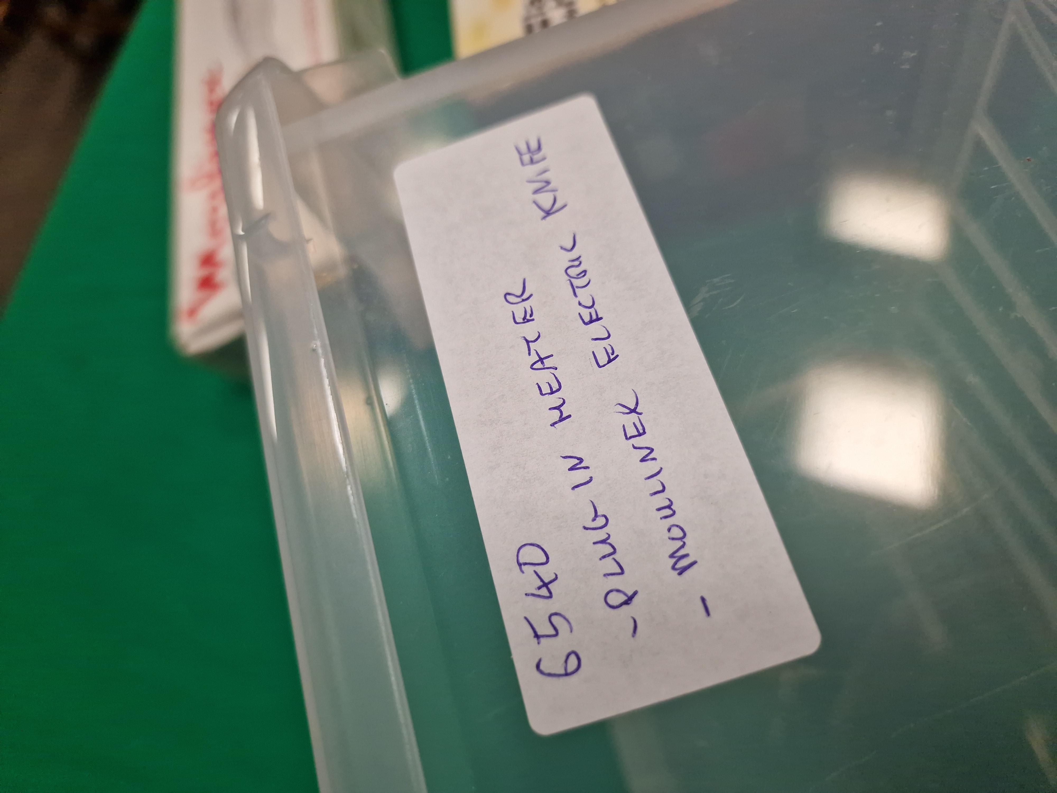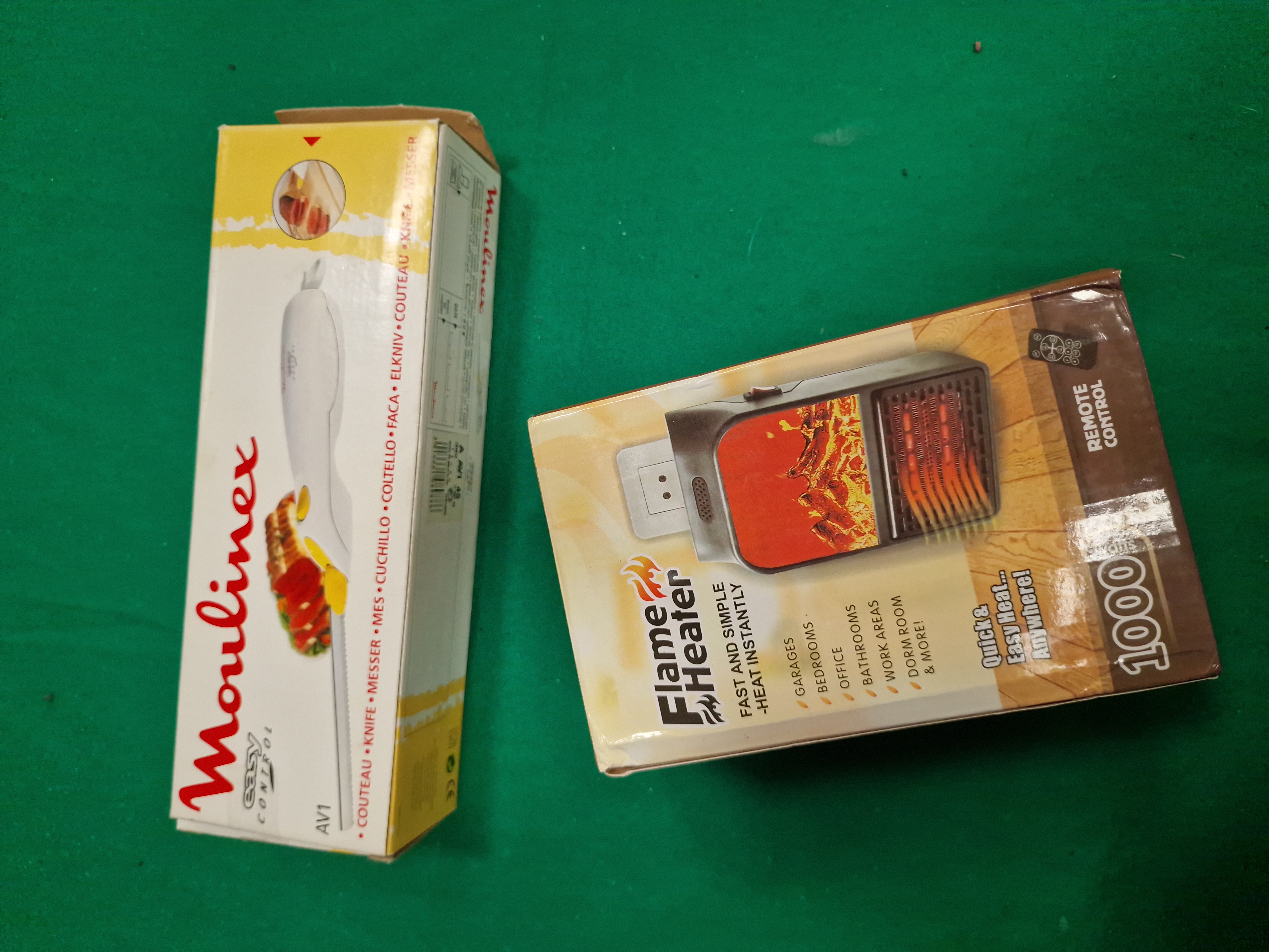 A Moulinex Easy Control AV1 electric knife and a Flame Heater portable plug-in heater, accompanied by a plastic storage container. The Moulinex electric knife, model AV1, is constructed with a plastic housing and is presented in its original retail box. The Flame Heater is a 1000-watt compact unit featuring a plastic casing and includes a remote control as indicated by the packaging. This heater is designed for direct plug-in installation. The lot includes a clear plastic storage bin featuring a handwritten label identifying the contents as 6540 – PLUG IN HEATER – MOULINEX ELECTRIC KNIFE.