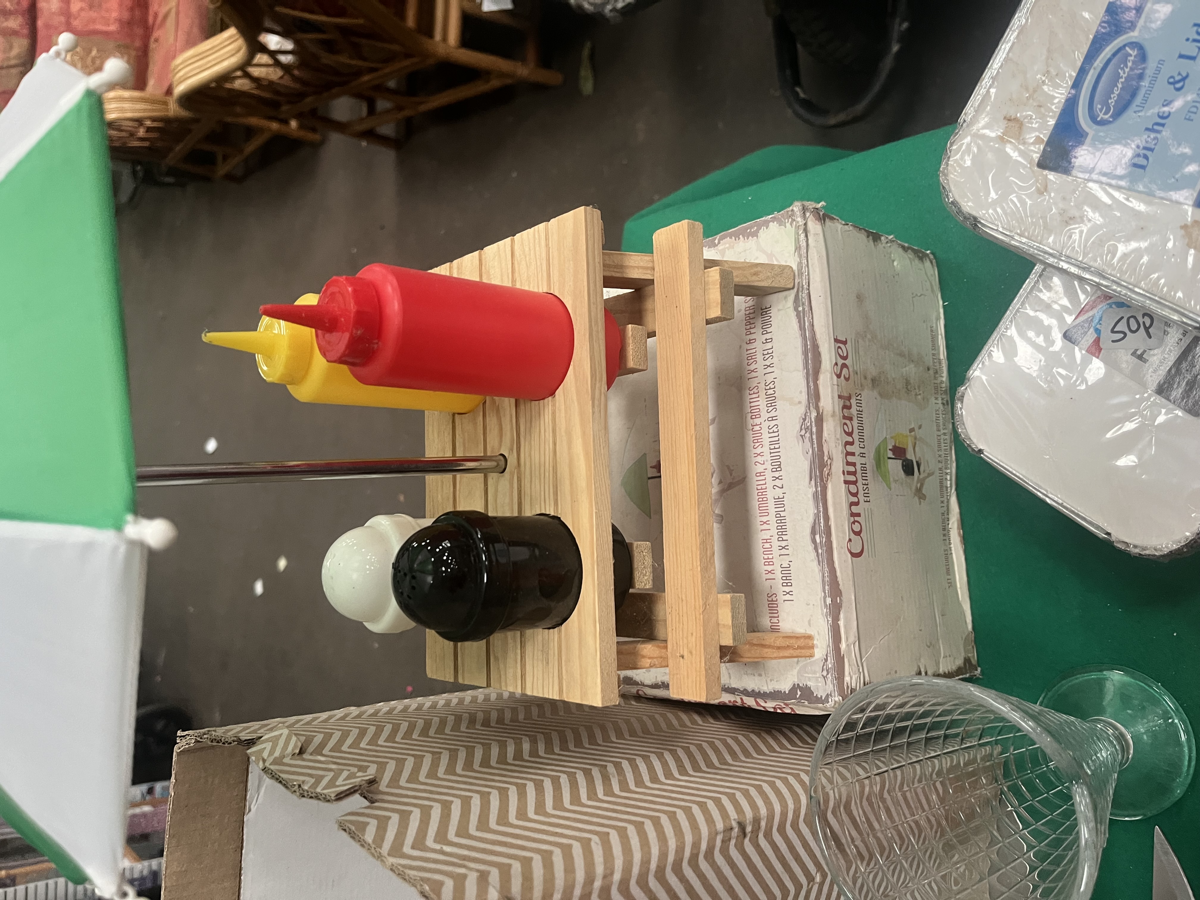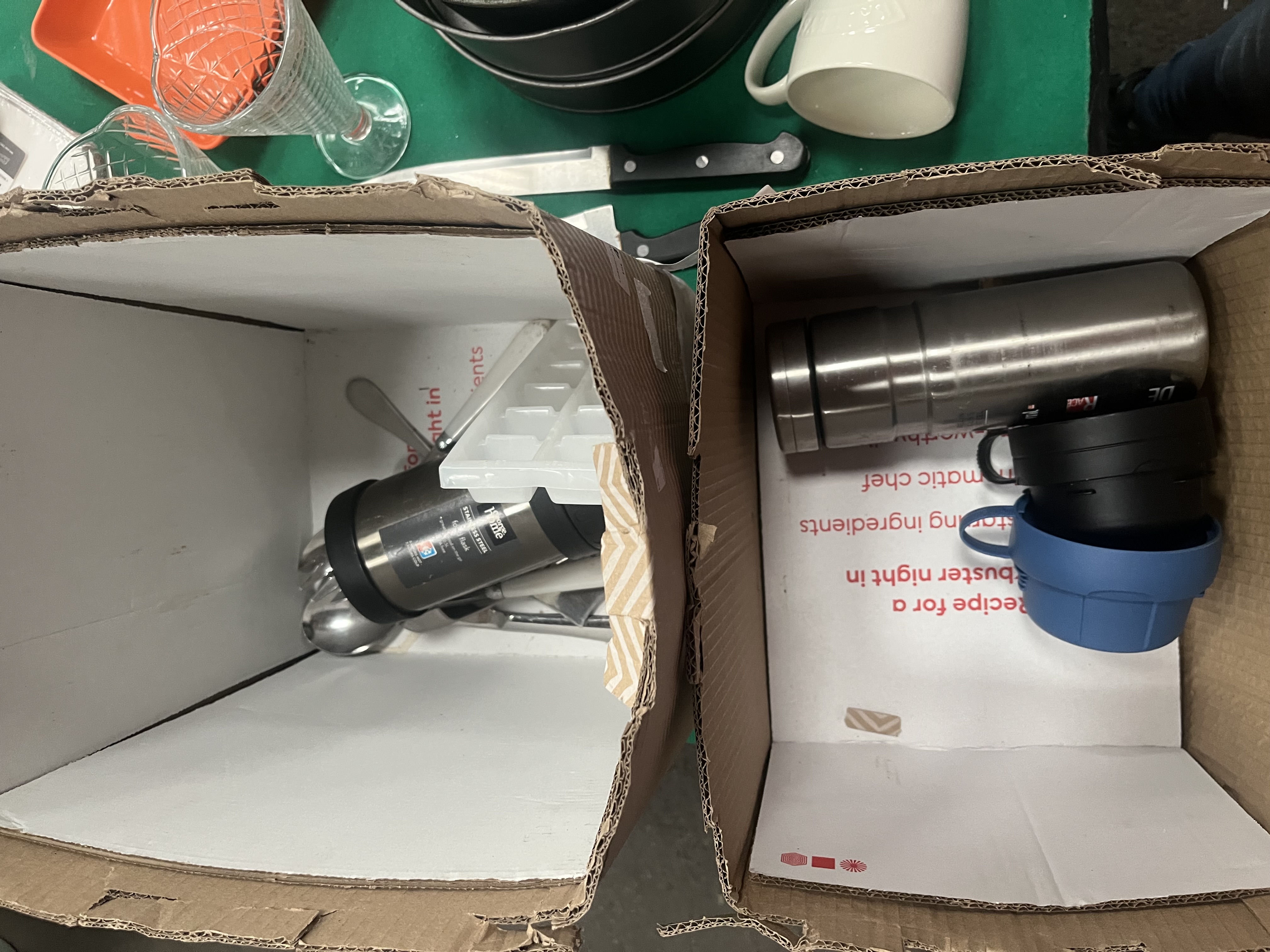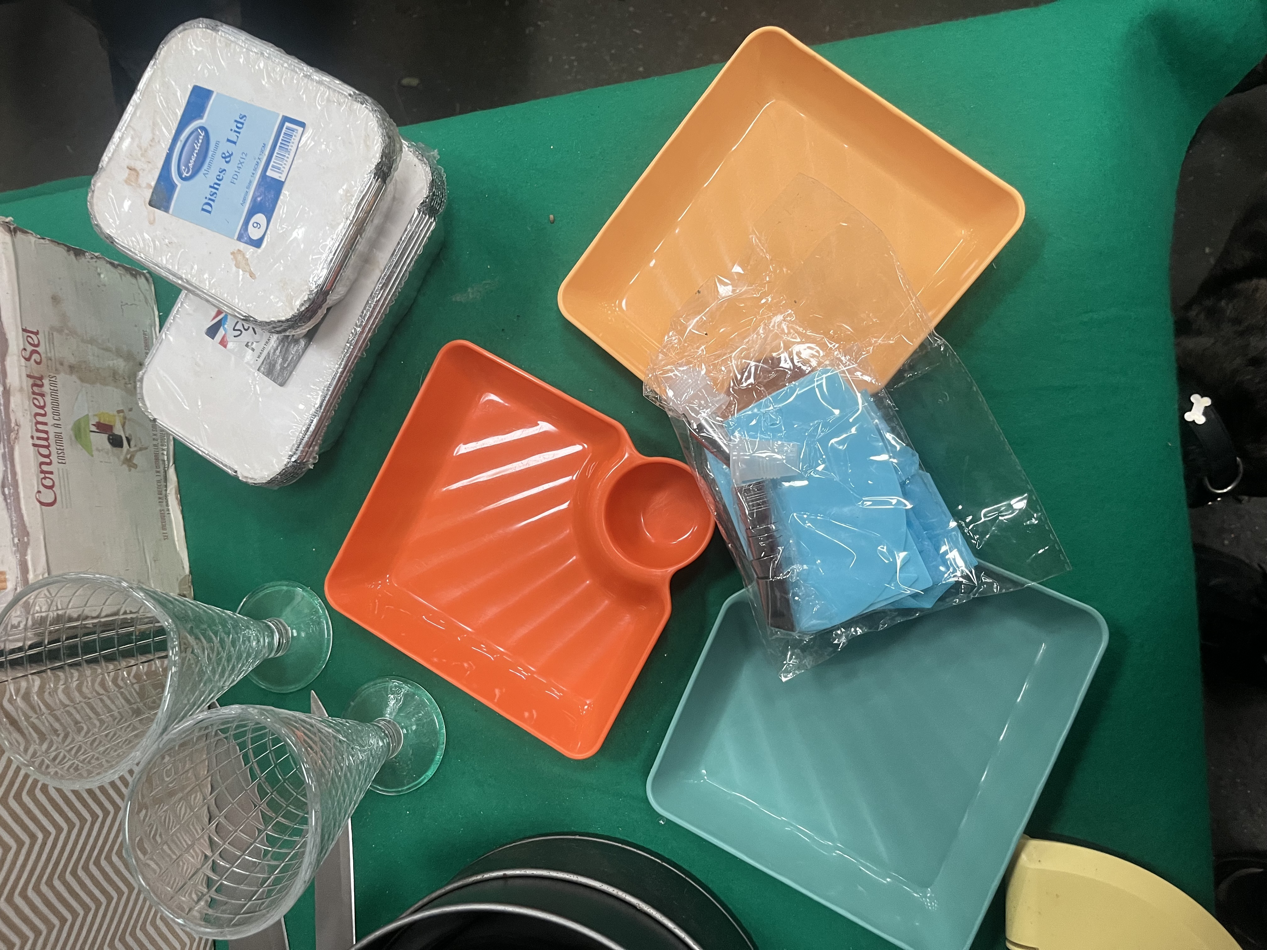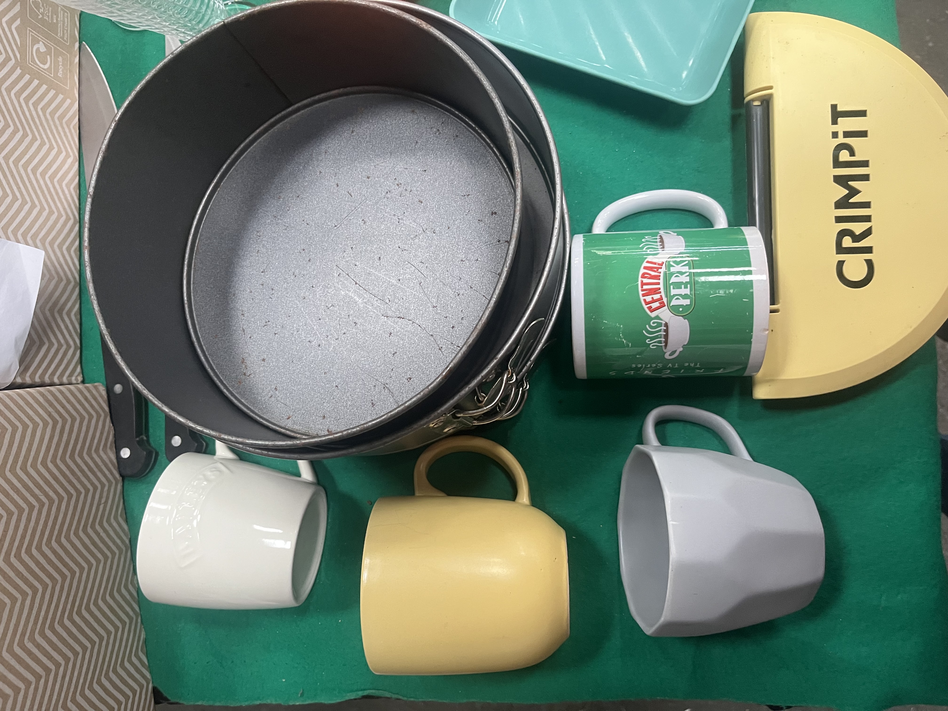 An assortment of contemporary kitchenware and household items. The collection includes a group of ceramic mugs featuring a green Central Perk Friends TV series mug, a grey faceted mug, and plain glazed mugs in yellow and cream. Bakeware consists of a pair of nested circular non-stick springform cake tins and a yellow plastic Crimpit sandwich-sealing tool with the brand name embossed on the lid. Tableware includes a pair of clear pressed-glass goblets featuring a diamond lattice pattern and a trio of square plastic picnic-style plates in orange, teal, and peach. A novelty condiment set is included in its original retail box, containing a wooden picnic bench stand, red and yellow plastic sauce bottles, black and white salt and pepper shakers, and a green and white striped parasol. Storage and utility items comprise a pair of factory-sealed packs of Essential brand aluminium foil dishes with lids, a pair of stainless steel vacuum flasks including one bearing a Home brand sticker, a pair of stainless steel kitchen knives with black composite handles, and a white plastic ice cube tray.