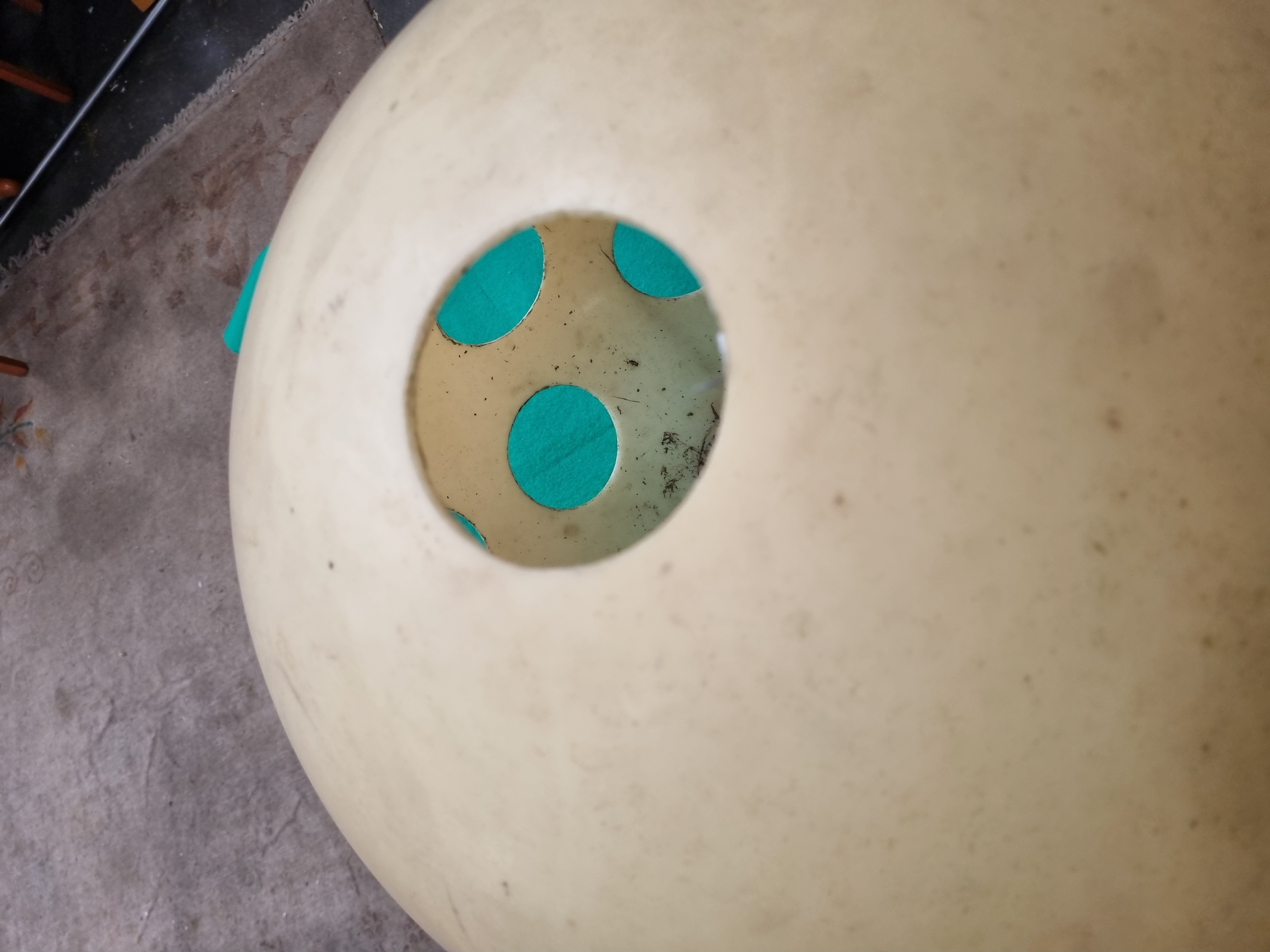 A large hollow spherical decorative object constructed from cream-coloured plastic. The form is punctuated by numerous circular apertures of varying diameters arranged in a geometric fashion. The item is designed with a matte-to-satin surface texture and a naturalistic speckled finish. It is likely intended for use as a light shade, architectural element, or sculptural garden feature. No factory marks or signatures are present. A small circular sticker is attached with the handwritten notation 103cm.