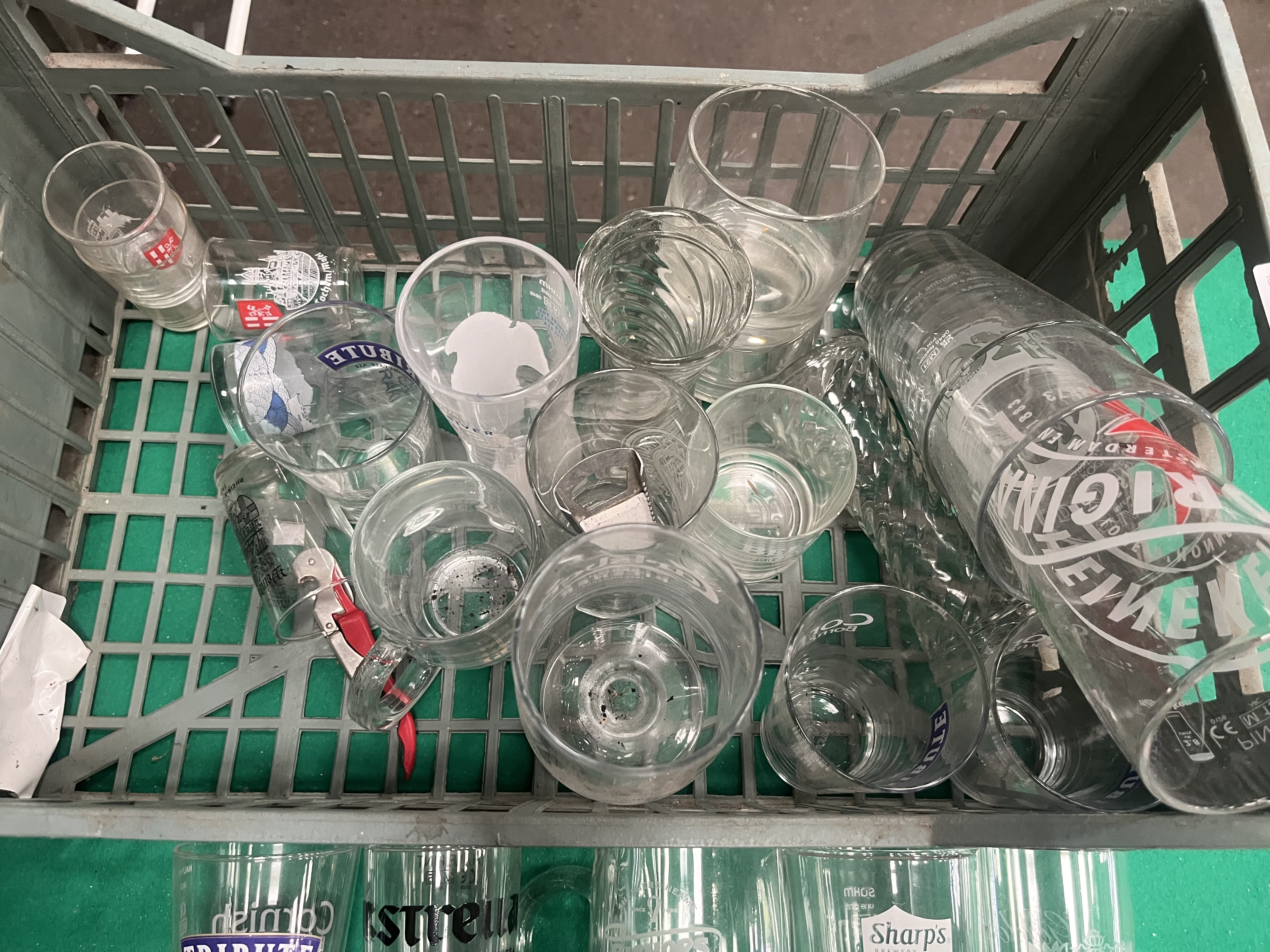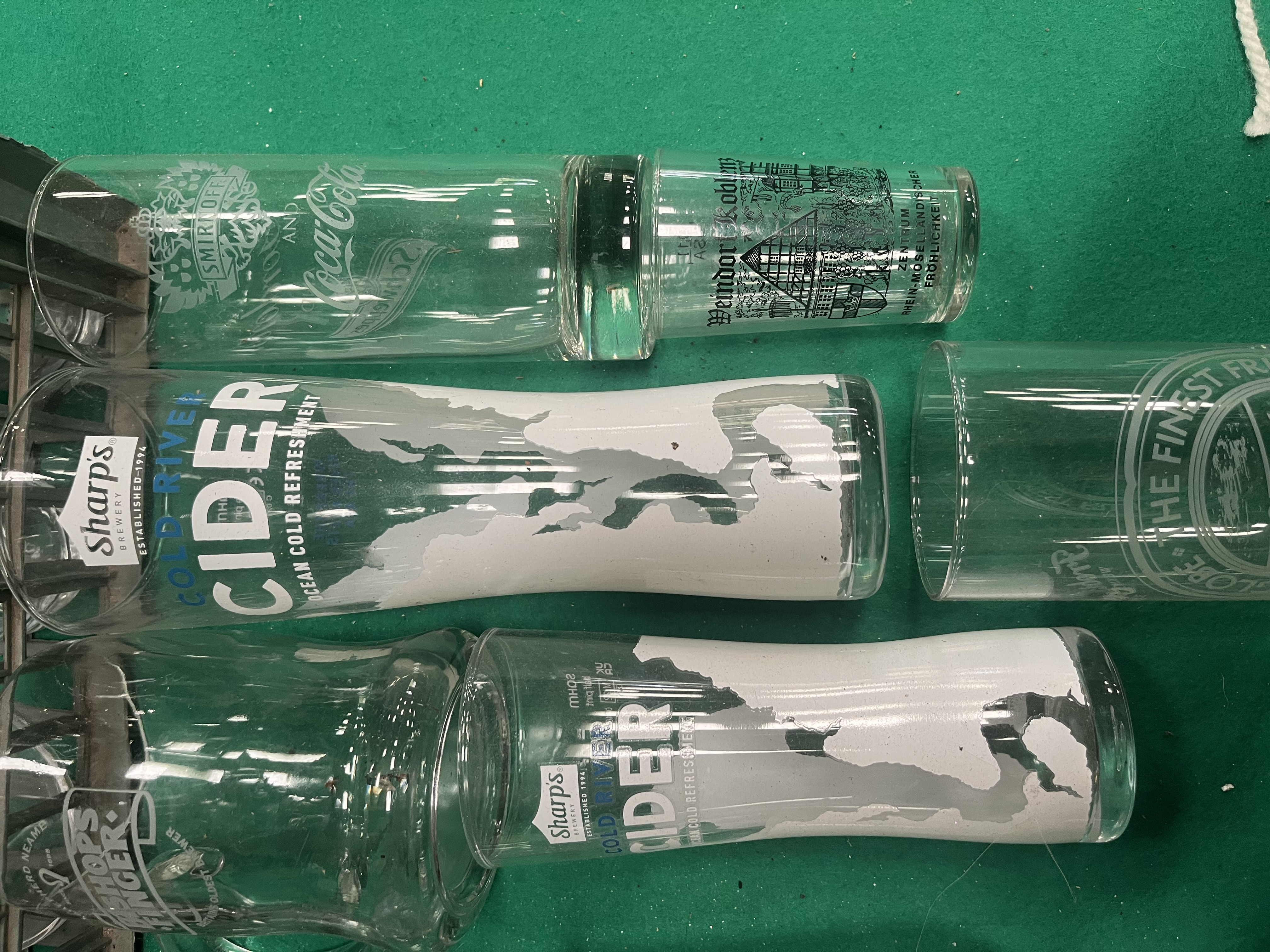 An assortment of approximately 20 commercial promotional glasses and a red-handled bottle opener. The lot comprises various styles including pint, half-pint, stemmed, and highball glasses. The clear glass bodies are decorated with printed polychrome and monochrome logos representing various British and international beverage brands. Visible markings include Sharp’s Brewery established 1994, Cold River Cider, Birra Moretti L’Autentica, Estrella Damm Barcelona, Tribute Cornish Pale Ale, and Bishop’s Finger Kentish Strong Ale. Also present are glasses branded for Heineken Original, Smirnoff and Coca-Cola, Yeni Raki featuring a wave design, and a German souvenir glass for Weindorf Koblenz. One glass features a generic Pure Quality fruit motif. The collection is contained within a grey plastic crate.