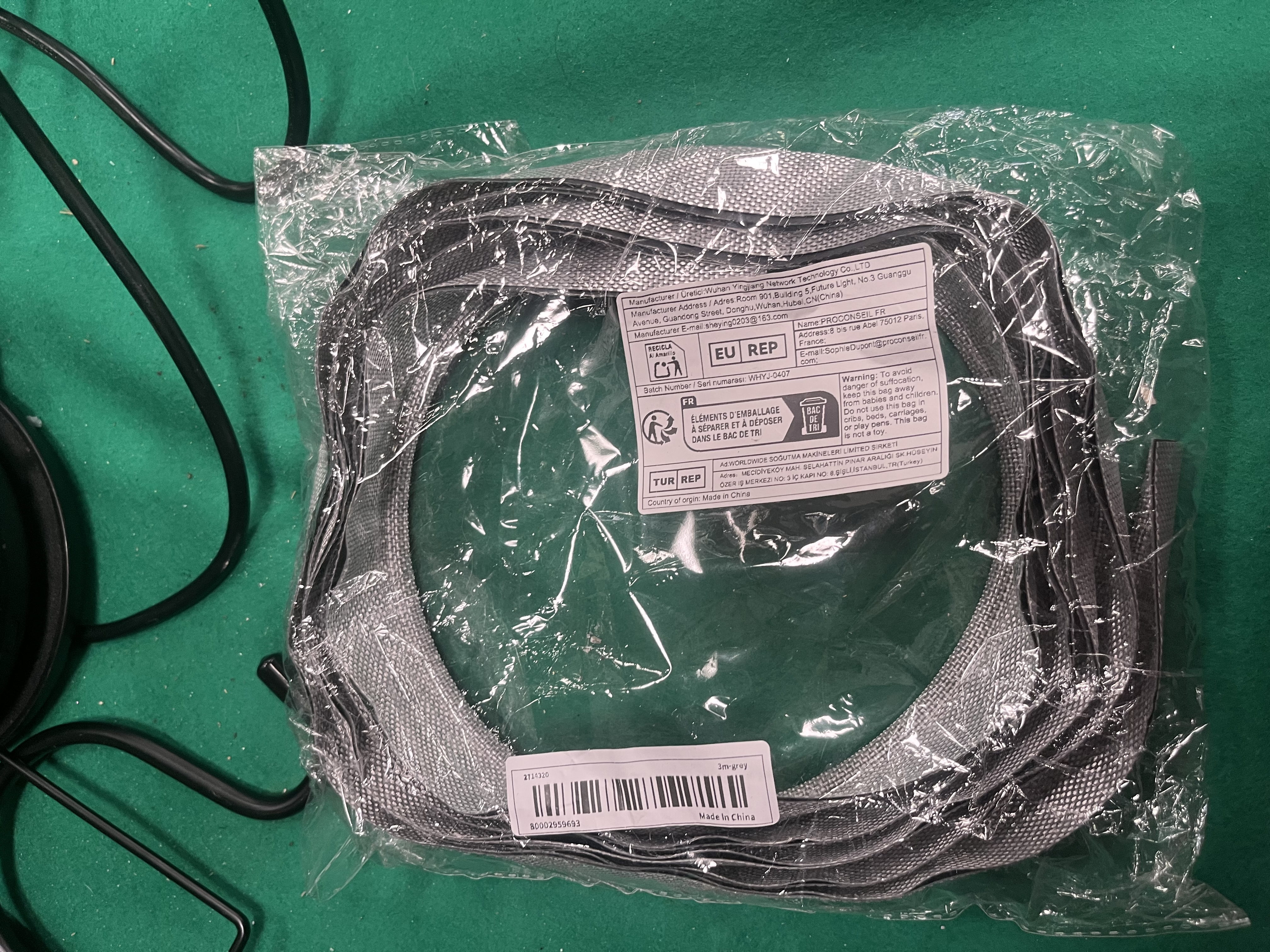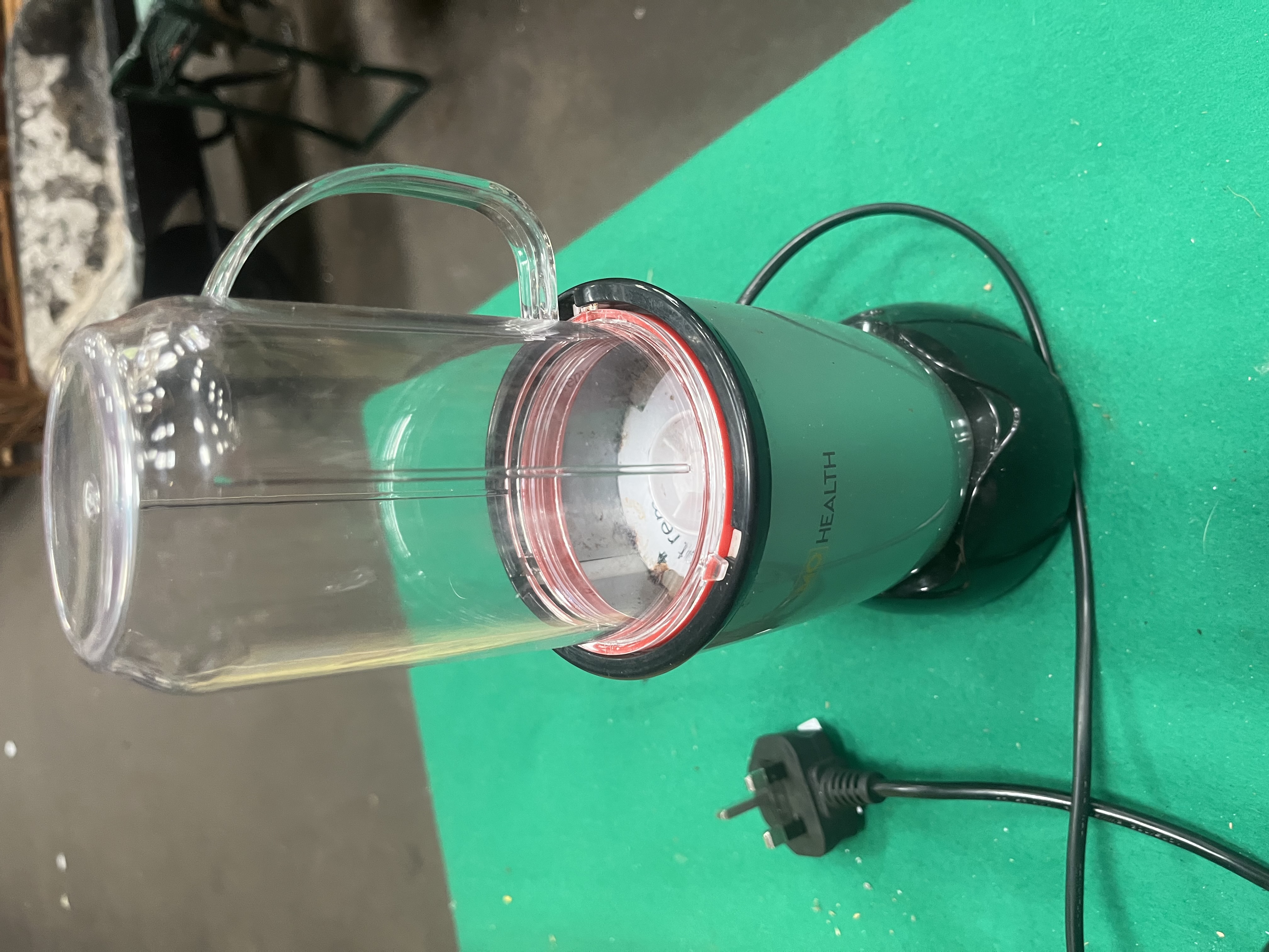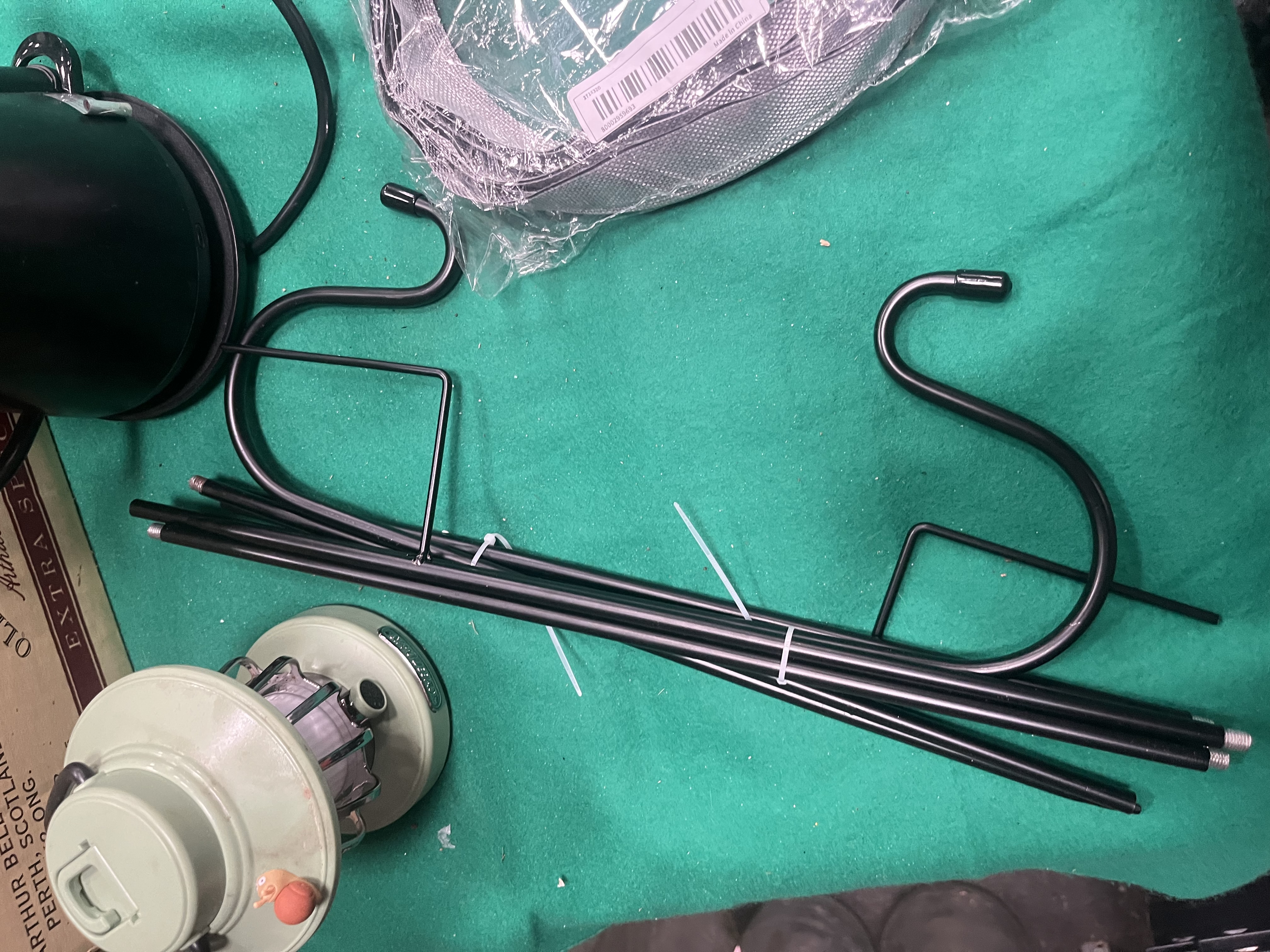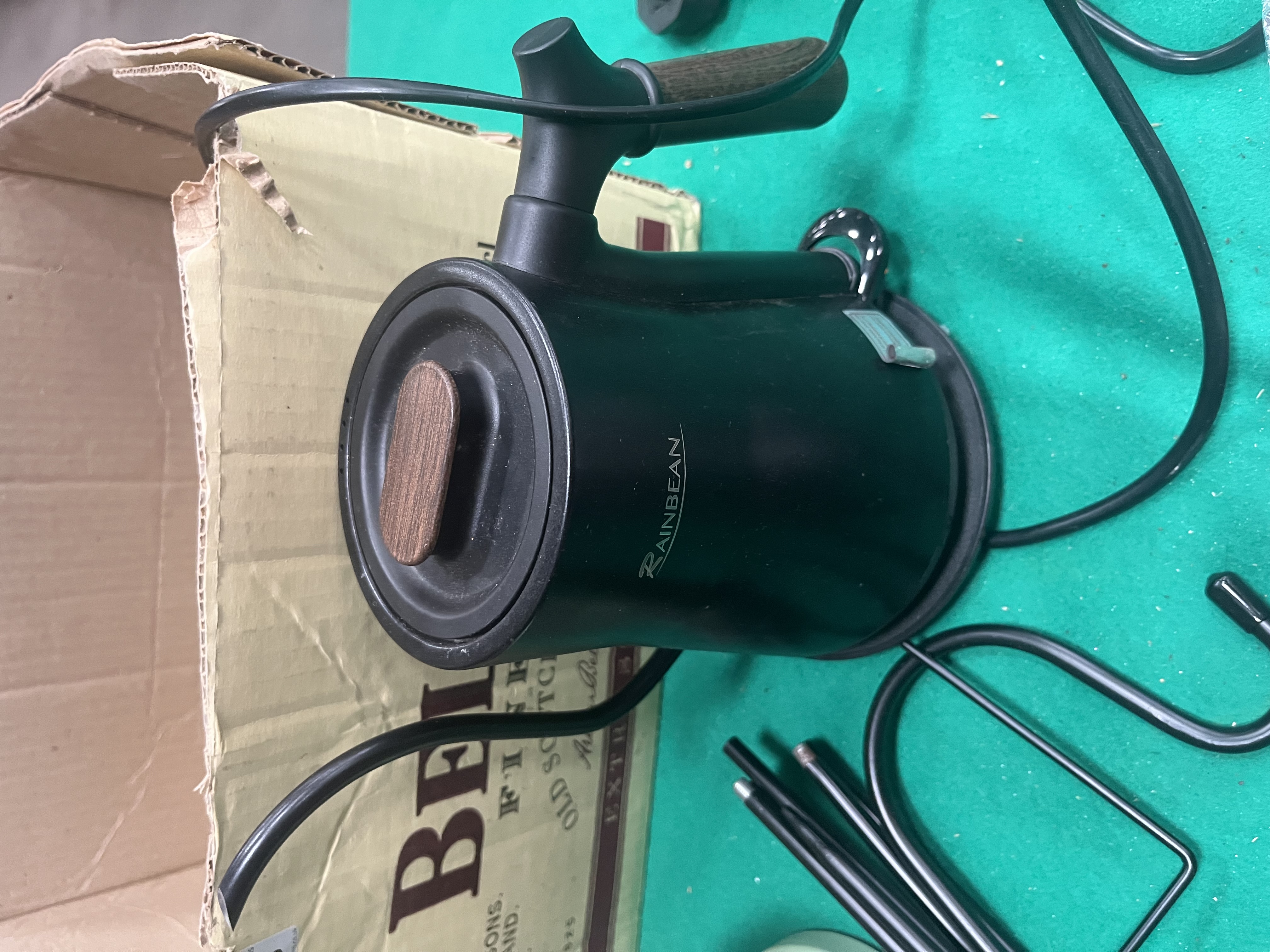 An assortment of household appliances and outdoor accessories. The lot includes an electric gooseneck kettle by Rainbean, finished in matte black with wood-effect accents on the handle and lid, provided with a matching power base. Also present is a Barebones LED camping lantern in a pistachio green finish, featuring a metal protective cage and a small decorative snail figure. The collection includes a personal blender with a black motor base and a clear plastic single-serve cup with an integrated handle, marked with the text HEALTH and partial text NUTRI, fitted with a UK 3-pin plug. Further items include a set of black metal sectional poles and shepherd’s style garden hooks, and a roll of grey mesh screen material in original packaging, labelled for Wuhan Yingjiang Network Technology Co., Ltd. The items are housed in a Bell’s Whisky cardboard box.
