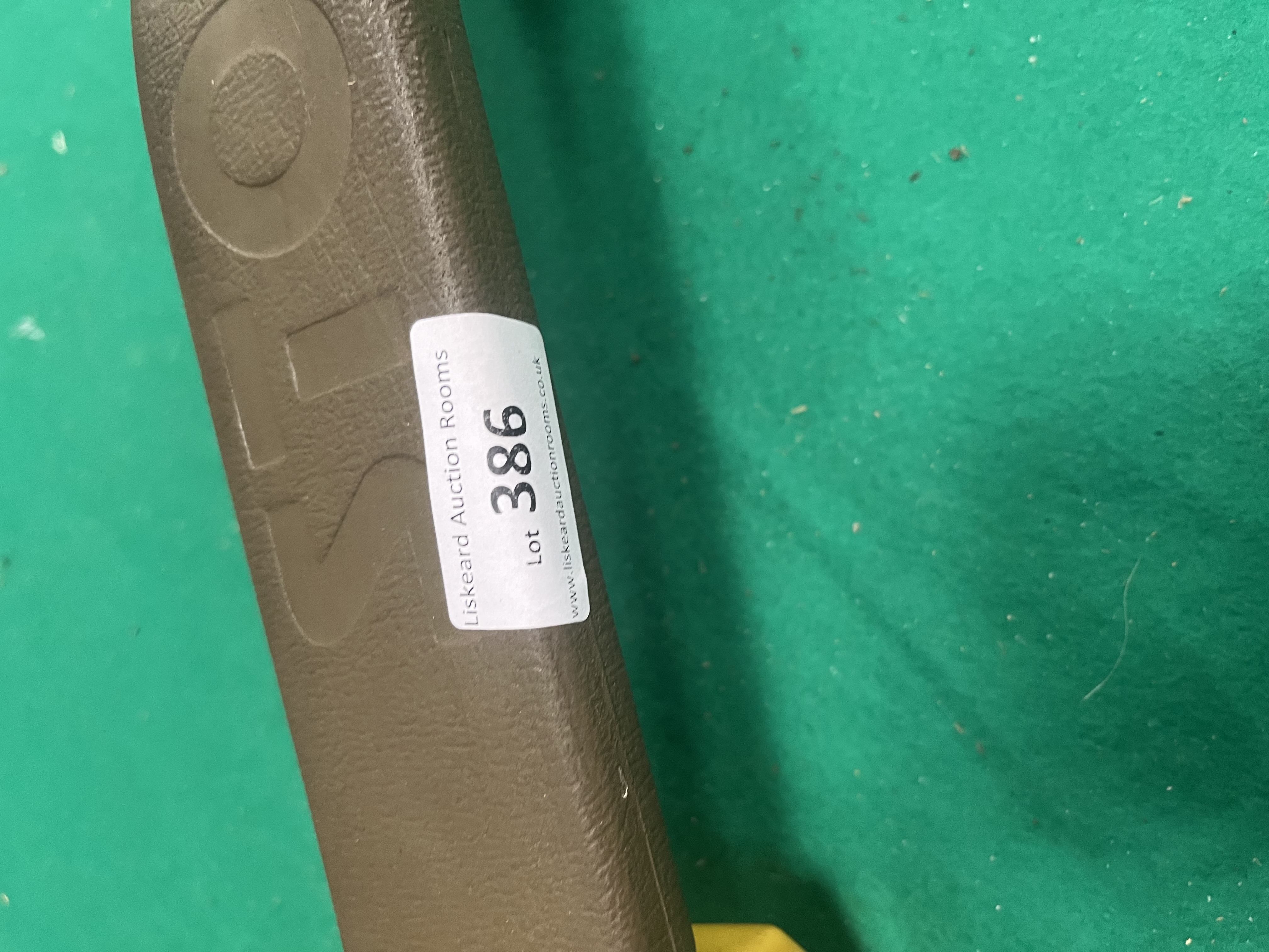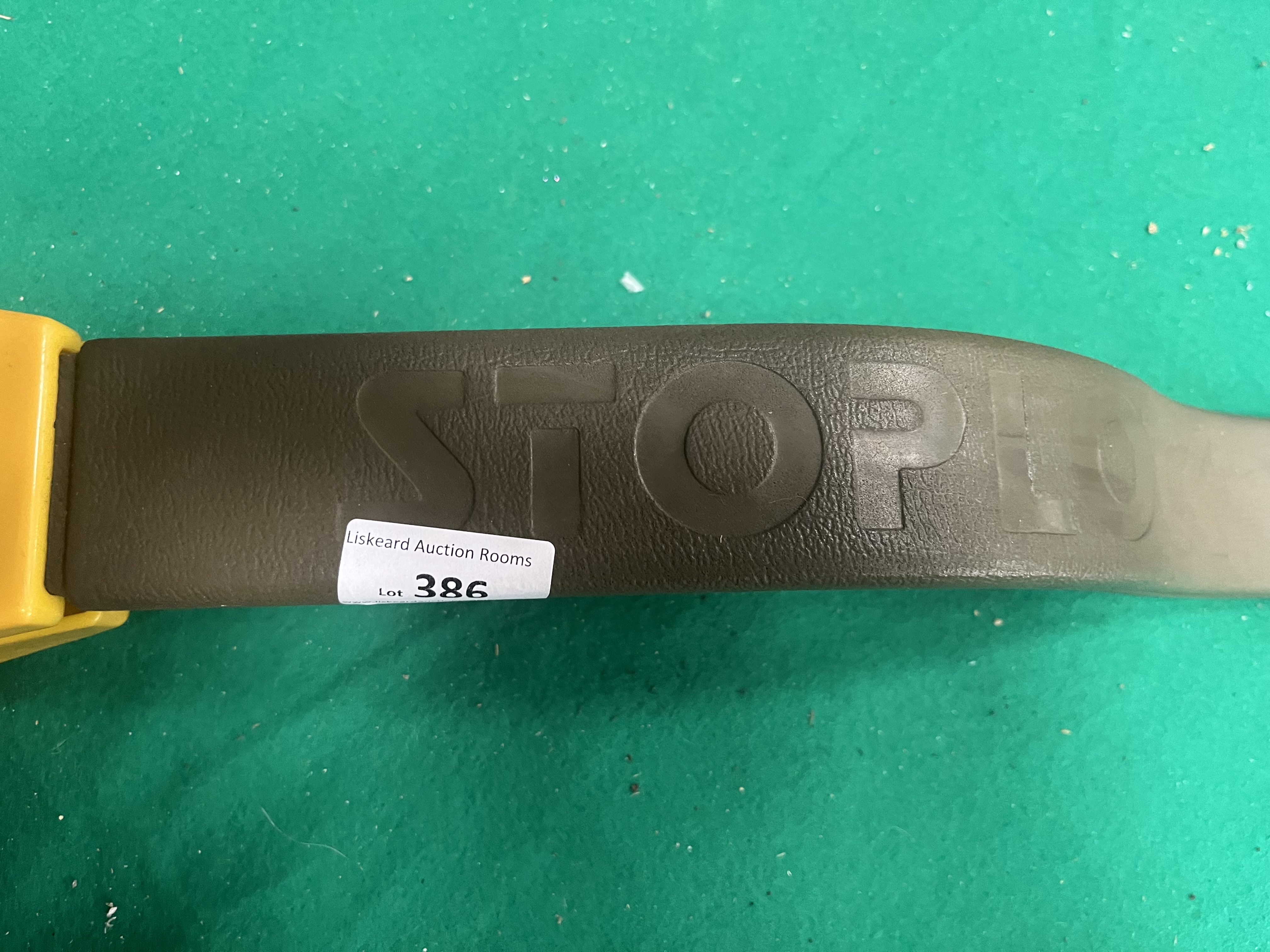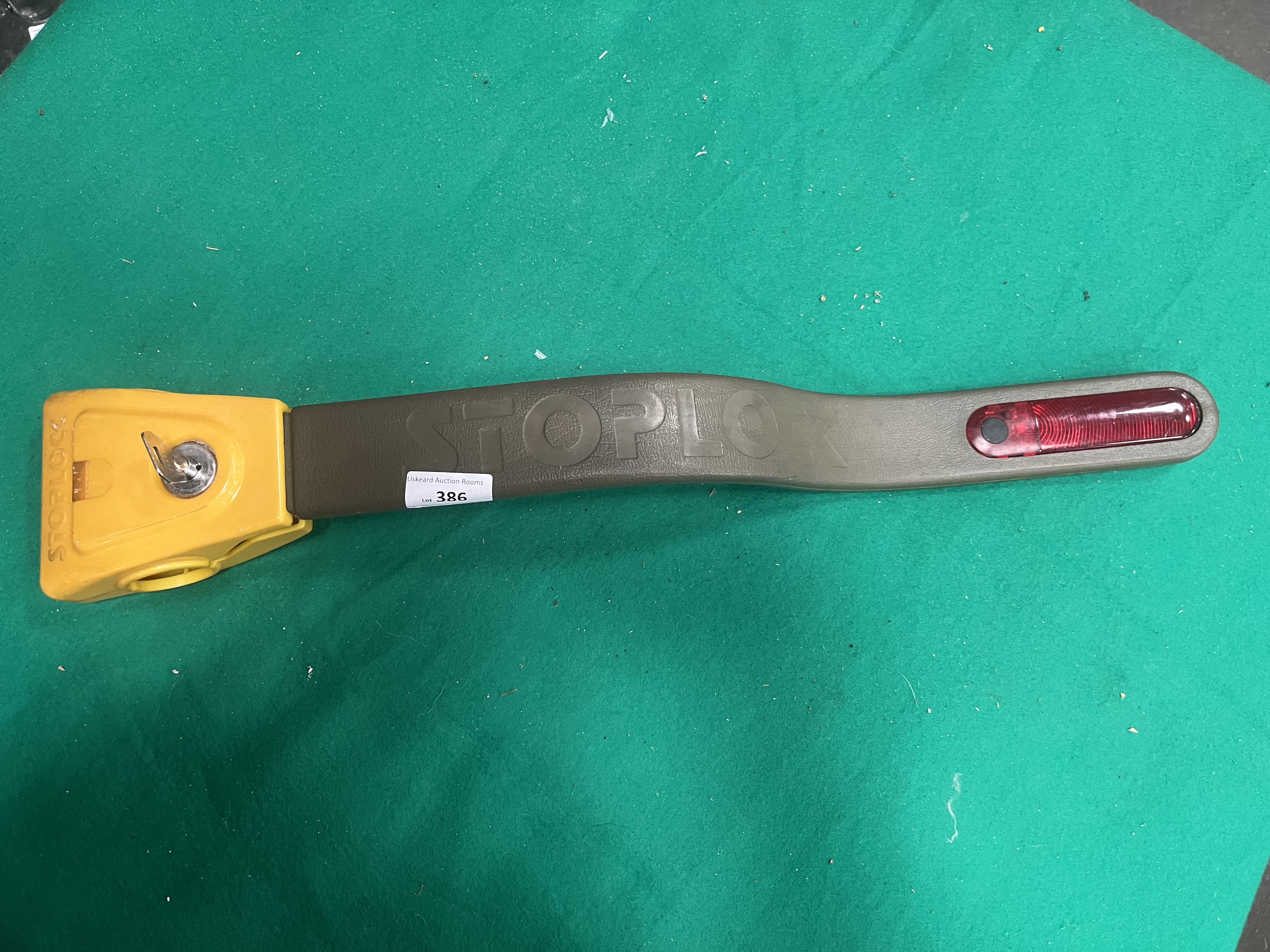 A Stoplock Pulsar vehicle security steering wheel lock. The device is constructed with a curved heavy-gauge metal internal bar finished with a grey textured plastic coating. It features a yellow plastic-cased locking head containing a barrel lock mechanism. One metal key is included and inserted into the lock. This model is equipped with a red plastic lens at the distal end of the bar, which typically houses a battery-operated flashing LED light designed to act as a visual deterrent. The brand name STOPLOCK is embossed on both the main body of the bar and the yellow locking head. A white adhesive lot sticker from Liskeard Auction Rooms is present on the bar, identifying the item as Lot 386.