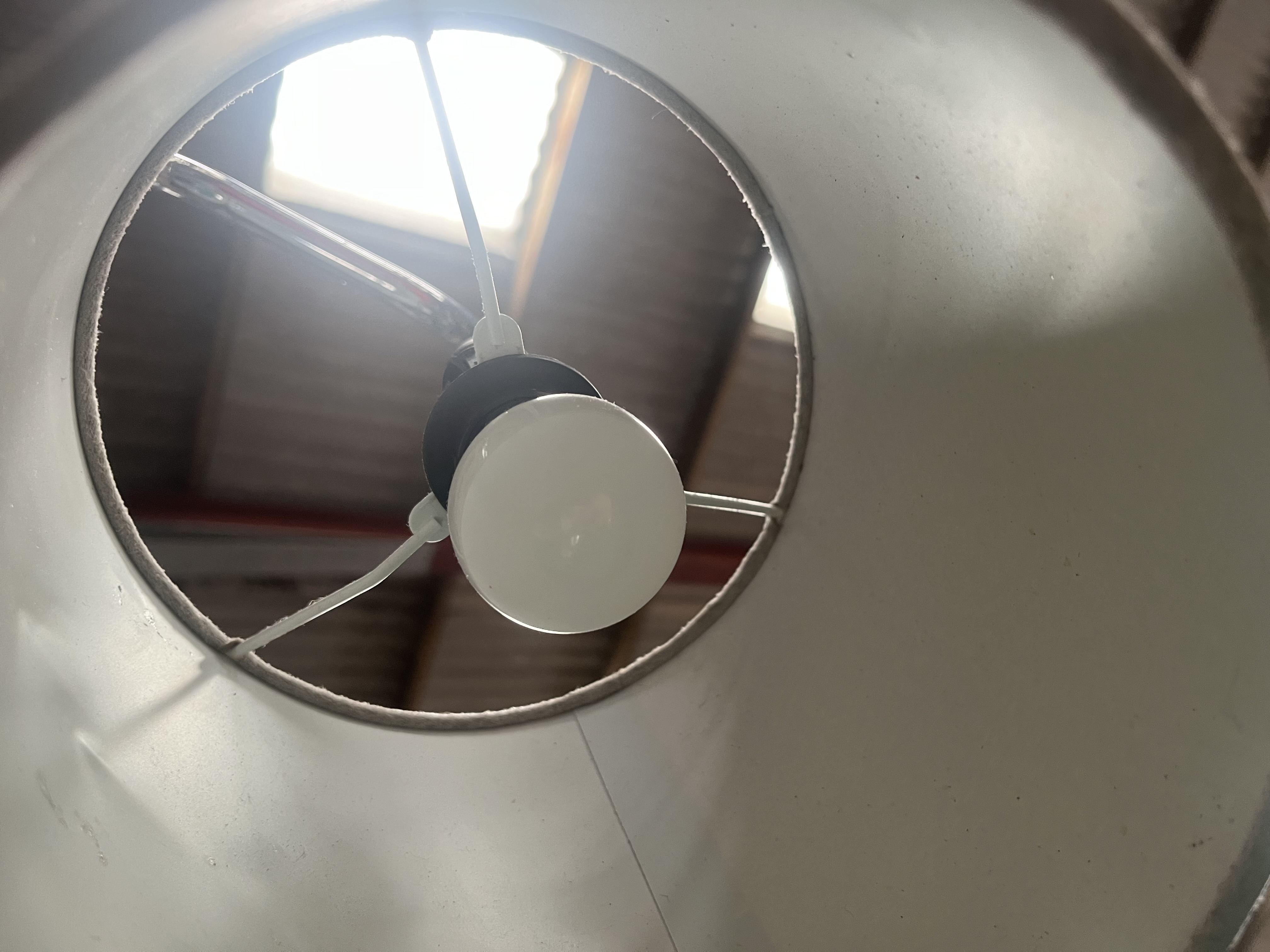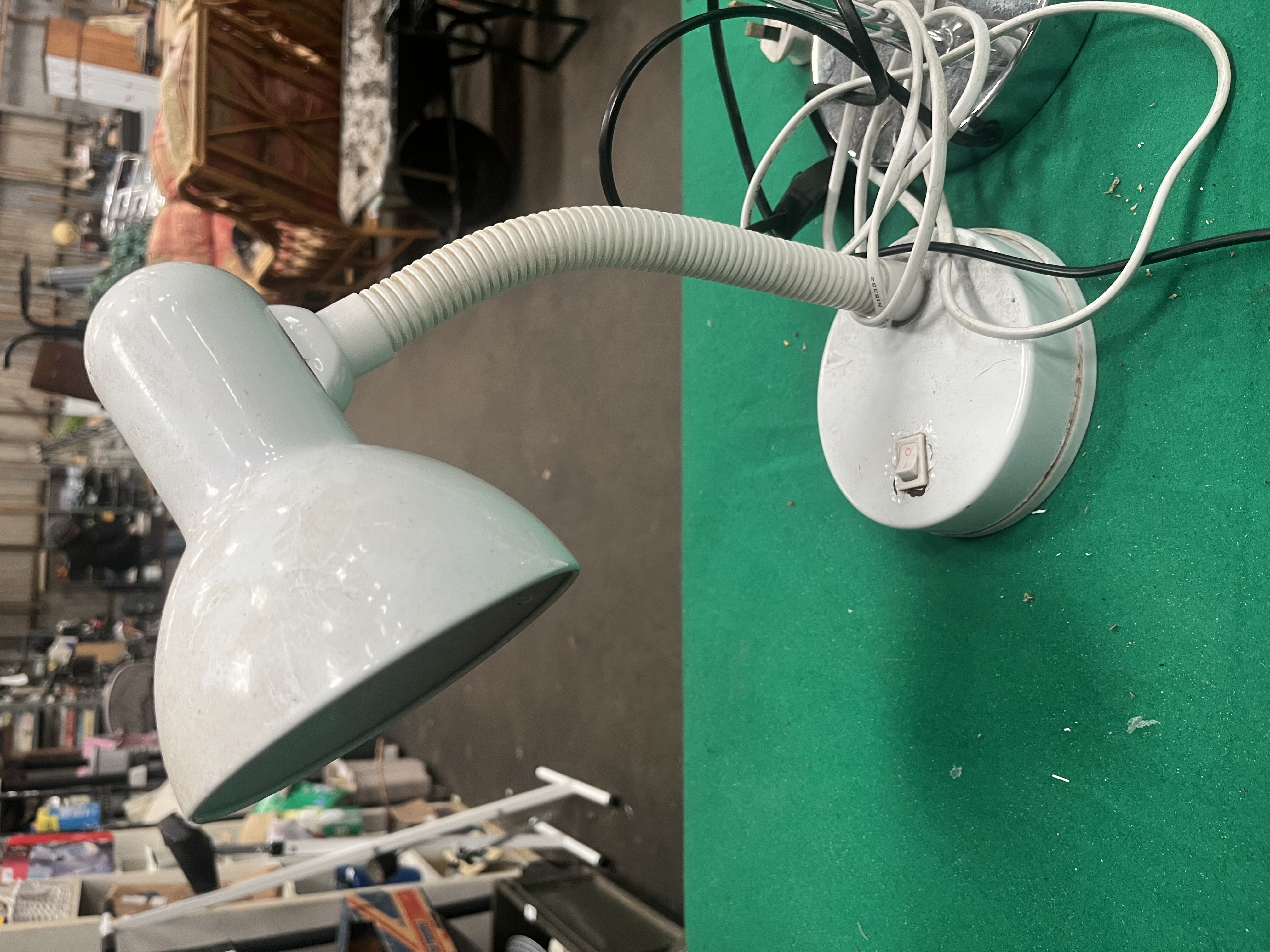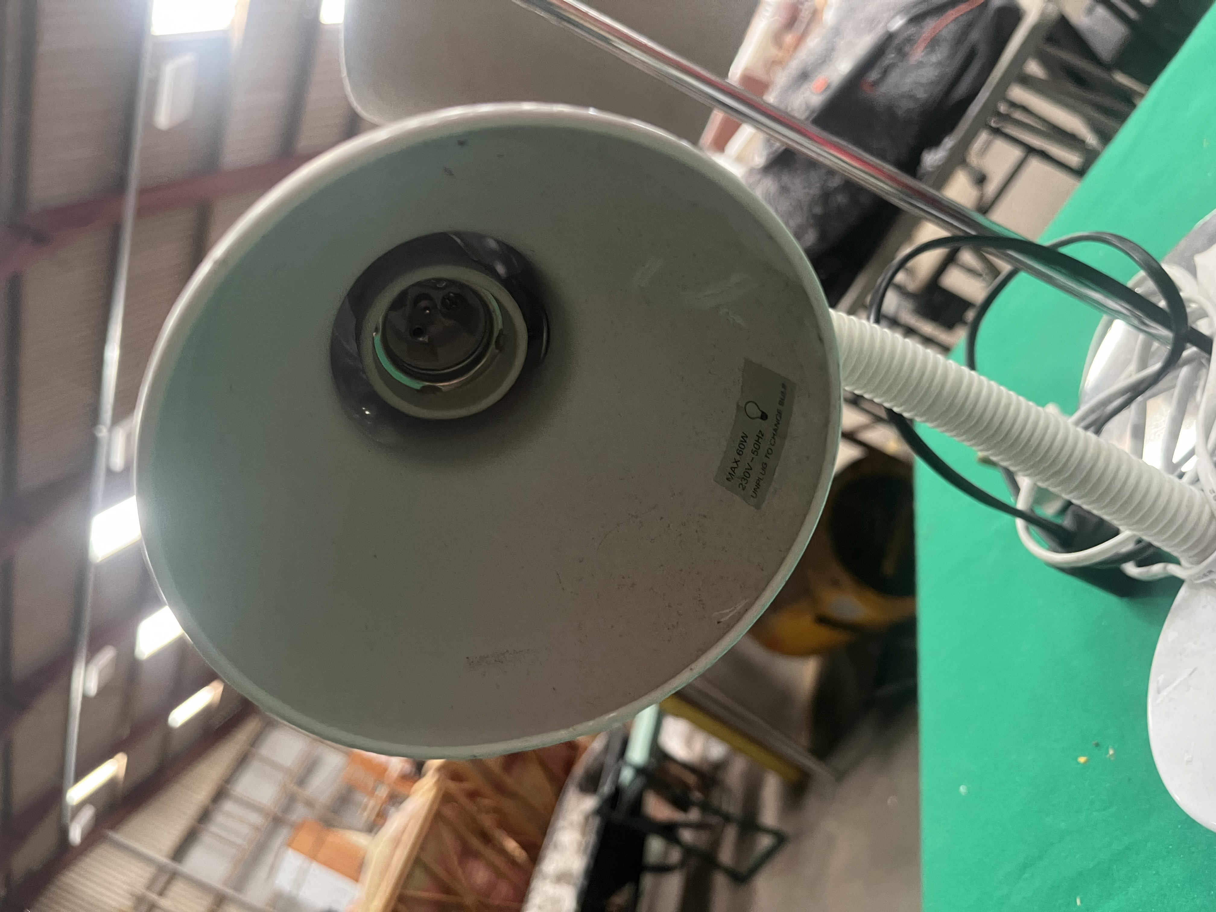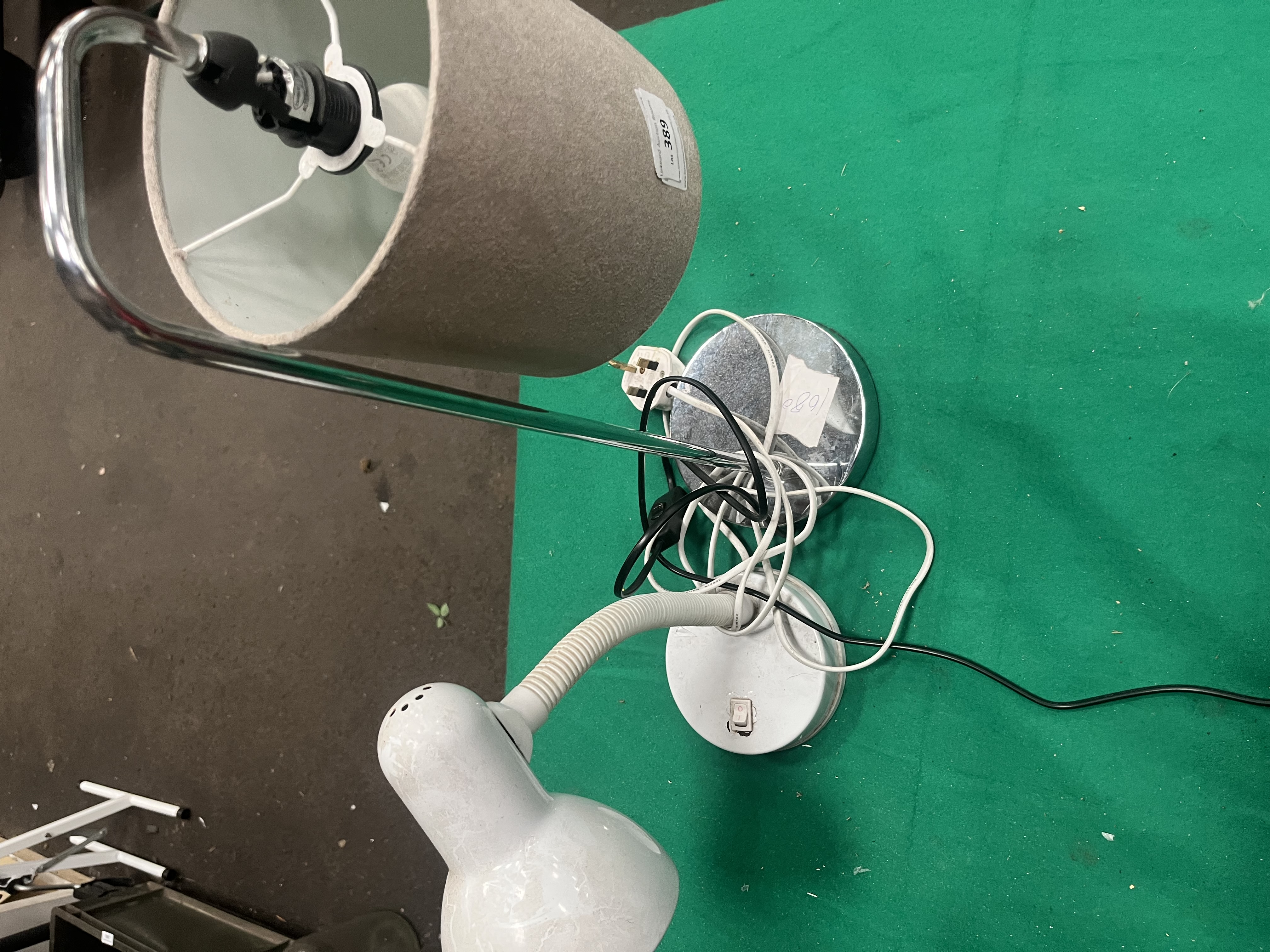 A lot of two contemporary lamps of differing designs. The first is a table lamp featuring a polished chrome-plated metal stem that terminates in a 180-degree curve to support a downward-facing light fitting. It is paired with a cylindrical drum shade in a coarse-textured light beige fabric and stands on a weighted circular polished chrome base. The second item is a white painted metal desk lamp with a bell-shaped shade and a flexible plastic-sheathed gooseneck arm for adjustable positioning. The circular base of the desk lamp contains an integrated rocker power switch. Both lamps are equipped with white power cords and standard UK three-pin plugs. No manufacturer markings are visible on the bodies of the lamps. The white lamp bears a safety label inside the shade and the power cable is embossed with the mark Leader N15362.