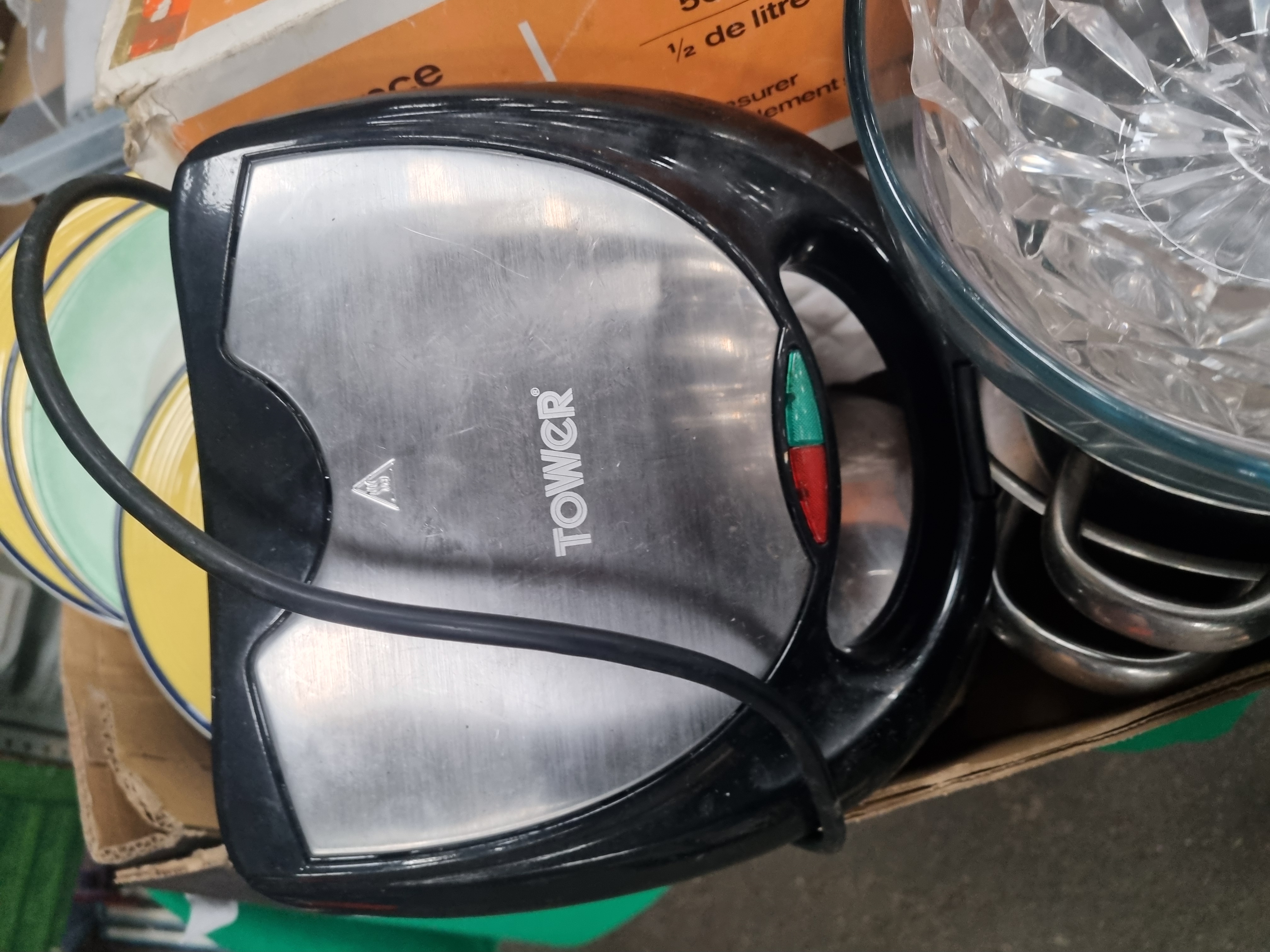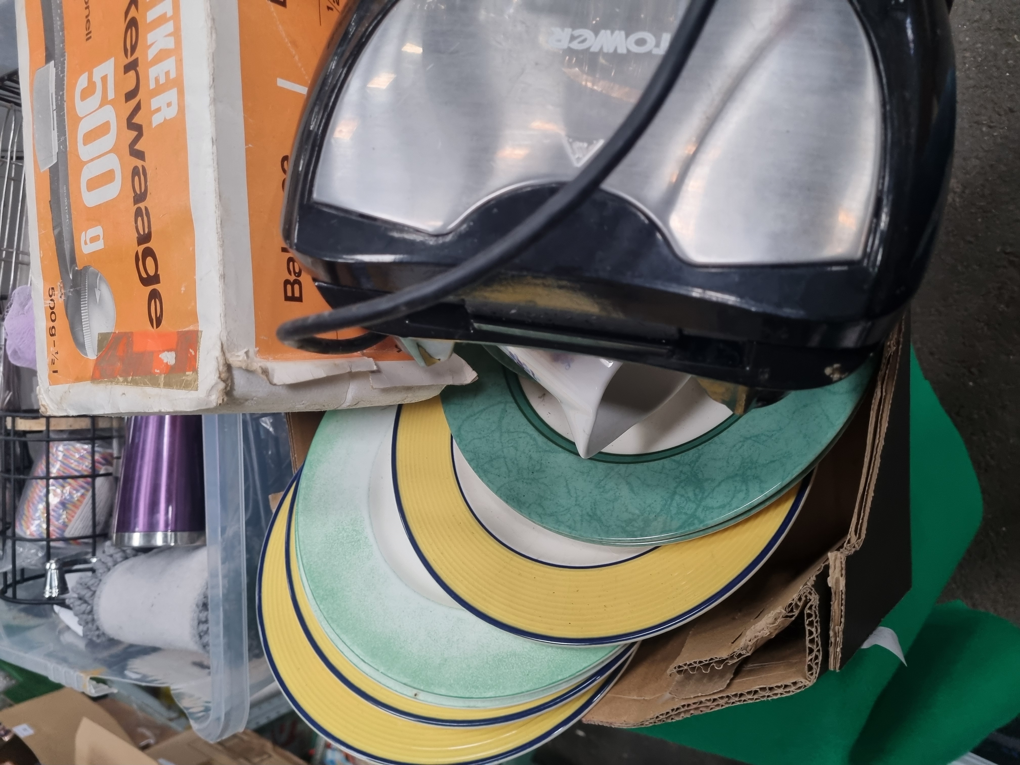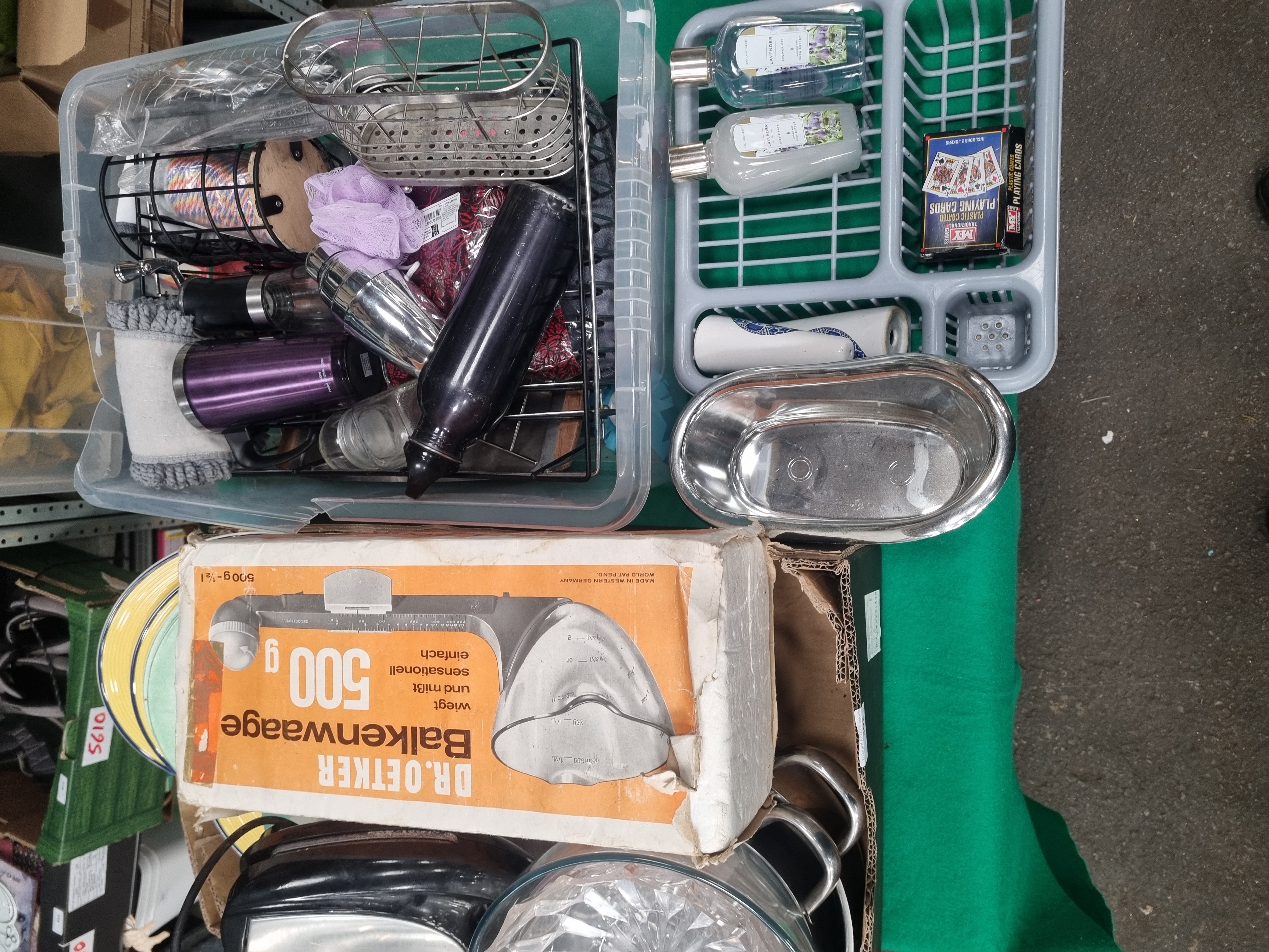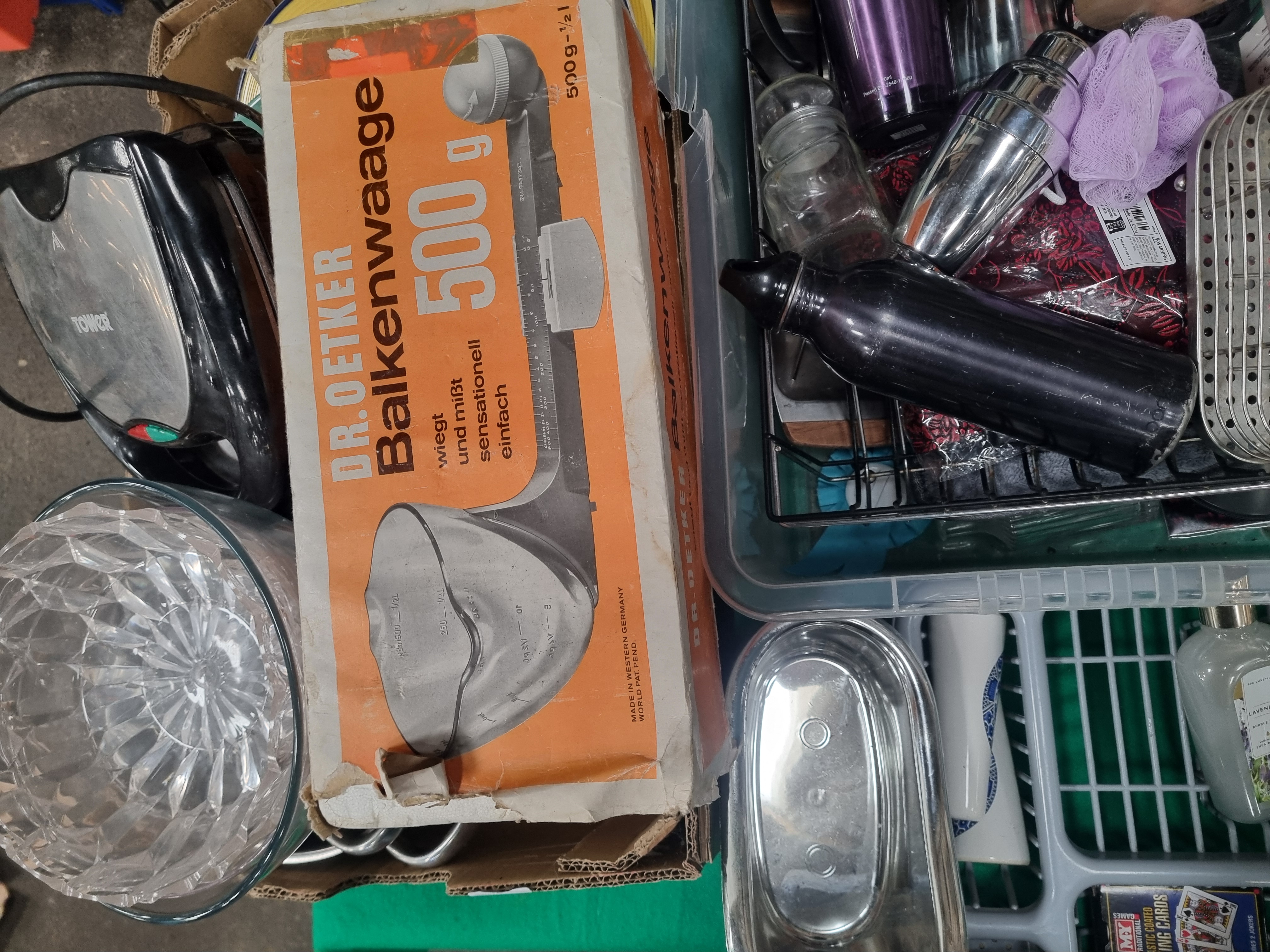 An assortment of kitchen and household items featuring a vintage Dr. Oetker Balkenwaage balance scale in its original orange and white cardboard box, marked as made in Western Germany with a 500g capacity. The lot includes a Tower electric sandwich toaster finished in black and brushed silver, a stack of ceramic dinner plates with concentric yellow and green banded borders, and a large clear glass bowl with a faceted geometric design. Further items contained within plastic and cardboard storage include a stainless steel three-piece cocktail shaker, an insulated travel mug in a purple finish, a black metal water bottle, a wire-work storage rack, and a grey plastic draining organiser. Also present are two bottles of lavender-scented bubble bath, a deck of MX Traditional plastic-coated playing cards, a small oval stainless steel dish, and various stainless steel pans. This lot is identified as lot number 392.