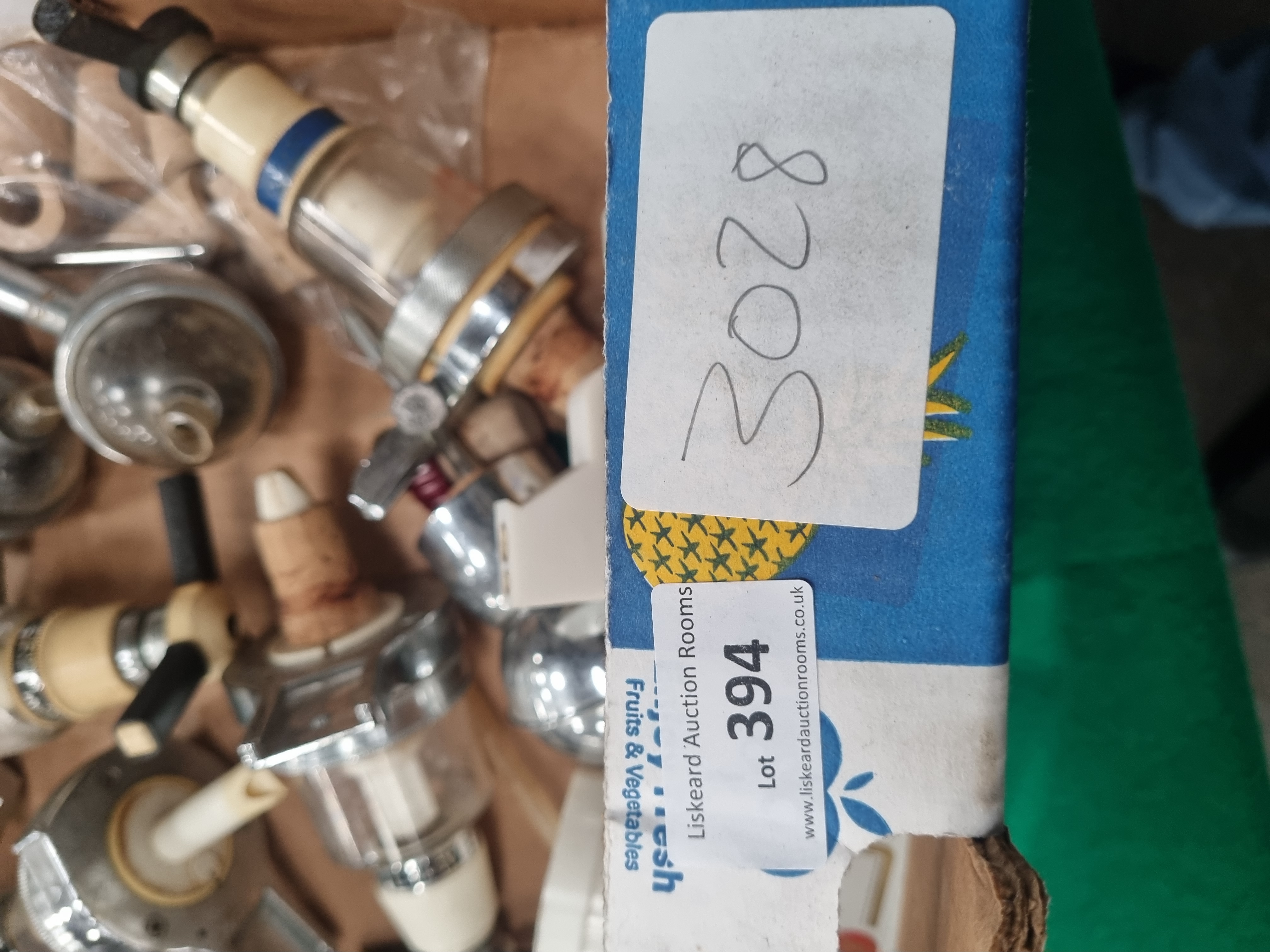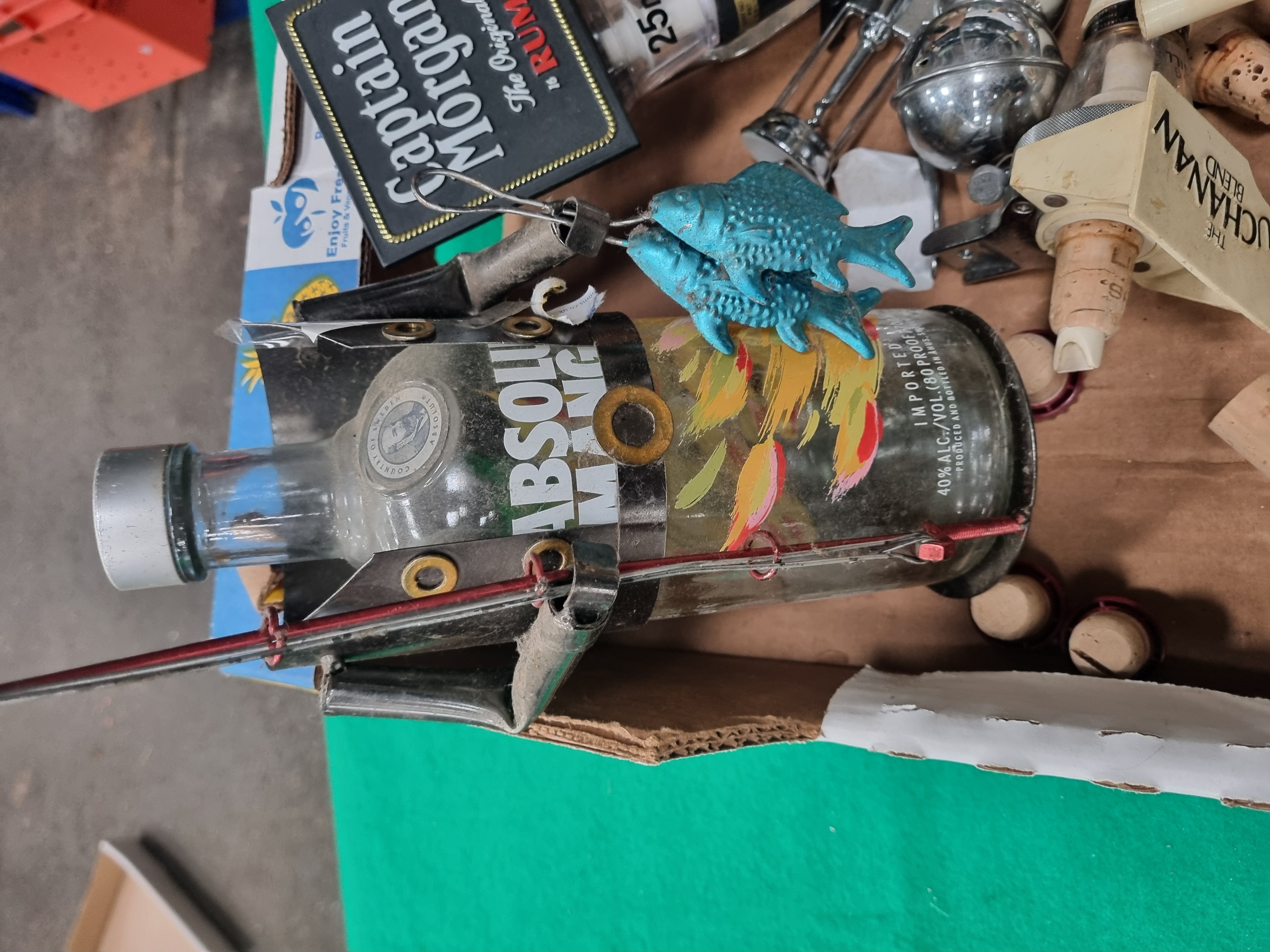 The lot further includes a decorative Absolut Mango vodka bottle encased in a metal harness featuring two blue-painted metal fish figurines. Breweriana interest is represented by a glass tankard with blue Harp brewery lettering and a small rectangular stand or box featuring the Younger’s Tartan Mild character and logo. A collection of loose corks, additional bottle stoppers, and a chrome-plated corkscrew are also present. The items are housed in a Fyffes Gold cardboard fruit box bearing labels from Liskeard Auction Rooms, including lot number 394 and handwritten reference 3028.