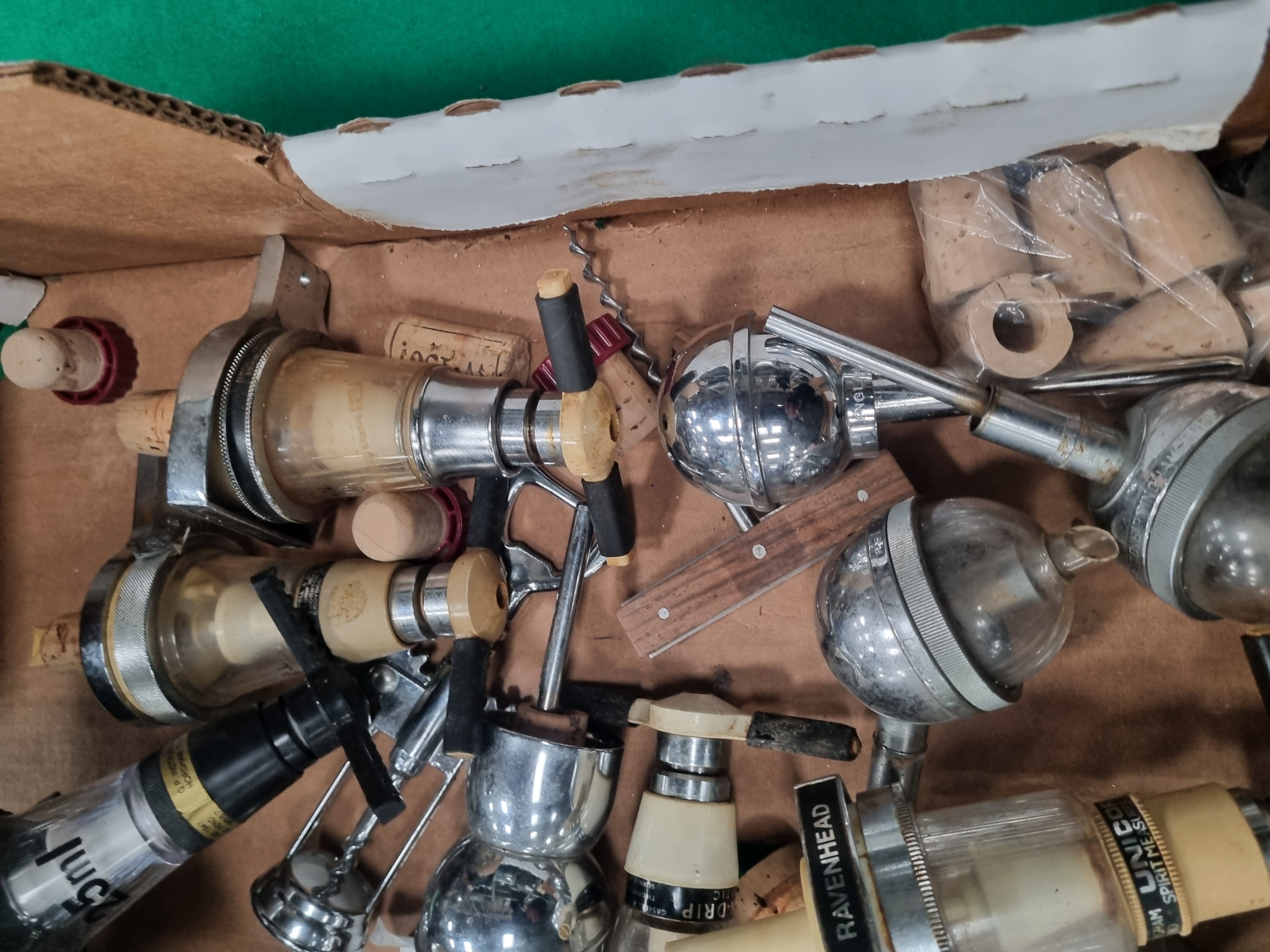 This collection of vintage barware consists of an assortment of mid-to-late 20th-century British pub spirit measures, commonly known as optics, and related accessories. The lot features several branded optics, notably a square-headed Captain Morgan The Original Rum measure for 25ml pours and two white plastic dispensers bearing the Schweppes logo. Other optics include units marked with Buchanan’s, Linney, Ravenhead, and Unic Spirit Measure branding. The optics are constructed from chrome-plated metal, clear plastic, and cream-coloured moulded plastic, many retaining their original cork bottle stoppers.