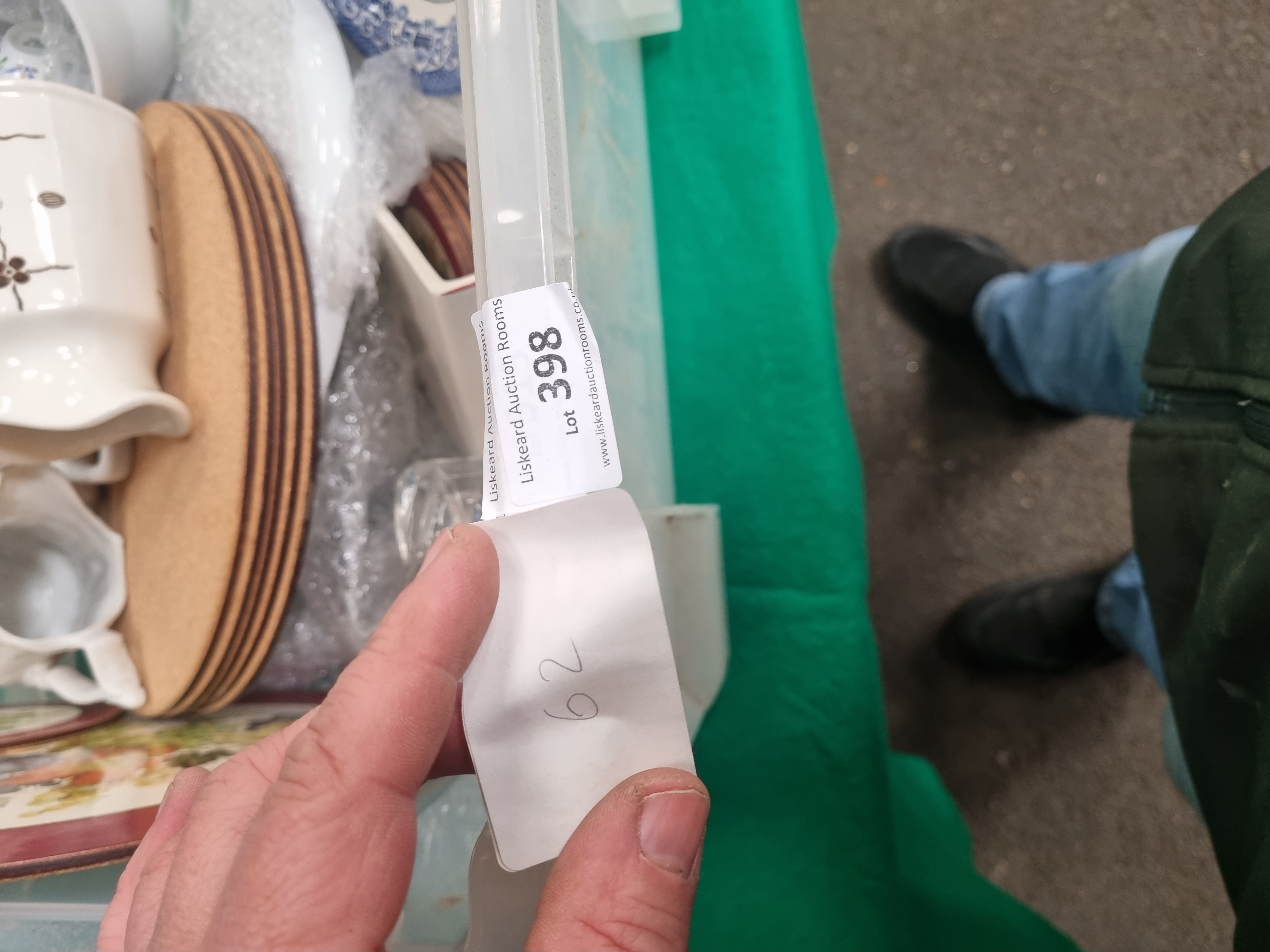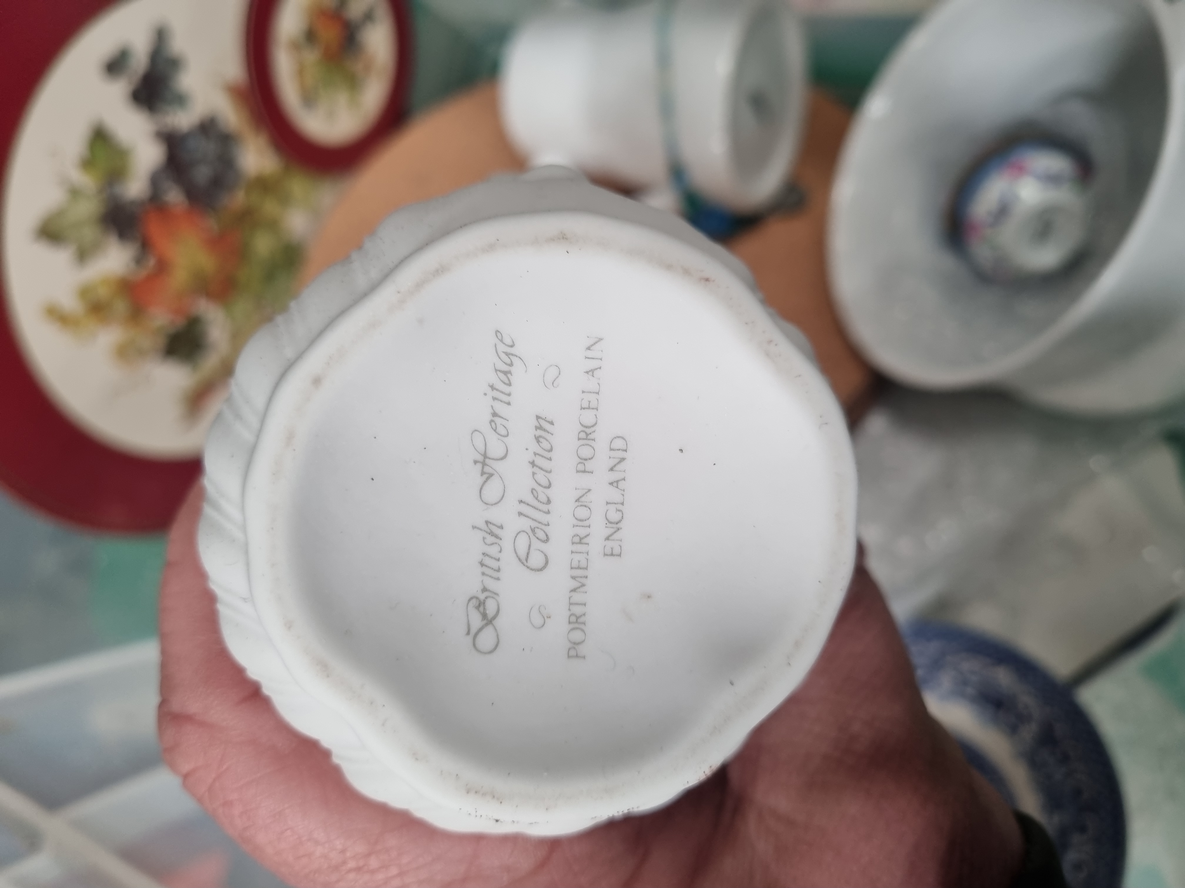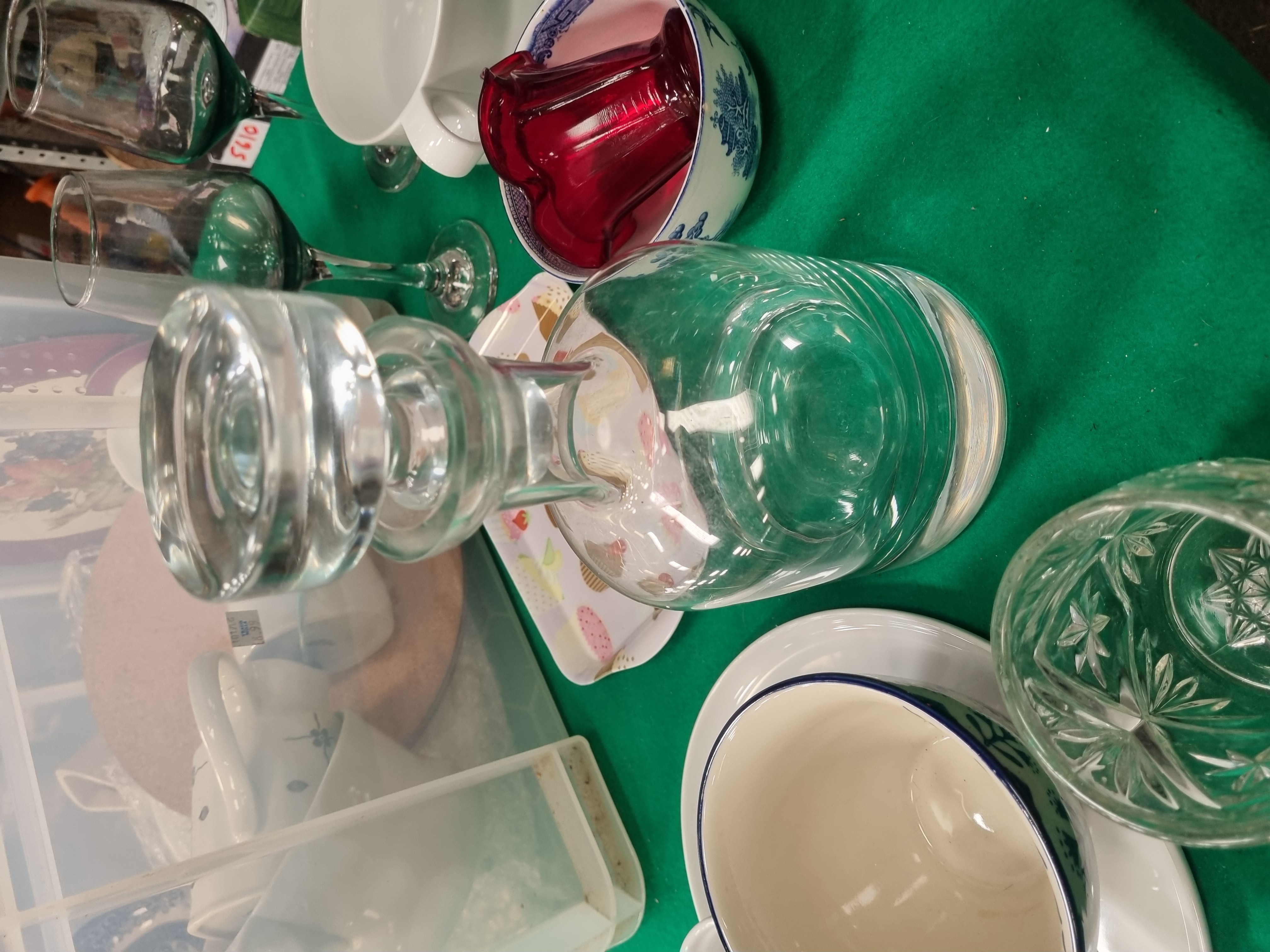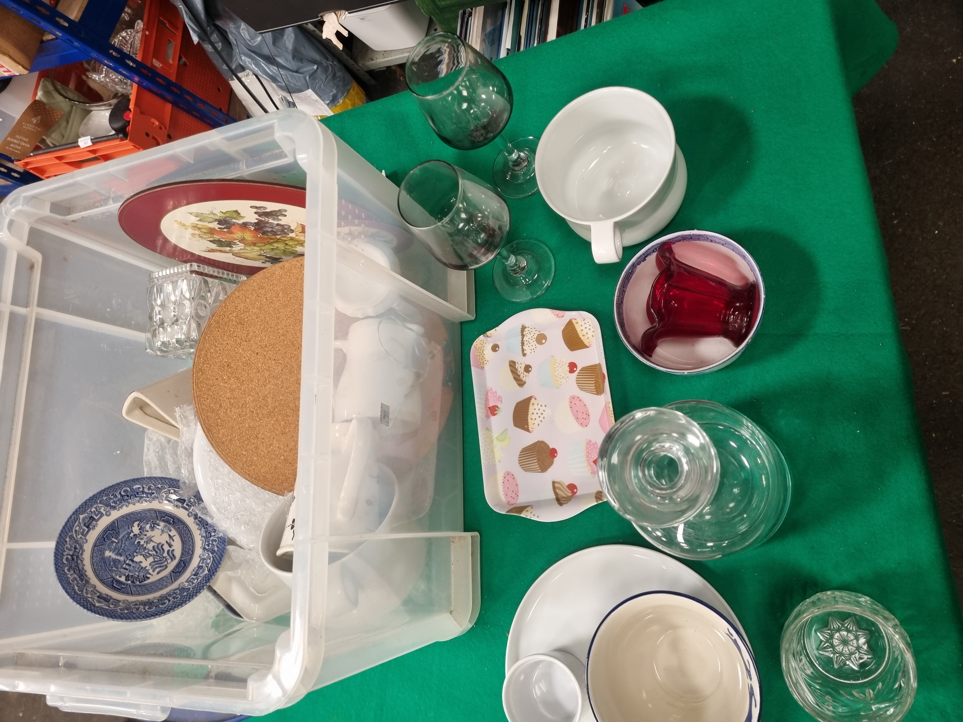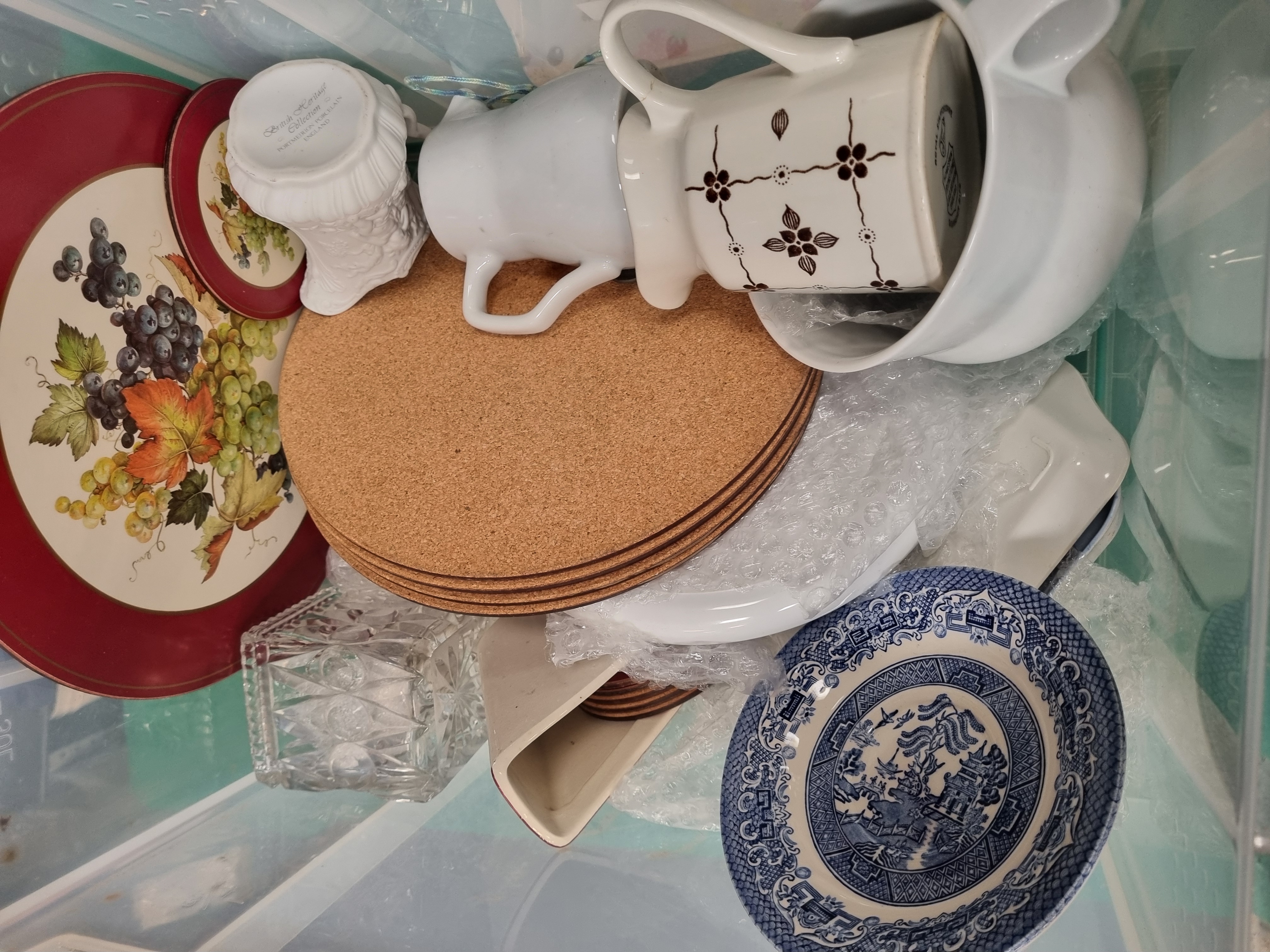 A mixed lot of ceramics, glassware, and household items. The ceramic selection includes a white ironstone mug by J. & G. Meakin from the Homespun range, featuring a brown transfer-printed geometric floral pattern and bearing the Royal Staffordshire bell mark to the base. Also present is a white moulded porcelain vessel from the Portmeirion British Heritage Collection with fluted sides and manufacturer’s mark to the base. The collection contains two large display plates decorated with a fruit and vine transfer-printed design and deep red rims, alongside blue and white transfer-ware in the Willow pattern, including a bowl and a small dish. Other ceramic items include a large white basin with a single handle, a small tray with a cupcake motif, and assorted white tableware. Glassware consists of a clear bulbous decanter with a matching stopper, two green-tinted wine glasses with clear stems, a ruby red glass vessel, a pressed glass bowl with a starburst pattern to the base, and a faceted clear glass container. The lot is completed by a set of circular cork place mats and is contained within a large clear plastic storage bin.