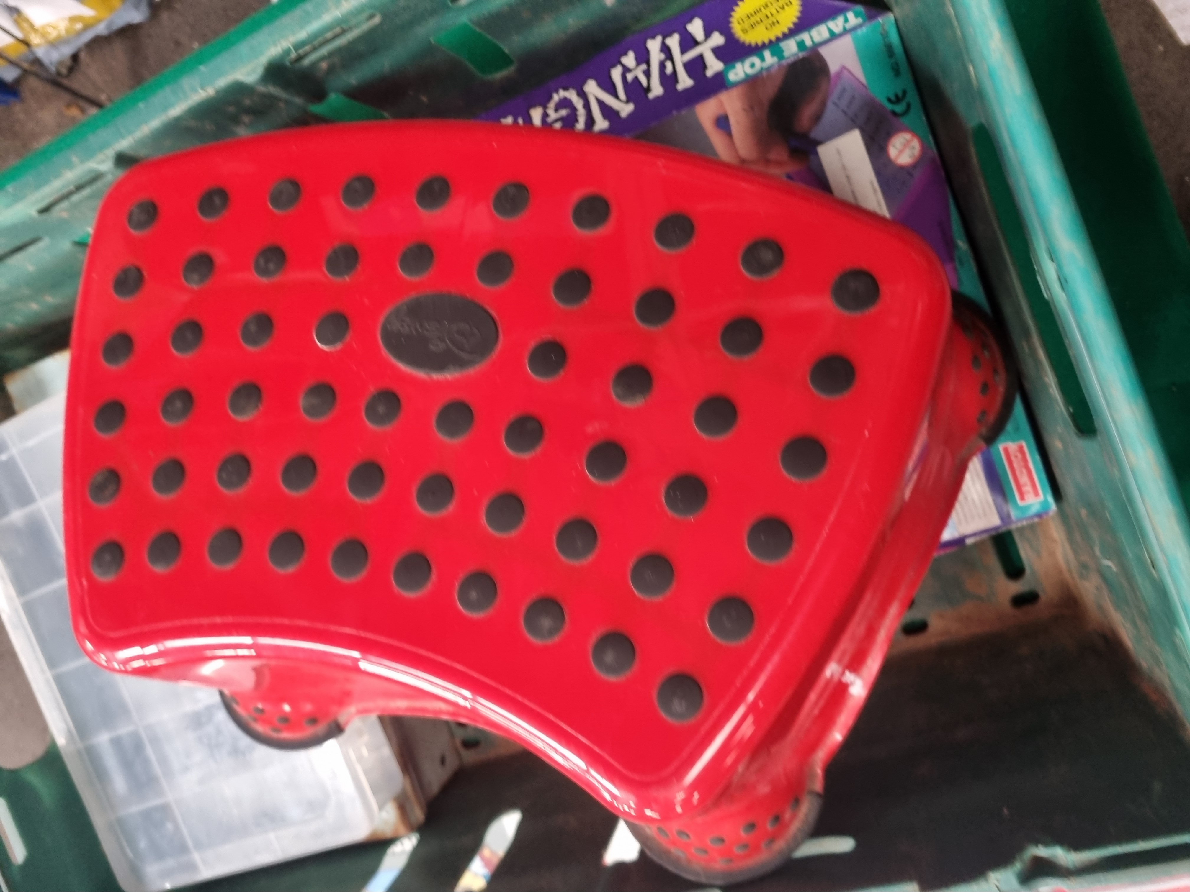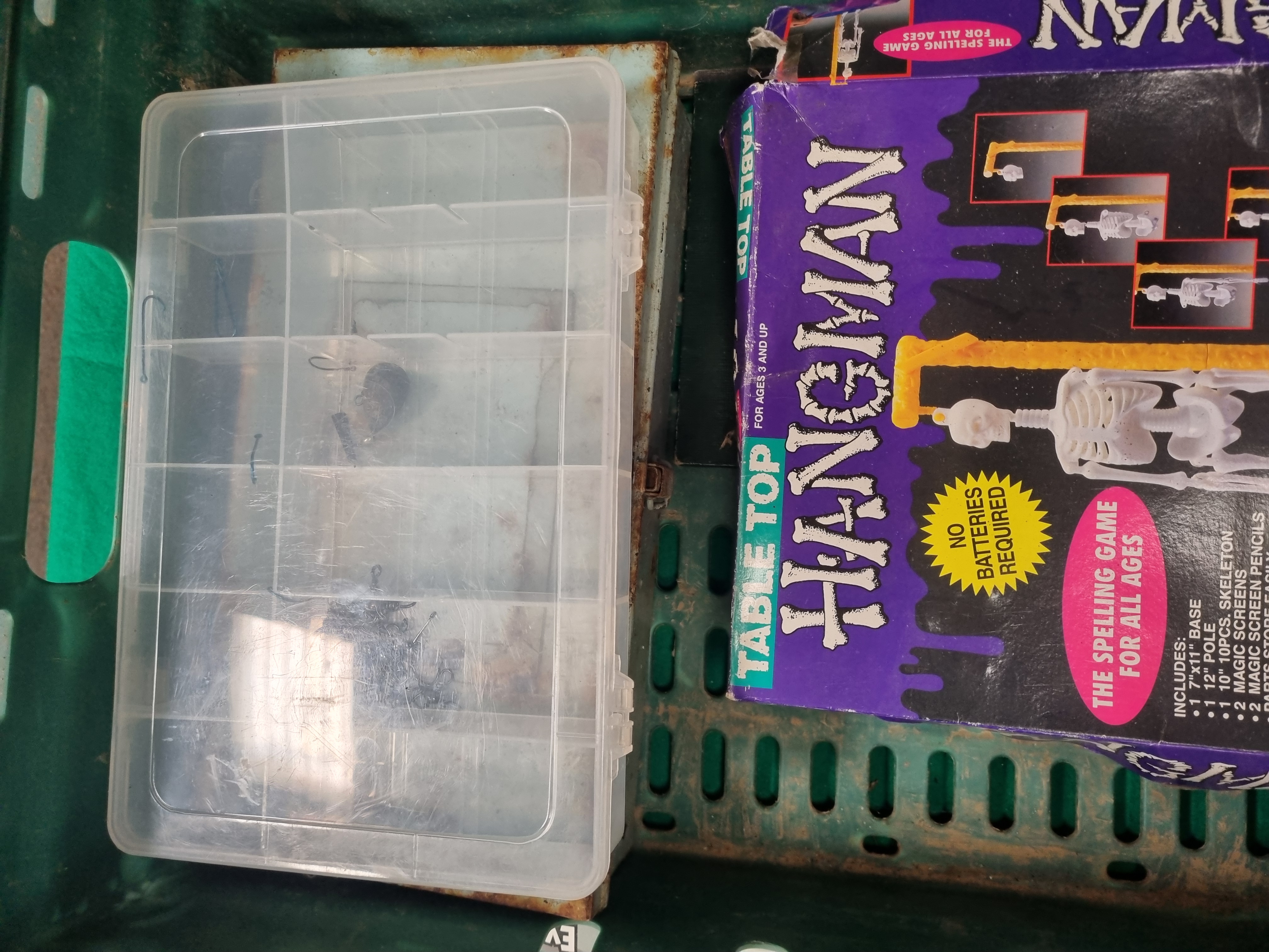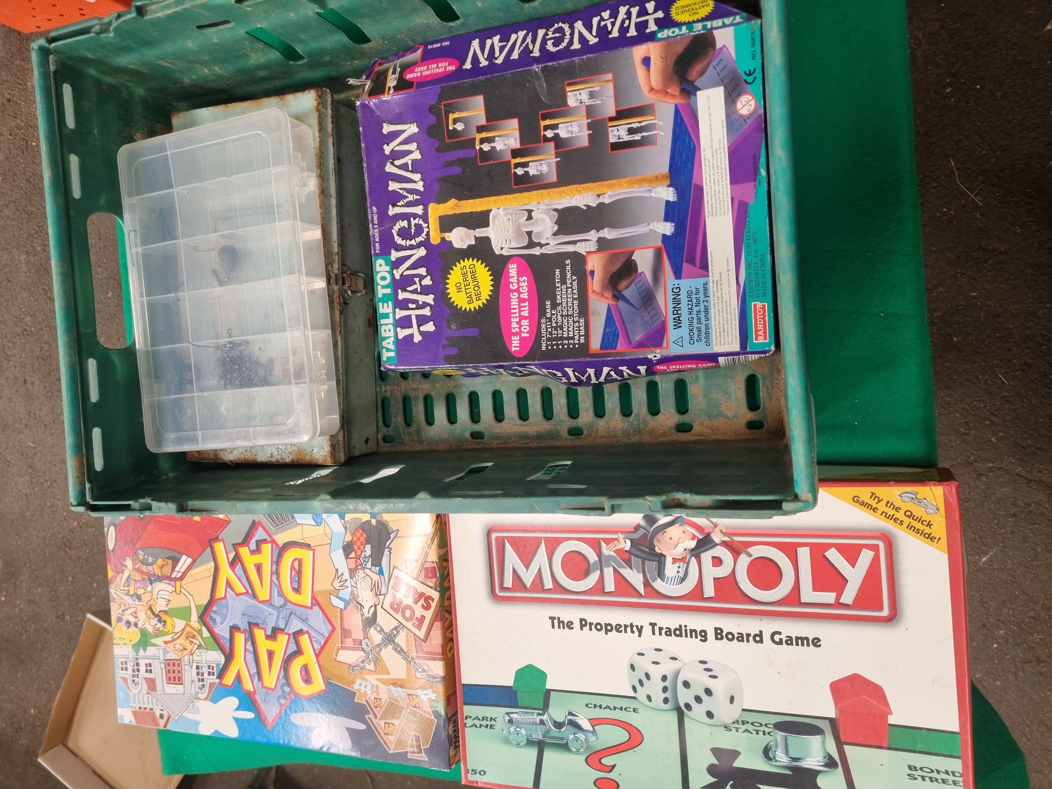 A collection of vintage board games and various household items. The lot includes board games manufactured by Parker and Randtoy. Featured items include a UK edition of Monopoly – The Property Trading Board Game by Parker, featuring pound sterling currency symbols on the box lid. Also included is the Pay Day board game by Parker and a Table Top Hangman spelling game by Randtoy. The Randtoy box indicates the set should include a base, pole, skeleton components, and magic screens. The lot further comprises a red plastic step stool with black rubberised non-slip circles, a clear plastic partitioned storage box containing a small quantity of fishing tackle such as lead weights and hooks, and a green plastic rectangular storage crate. Labels for Liskeard Auction Rooms Lot 399 are present on the crate.