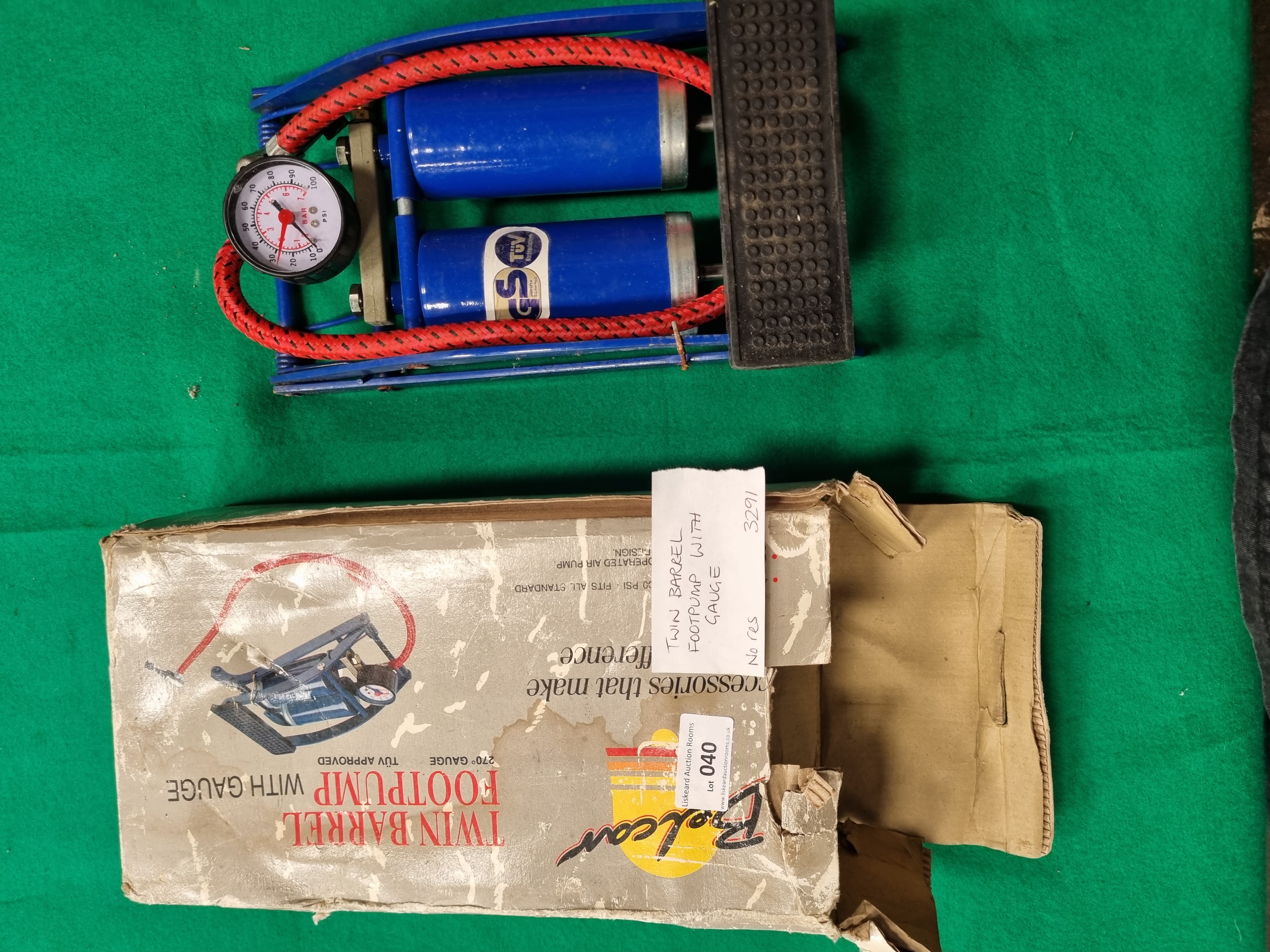 Lot 40: A Bolcan Twin Barrel Foot Pump and a Vintage Dunlop Tyre Pressure Gauge