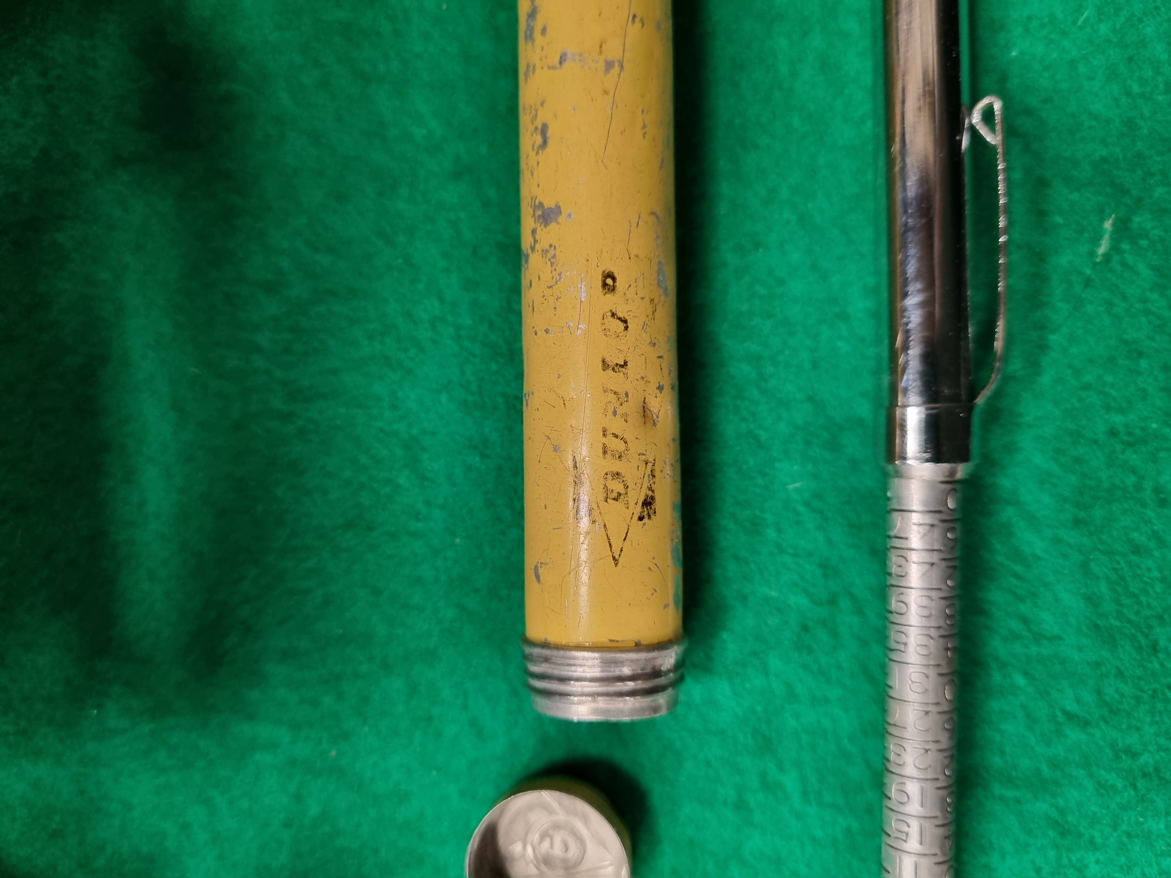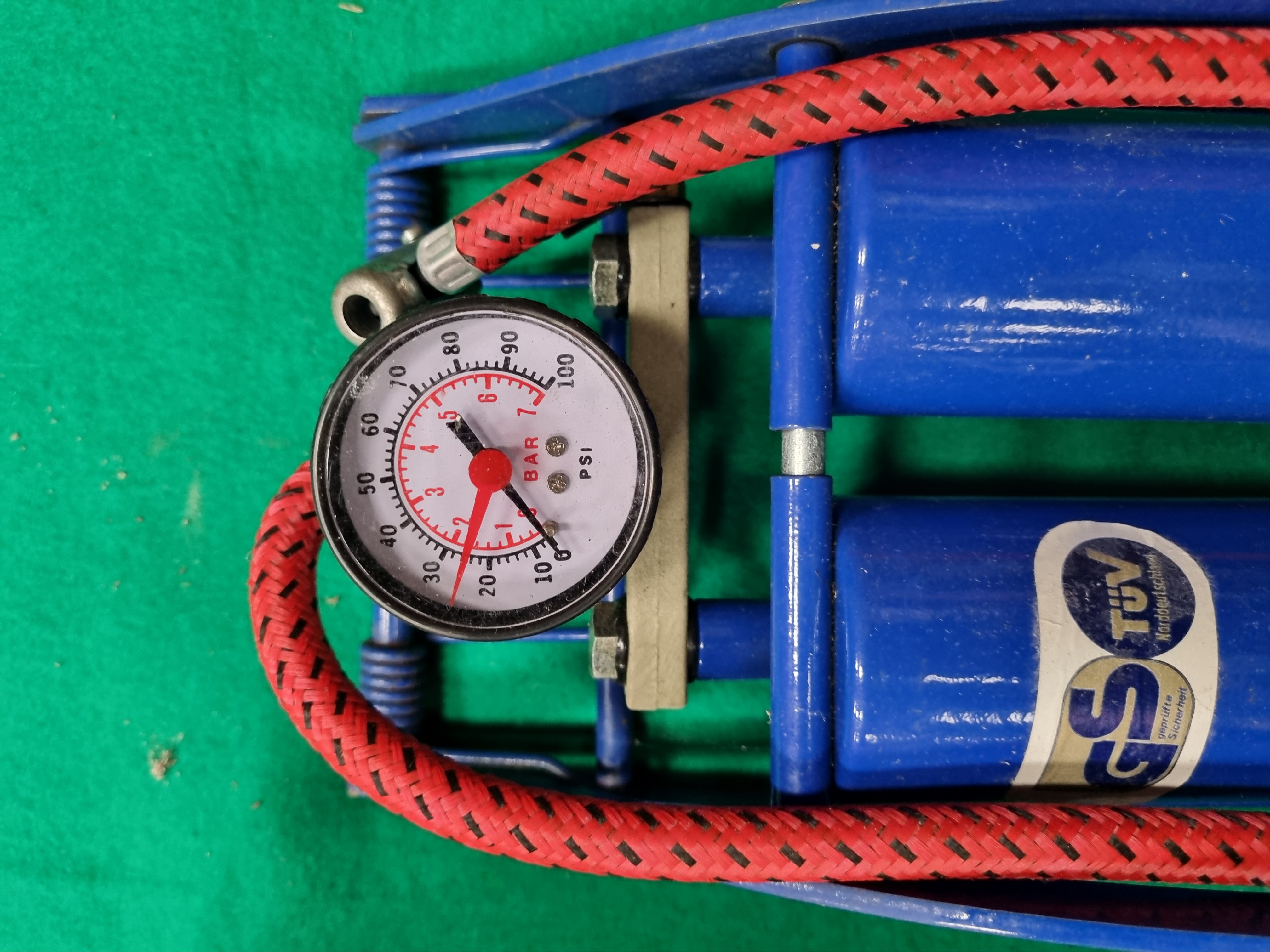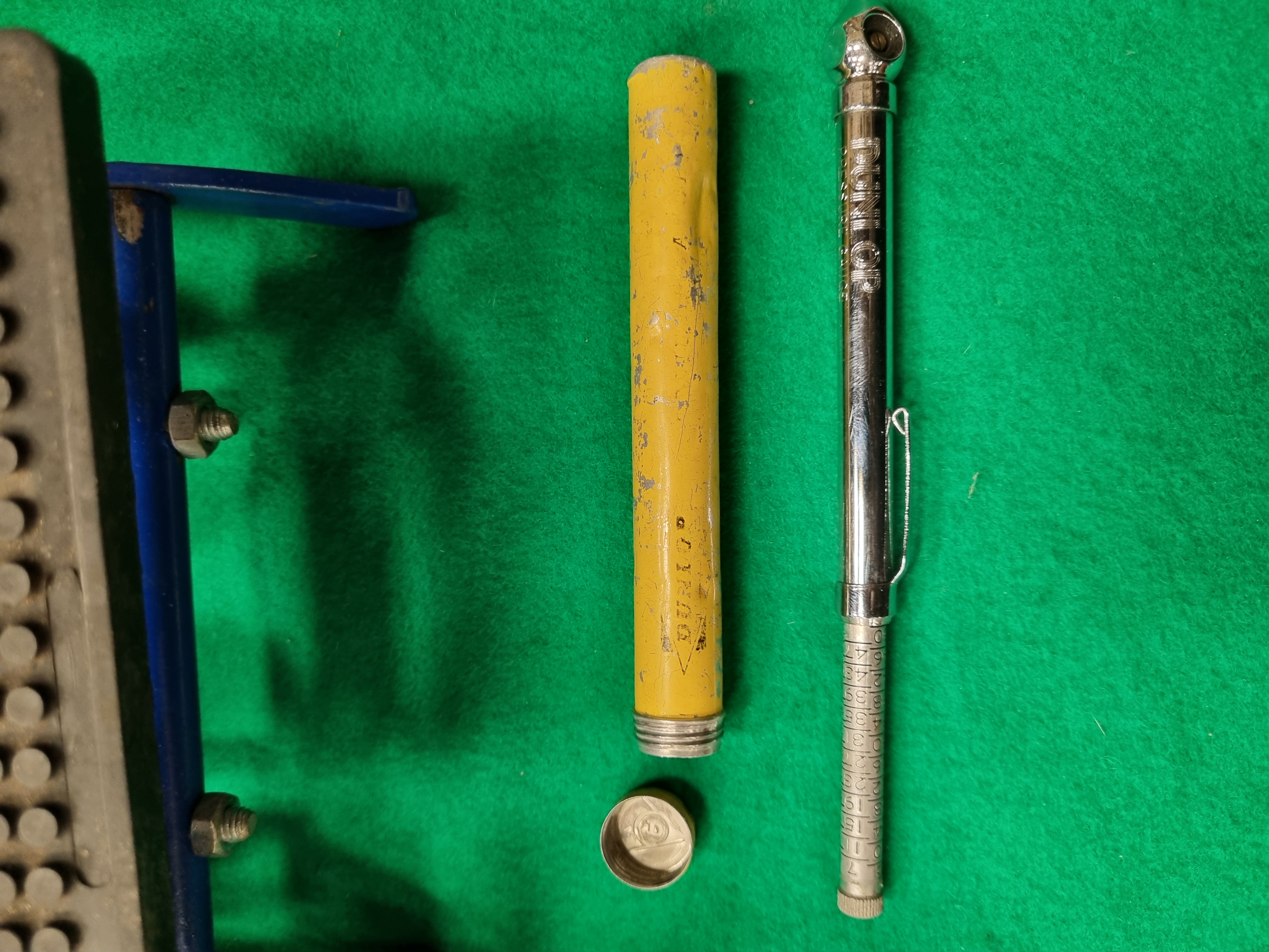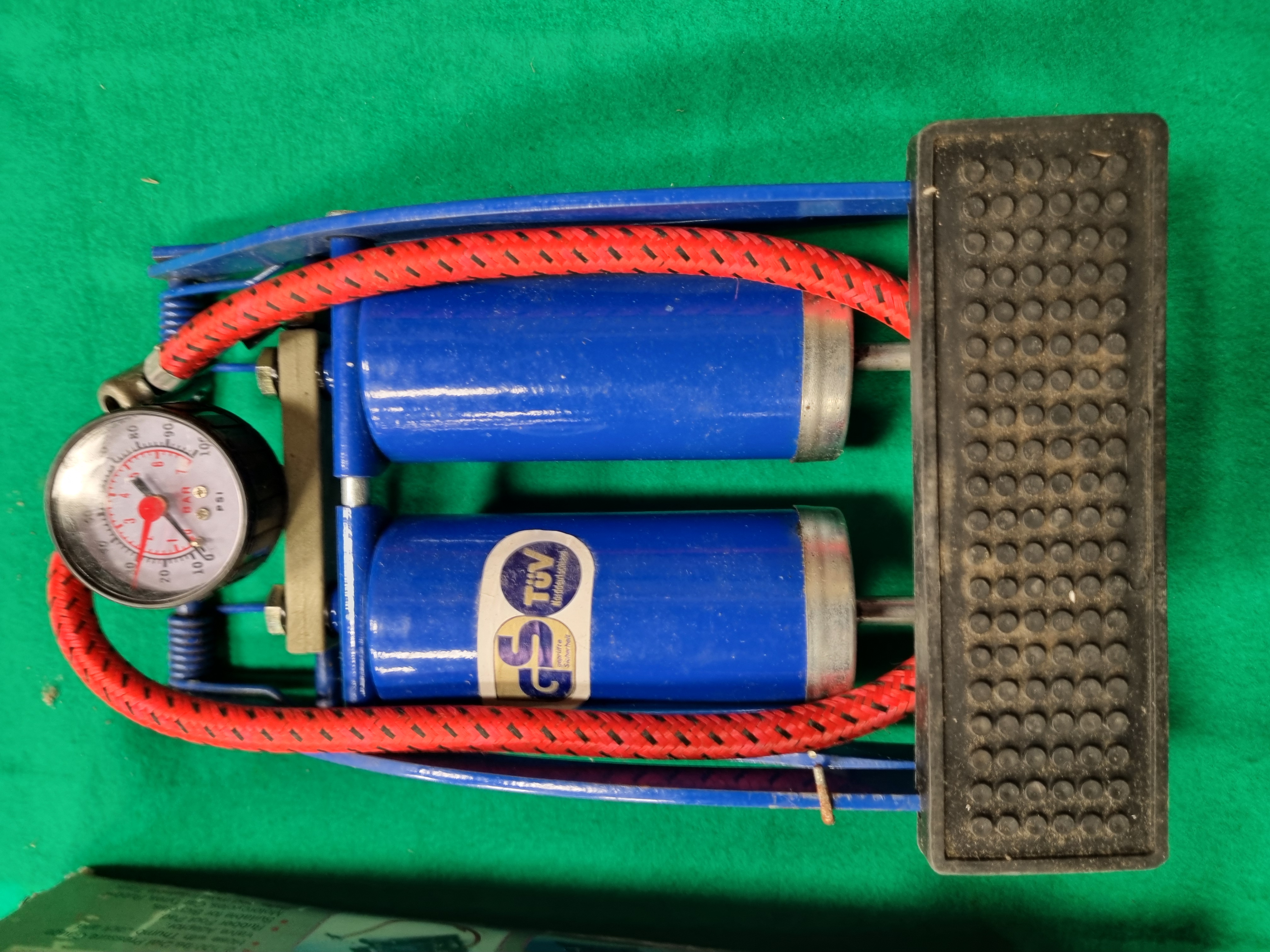 This lot comprises two automotive tools including a modern foot-operated air pump and a vintage pencil-style pressure gauge. The Bolcan twin barrel foot pump is constructed with a blue-painted metal frame and cylinders, featuring a black rubberised non-slip foot pedal and a red fabric-braided rubber hose. The integral pressure gauge is calibrated for 0-100 PSI and 0-7 BAR. One cylinder retains a safety certification sticker for GS and TÜV Norddeutschland. The pump is accompanied by its original cardboard retail box. The second item is a mid-20th century Dunlop pencil-style tyre pressure gauge. The gauge is made of chrome-plated metal with the maker’s name embossed on the body. It includes a yellow-painted metal storage tube with a screw-on cap, decorated with the Dunlop brand name within a diamond-shaped border.