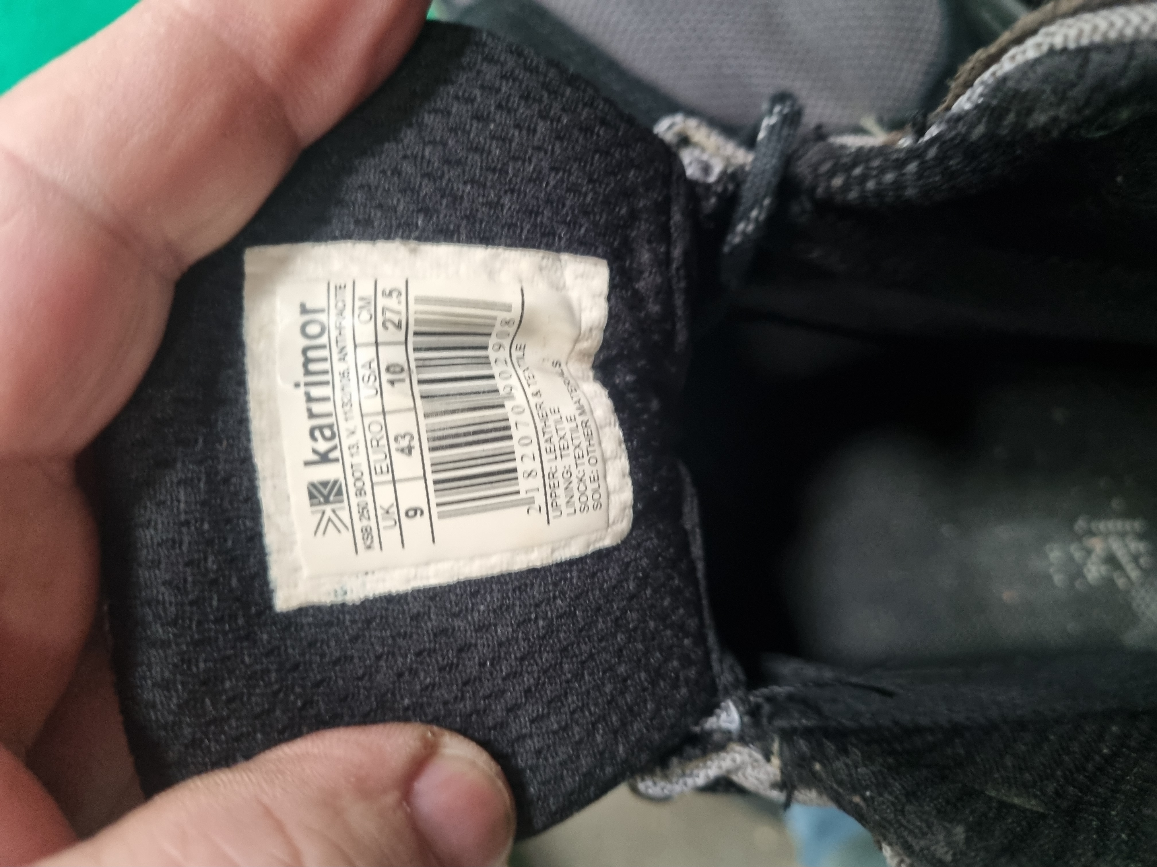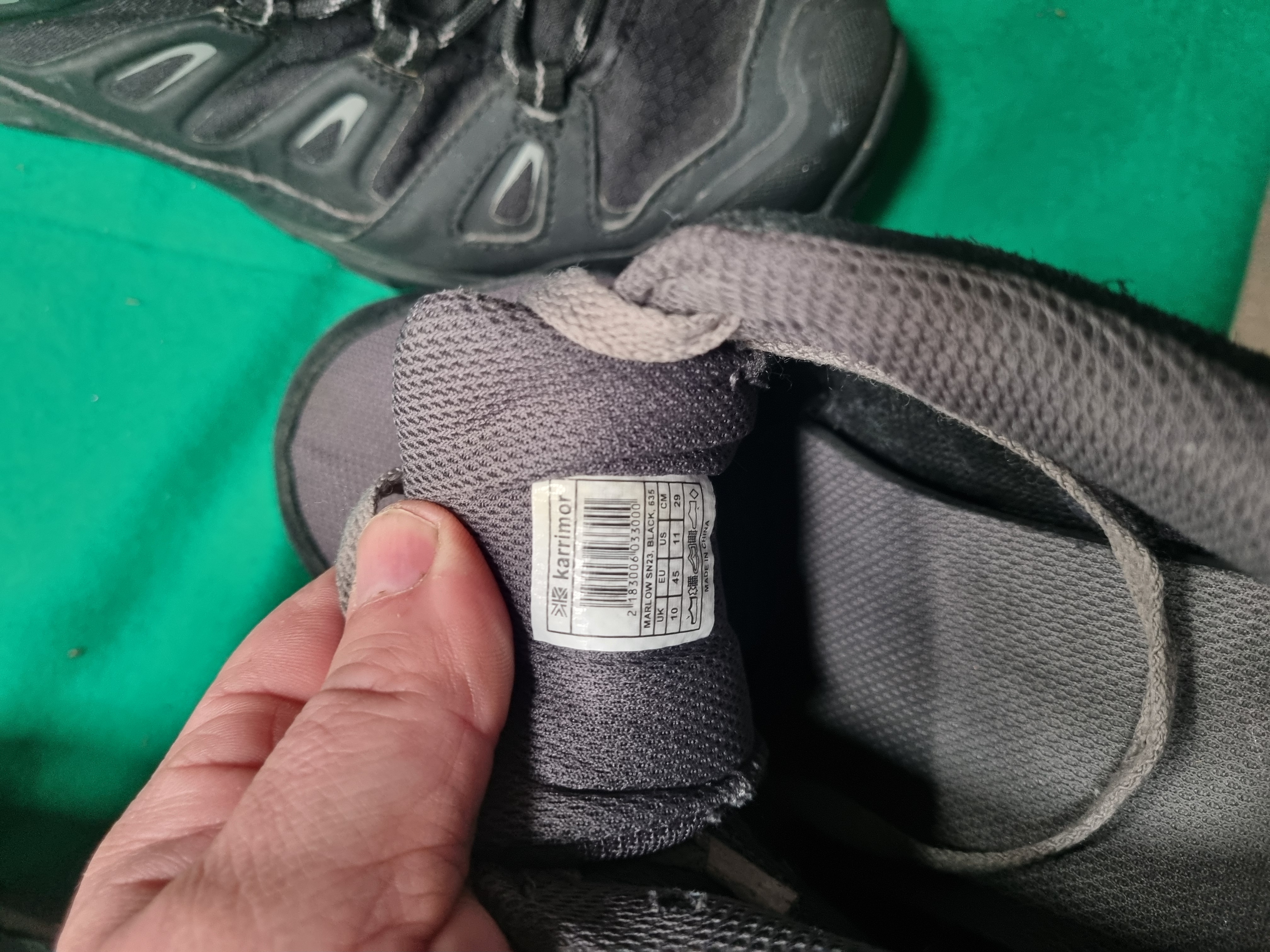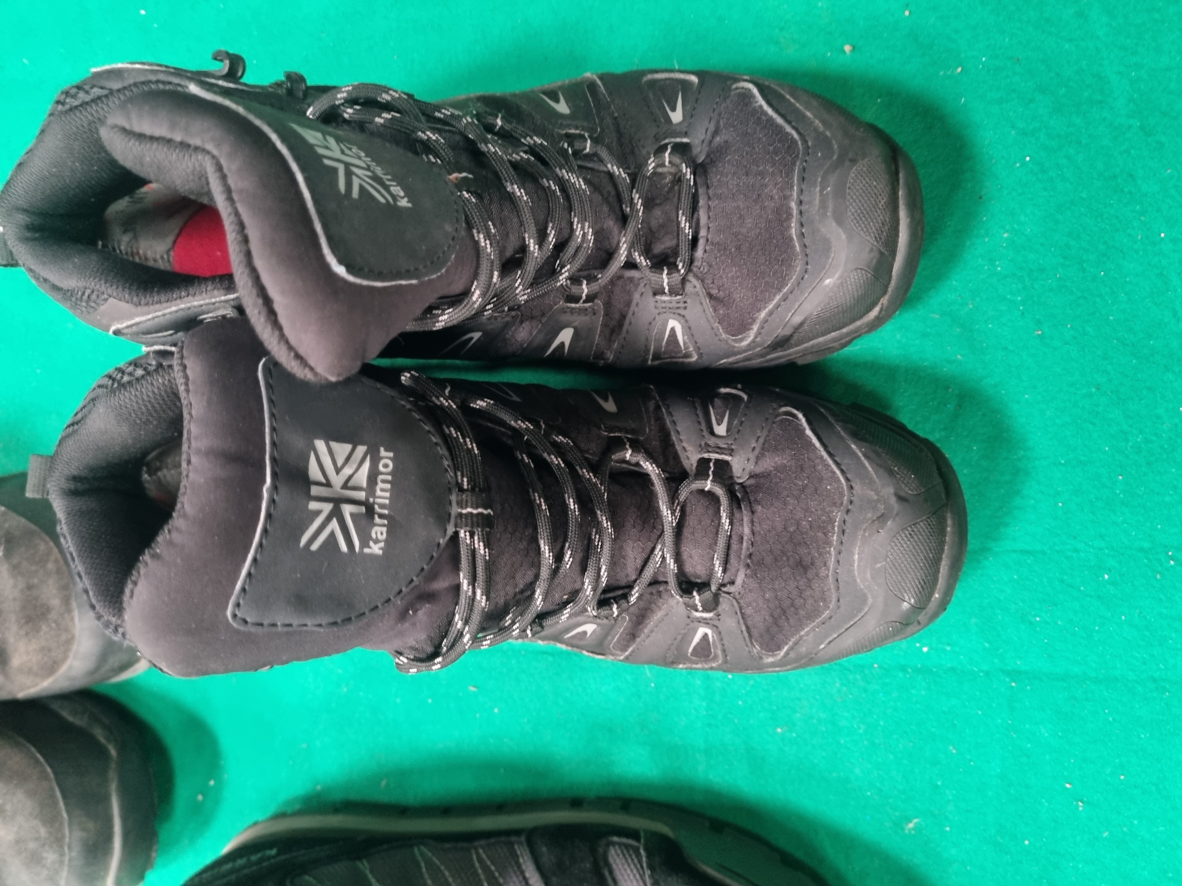 This collection consists of three pairs of Karrimor brand footwear. The first pair is the Karrimor Cougar Mid 2 WTX hiking boot in black. These mid-cut boots feature synthetic and textile uppers incorporating Weathertite Extreme (WTX) waterproof technology. They are labelled with code K182287-BLK and are UK size 10 (US 11, EUR 44, 28.5 cm). The second pair comprises Karrimor Marlow SN23 walking shoes in black and charcoal grey. These low-profile shoes are constructed with mesh and synthetic uppers and are UK size 10 (US 11, EUR 45, 29 cm). The third pair is the Karrimor KSB 250 hiking boot in anthracite. These mid-cut boots feature leather and textile uppers with textile linings and are UK size 9 (US 10, EURO 43, 27.5 cm). None of the items include original boxes or packaging.