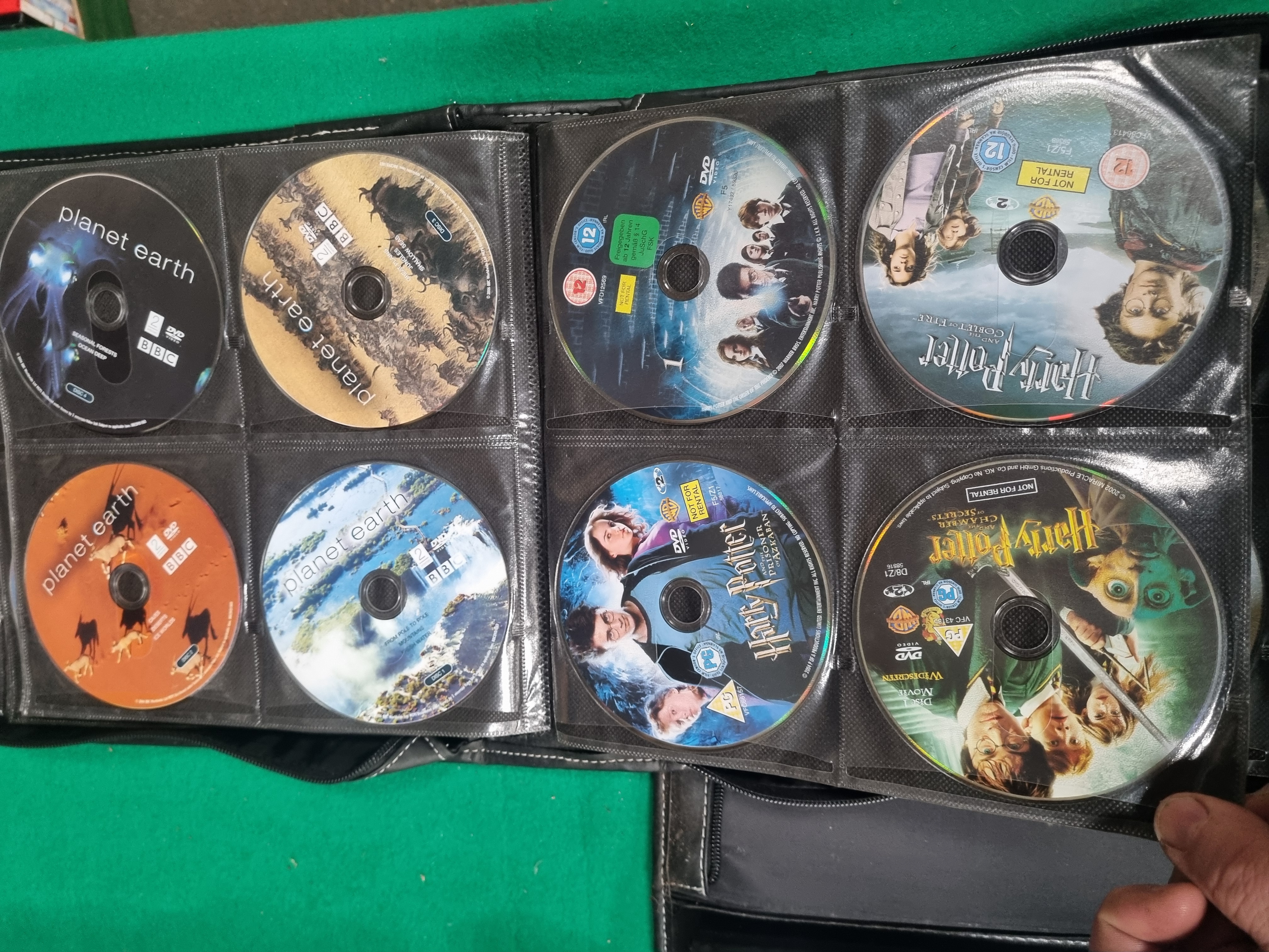 A broad collection of DVD media presented in a black, zippered multi-page storage binder. The collection features a variety of television and cinematic titles, including the BBC series Planet Earth, multiple Harry Potter films, The Fresh Prince of Bel-Air Season One, The Mighty Boosh, and Wallace & Gromit. The assortment also includes feature films such as Apocalypse Now Redux, Night of the Living Dead, Commando, Stargate, The Frighteners, and Pirates of the Caribbean: The Curse of the Black Pearl. Animation and anime titles are present, including Afro Samurai, Yu-Gi-Oh!, and Professor Layton and the Eternal Diva. The discs feature standard British Board of Film Classification (BBFC) age rating markings and logos for major distributors including the BBC, Disney, and Warner Bros. Several discs are marked with text indicating they were not intended for individual rental or resale. The binder features an adhesive label from Liskeard Auction Rooms and a handwritten identification mark.
