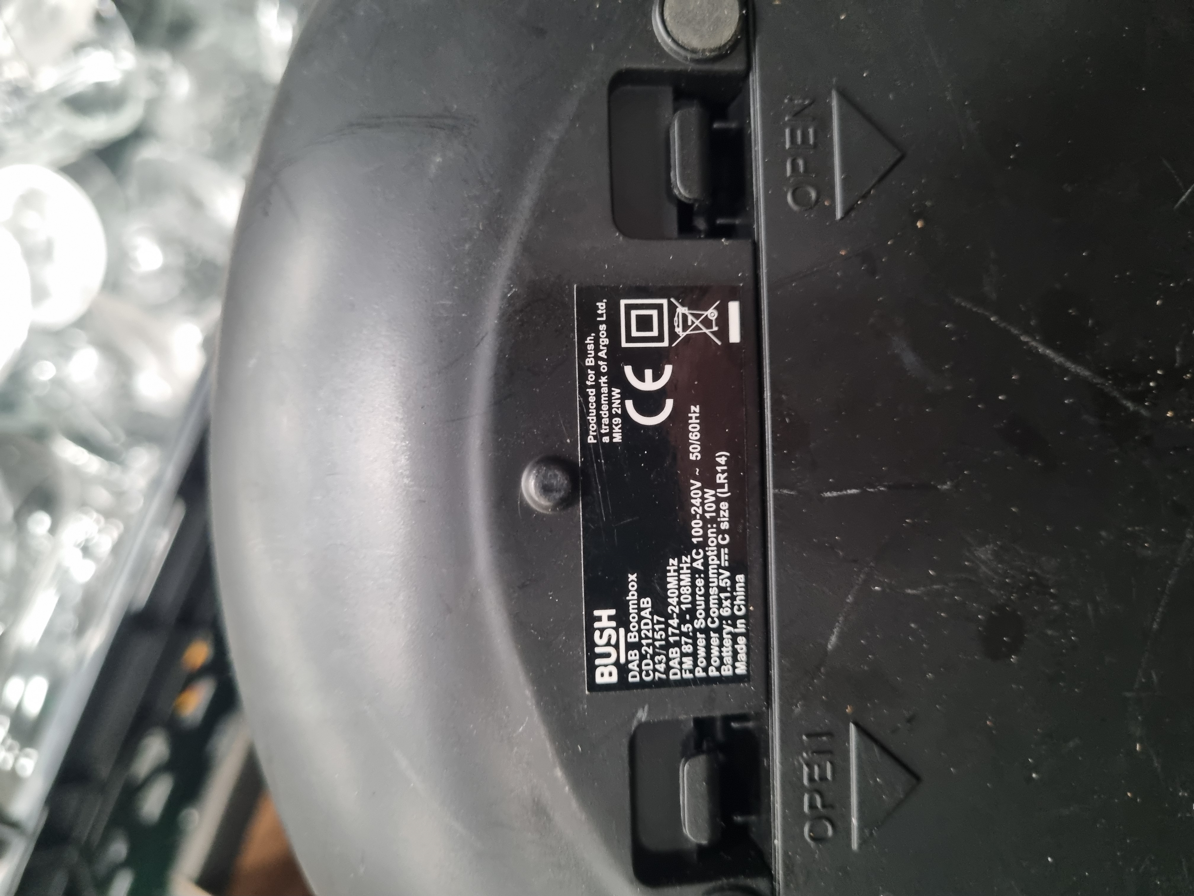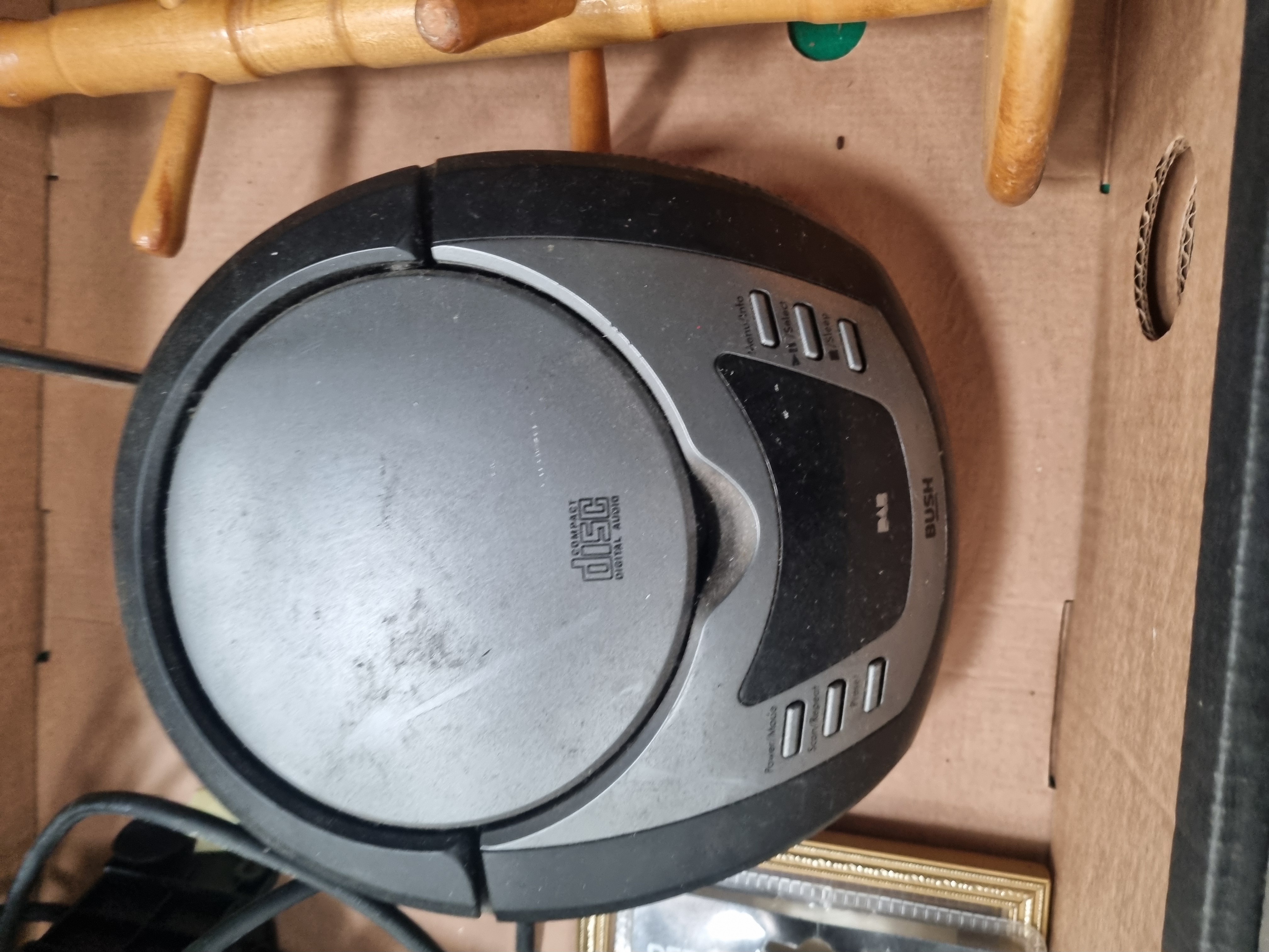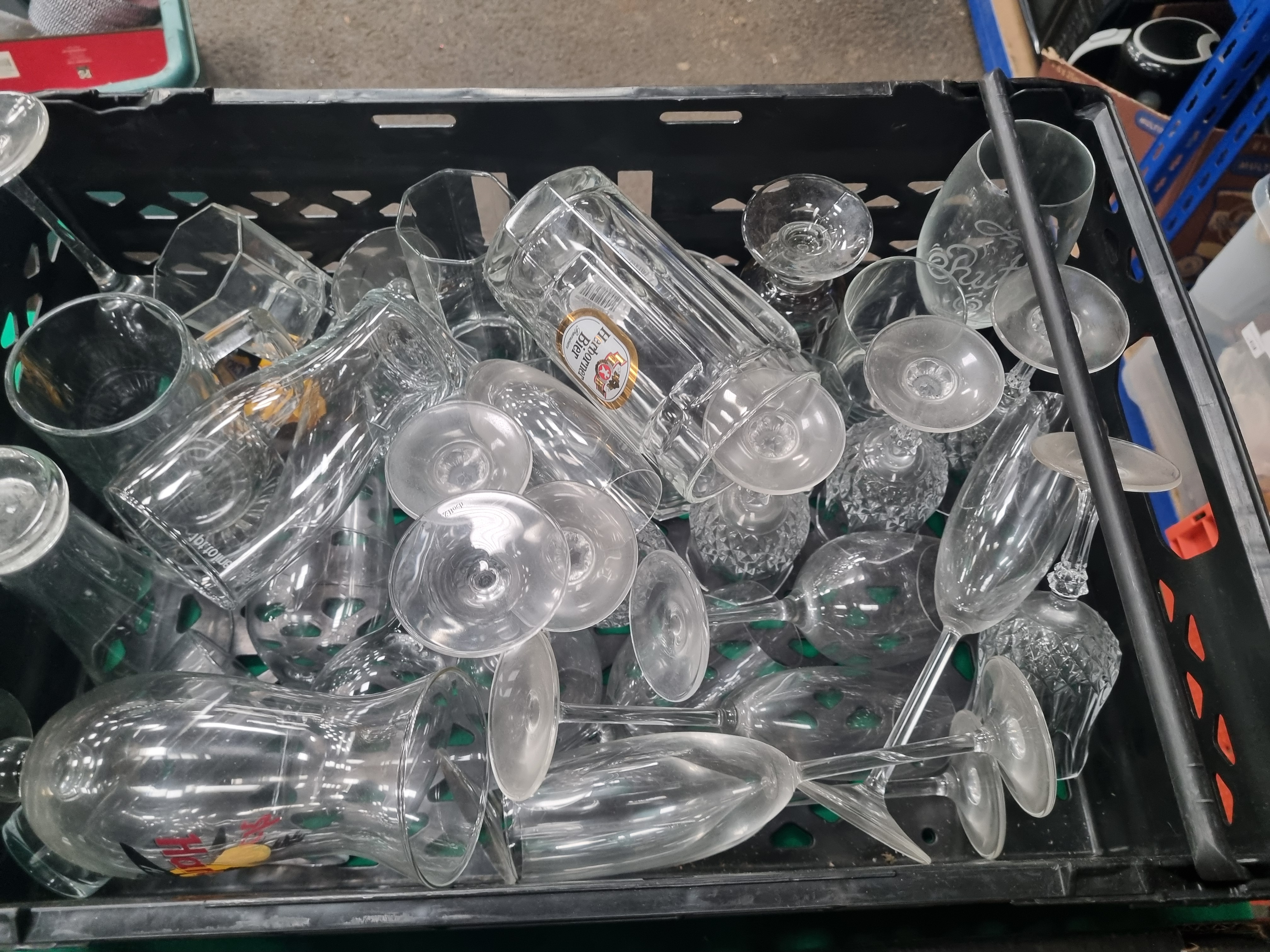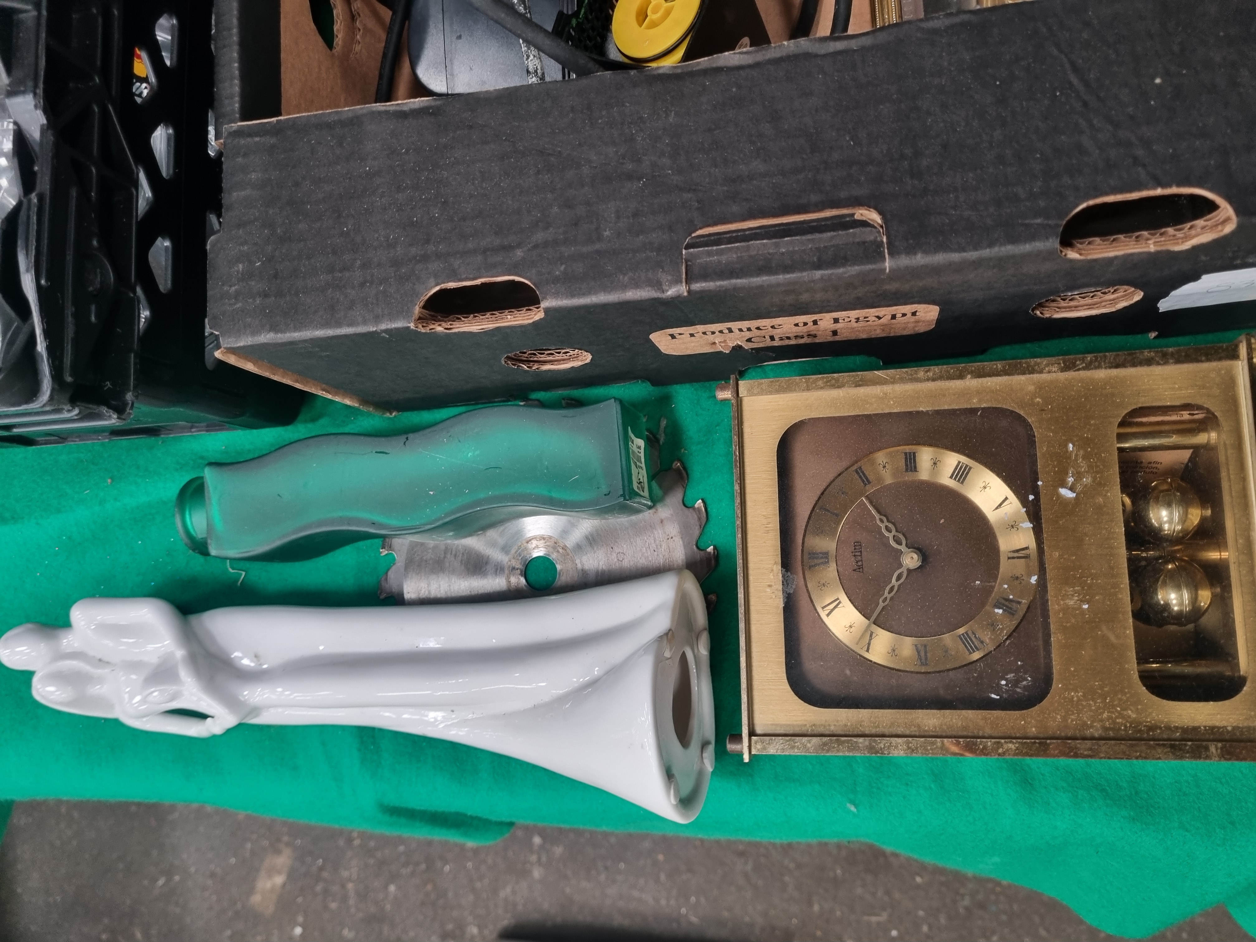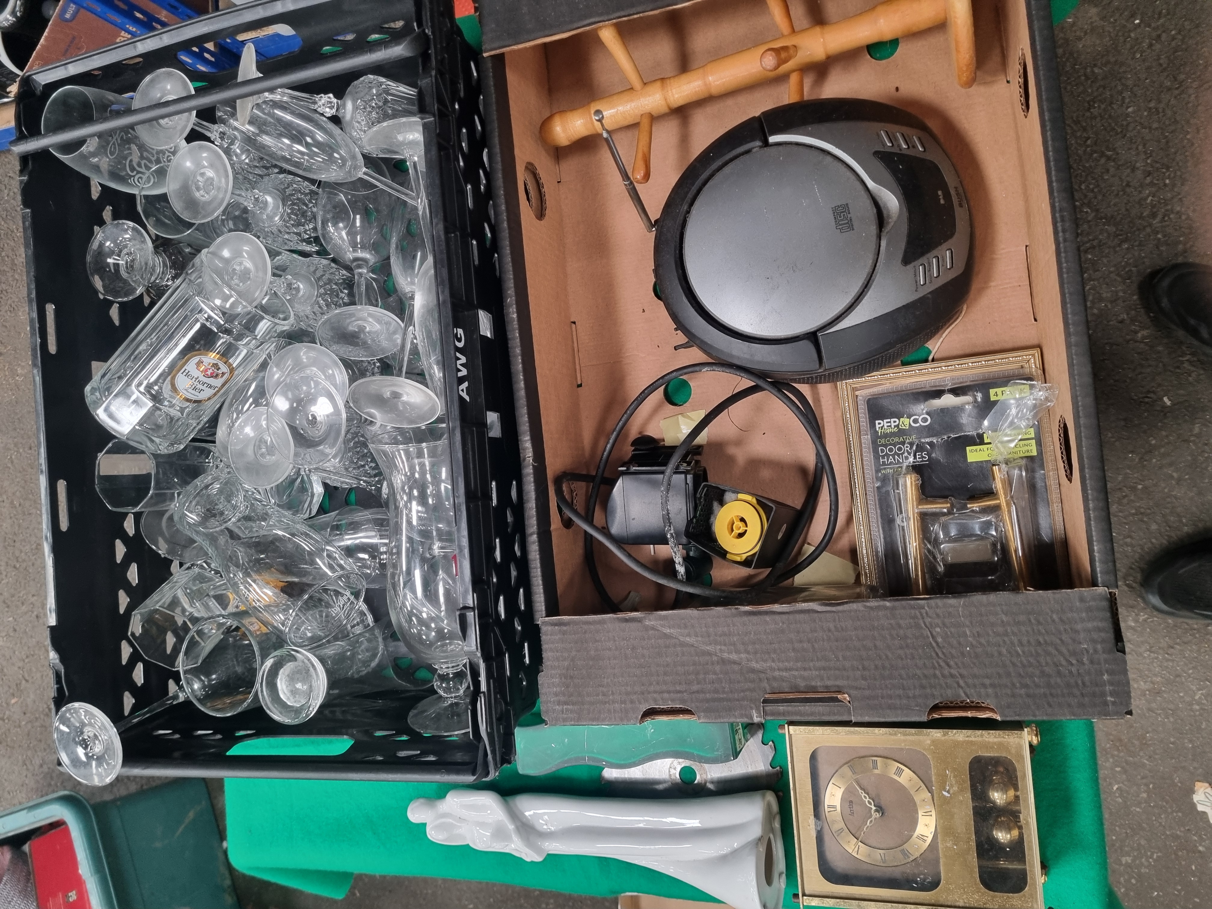 This lot comprises an extensive collection of items featuring a large quantity of assorted glassware. The glassware, contained in a plastic crate, includes wine glasses, champagne flutes, tumblers, and specialized beer glasses. Several pieces exhibit cut glass decoration with diamond and cross-cut patterns, while others are plain or etched, including one flute inscribed Bridesmaid and a stemmed glass bearing the Herborner Bier brand. The electronics include a Bush model CD-212DAB portable DAB and FM radio with a top-loading CD player in a grey and black housing. Horological interest is provided by an Acctim carriage-style mantel clock with a brass-finished frame and a visible rotating pendulum with four weights. Additional items include a white ceramic stylized figurine, a frosted green glass bottle of wavy form, a turned wooden mug tree, a retail-packaged set of Pep and Co decorative door handles, a small circular saw blade, and a compact electric water pump with a power cord.