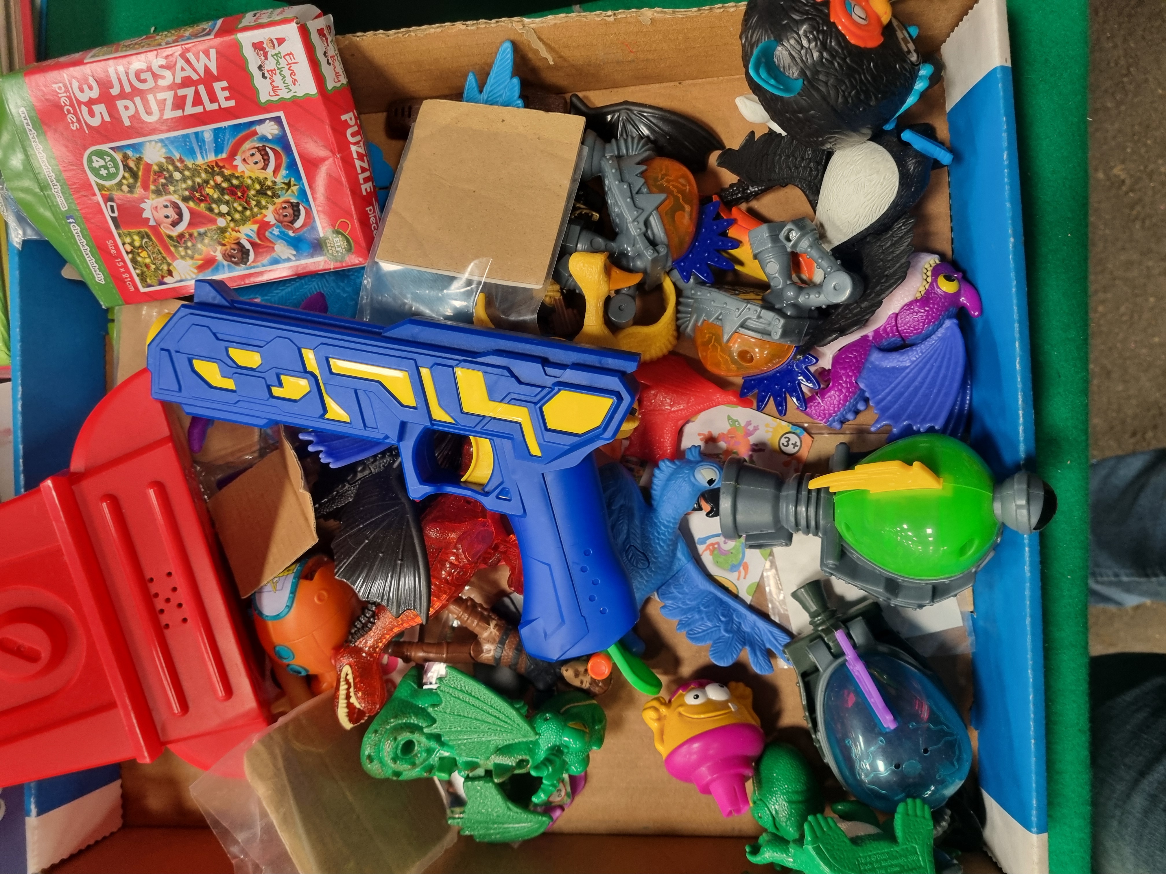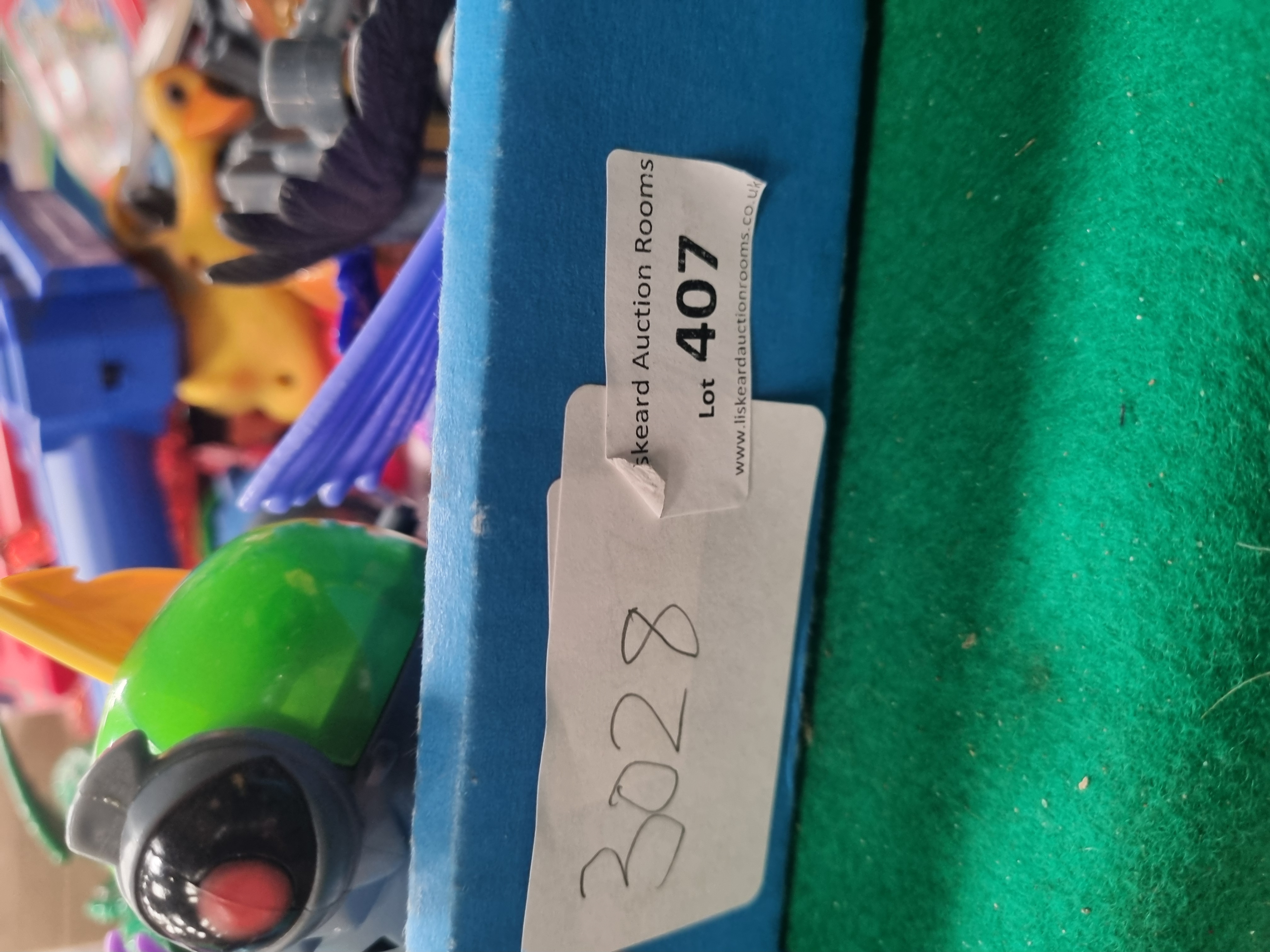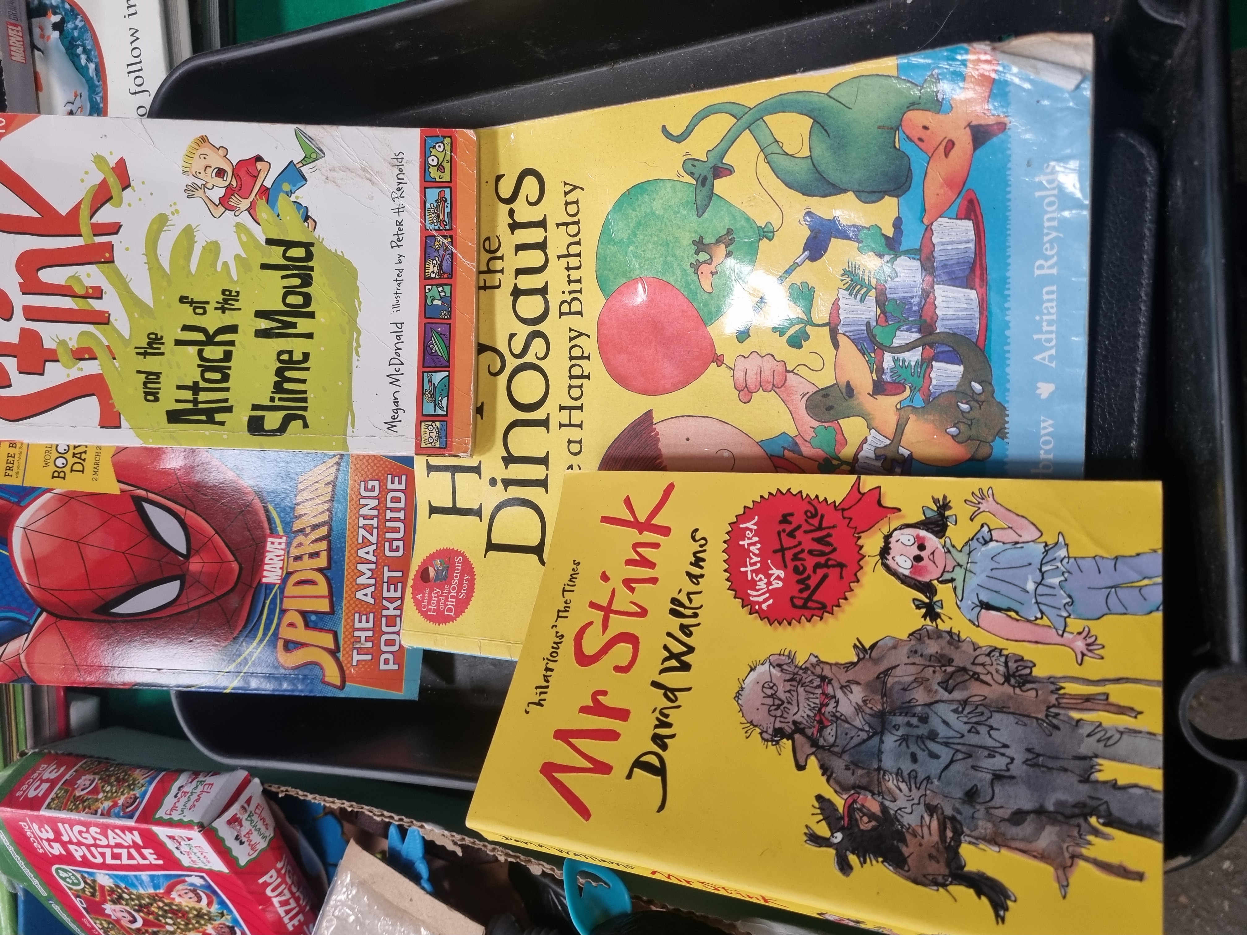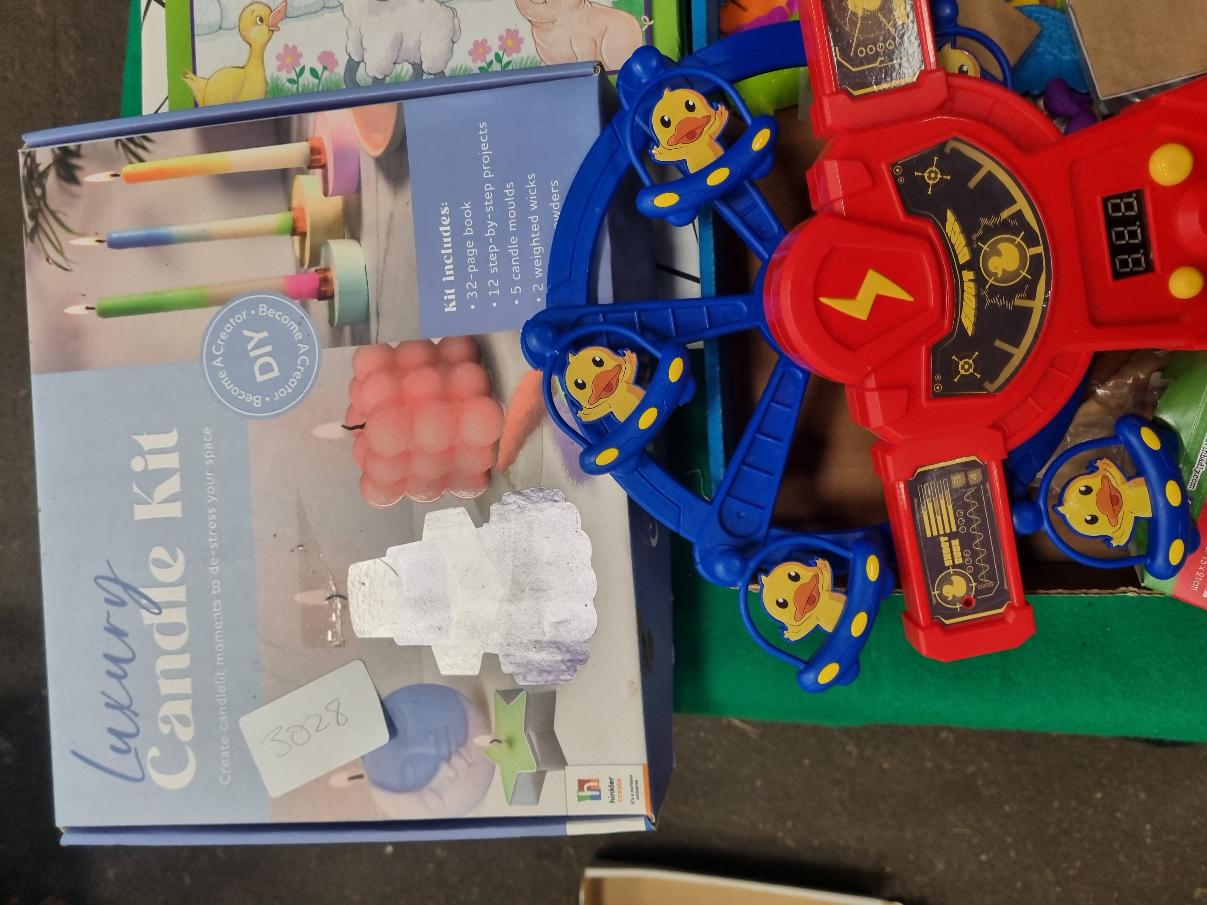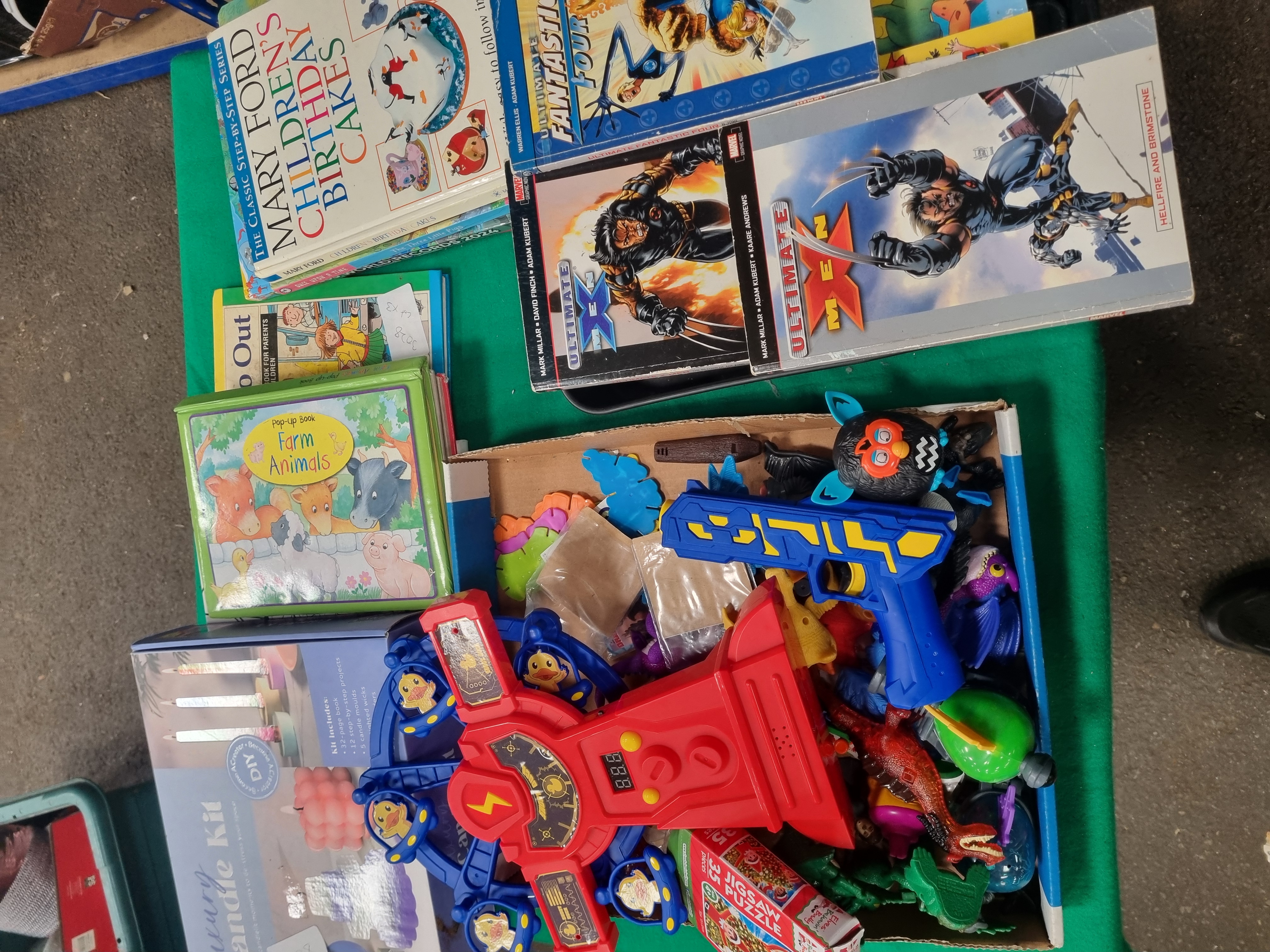 An assortment of childrens items comprising plastic toys graphic novels fiction books and an activity kit. The lot includes a red and blue plastic battery-operated Shoot Duck target game with a rotating ferris wheel mechanism and digital display accompanied by a coordinating blue and yellow spring-loaded toy gun. Also present is a Hinkler Luxury Candle Kit in its original box containing a 32-page book moulds and wicks. The literature includes Marvel Ultimate series graphic novels such as Ultimate Fantastic Four: N-Zone and two volumes of Ultimate X-Men. Other titles include Mr Stink by David Walliams Stink and the Attack of the Slime Mould by Megan McDonald and The Amazing Spider-Man Pocket Guide. Additional items consist of a boxed Elves Behavin Badly 35-piece jigsaw puzzle and a collection of loose plastic figures featuring dinosaurs dragons and a black and blue electronic Furby-style toy. Visible markings include the Shoot Duck title on the target game the Hinkler manufacturer mark on the candle kit and the Marvel logo on the graphic novels. The lot is processed by Liskeard Auction Rooms and bears labels for lot 407 and reference 3028.