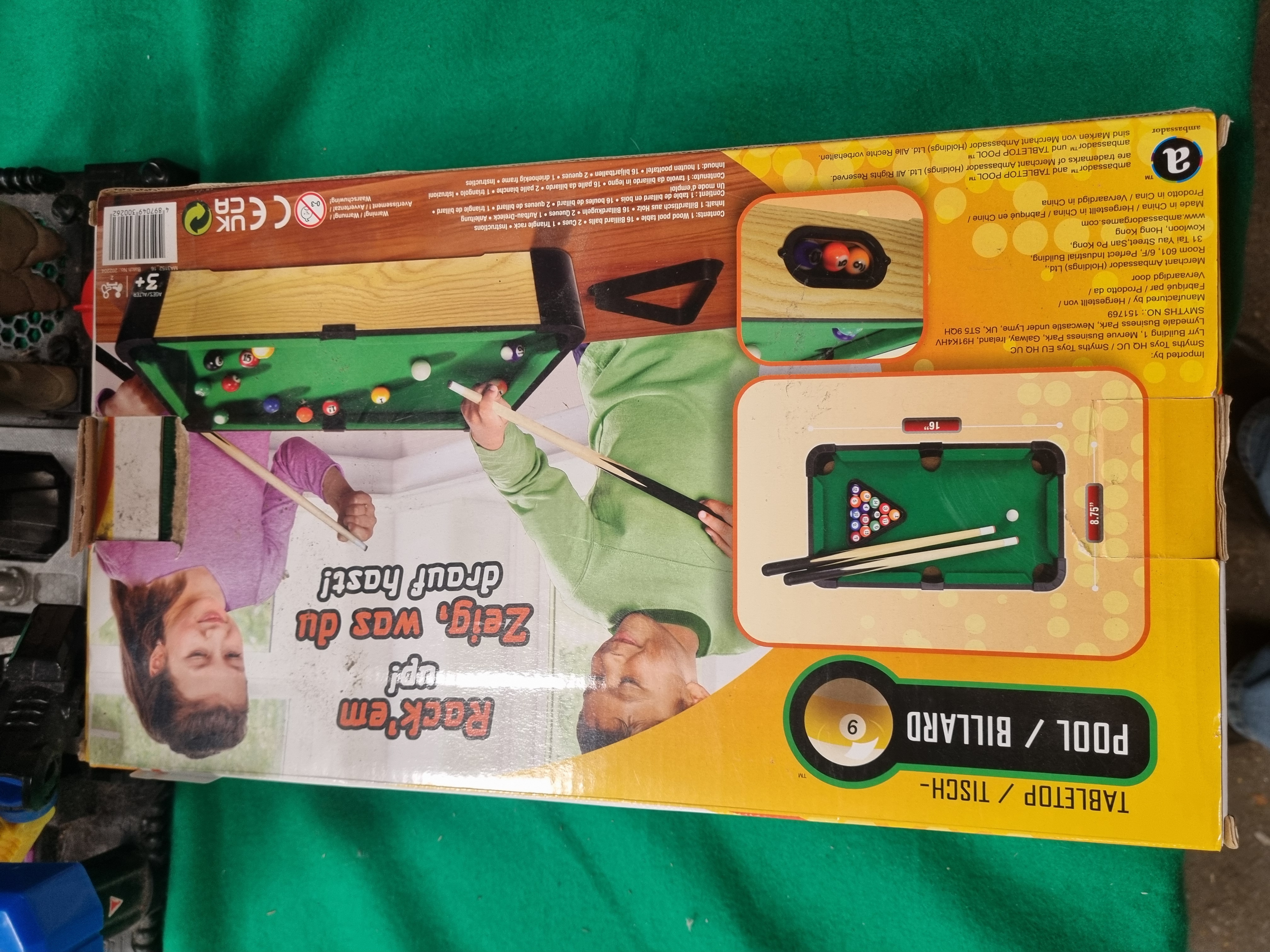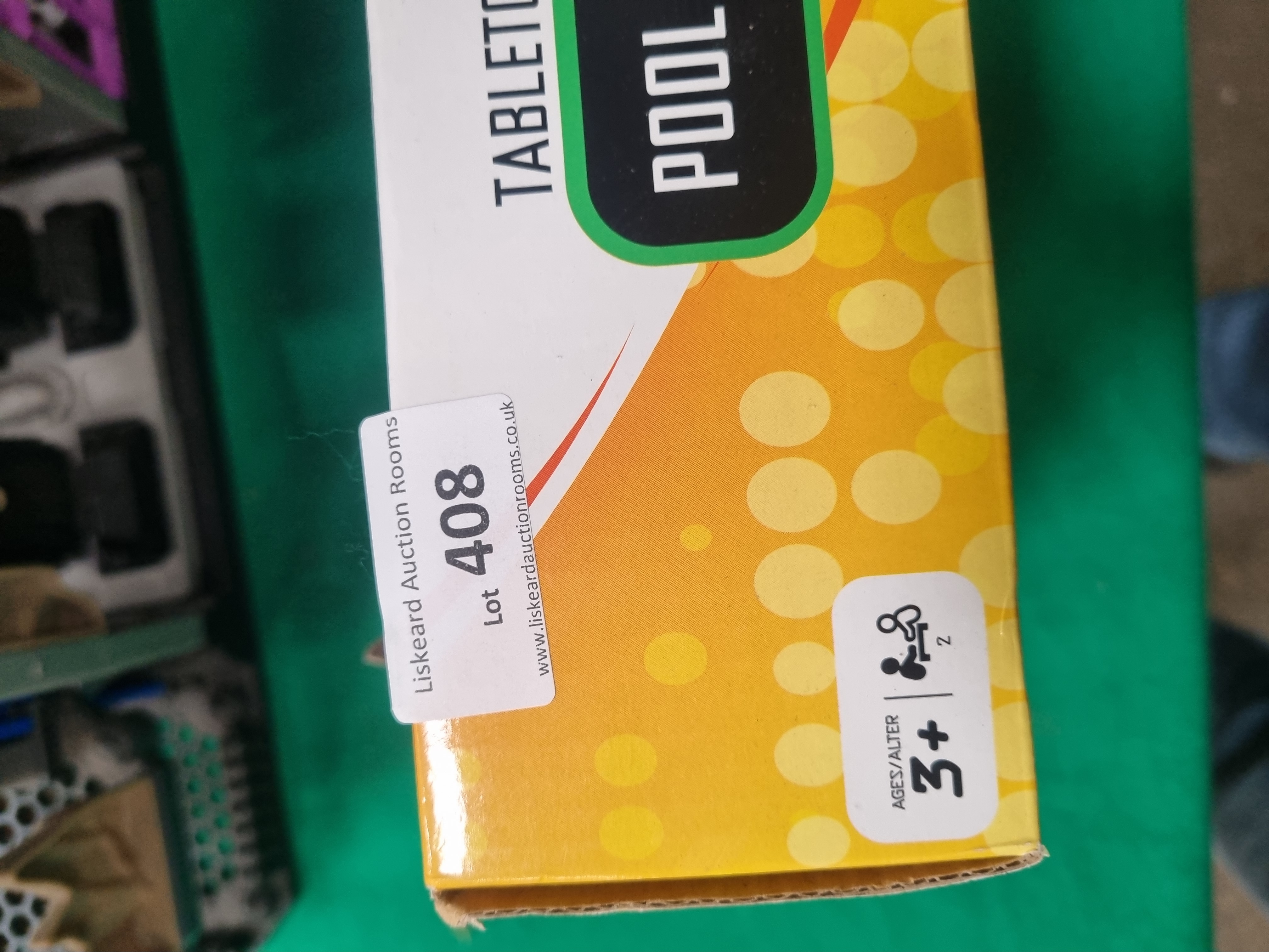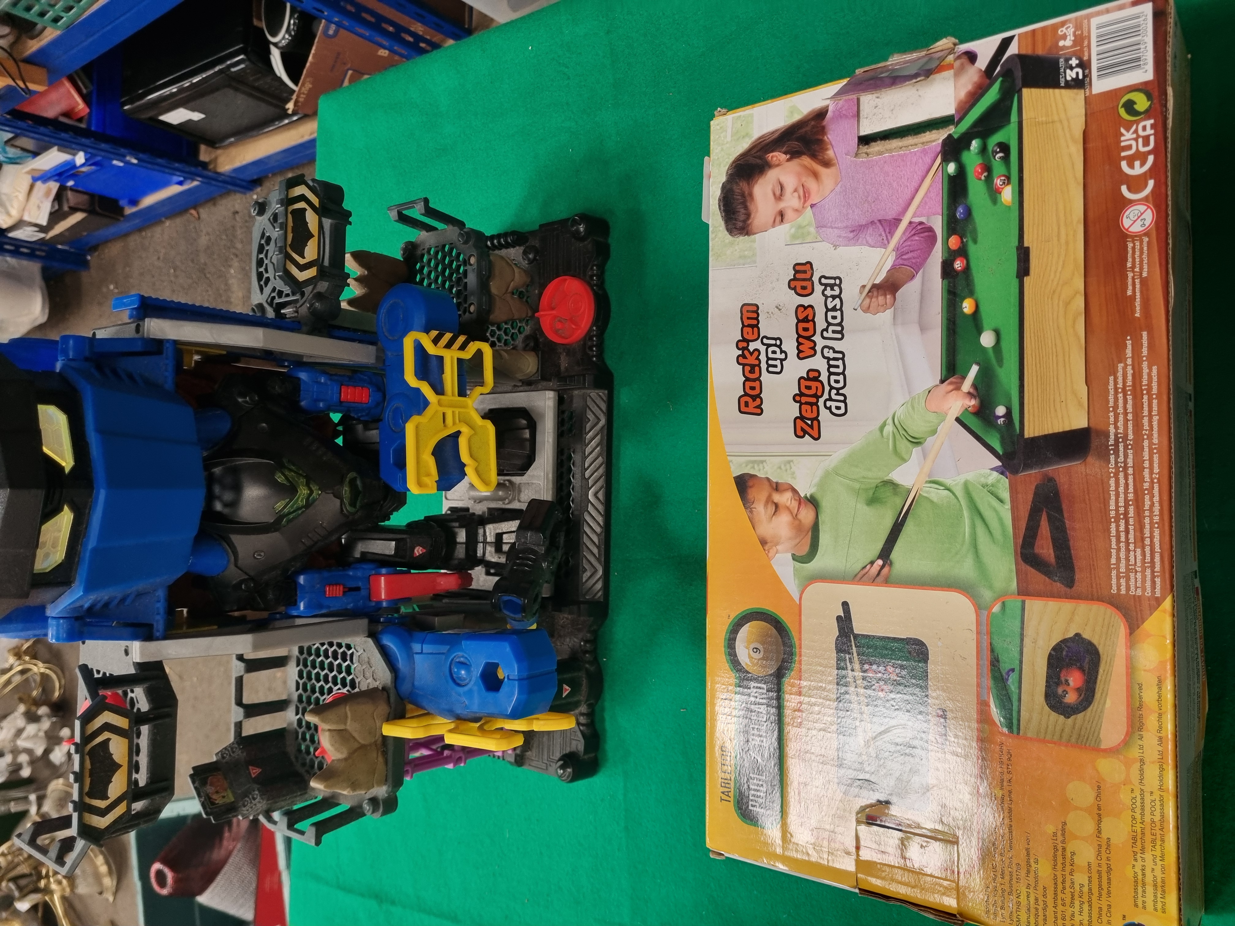 A lot comprising two children’s toys. The first is a Fisher-Price Imaginext DC Super Friends Battle Batcave playset, constructed from blue, black, and grey plastic with yellow and black Batman logos. The multi-level structure features a central command centre with green translucent windows, a purple cage, red dials, and yellow mechanical claws. The second item is an Ambassador Tabletop Pool / Billard set in its original retail packaging. The box indicates the set includes a wooden pool table, sixteen balls, two cues, and a triangle rack. A lot sticker from Liskeard Auction Rooms, numbered 408, is affixed to the pool set box.