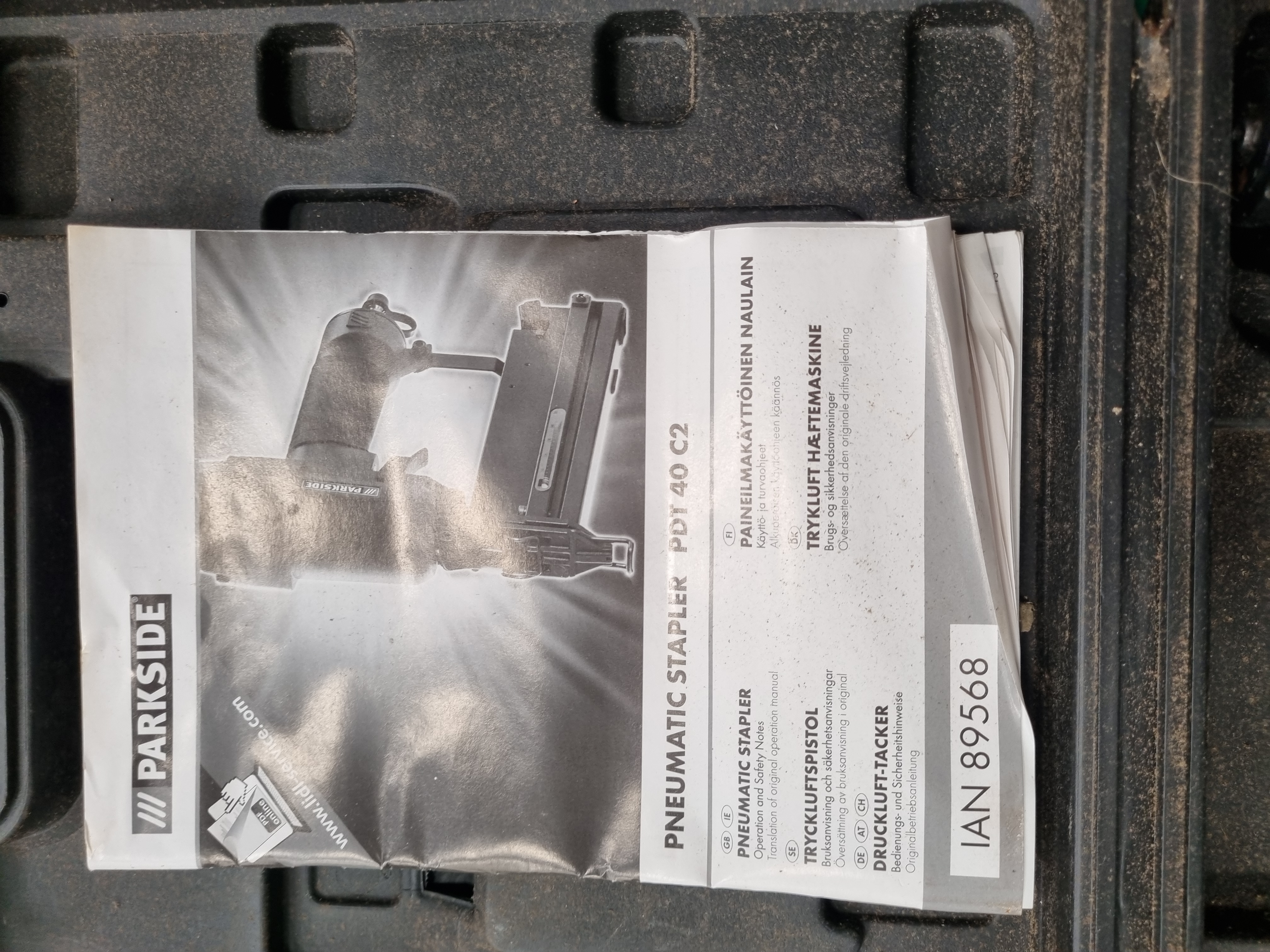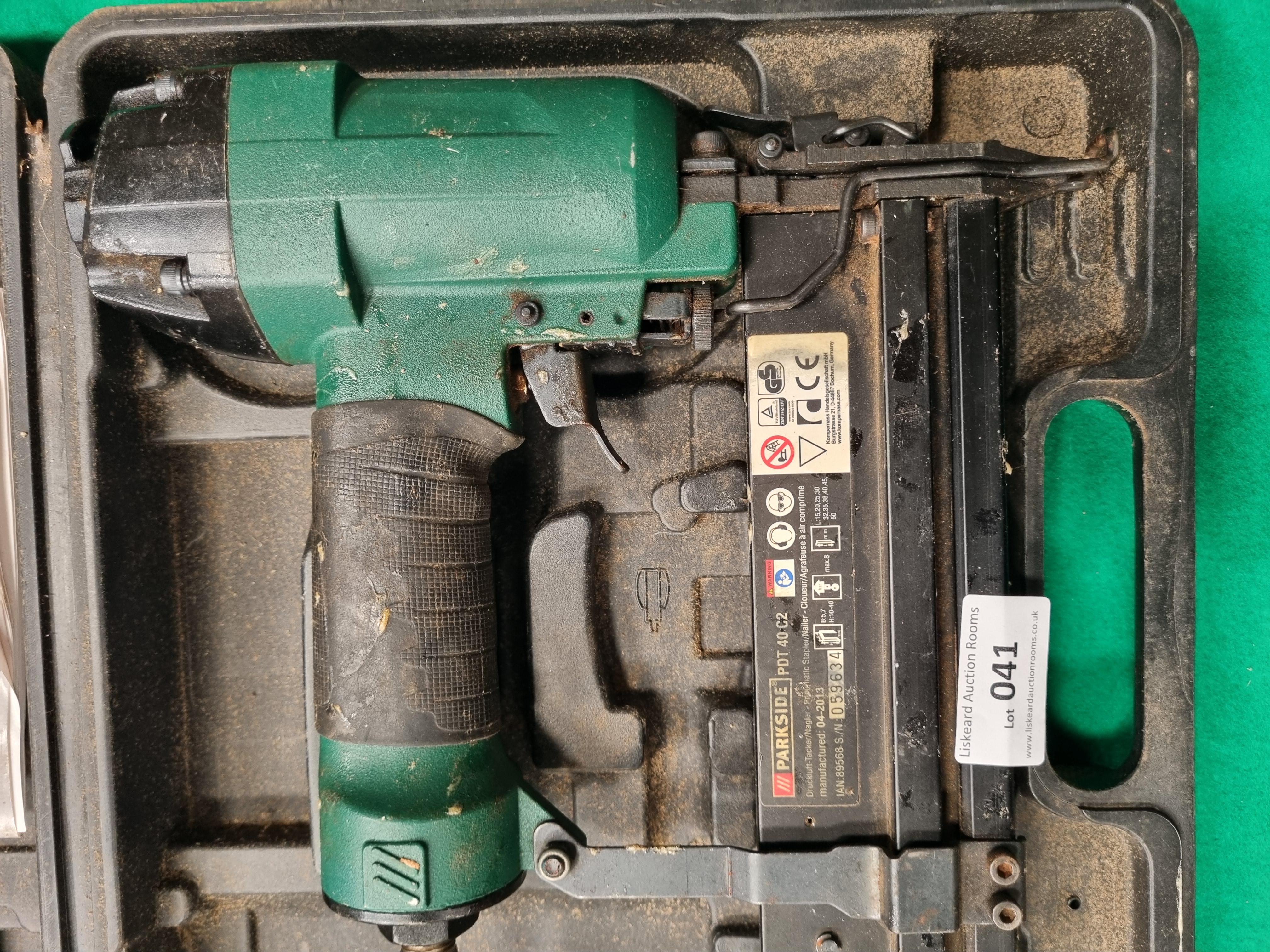 This lot features two power tools intended for workshop or domestic use. The first item is a Parkside pneumatic stapler and nailer, model PDT 40 C2. The tool is constructed with a metal body finished in textured green and black with a rubberised handle for grip. The magazine housing carries a label with the manufacturer mark and model details, including the manufacture date of April 2013 and the serial number 059634. It is housed in its original black plastic fitted carry case and includes the original multilingual instruction manual. The second item is a corded Power Devil electric jigsaw, model PDW5002. The unit features a red plastic housing and a metal base plate. A label on the side identifies the tool as a 280W power jigsaw from Rugby, England. It is fitted with a standard UK 3-pin plug and a steel blade.