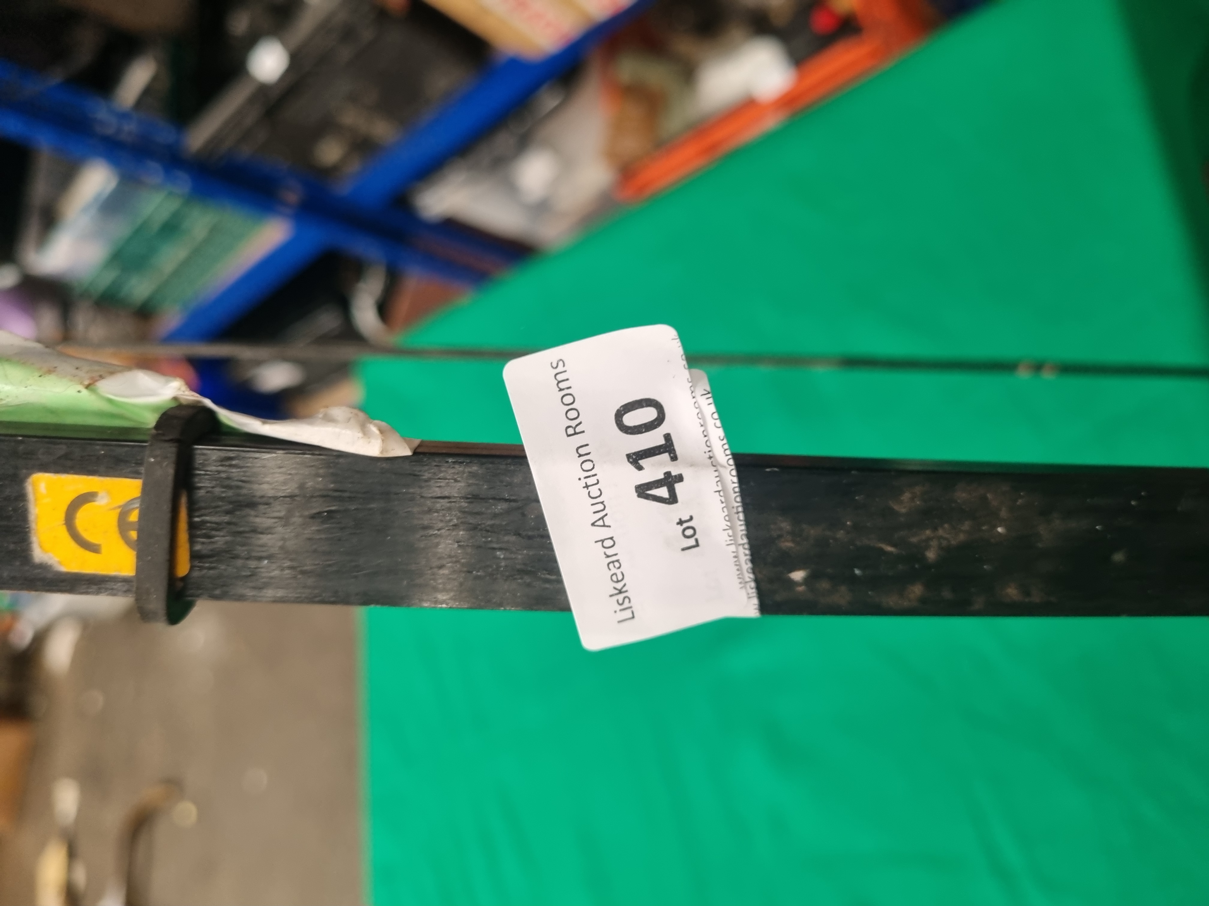 A recreational recurve bow featuring black flat-profile limbs and an orange moulded plastic grip riser. The central riser is textured with finger grooves for handling and includes a circular mark on the side. Matching orange plastic tips are fitted to the ends of the limbs to secure the string. The bow is currently fitted with a multi-strand string. Several adhesive labels remain on the limbs, including a yellow safety label with CE marking and a white auction tag from Liskeard Auction Rooms identifying the piece as Lot 410. The design and materials are characteristic of a beginner or youth model intended for durability.