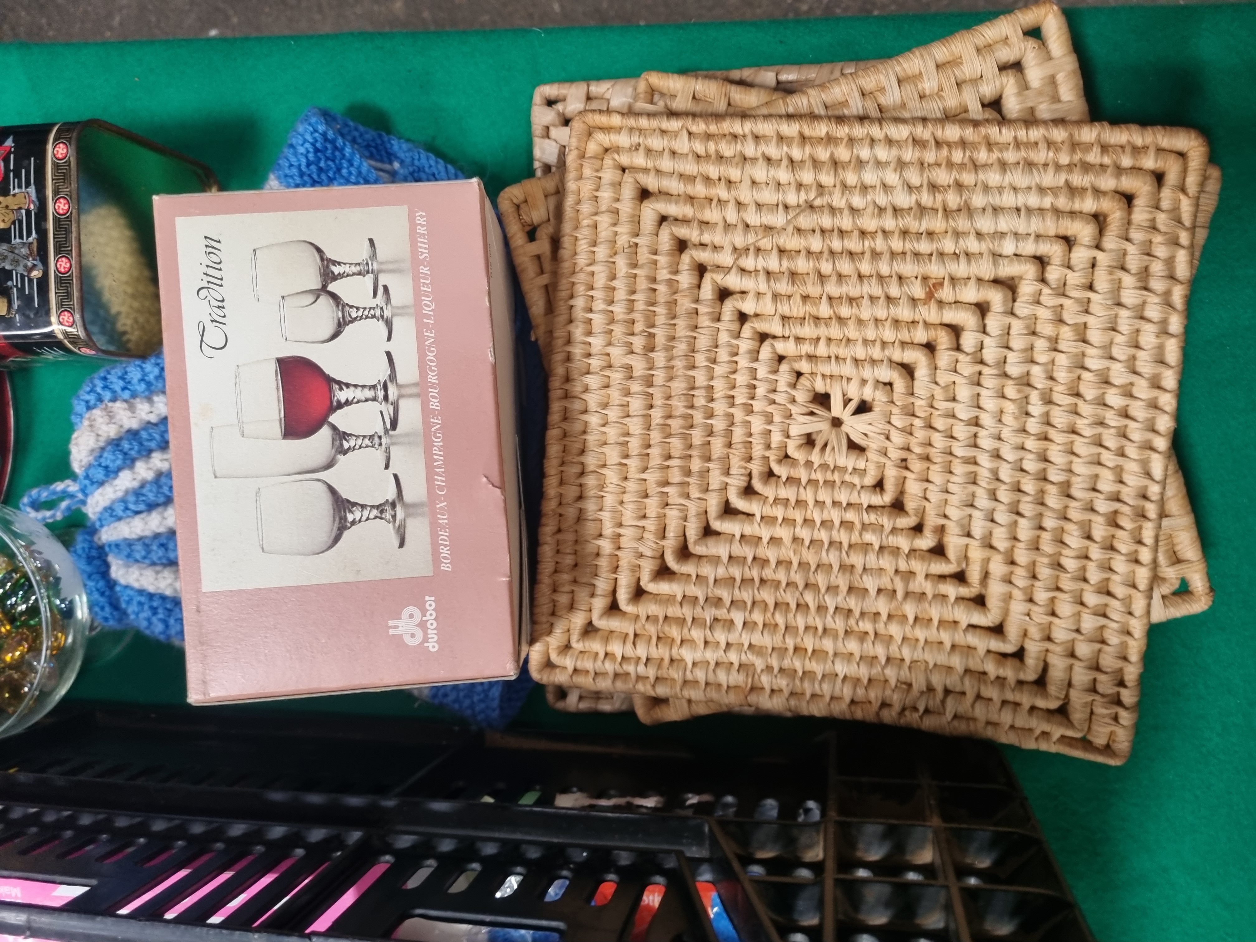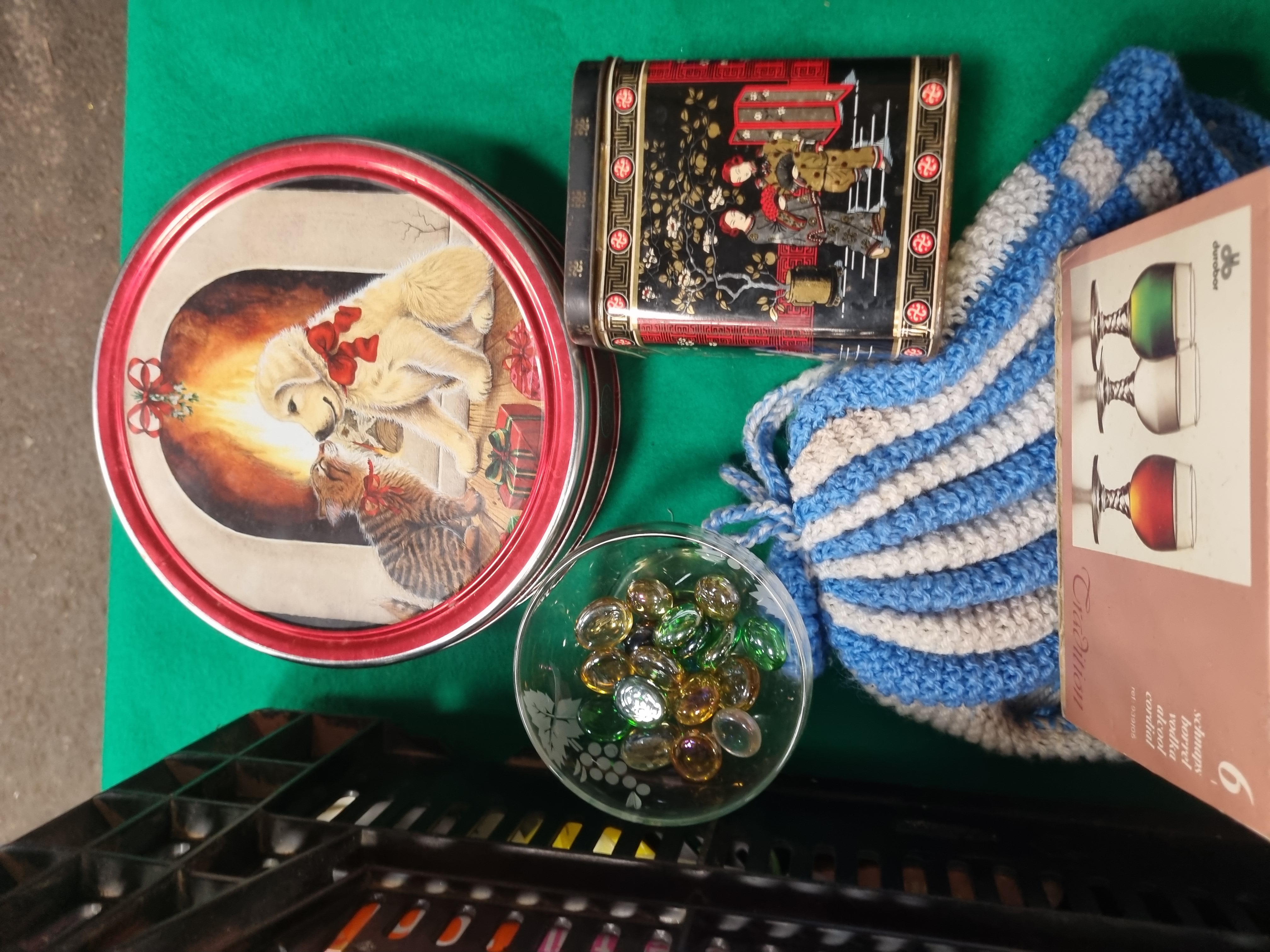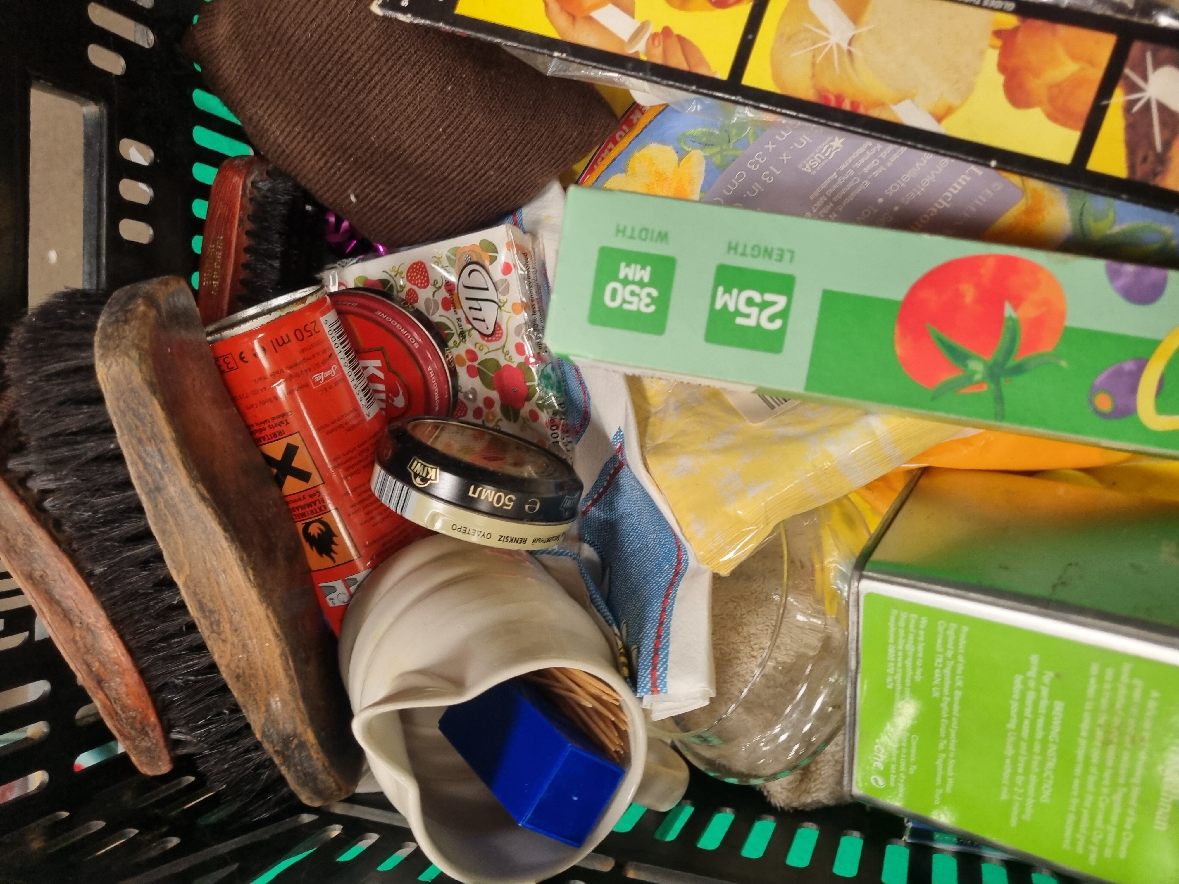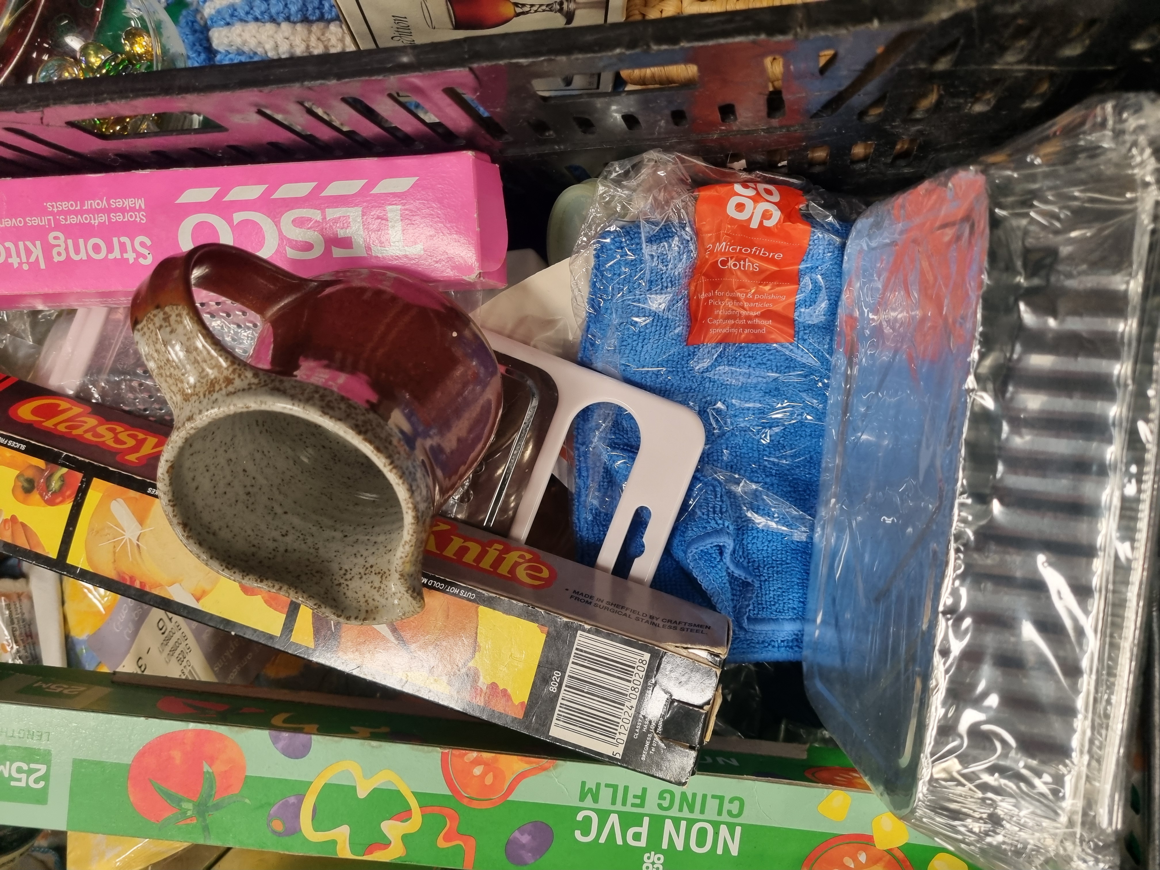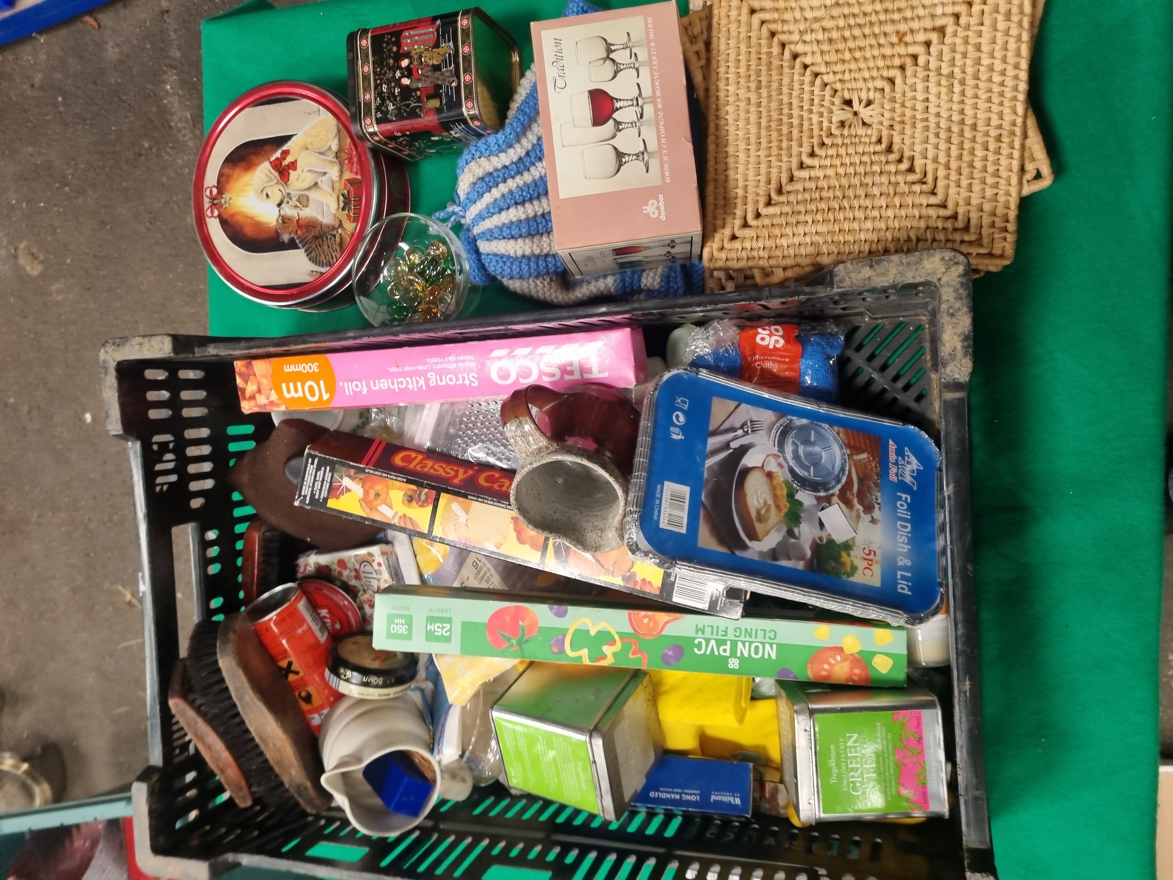 A mixed lot of domestic items and collectibles contained within a black plastic crate. Kitchenware includes a boxed roll of Tesco strong kitchen foil, a boxed roll of Co-op non-PVC cling film, a pack of AM Foil dish and lid sets, and a boxed Classy brand knife set. Glassware and ceramics feature a boxed set of Durobor Tradition schnapps or liqueur glasses, a small glass bowl containing decorative glass nuggets, and two ceramic pitchers, one with a mottled brown glaze and one in plain white. Decorative and collectible items include a round tin with a dog and cat illustration, a rectangular decorative tin with Asian-style figures, and a blue and white knitted tea cosy. Additional household goods comprise square woven wicker-style coasters, a pack of Co-op microfibre cloths, shoe care items including brushes and a tin of Kiwi shoe polish, a tin of Tregothnan green tea, and a pack of luncheon napkins. The lot also contains a red aerosol canister. The crate bears an auction label for Liskeard Auction Rooms, Lot 414.