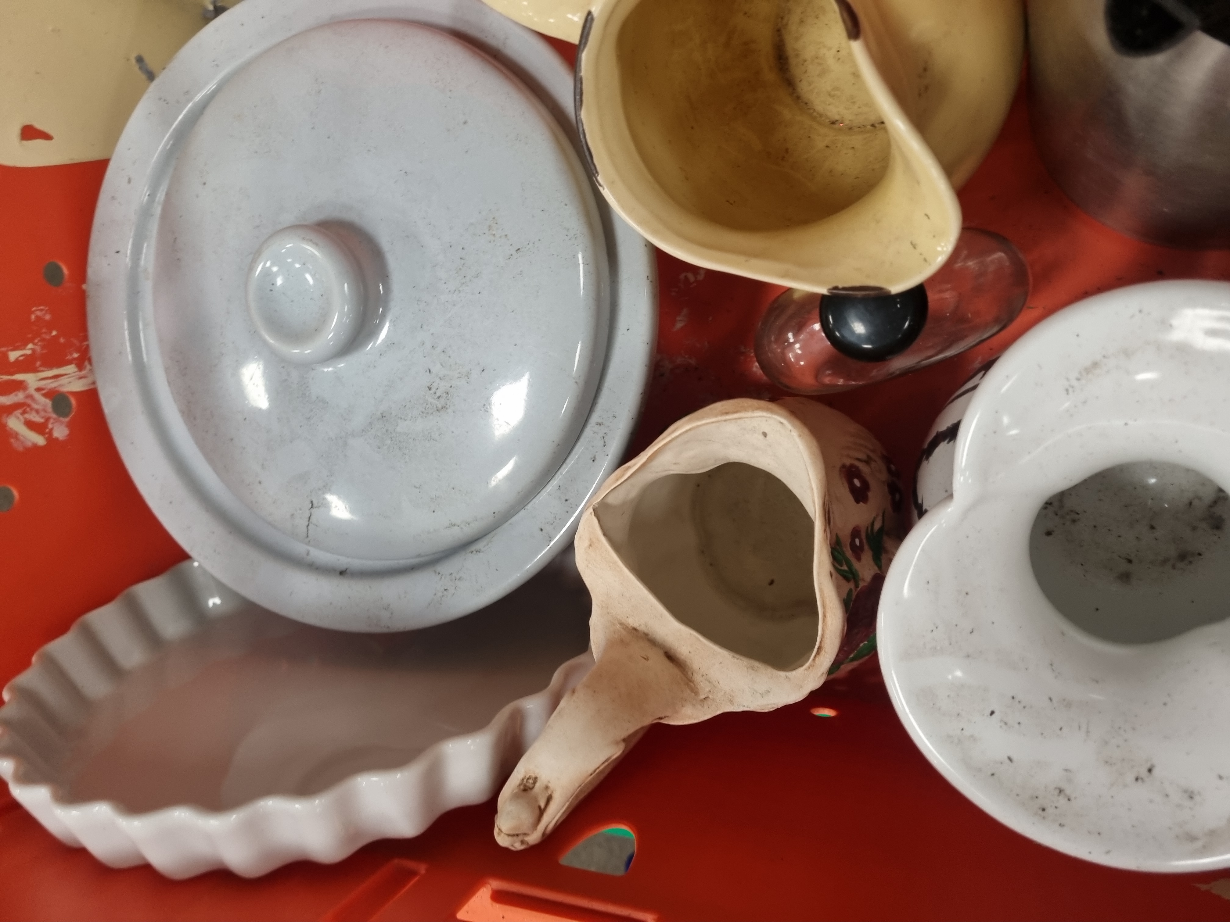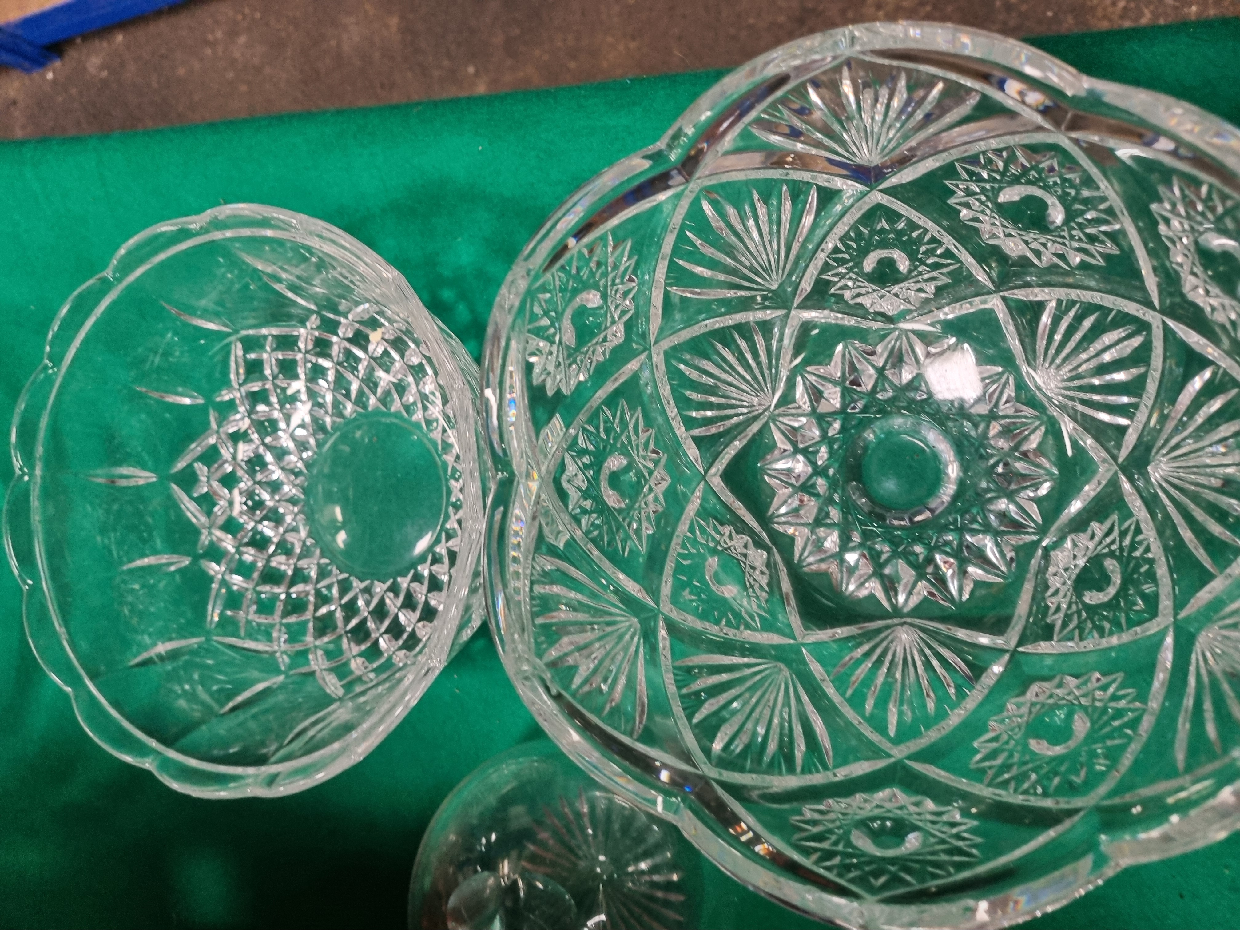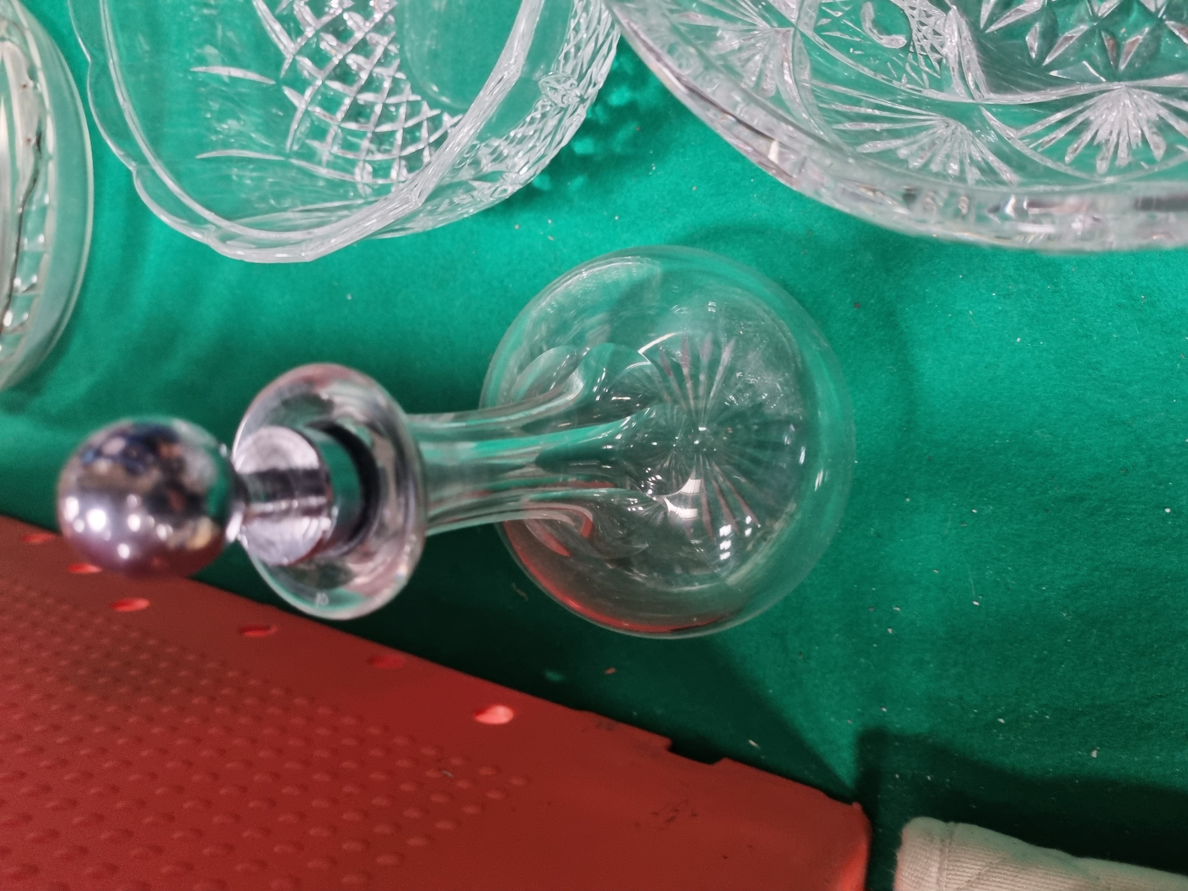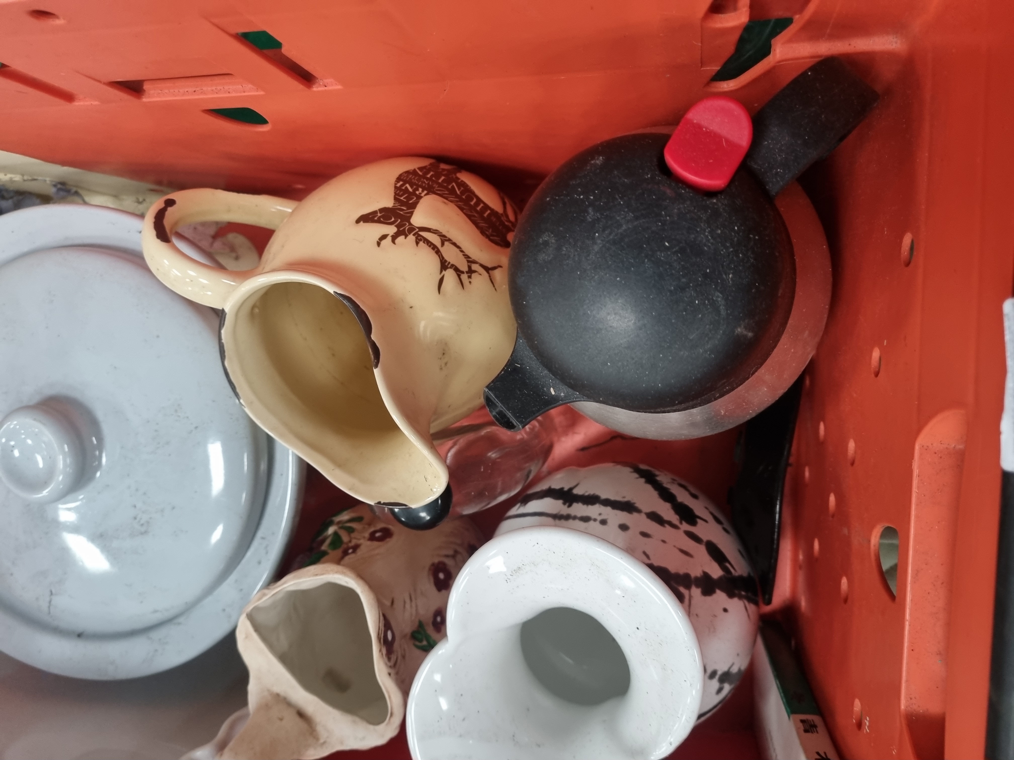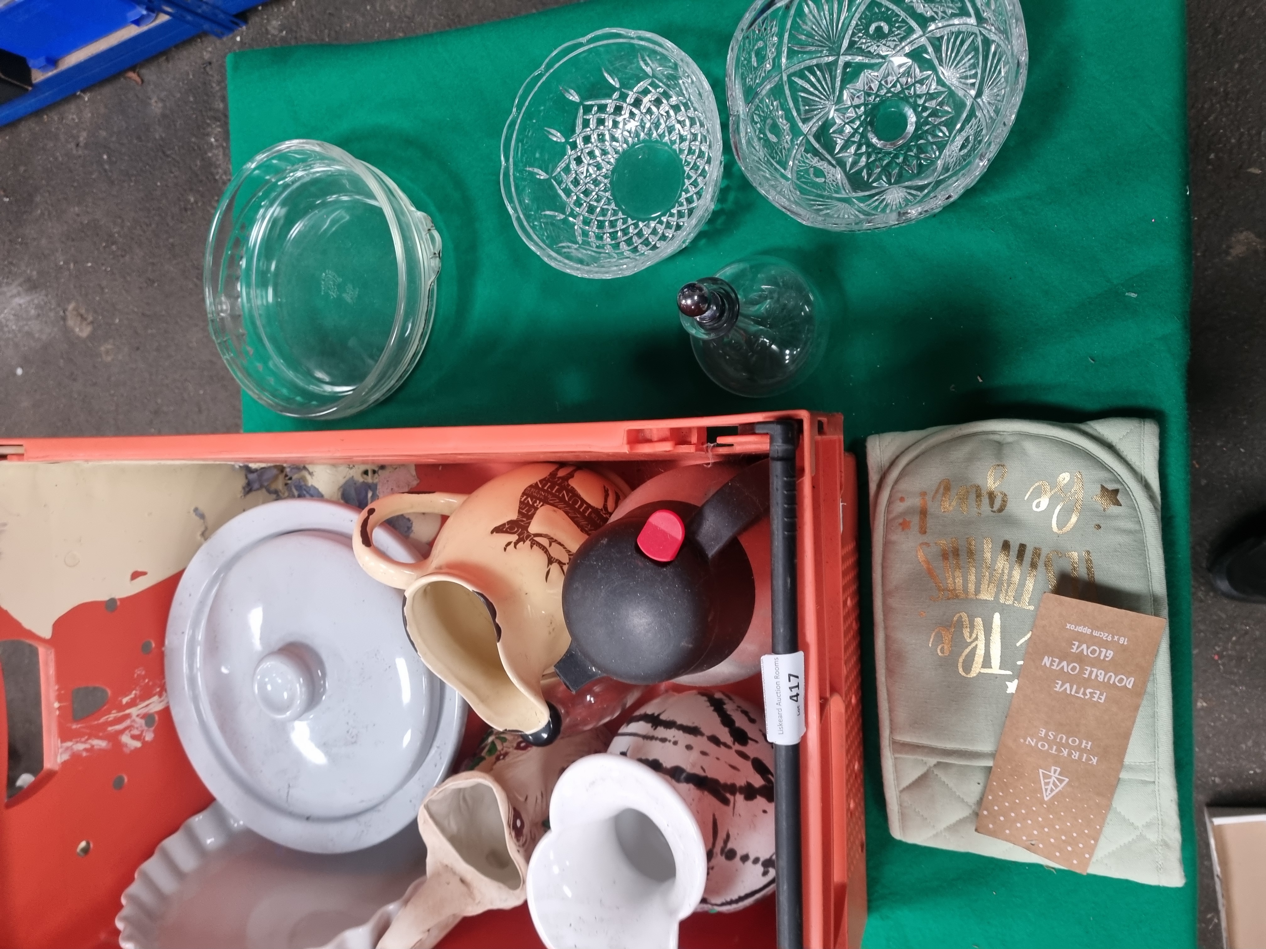 A collection of varied household items including glassware, ceramics, and a kitchen textile. The glassware comprises a large cut-glass bowl with hobstar and fan motifs, a smaller bowl with diamond-cut patterns, a plain circular serving dish, and a clear glass decanter featuring vertical fluting at the base and a spherical metal stopper. The ceramic items include a cream earthenware jug with a brown transfer-printed stag and the text THE HUNTING, a large circular lidded dish with a pale blue glaze, and a white ceramic tart dish with a fluted rim. Also included are a small floral-decorated jug, a white vase with black linear patterns, and a modern black plastic thermal carafe with a red push-button lid. A packaged Kirkton House festive double oven glove in sage green with gold-coloured lettering completes the lot. Items are marked with a Liskeard Auction Rooms tag for lot 417.