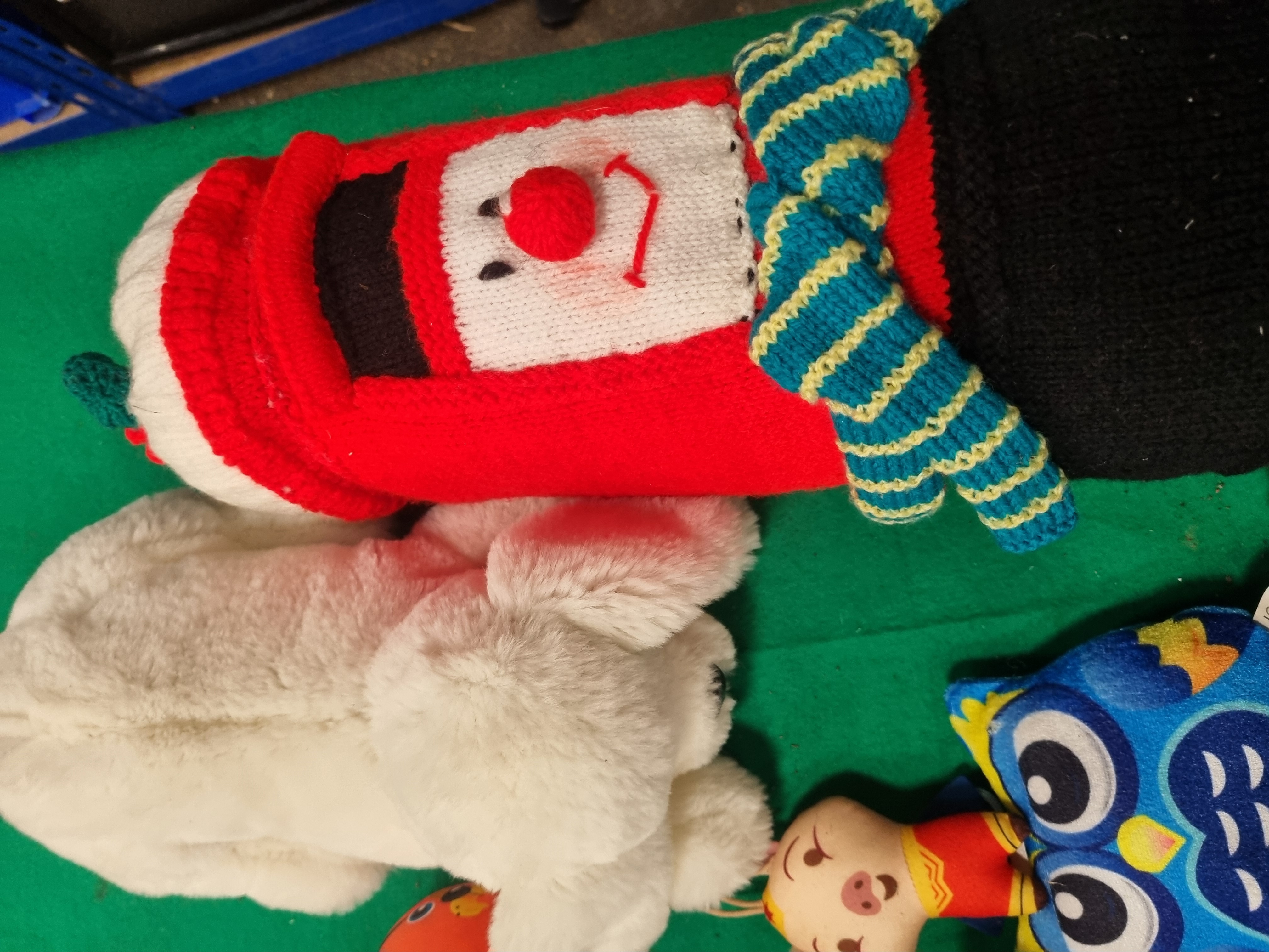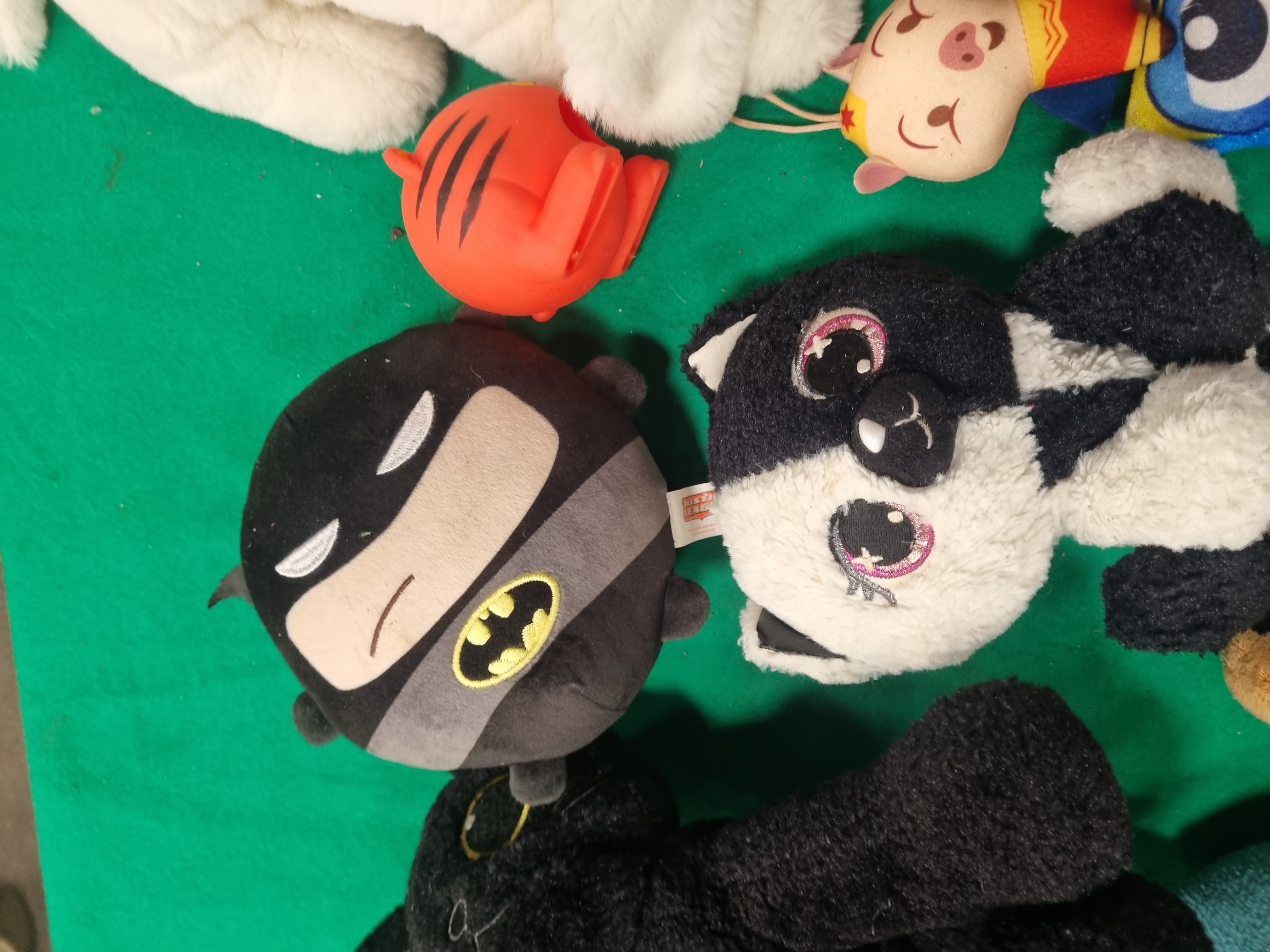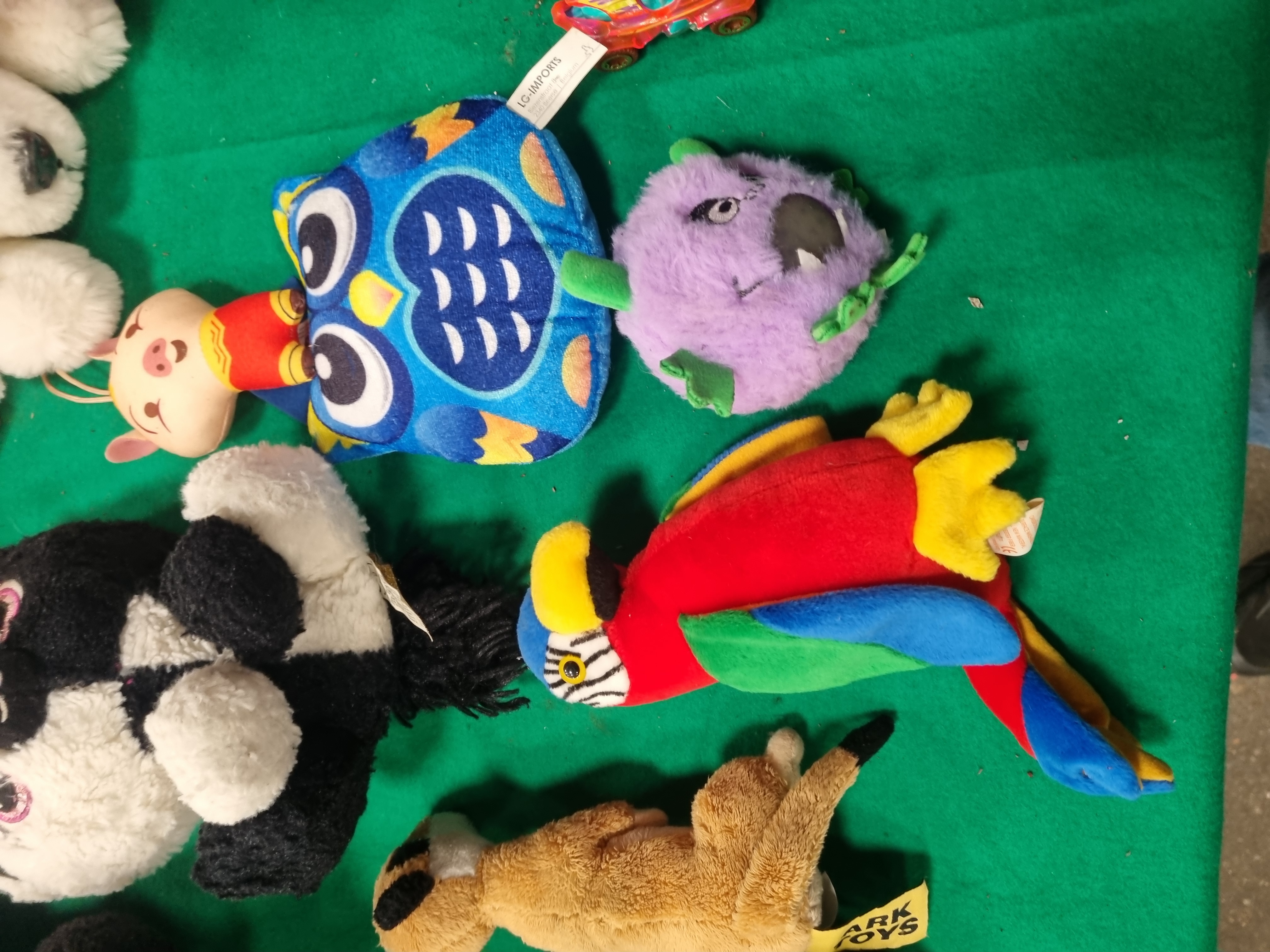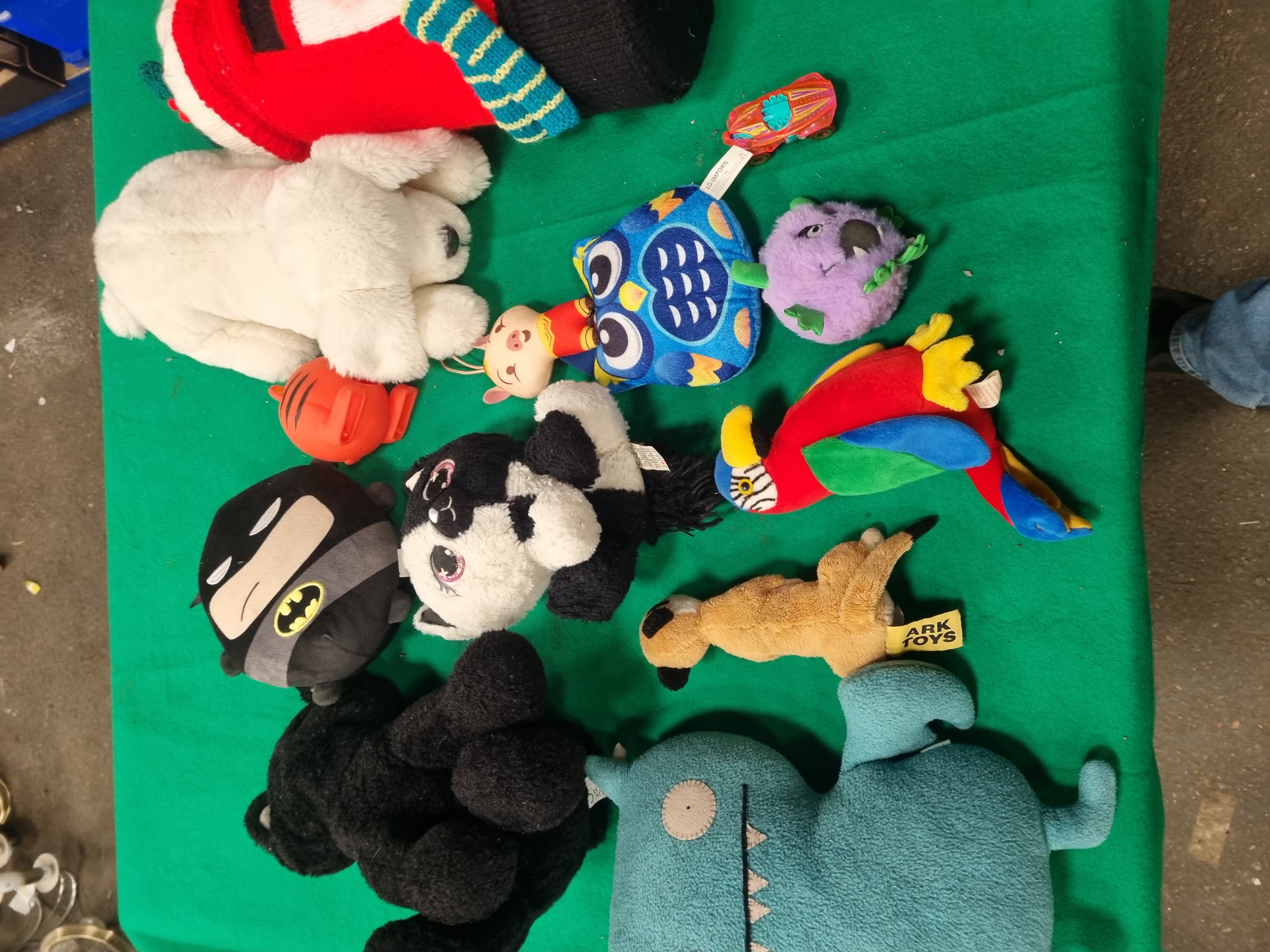 An assortment of contemporary plush toys and soft novelties featuring various licensed and generic characters. The collection includes a Batman plush with a Just Play manufacturer tag, a small Wonder Woman plush, and a teal-coloured monster with felt features in the style of an Uglydoll. Animal-themed items include a multi-coloured parrot, a large white plush polar bear or dog, a black and white animal with large glitter eyes, a purple grumpy creature, and a brown meerkat with an Ark Toys cloth tag. Also present is a stylised blue owl by LG-Imports, an orange moulded plastic tiger-striped item, a small patterned toy vehicle, and a long knitted novelty item in red, white, and black with a blue and green striped scarf. Materials consist primarily of synthetic fabric and plush, with some items featuring plastic components. Several pieces retain original manufacturer labels.
