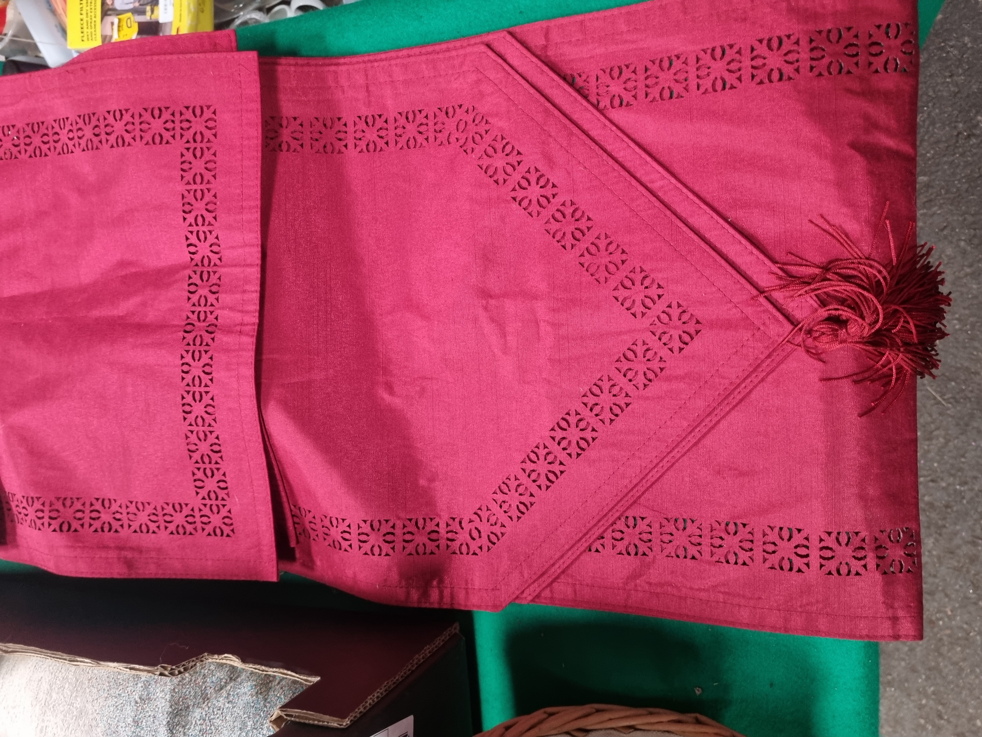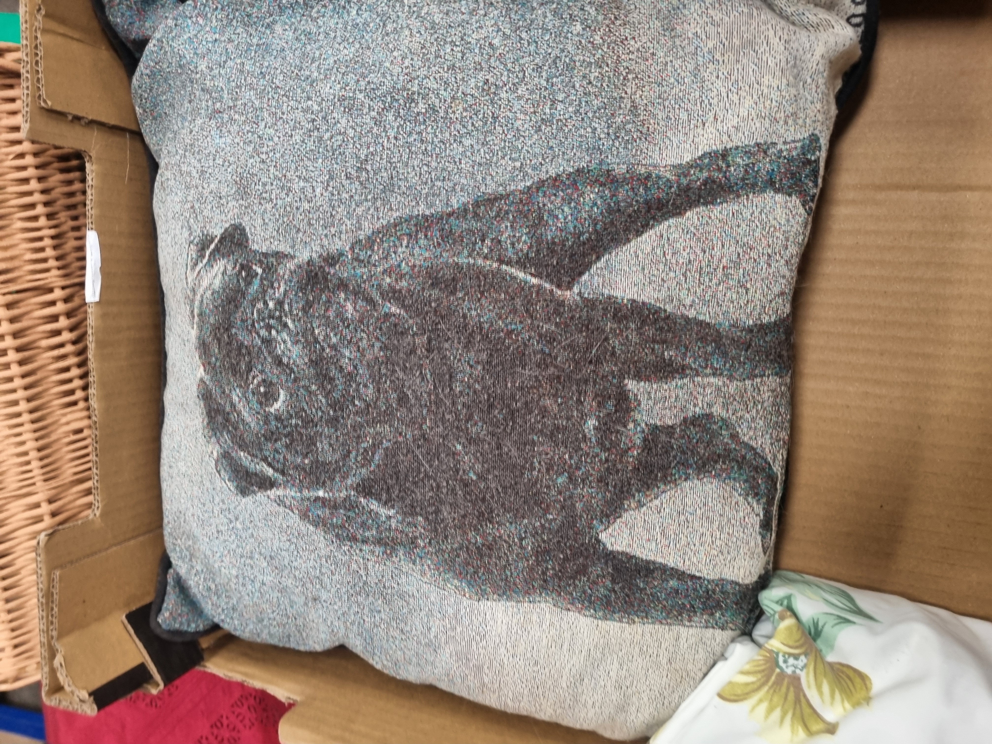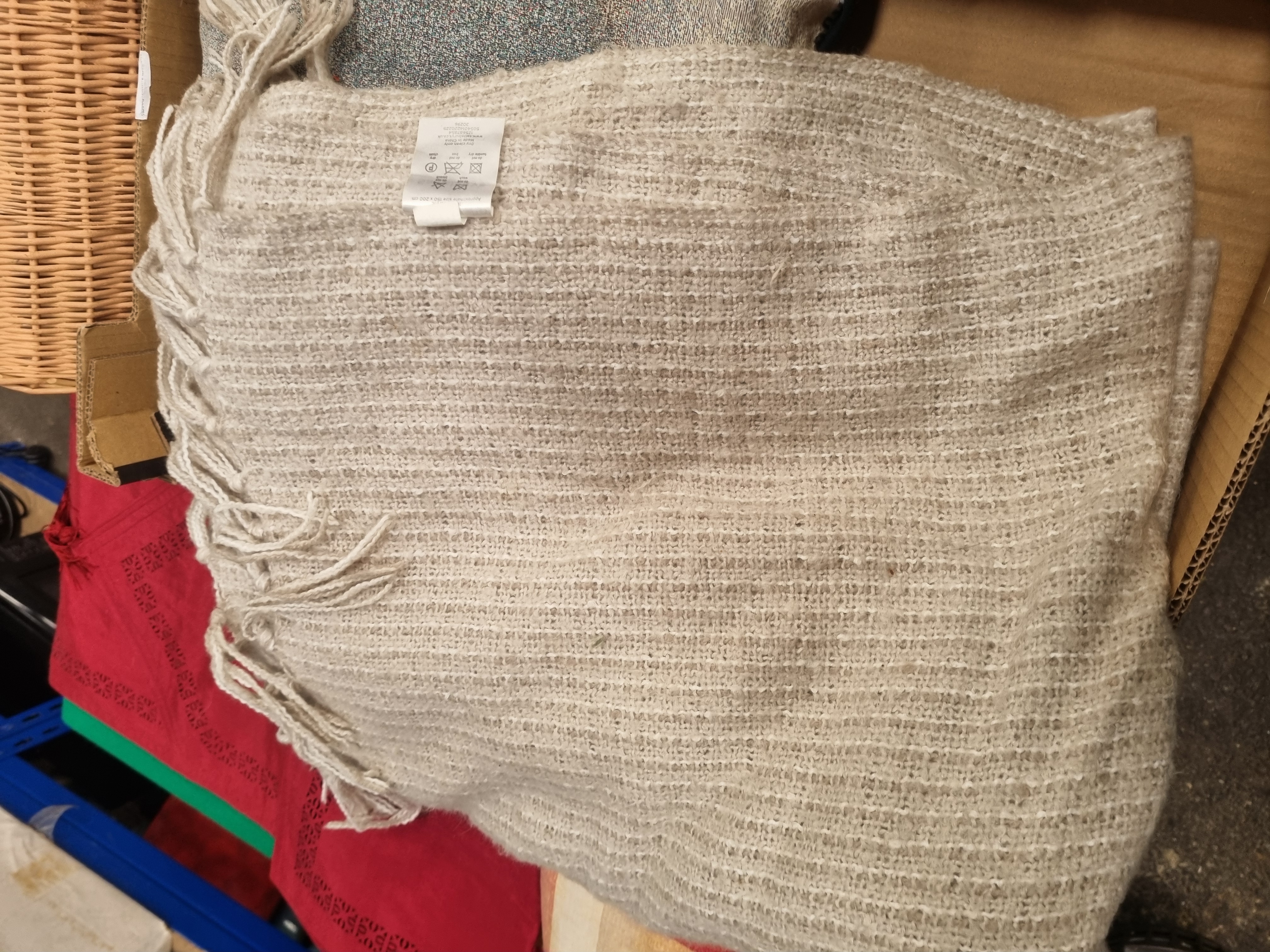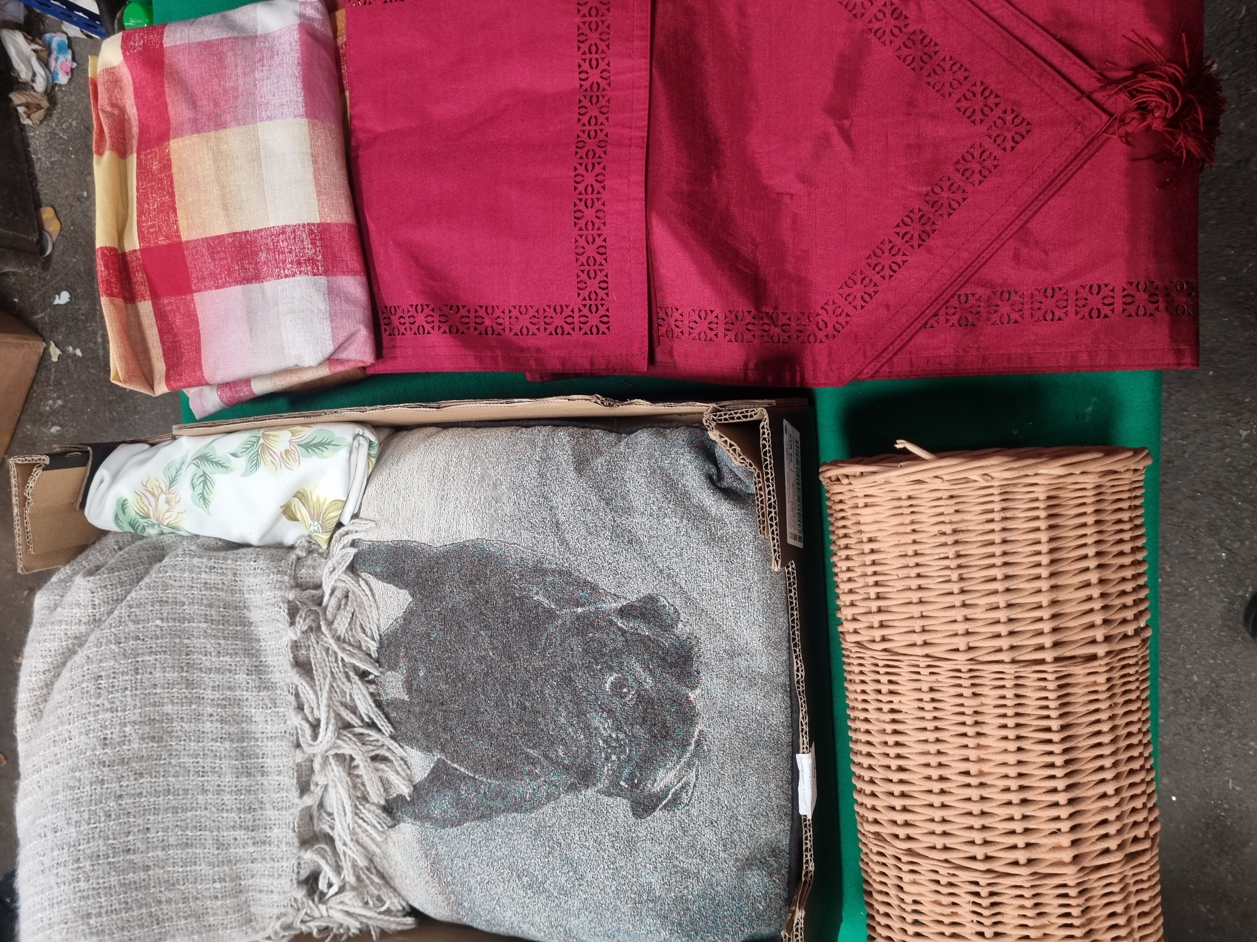 A collection of various household textiles and a storage container. The lot includes a neutral cream-toned throw by Marks & Spencer, featuring a loose weave and long fringed edges. This throw retains its original manufacturer label. Also included is a square cushion with a woven tapestry-style image of a black dog, possibly a pug or bulldog, against a mottled grey background. The collection further comprises a set of crimson red linens featuring geometric cut-work borders and corner tassels, a large section of woven fabric with a block check pattern in red, yellow, and cream, and a smaller piece of fabric with a floral print on a white ground. Completing the lot is a rectangular open storage basket constructed from woven wicker in a natural finish.
