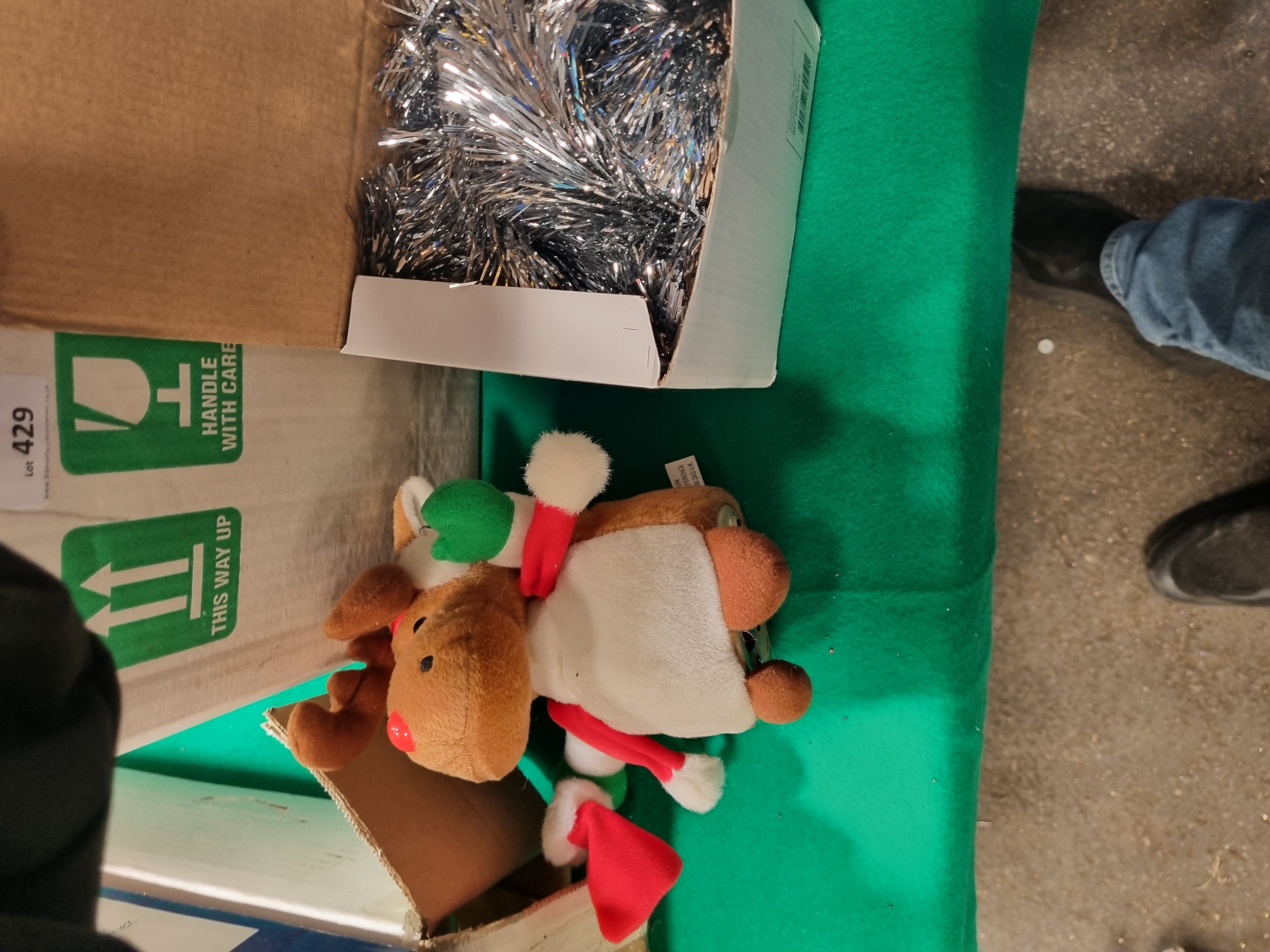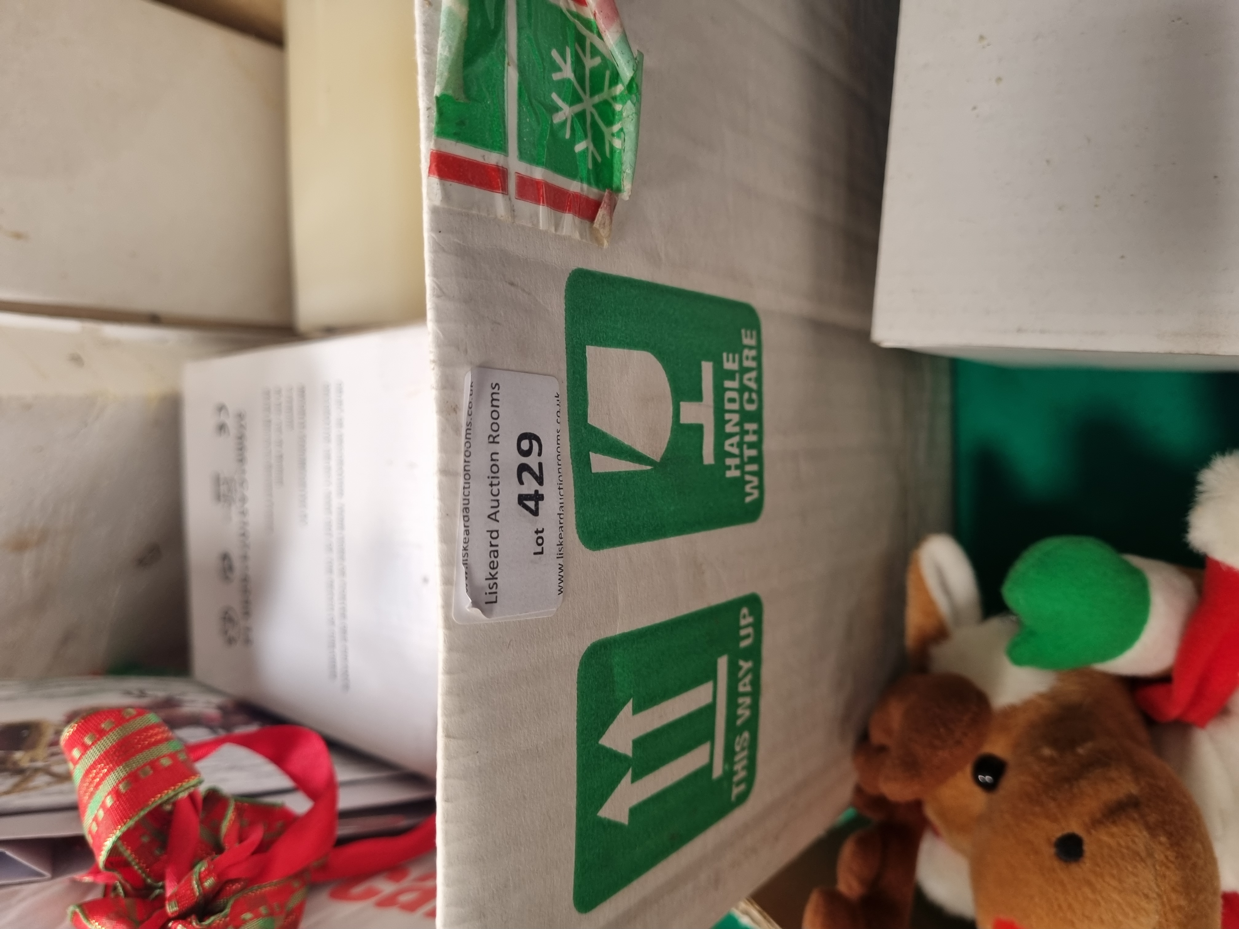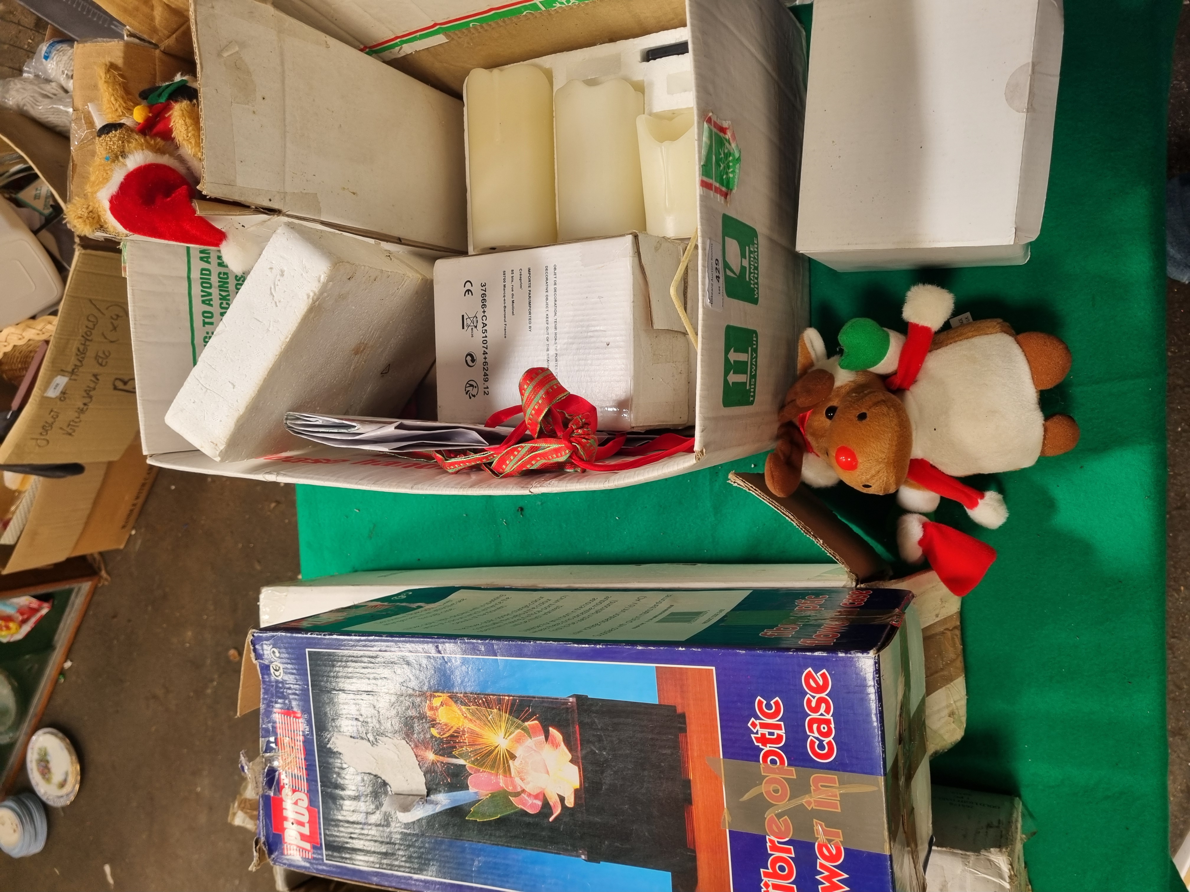A collection of festive decorations and novelty lighting, primarily contained within original retail packaging. The assortment includes a boxed fibre optic flower lamp featuring a floral arrangement within a clear display case, and a small artificial Christmas tree housed in a cardboard shipping carton. Also present is a set of three flameless pillar candles made of synthetic wax, secured in a polystyrene insert. The lot further comprises two plush reindeer toys with festive attire and a quantity of silver-coloured tinsel. Several items bear manufacturer markings including Made in China and the CE safety mark. One external cardboard box features a printed label from Liskeard Auction Rooms identifying the group as Lot 429, alongside standard directional and handling symbols. The items are constructed from various materials including plastic, synthetic fibres, cardboard, and polystyrene.