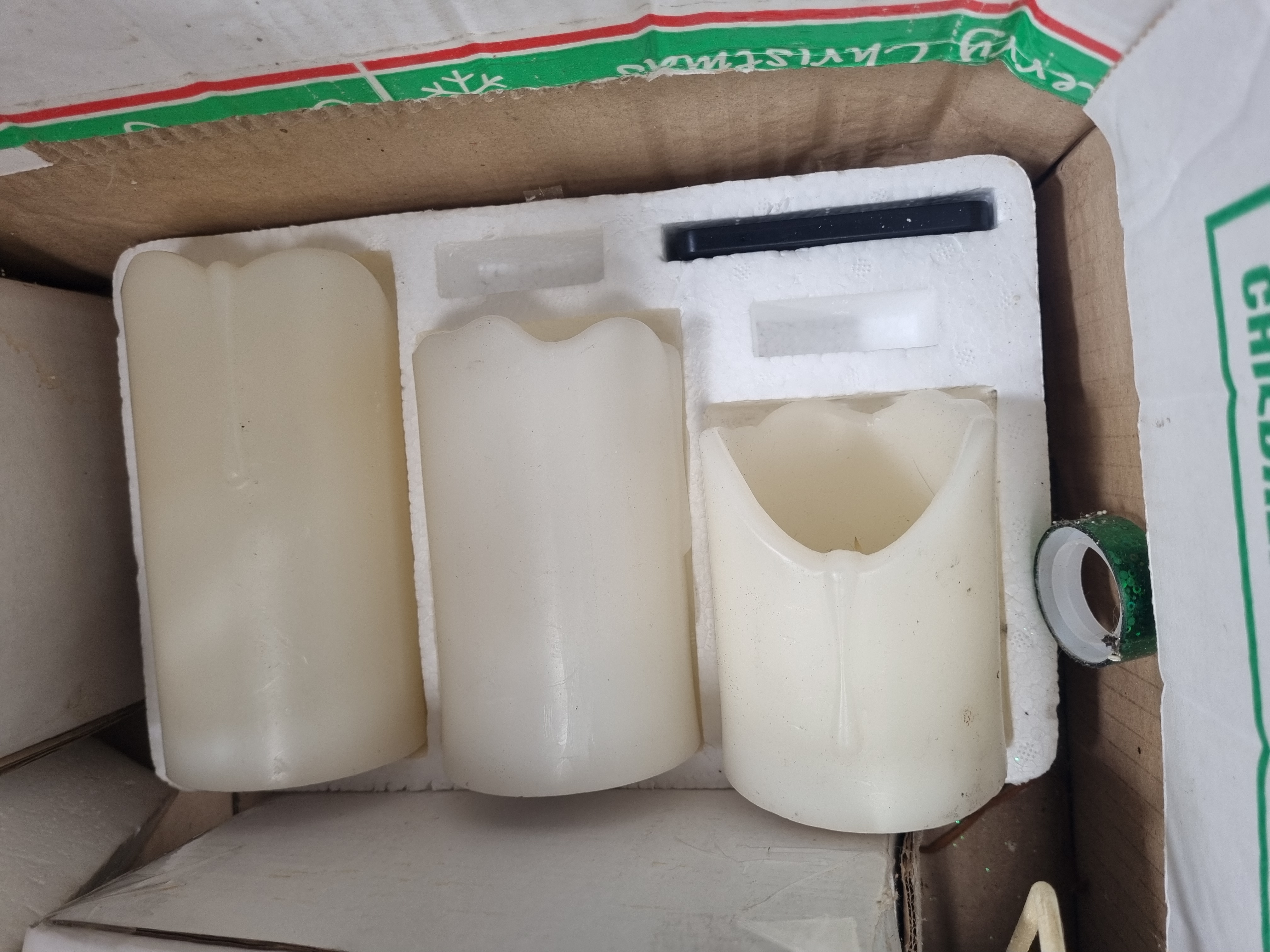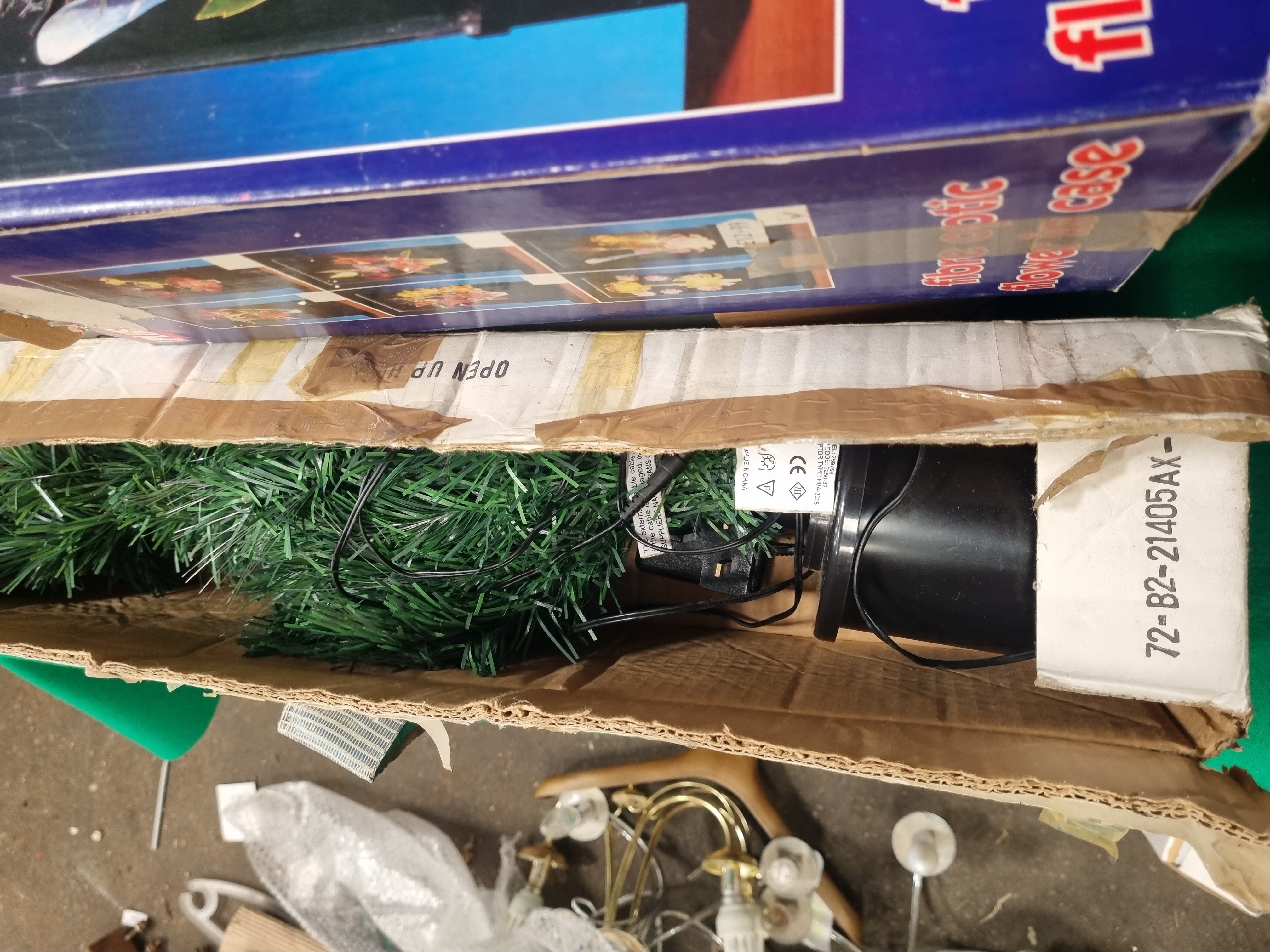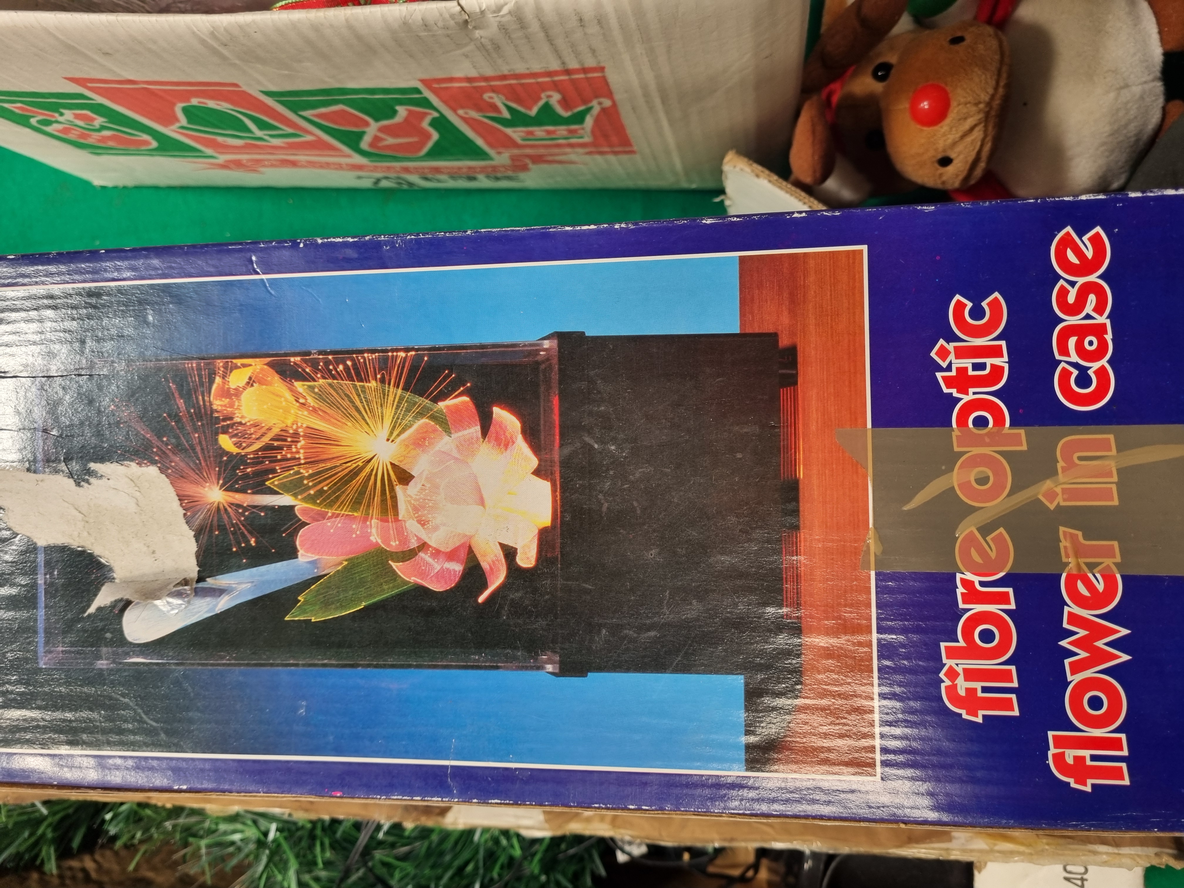 A collection of festive decorations and novelty lighting, primarily contained within original retail packaging. The assortment includes a boxed fibre optic flower lamp featuring a floral arrangement within a clear display case, and a small artificial Christmas tree housed in a cardboard shipping carton. Also present is a set of three flameless pillar candles made of synthetic wax, secured in a polystyrene insert. The lot further comprises two plush reindeer toys with festive attire and a quantity of silver-coloured tinsel. Several items bear manufacturer markings including Made in China and the CE safety mark. One external cardboard box features a printed label from Liskeard Auction Rooms identifying the group as Lot 429, alongside standard directional and handling symbols. The items are constructed from various materials including plastic, synthetic fibres, cardboard, and polystyrene.
