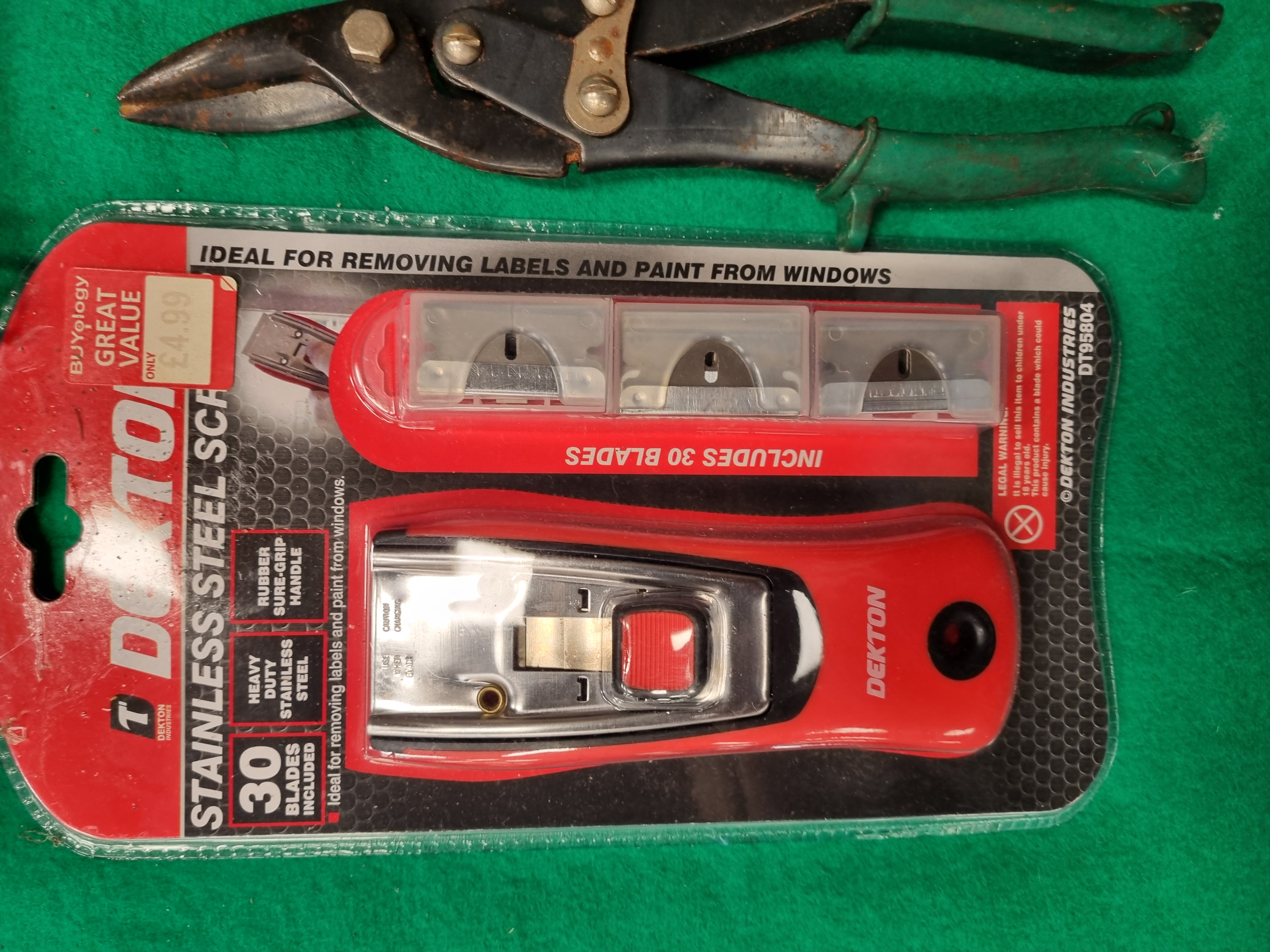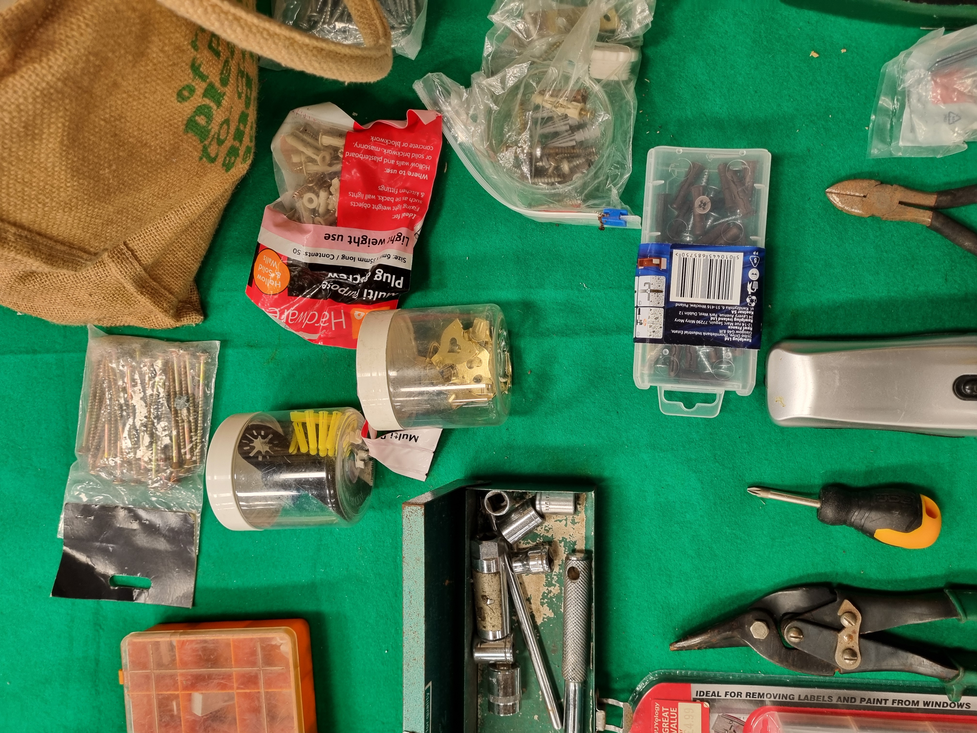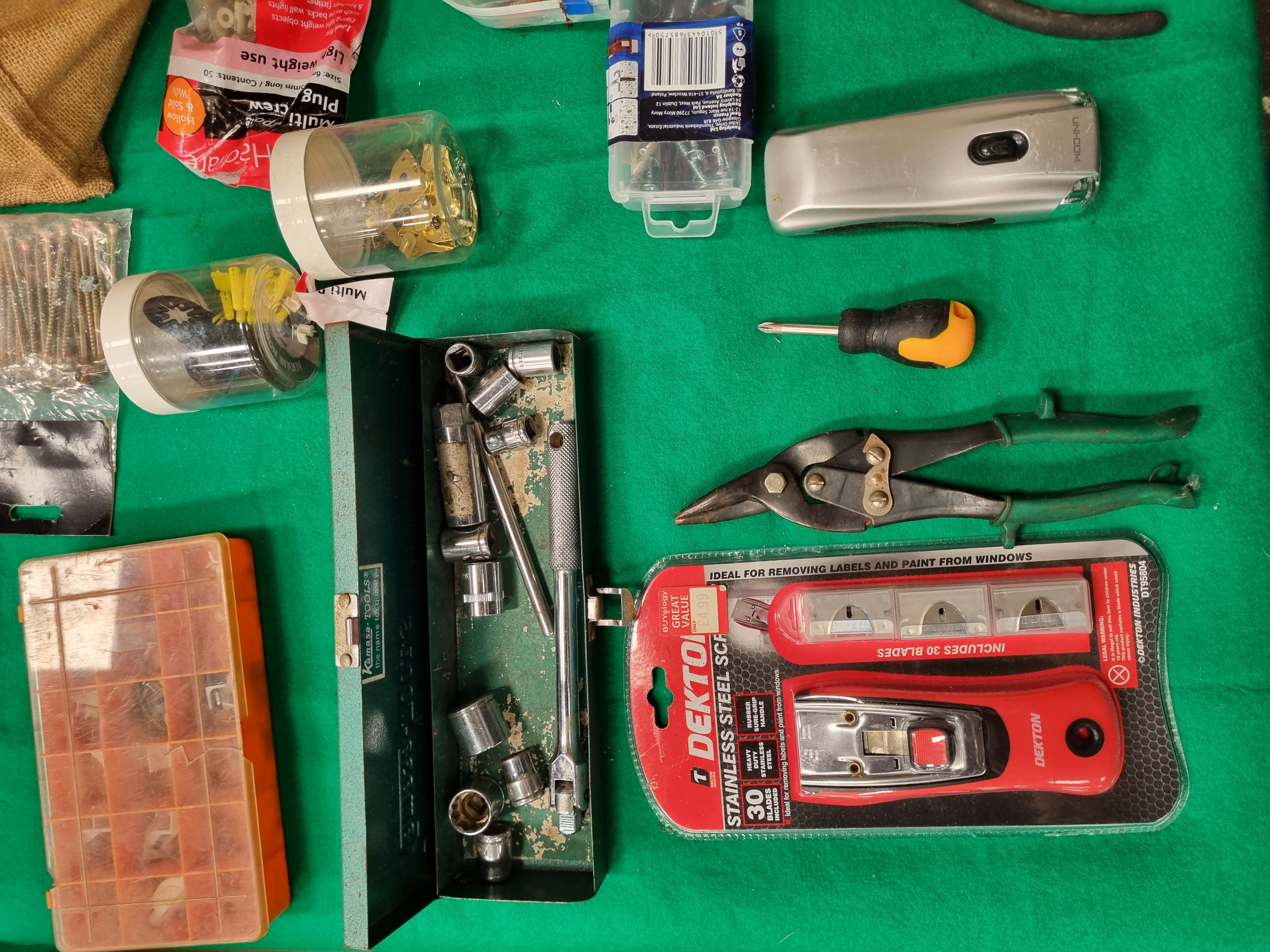 An assortment of contemporary hand tools, hardware, and household accessories featuring items from Kamasa-Tools, Dekton, and Uni-Com. The collection includes a Kamasa-Tools socket set housed in a green metal case, containing a drive handle and various sockets. Also included is a Dekton stainless steel scraper, model DT95804, with thirty replacement blades, new in its original retail packaging. Hand tools consist of a pair of tin snips with green-coated handles, diagonal cutting pliers with black grips, and a stubby Phillips-head screwdriver with a yellow and black bi-material handle. Portable lighting is provided by a silver-coloured Uni-Com handheld torch. The hardware selection includes a quantity of multipurpose twin thread wood screws, Rawlplug wall plugs, and a pack of four B&Q 65mm zinc-plated corner braces. Adhesives are represented by a 125ml bottle of Evo-Stik interior wood adhesive. The lot is rounded out with white plastic furniture knobs, brass-coloured picture hanging hardware in a clear jar, an orange plastic multi-compartment organiser, and a burlap bag containing a triangular sanding pad for a detail sander.