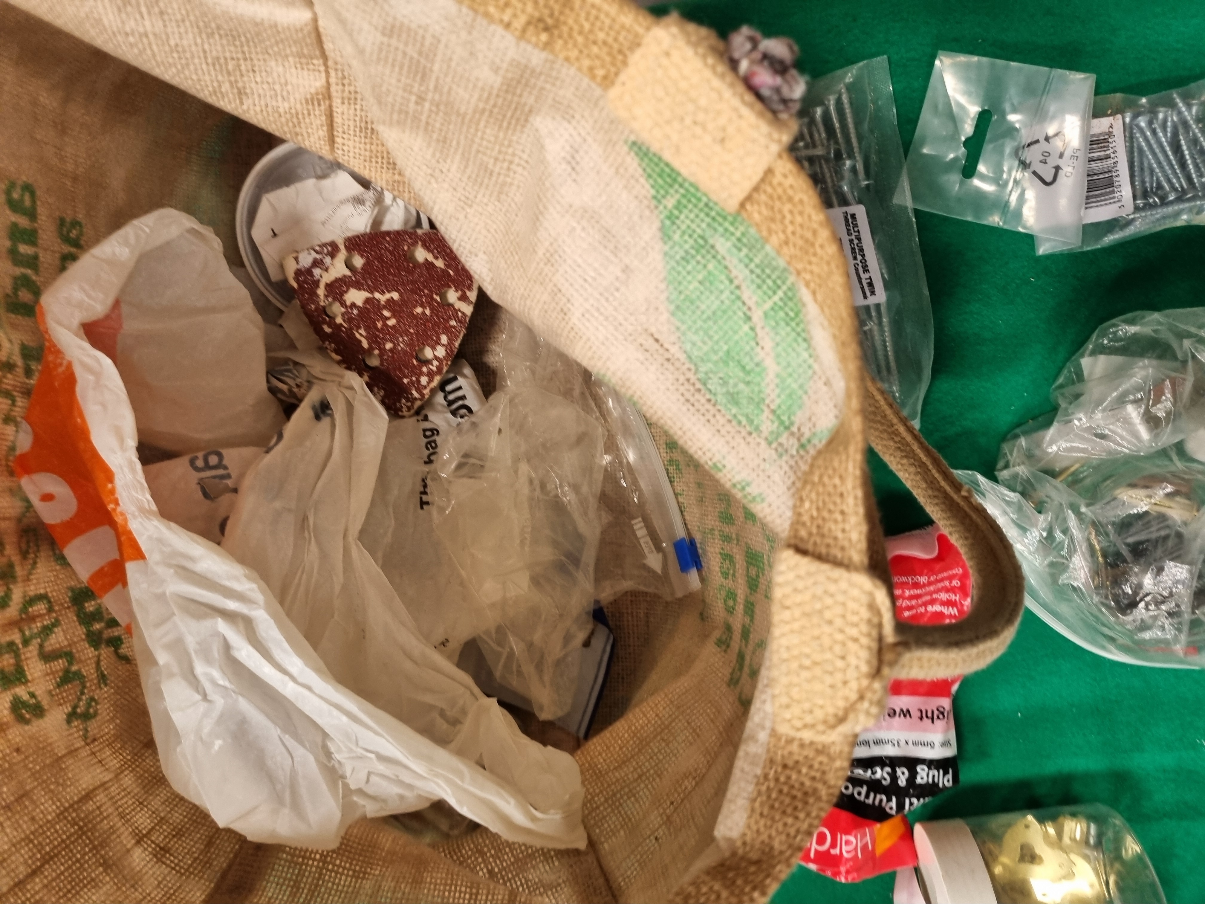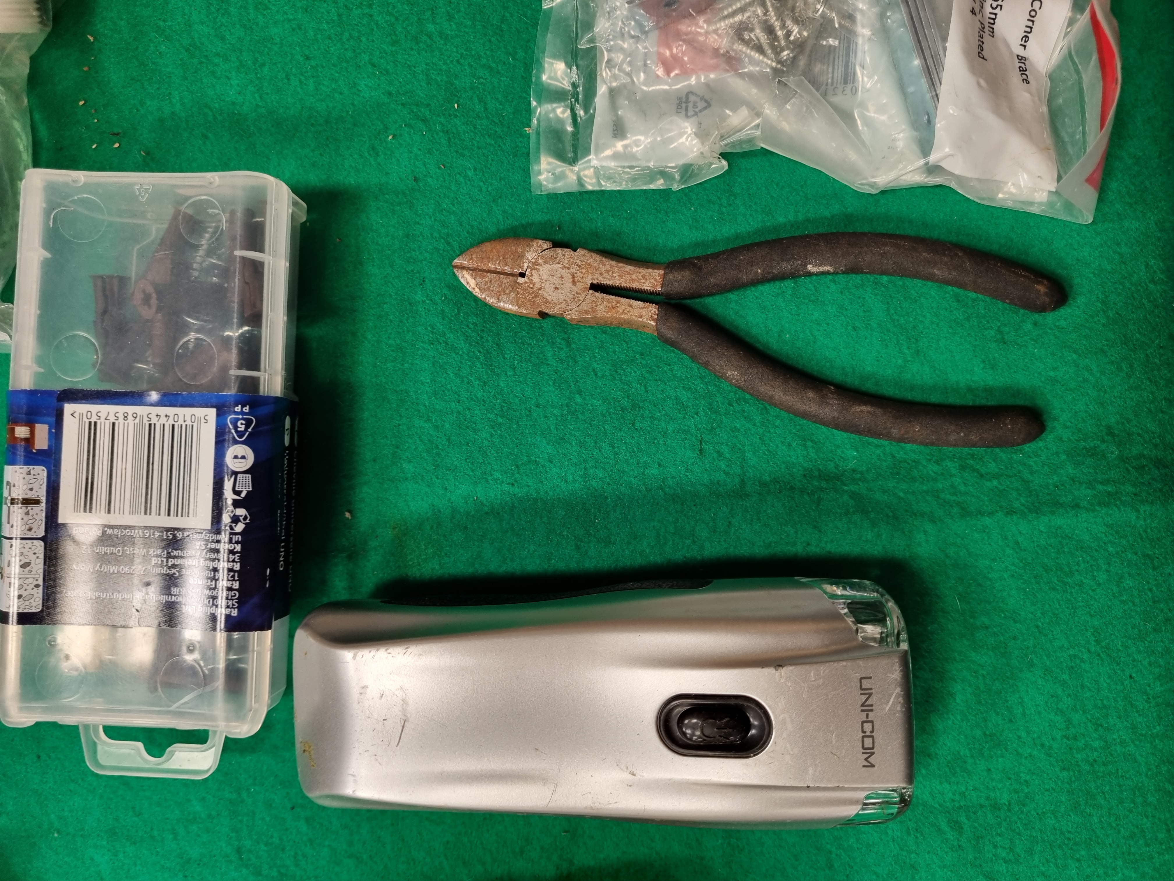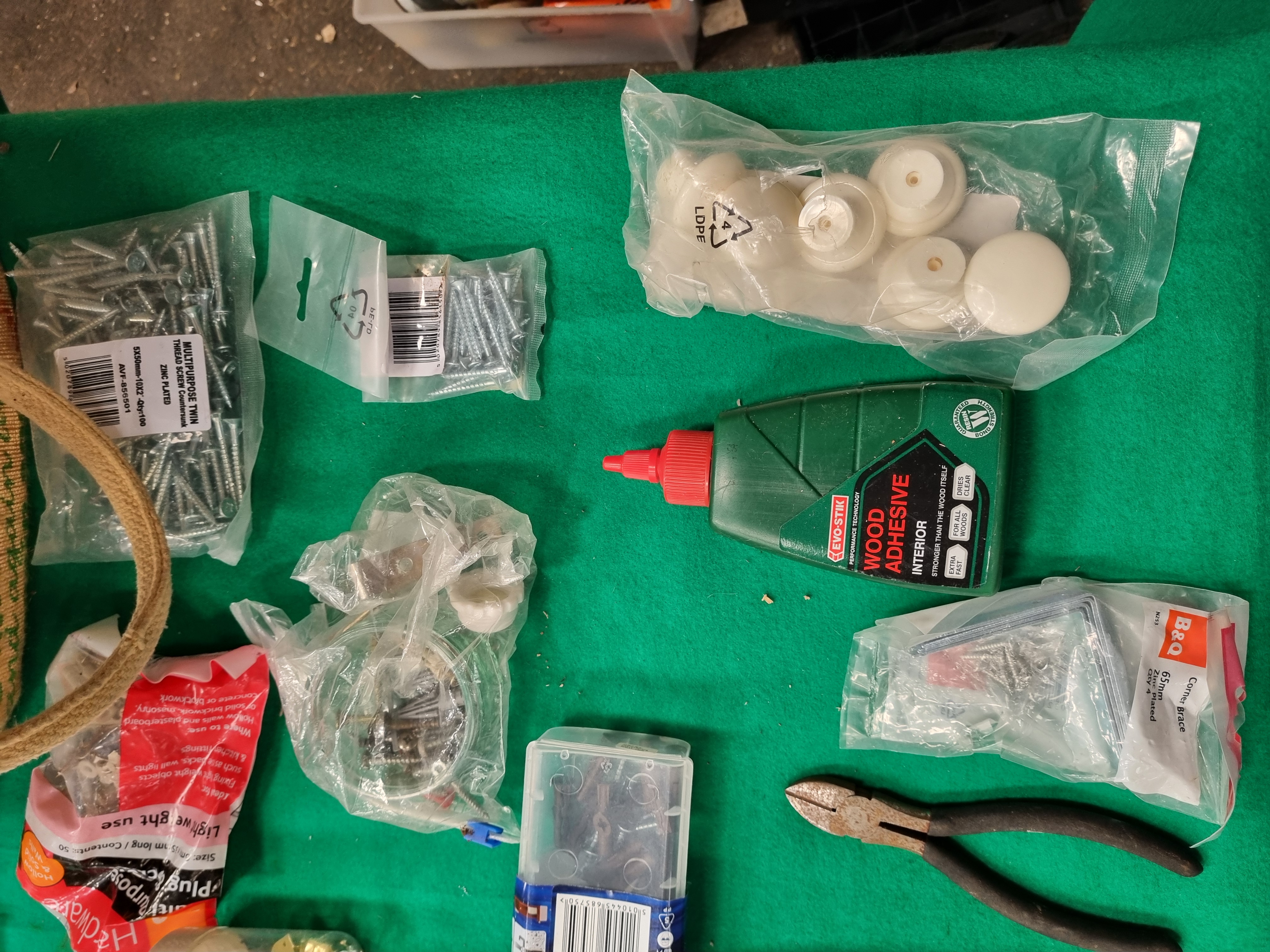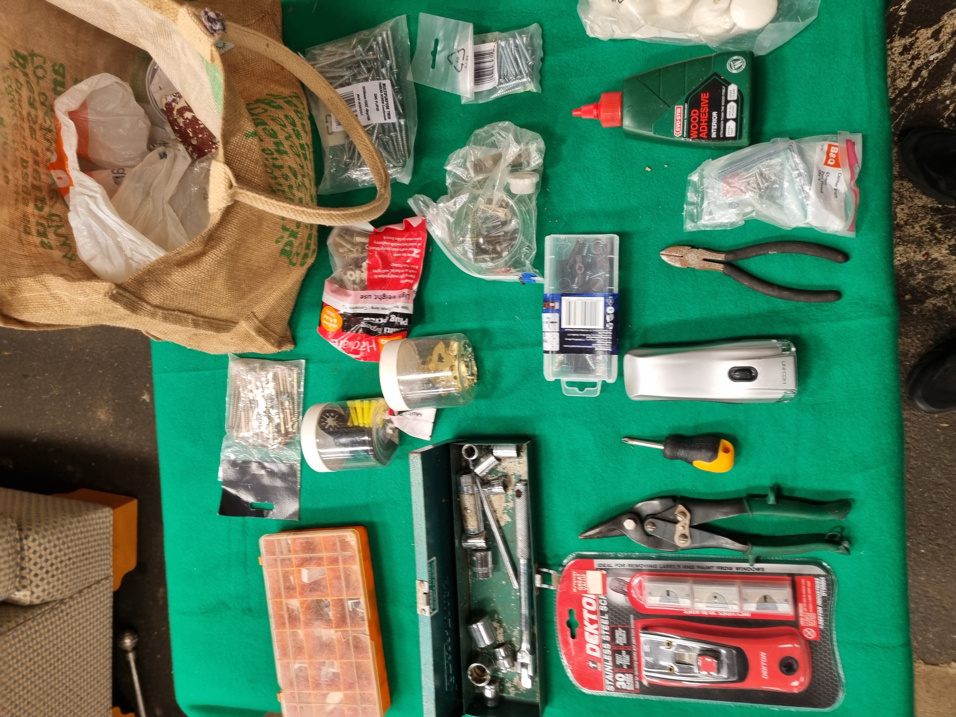 An assortment of contemporary hand tools, hardware, and household accessories featuring items from Kamasa-Tools, Dekton, and Uni-Com. The collection includes a Kamasa-Tools socket set housed in a green metal case, containing a drive handle and various sockets. Also included is a Dekton stainless steel scraper, model DT95804, with thirty replacement blades, new in its original retail packaging. Hand tools consist of a pair of tin snips with green-coated handles, diagonal cutting pliers with black grips, and a stubby Phillips-head screwdriver with a yellow and black bi-material handle. Portable lighting is provided by a silver-coloured Uni-Com handheld torch. The hardware selection includes a quantity of multipurpose twin thread wood screws, Rawlplug wall plugs, and a pack of four B&Q 65mm zinc-plated corner braces. Adhesives are represented by a 125ml bottle of Evo-Stik interior wood adhesive. The lot is rounded out with white plastic furniture knobs, brass-coloured picture hanging hardware in a clear jar, an orange plastic multi-compartment organiser, and a burlap bag containing a triangular sanding pad for a detail sander.