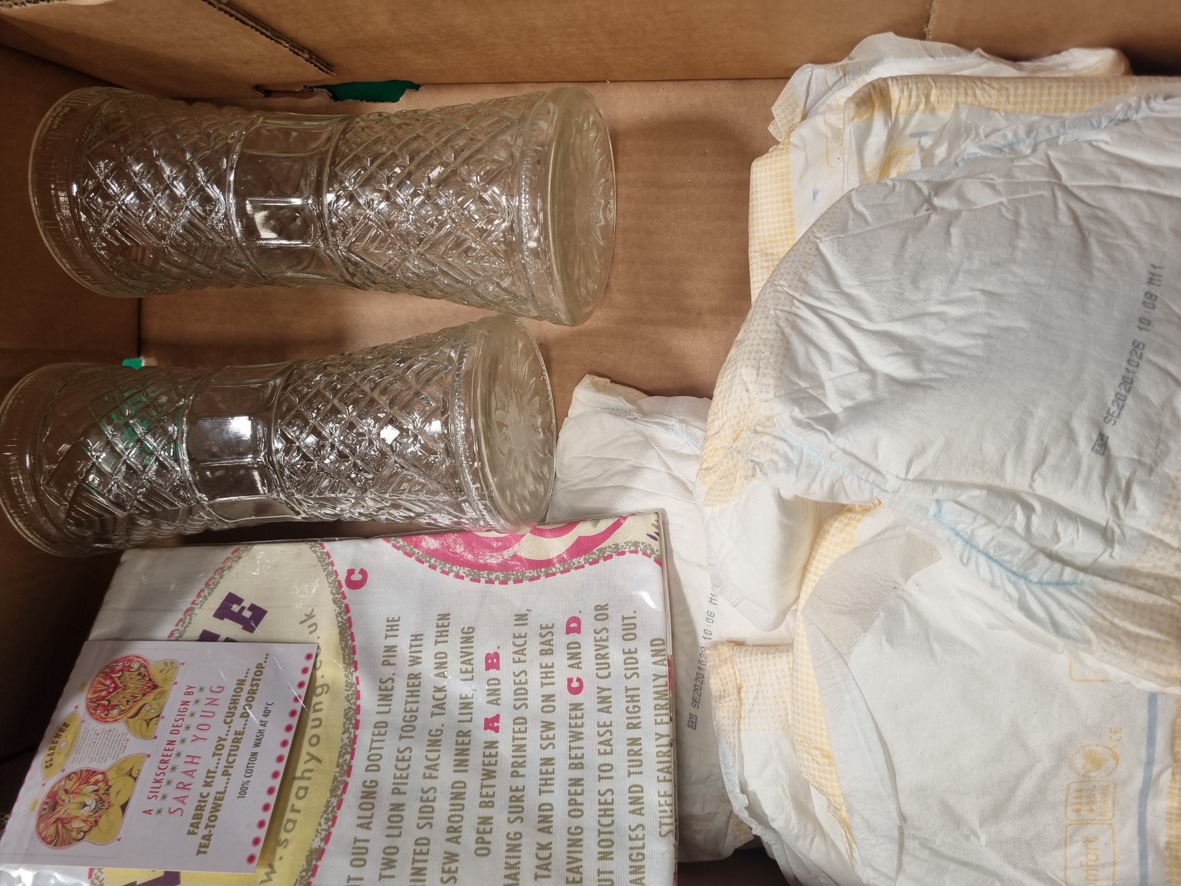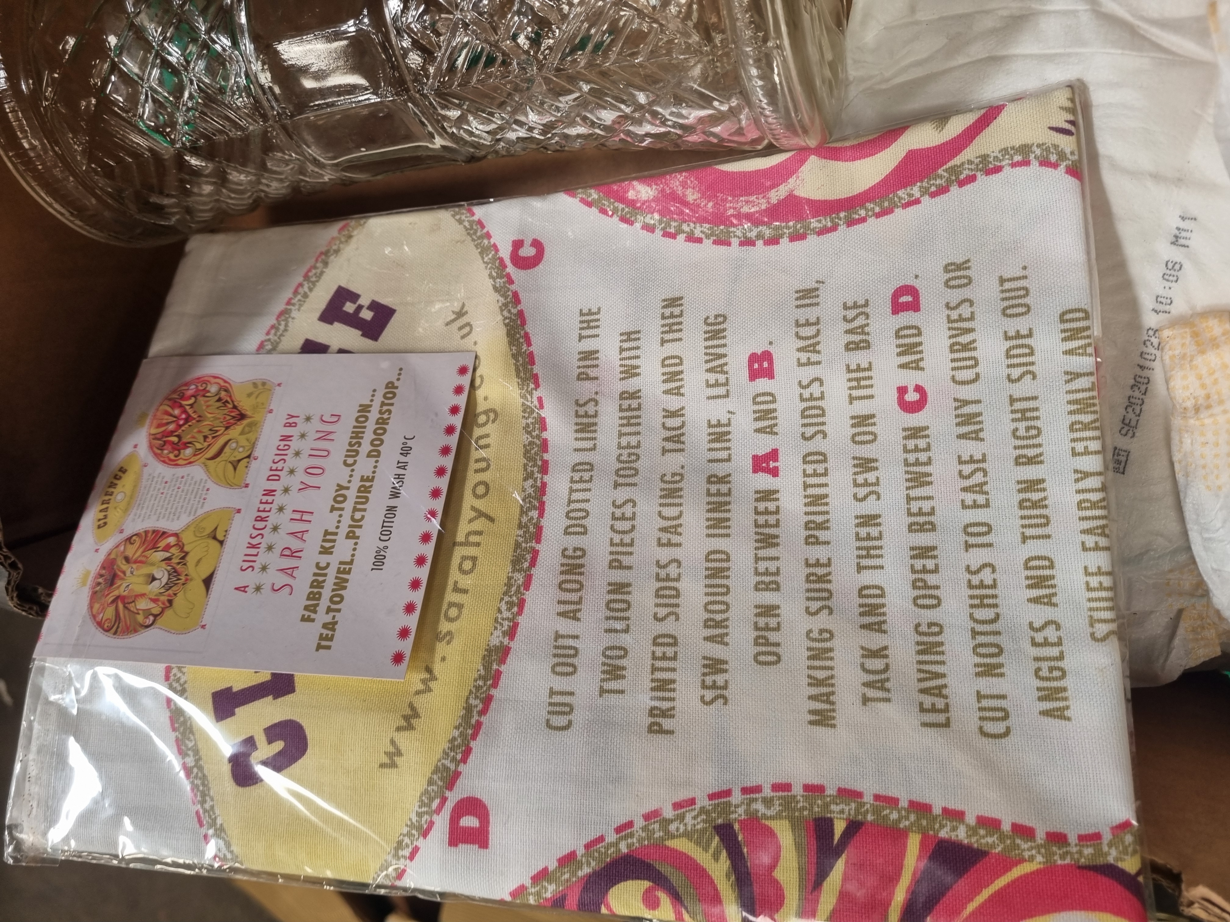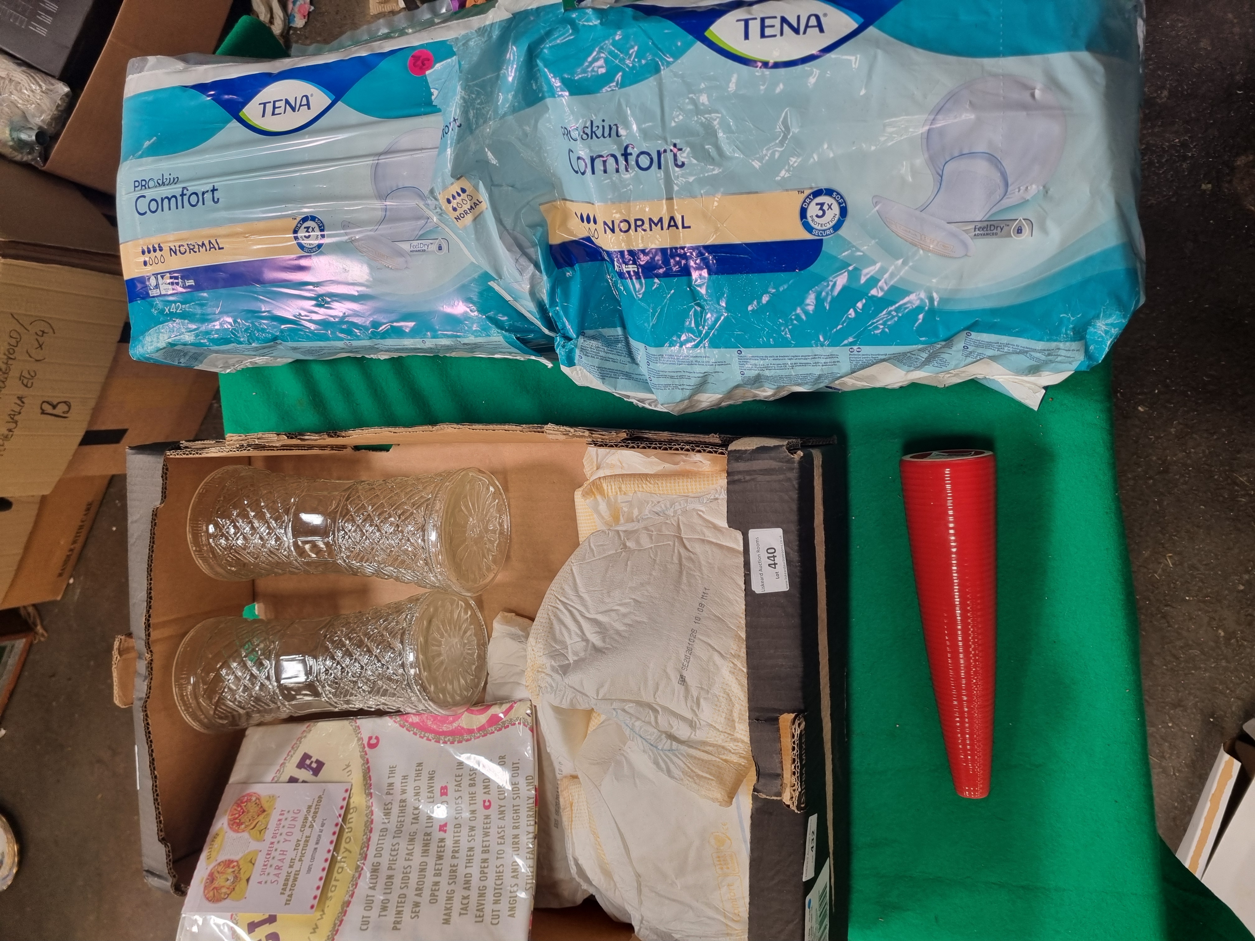 This lot comprises a mixed collection of personal care, craft, and household items. The personal care component includes TENA ProSkin Comfort Normal pads, featuring one 42-count pack and additional loose pads. The craft portion consists of a sealed silkscreen fabric kit by Sarah Young, designed to be made into a lion-themed toy, cushion, tea towel, or doorstop, and is noted as being 100 percent cotton. Also included are two clear pressed glass vessels with a diamond-cut pattern and a single red conical decorative object. The collection is housed in a repurposed cardboard box bearing labels for Liskeard Auction Rooms and Dole UK.
