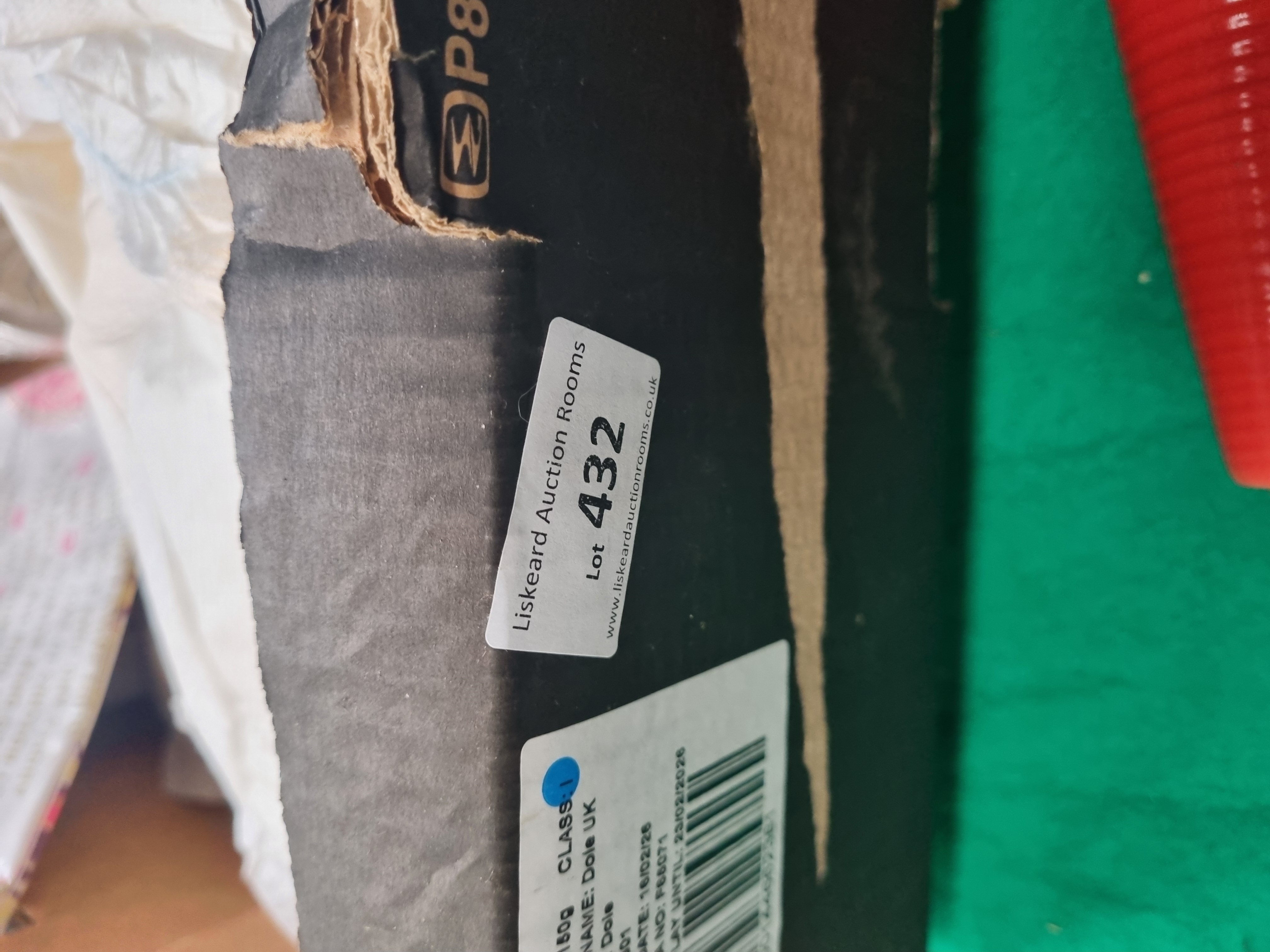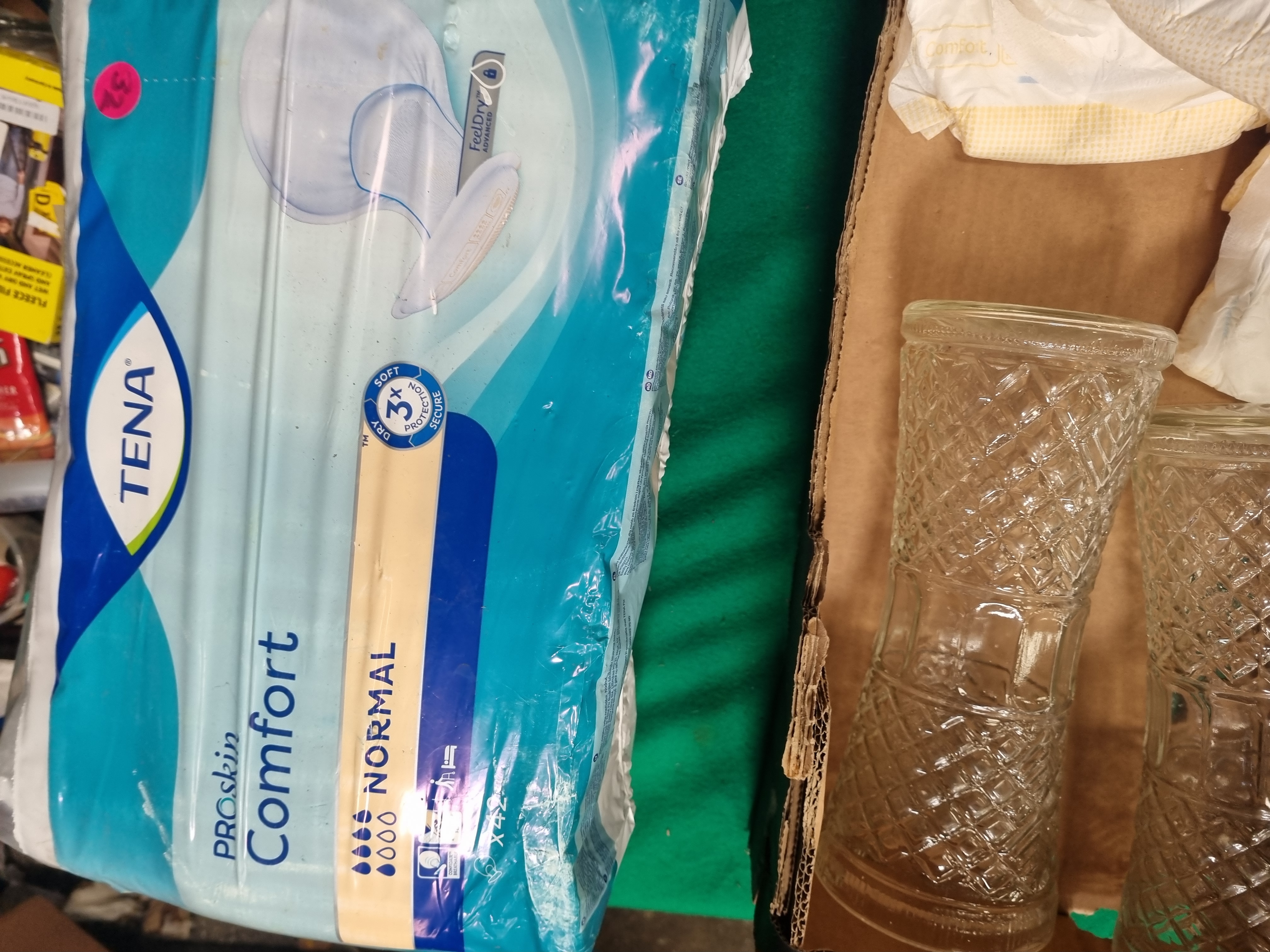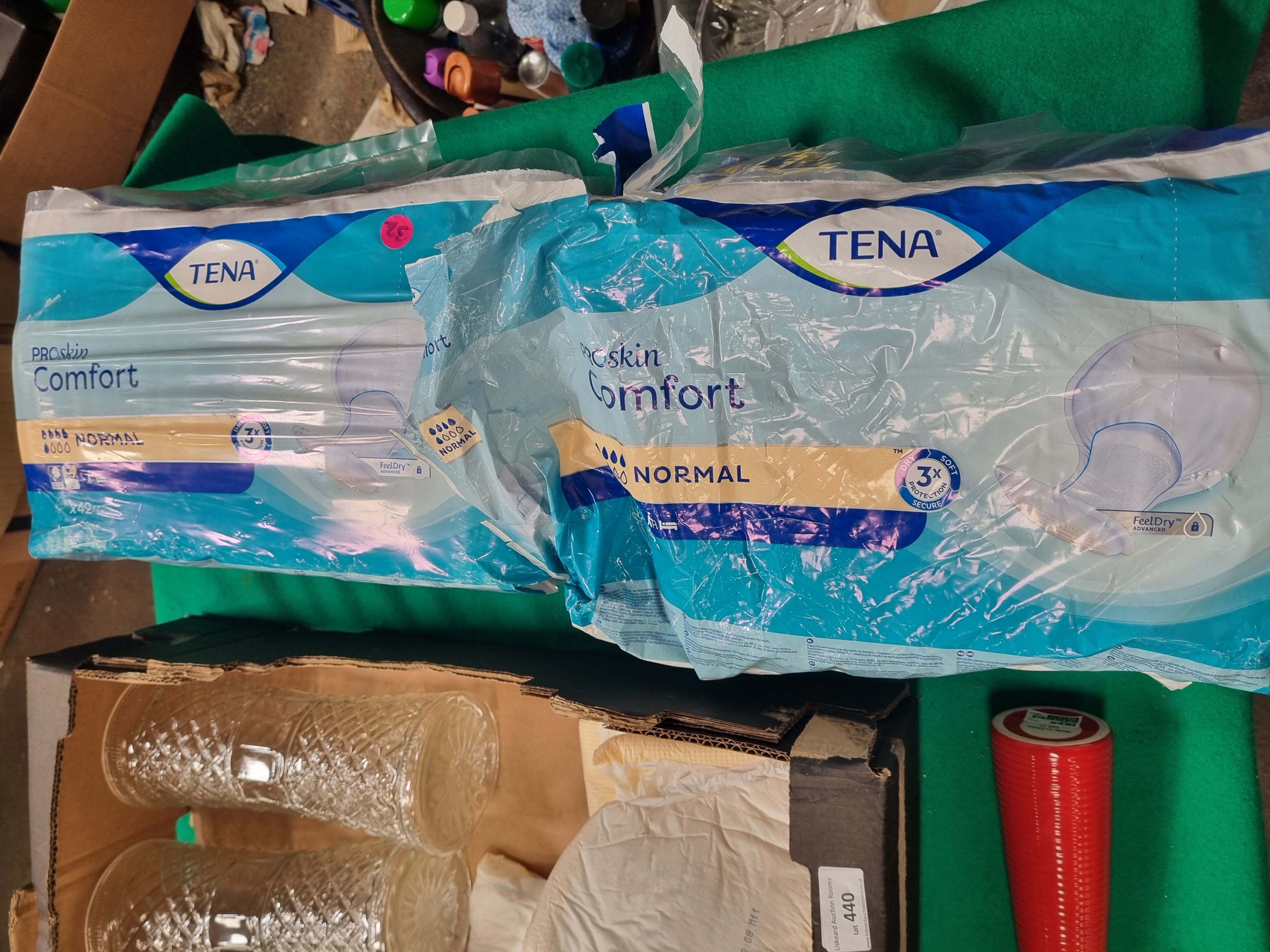 This lot comprises a mixed collection of personal care, craft, and household items. The personal care component includes TENA ProSkin Comfort Normal pads, featuring one 42-count pack and additional loose pads. The craft portion consists of a sealed silkscreen fabric kit by Sarah Young, designed to be made into a lion-themed toy, cushion, tea towel, or doorstop, and is noted as being 100 percent cotton. Also included are two clear pressed glass vessels with a diamond-cut pattern and a single red conical decorative object. The collection is housed in a repurposed cardboard box bearing labels for Liskeard Auction Rooms and Dole UK.