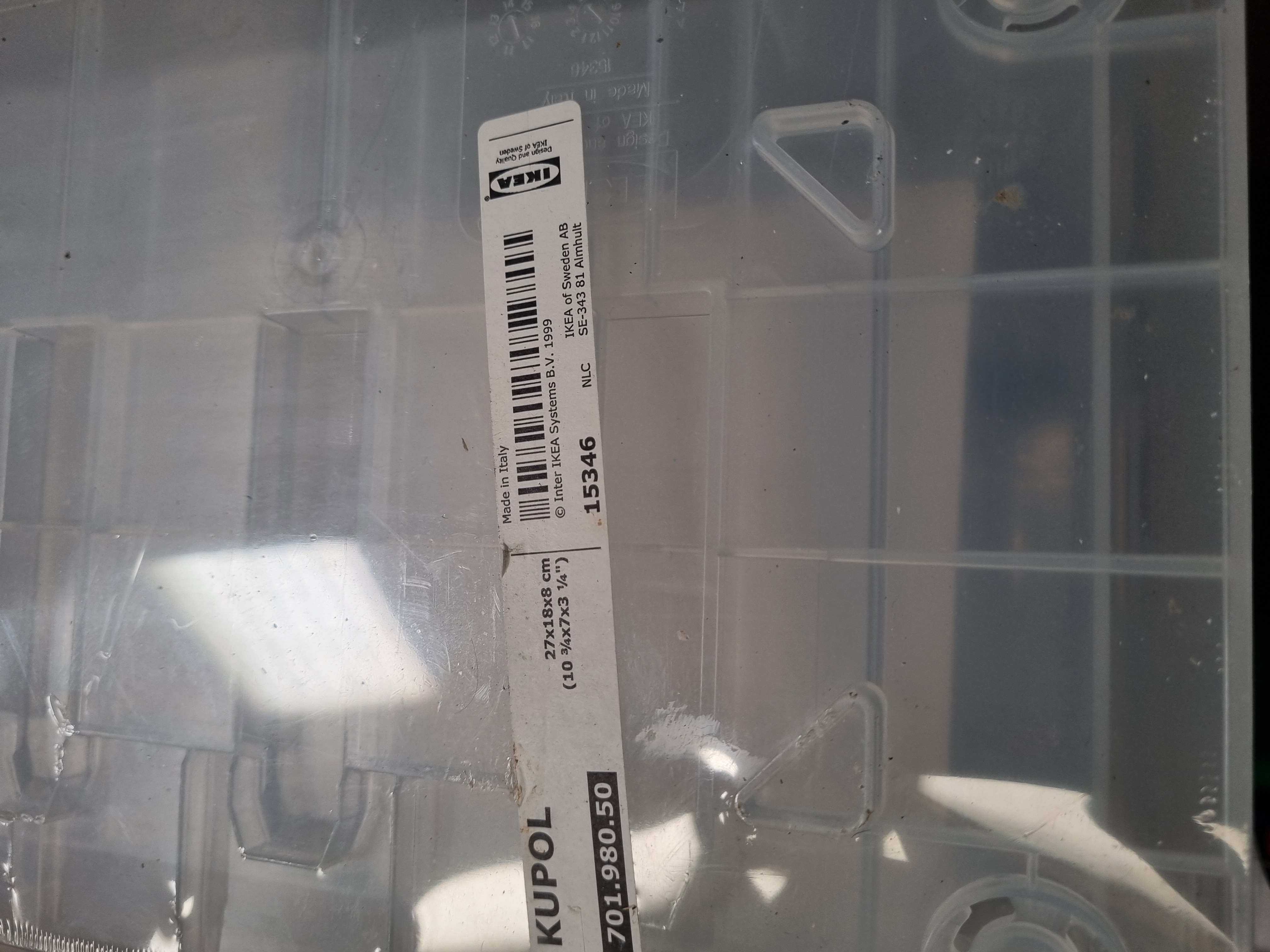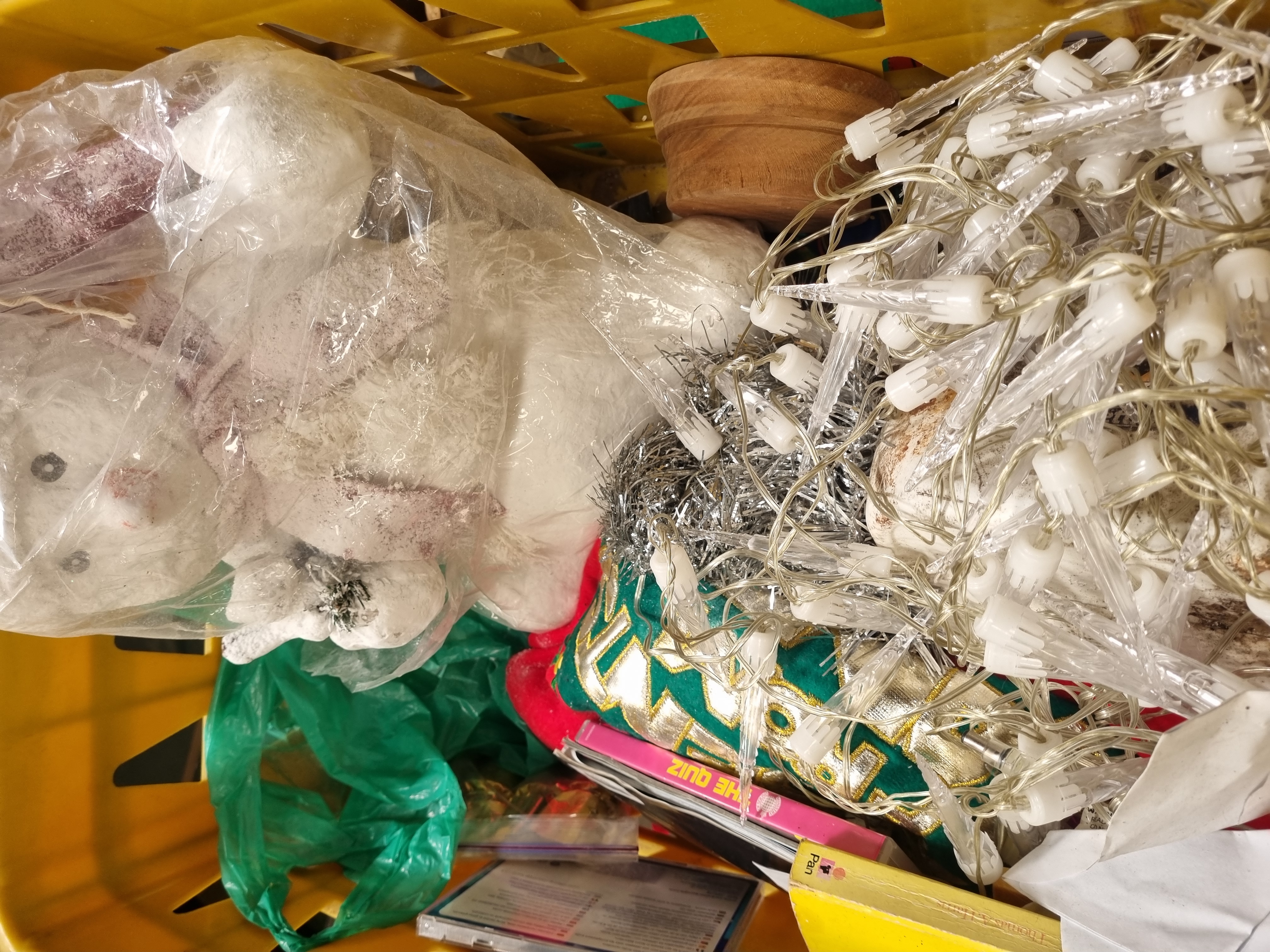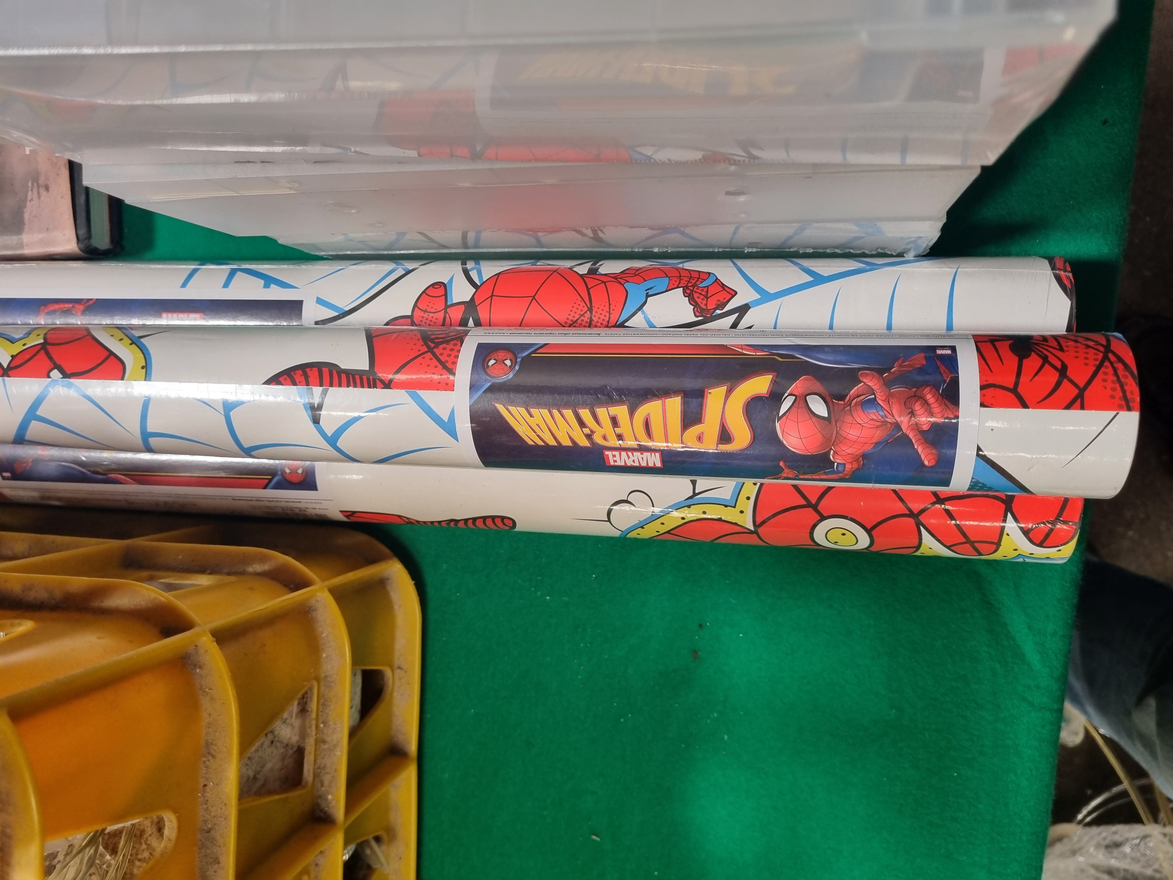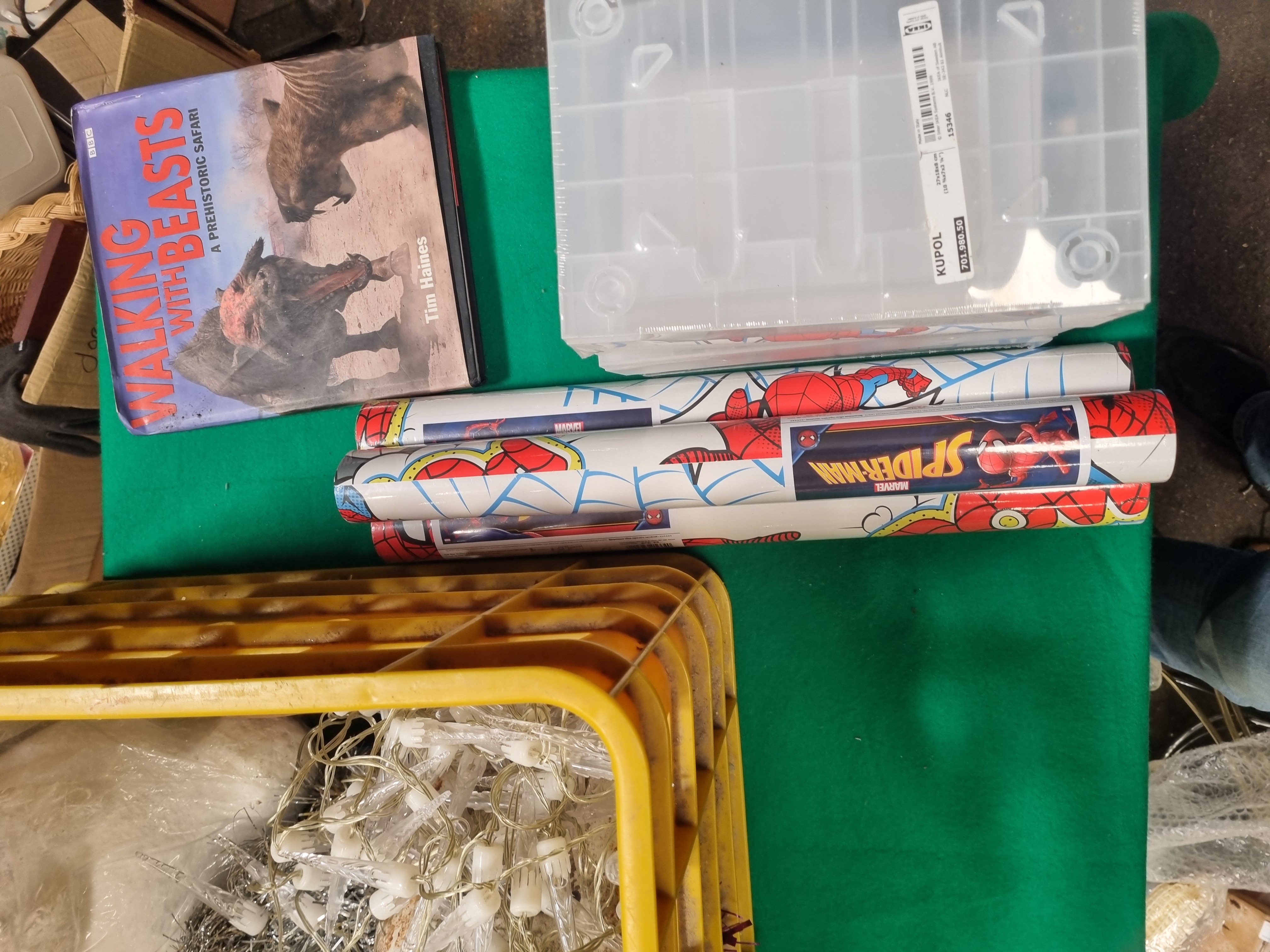 An assortment of items including a hardcover book titled Walking with Beasts: A Prehistoric Safari by Tim Haines, published by the BBC. The lot features clear plastic storage containers identified by labels as IKEA Kupol model 701.980.50, manufactured in Italy and marked with a 1999 copyright date. Also included are several rolls of Marvel licensed Spider-Man themed gift wrapping paper in original factory shrink-wrap. Contained within a yellow plastic crate are various holiday decorations, including a set of white icicle-style Christmas lights with clear plastic covers and white wiring, silver-toned tinsel, and a white plush snowman soft toy. Additional items comprise a green and gold-toned decorative fabric item, a CD in a jewel case, and a small book titled The Quiz.