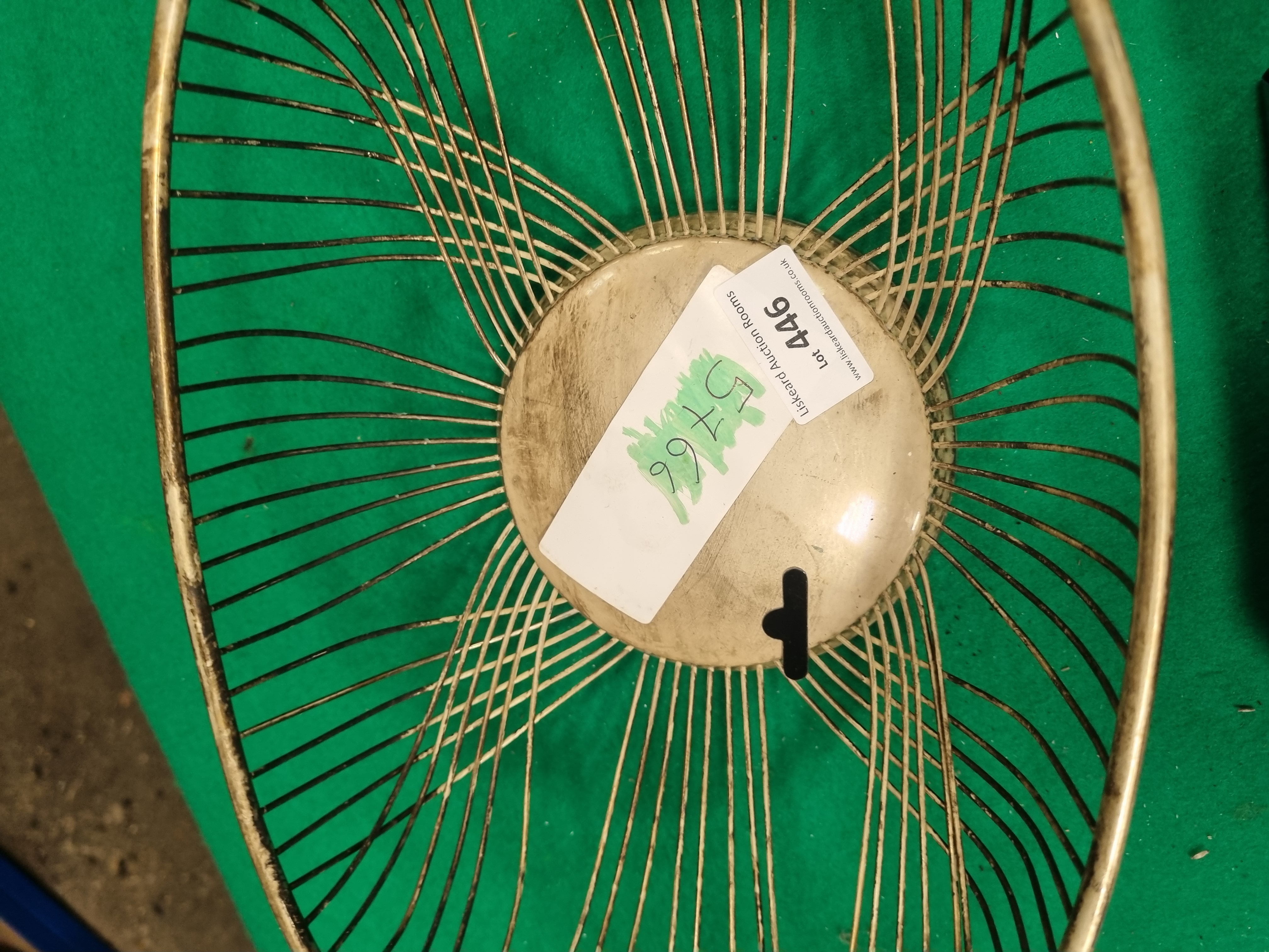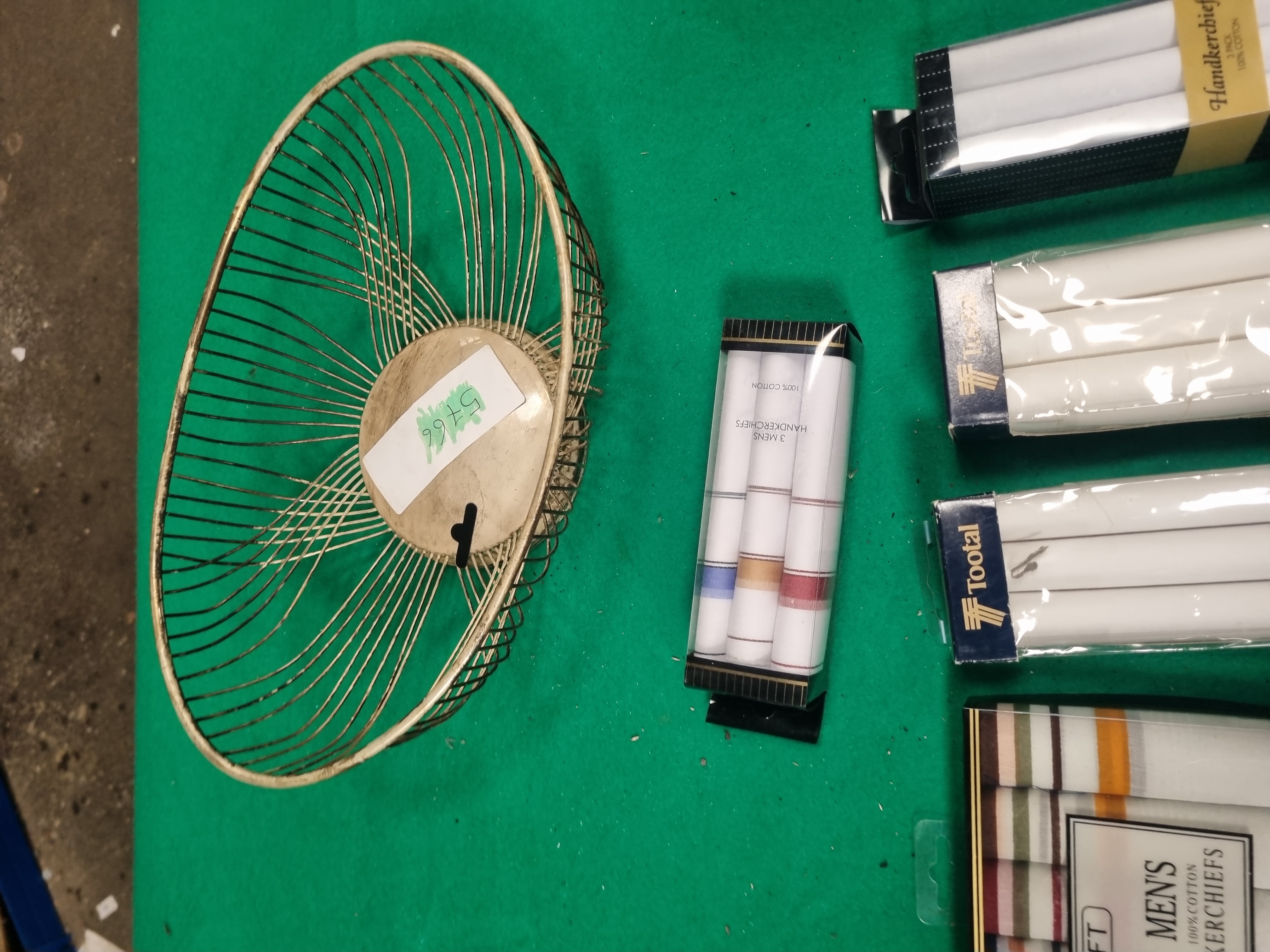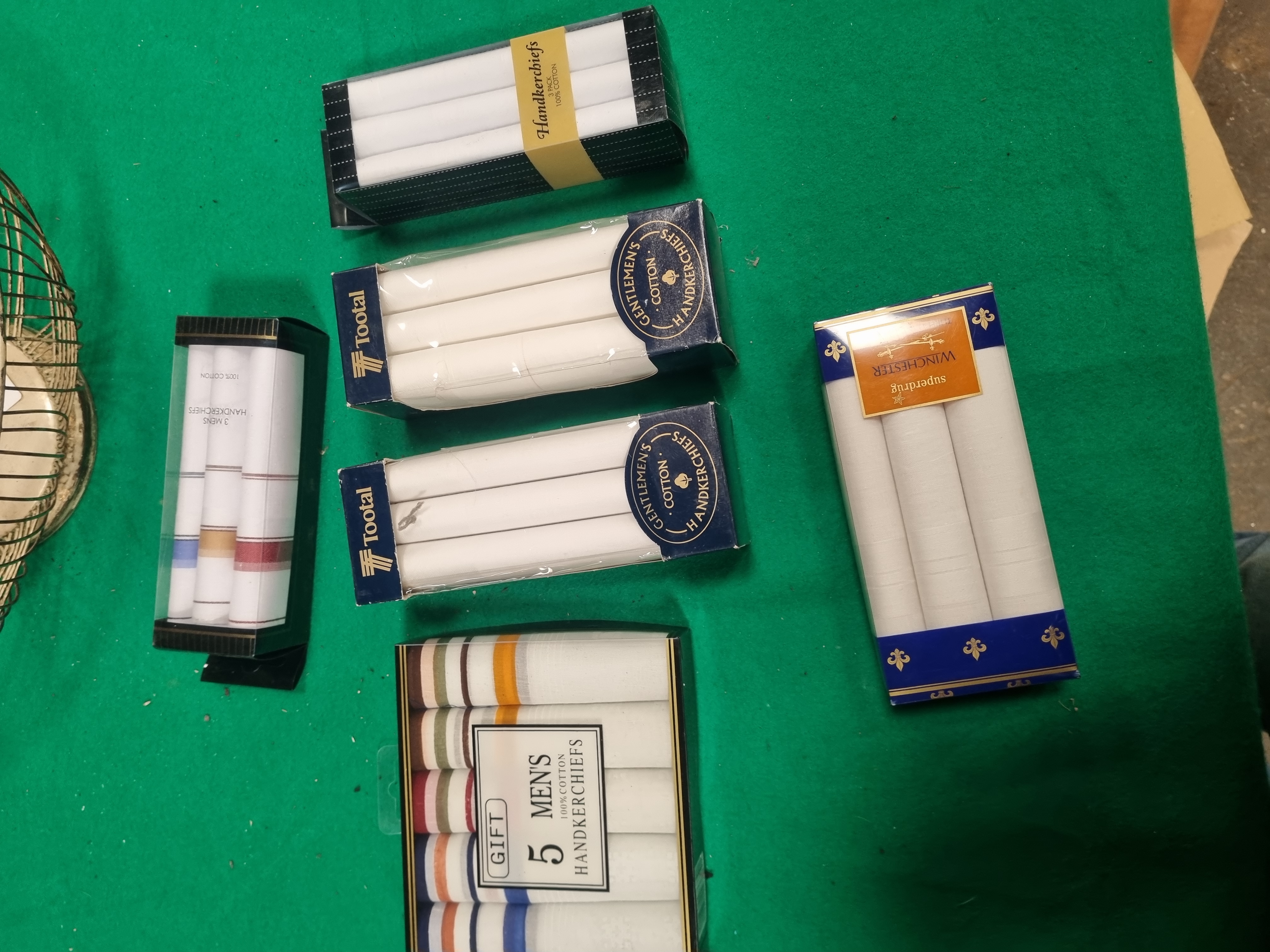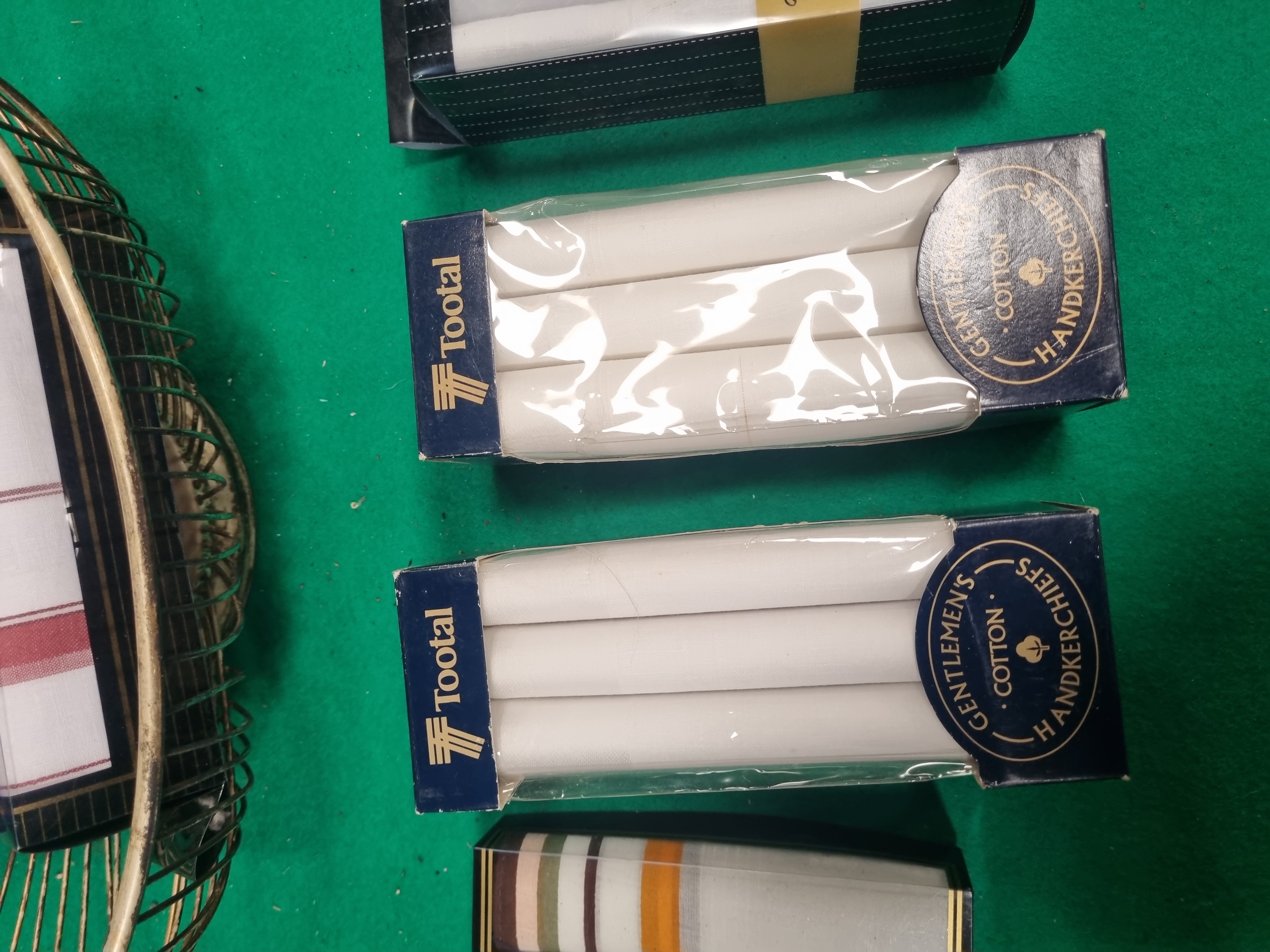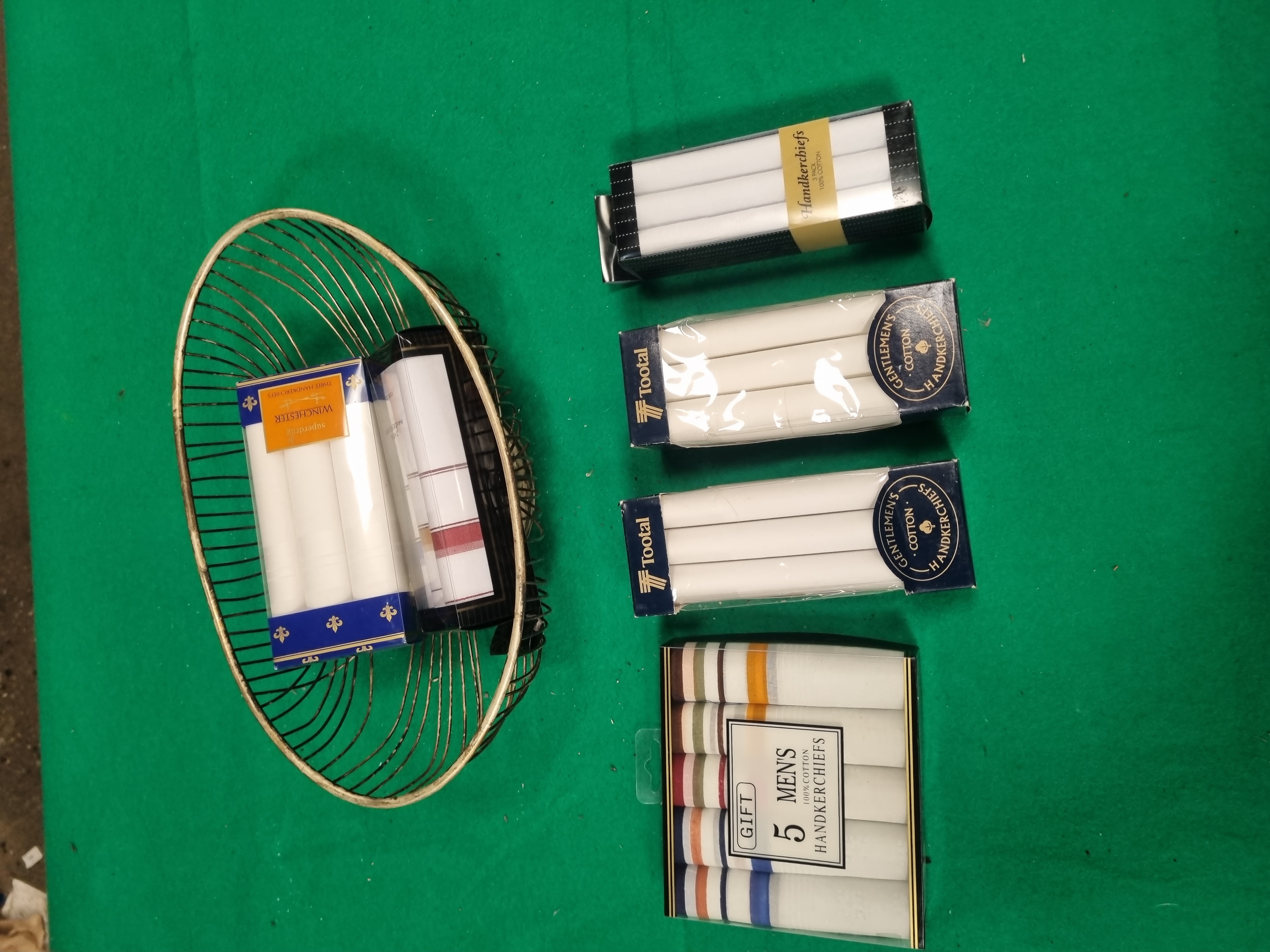 A collection of six packs of men’s cotton handkerchiefs and an oval wire display basket. The handkerchief assortment includes two packs of Tootal Gentlemen’s Cotton Handkerchiefs, one pack of Superdrug Winchester range white cotton handkerchiefs, and one gift pack containing five 100% cotton handkerchiefs with assorted striped patterns. Also included are two further packs of white cotton handkerchiefs, one set being plain and the other featuring coloured border stripes. All packs are labelled as 100% cotton and are presented in their original retail packaging. The basket is constructed from gold-toned metal wire in a radial spoke pattern fixed to a solid central base. The base retains a white sticker for Liskeard Auction Rooms identifying it as lot 446, with a green handwritten mark 5766.