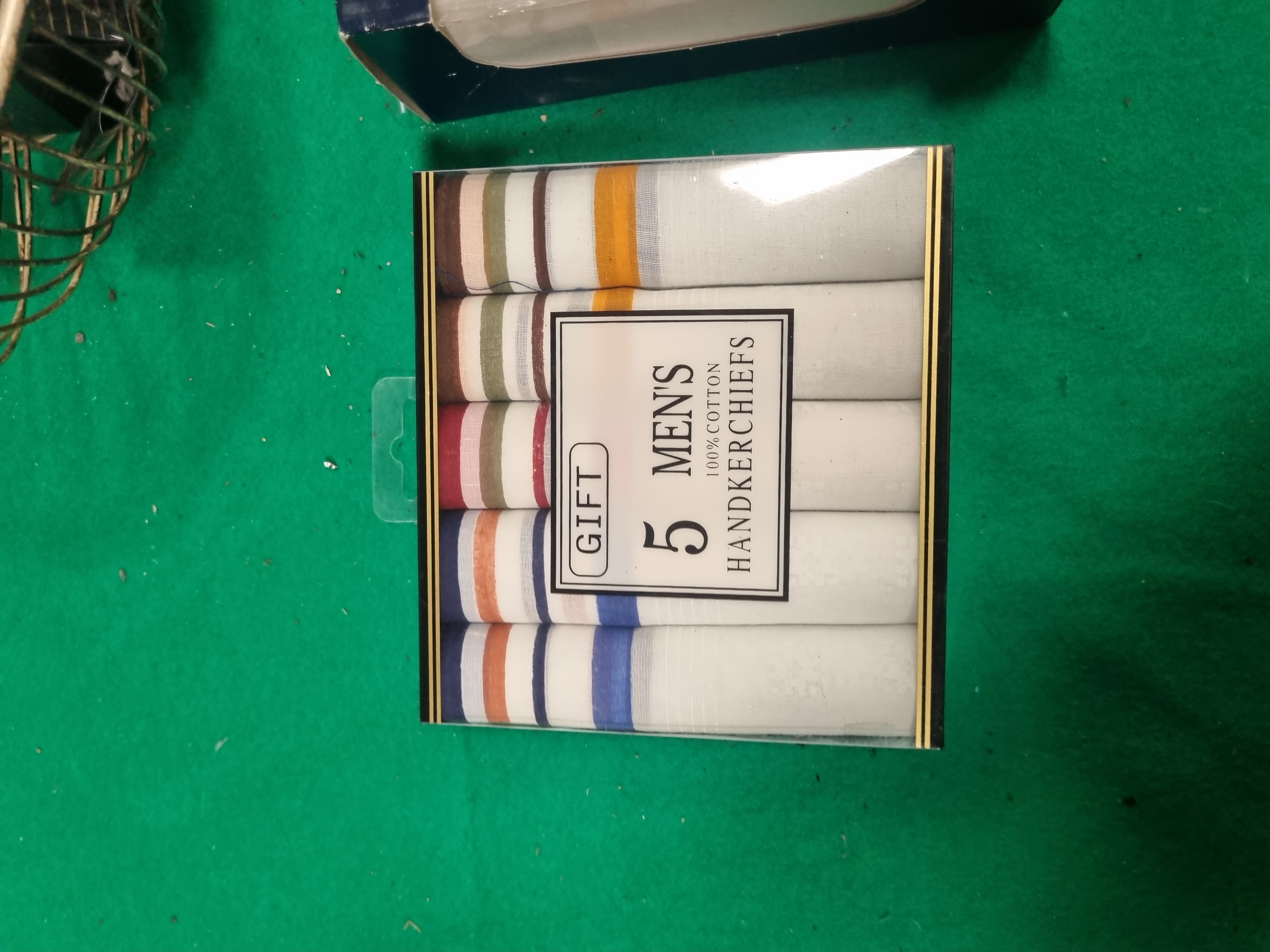 Lot 446: Six Packs of Men's Cotton Handkerchiefs and a Decorative Wire Basket