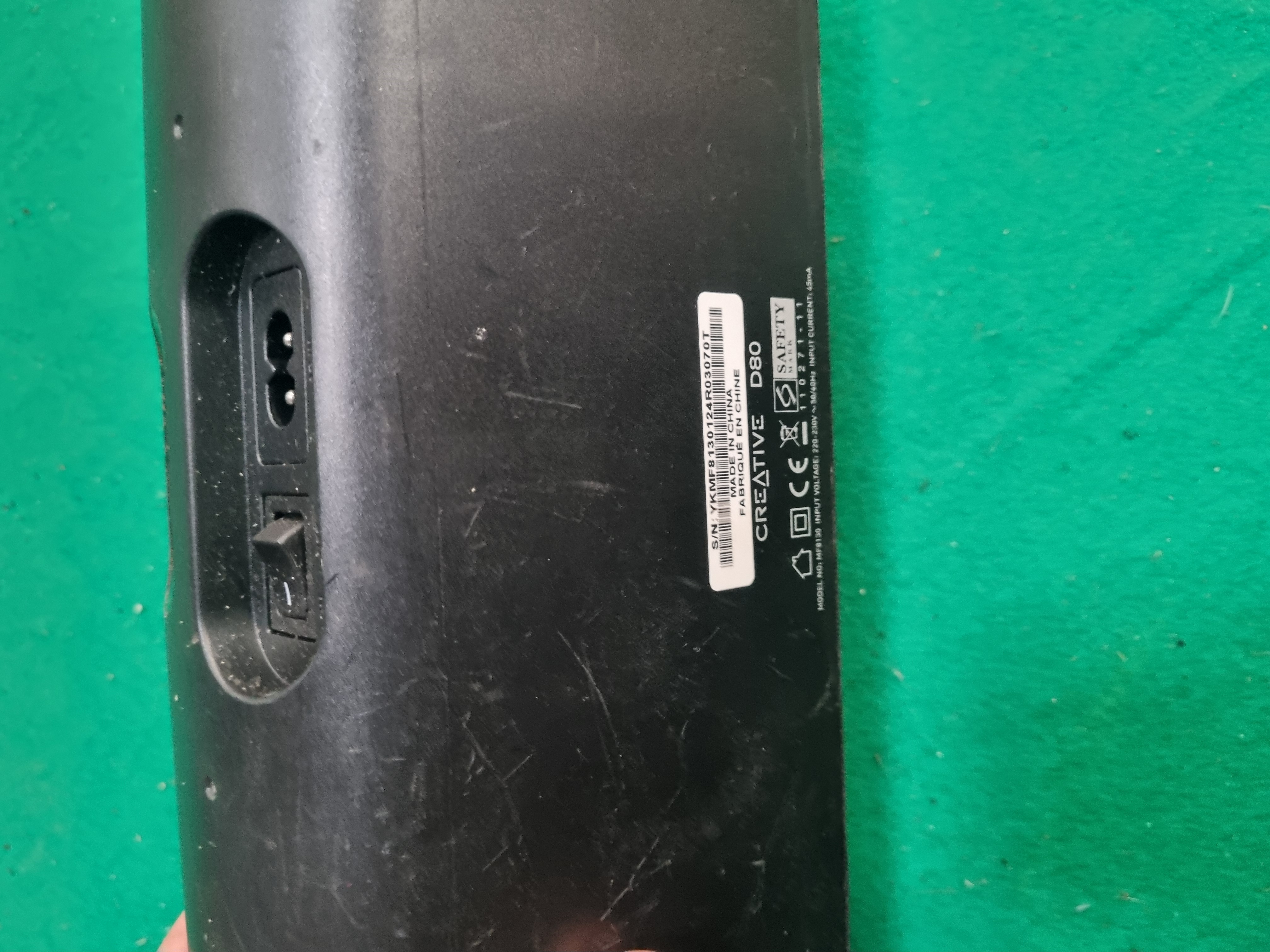 This lot comprises a Creative D80 Bluetooth wireless speaker and a flexible mini tripod. The Creative D80 speaker features integrated Bluetooth connectivity, a 3.5mm auxiliary input port, a rear-mounted power switch, and a standard two-pin power socket. The front control panel includes a Bluetooth pairing button and volume adjustment buttons. The unit bears the manufacturer name Creative and the model number D80 on the rear label, with the serial number YKMF8130124R03070T. The flexible mini tripod features three multi-jointed legs, a ball-and-socket head with a locking knob, and a mounting plate with a standard 1/4 inch screw and built-in spirit level.