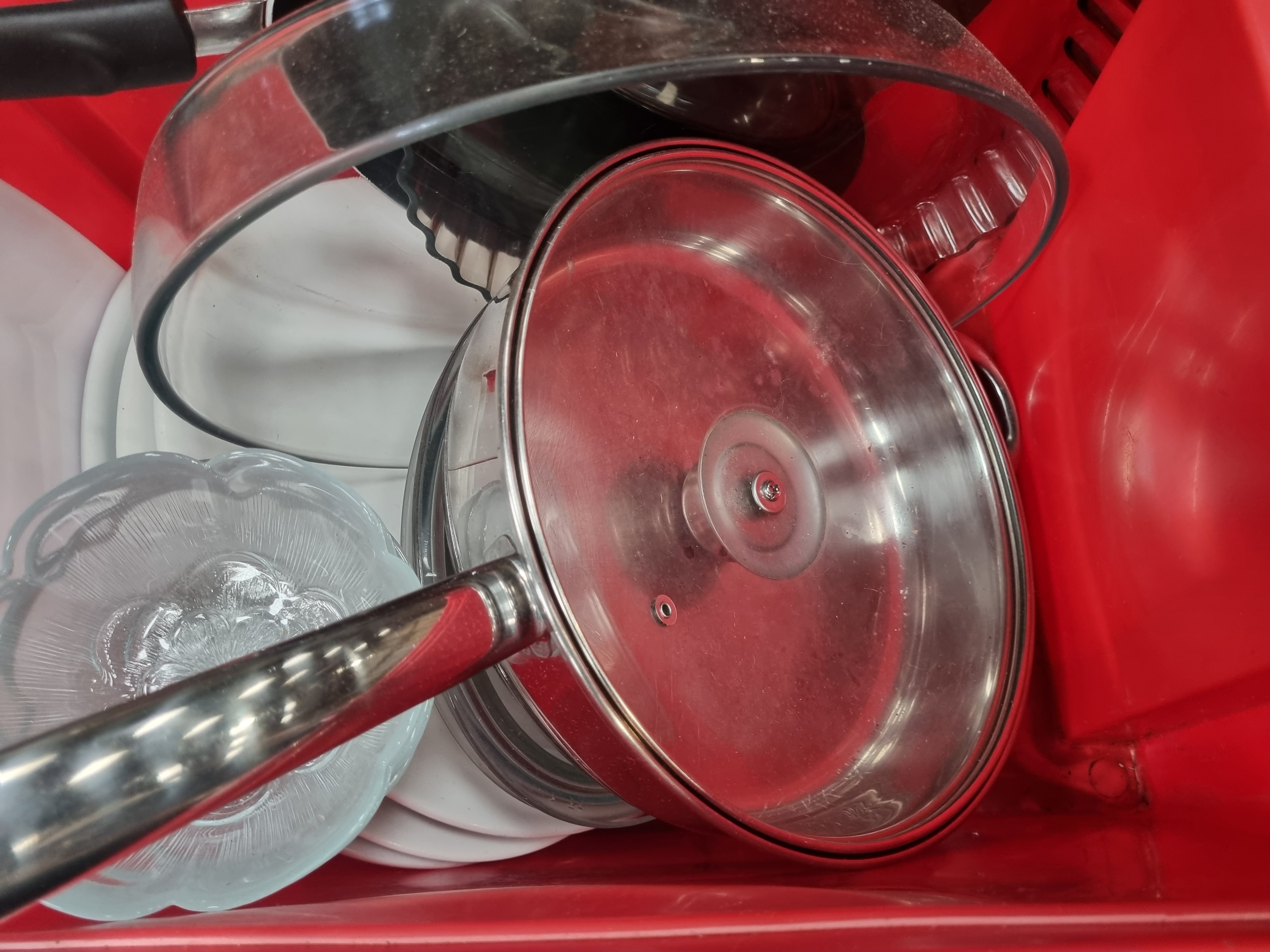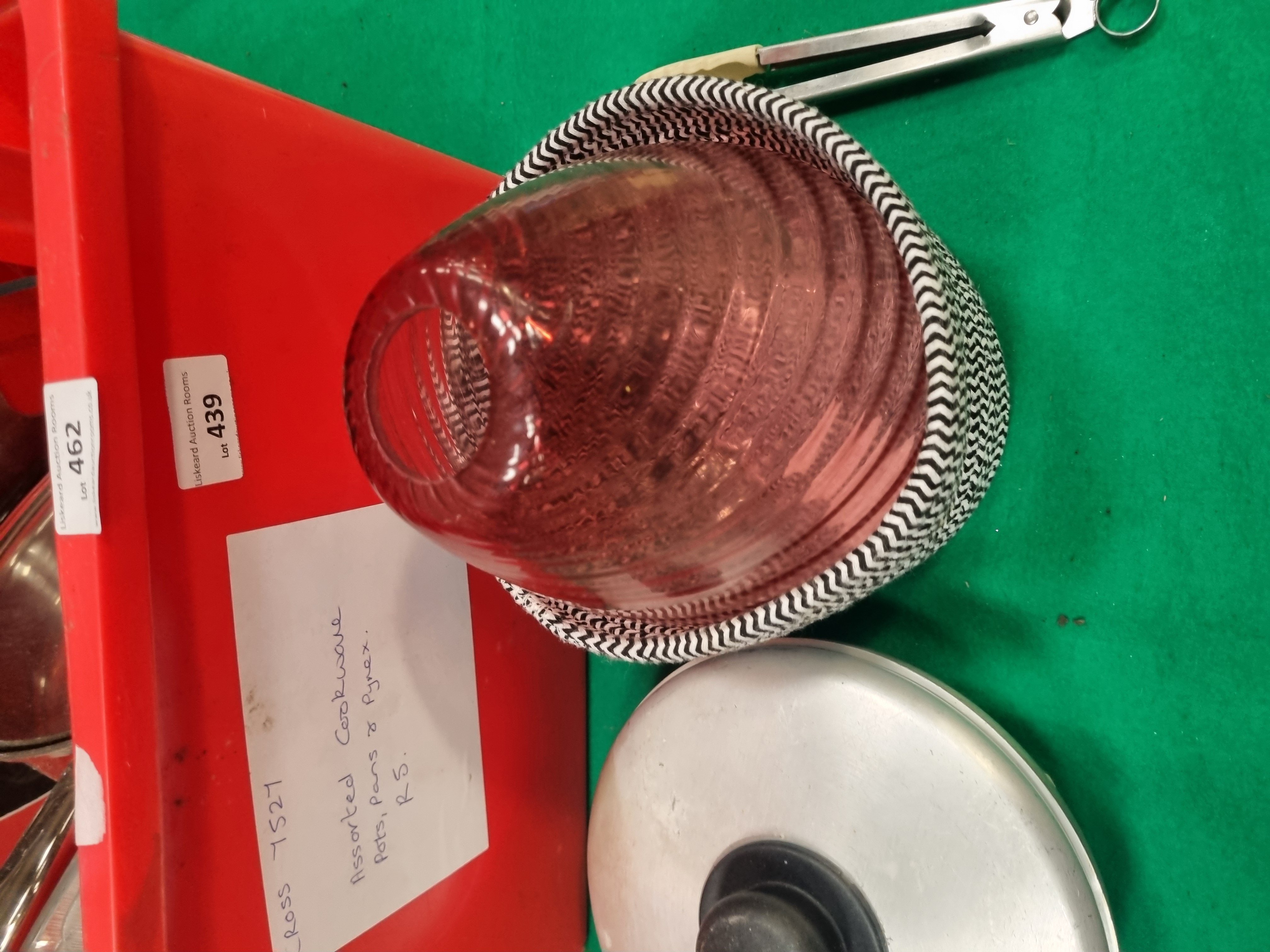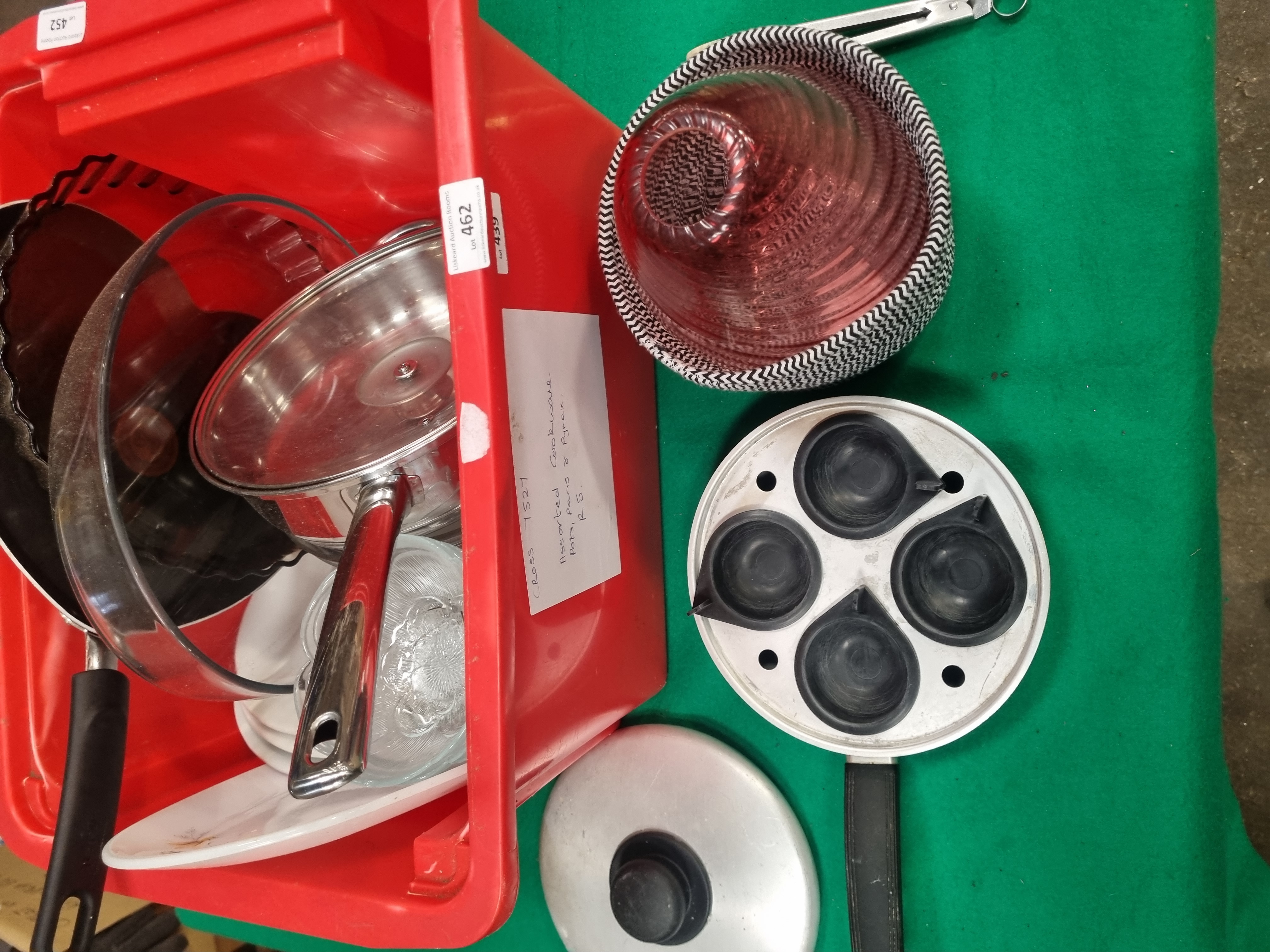 This lot comprises a variety of domestic items including an aluminium four-cup egg poacher with four removable black plastic poaching inserts and a matching domed lid. The collection further includes a stainless steel saucepan with a clear glass lid and a pair of metal kitchen tongs. Ceramic items consist of several plain white plates. Glassware includes a clear glass bowl with a moulded textured pattern and a larger cranberry-coloured translucent glass shade or flared bowl with horizontal ribbing, which rests upon a black and white chevron woven ring base. The items are presented within a red plastic crate bearing labels from Liskeard Auction Rooms. While handwritten notes on the crate mention Pyrex, no specific manufacturer marks were confirmed on the individual items.