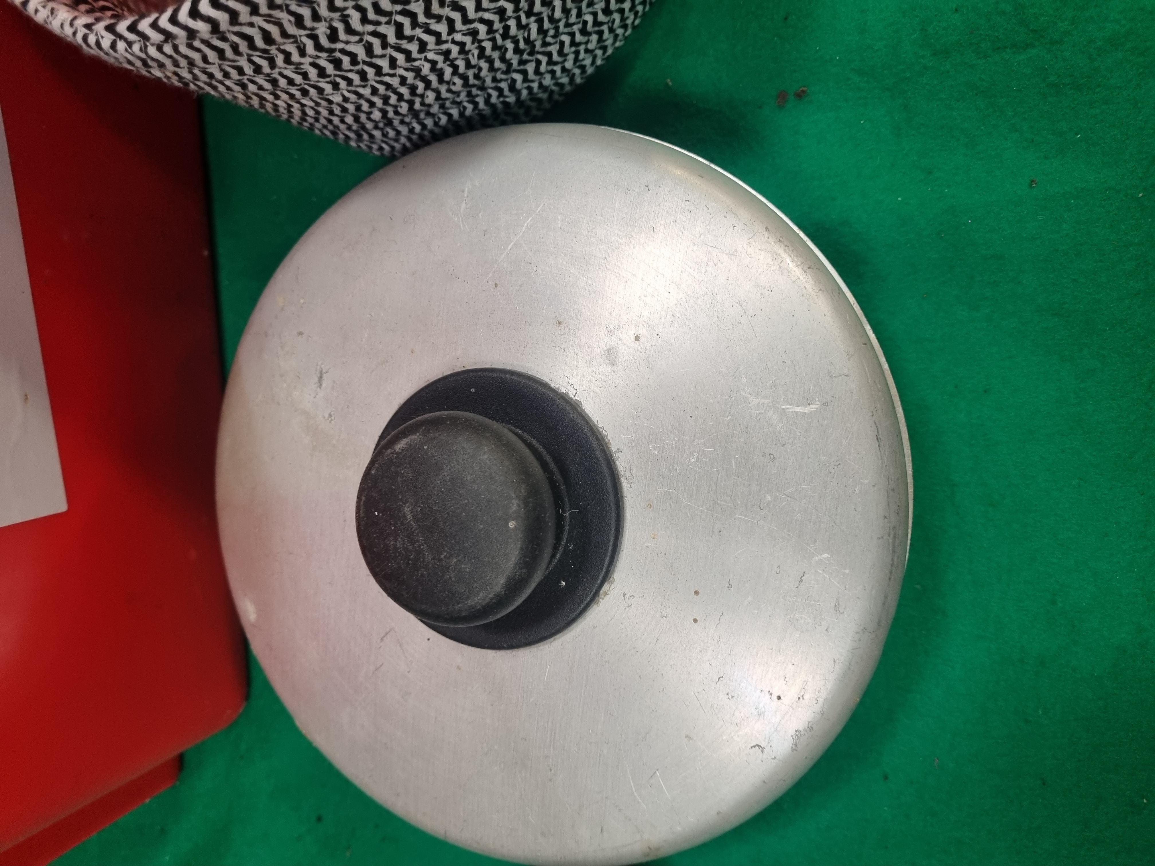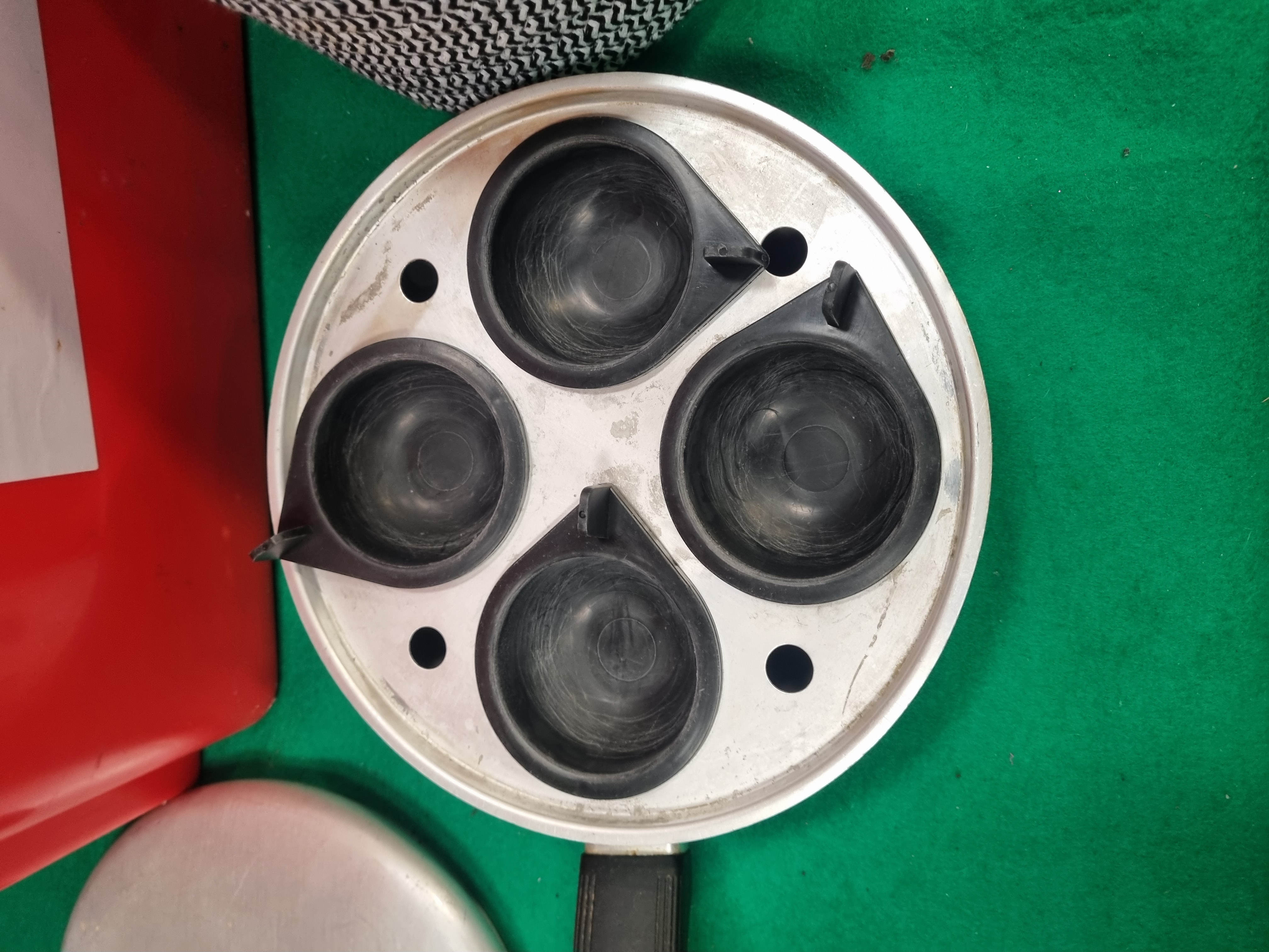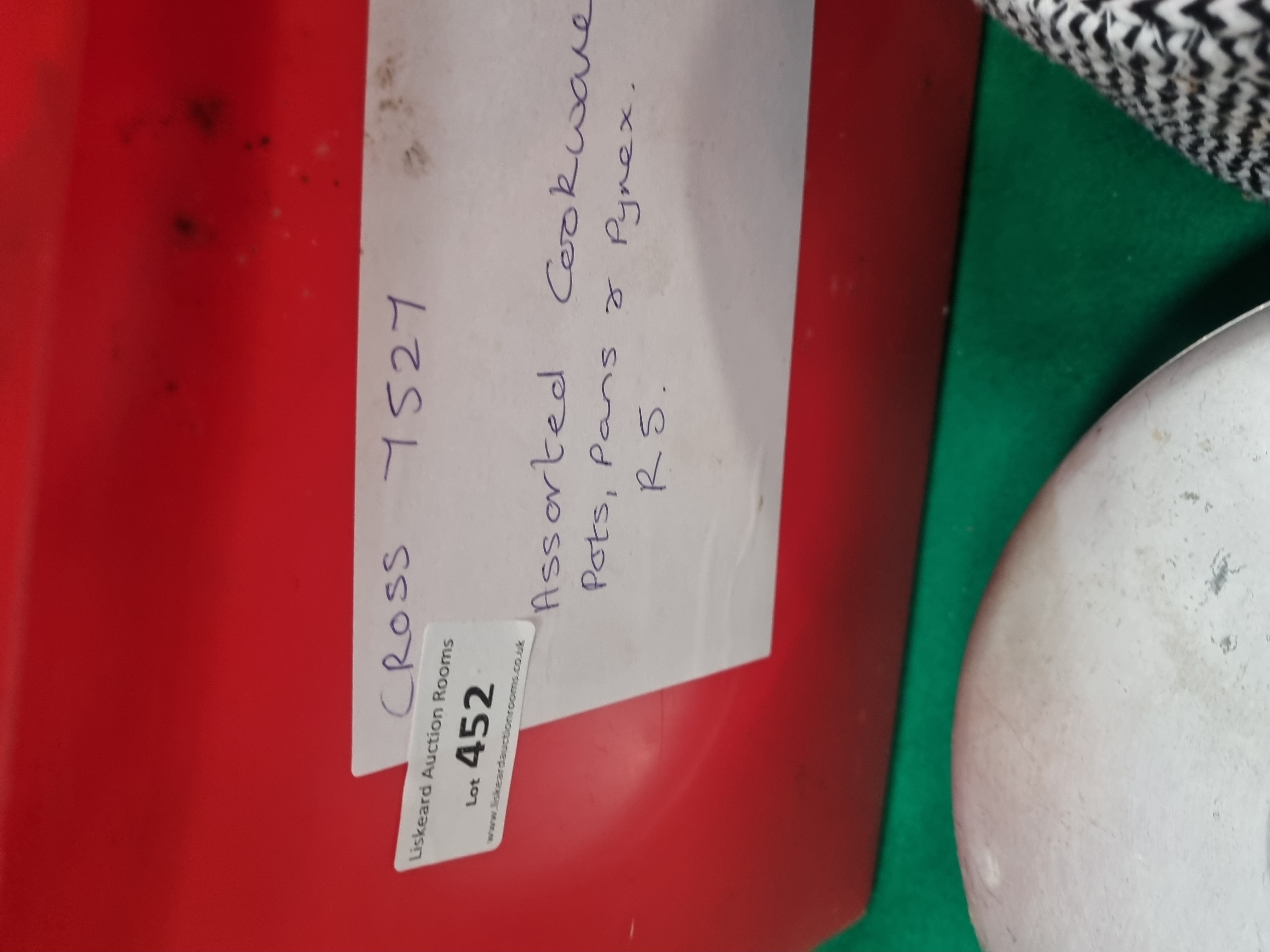 This lot comprises a variety of domestic items including an aluminium four-cup egg poacher with four removable black plastic poaching inserts and a matching domed lid. The collection further includes a stainless steel saucepan with a clear glass lid and a pair of metal kitchen tongs. Ceramic items consist of several plain white plates. Glassware includes a clear glass bowl with a moulded textured pattern and a larger cranberry-coloured translucent glass shade or flared bowl with horizontal ribbing, which rests upon a black and white chevron woven ring base. The items are presented within a red plastic crate bearing labels from Liskeard Auction Rooms. While handwritten notes on the crate mention Pyrex, no specific manufacturer marks were confirmed on the individual items.