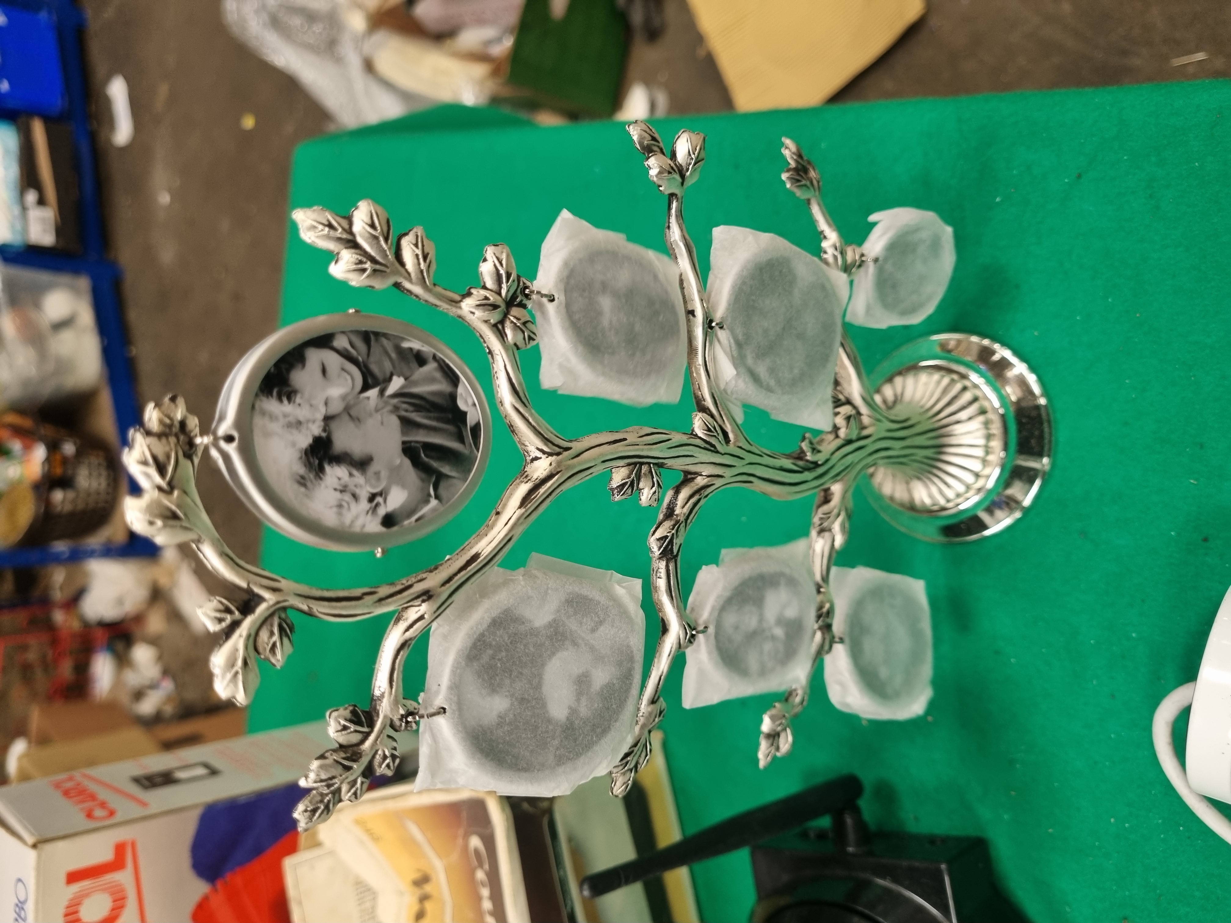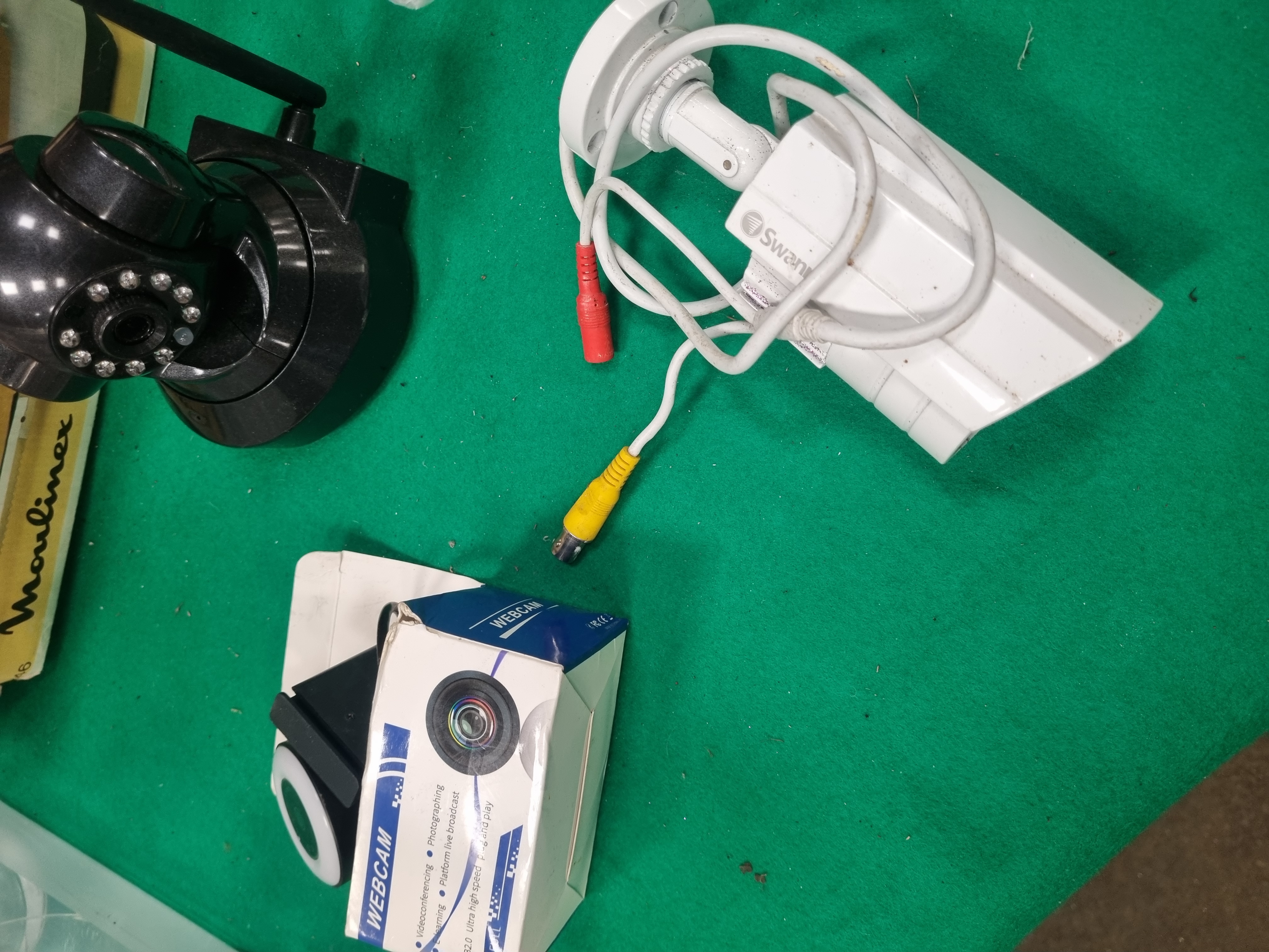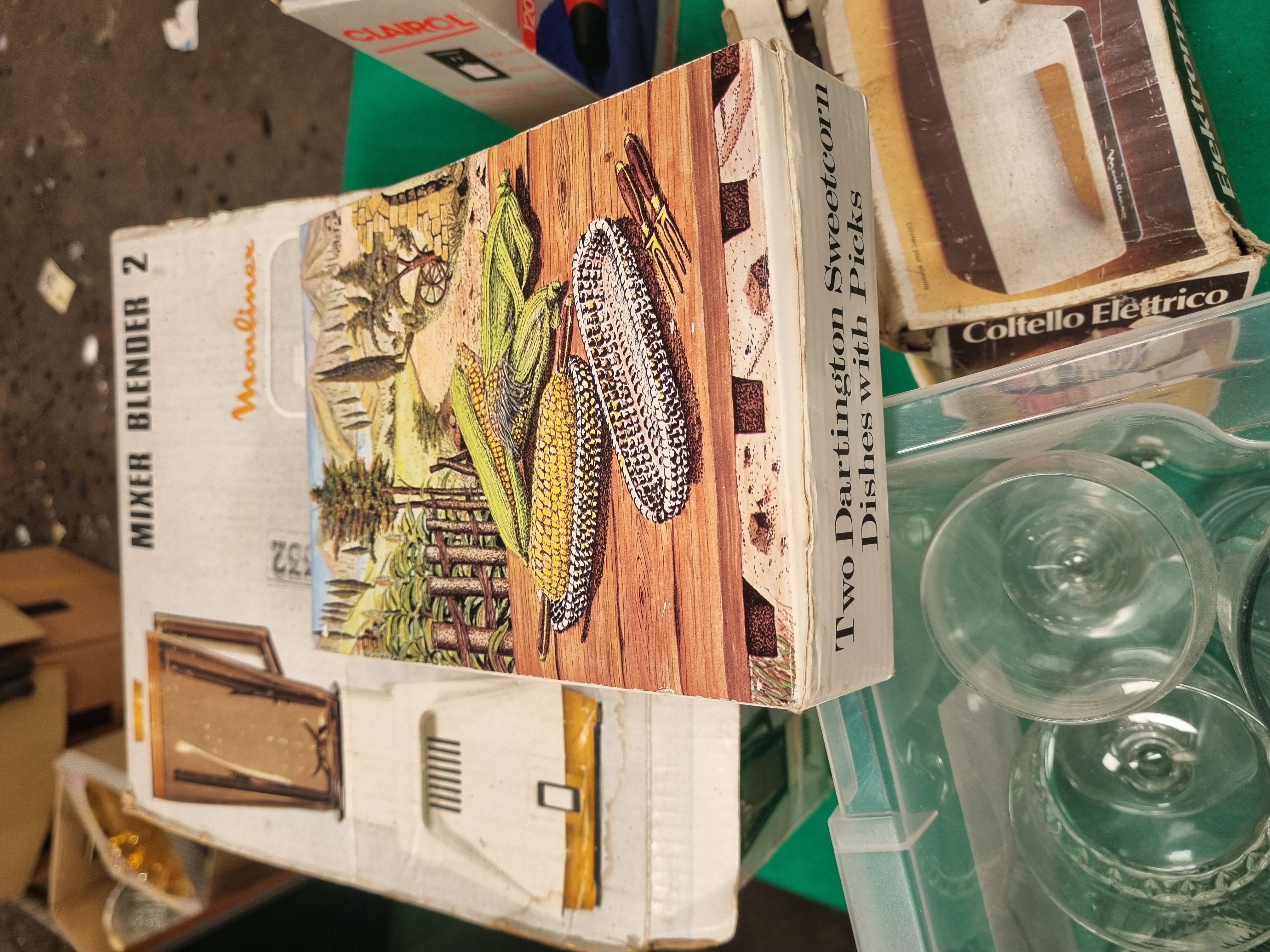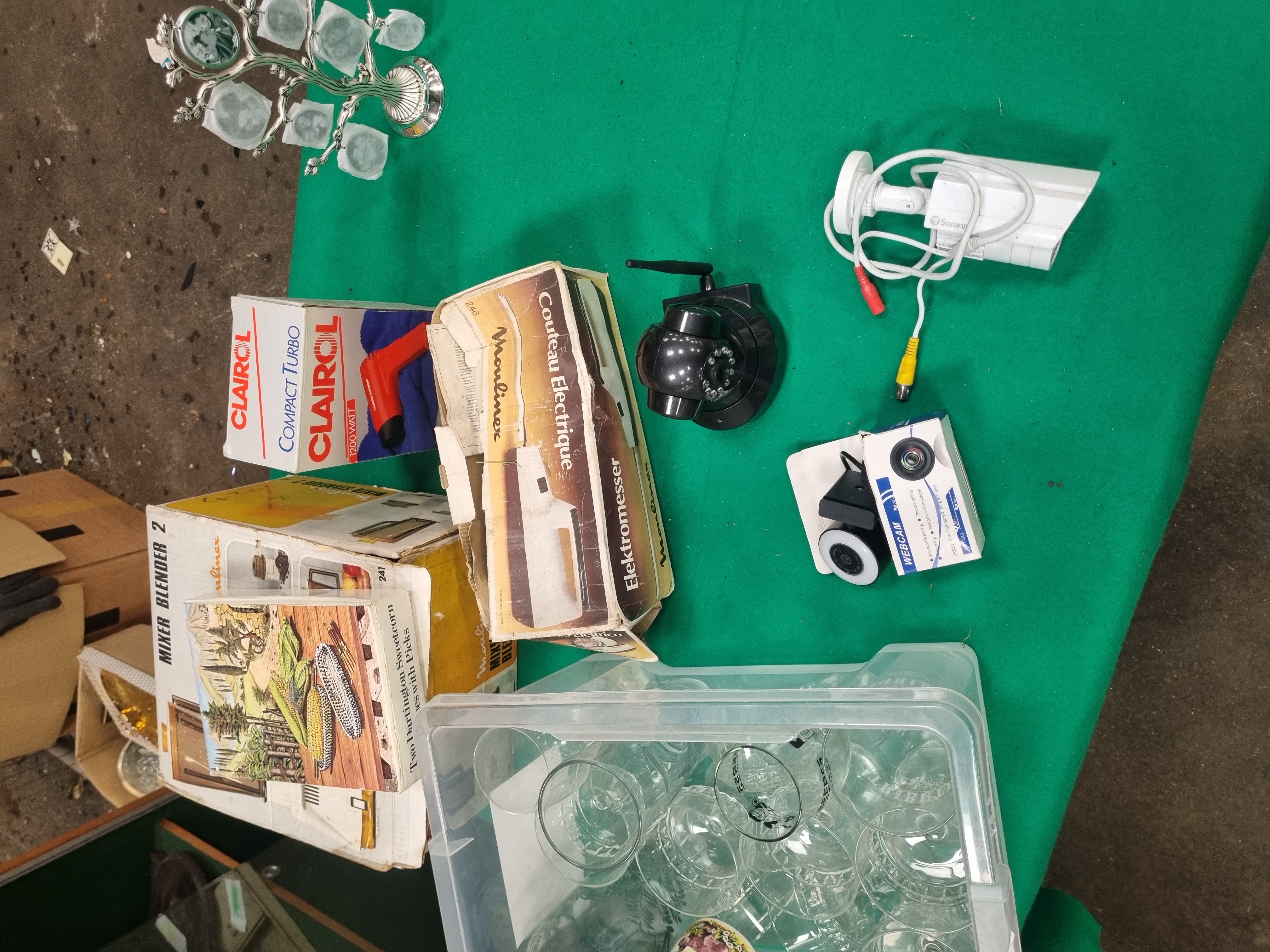 This lot comprises an assortment of vintage kitchen appliances, electronics, and household decorative items. Included are a Moulinex Mixer Blender 2, model 292, and a Moulinex Electric Knife, model 246, both in original cardboard boxes. The collection features a Clairol Compact Turbo 1200 watt hair dryer and a set of two Dartington sweetcorn dishes with picks, also in their respective boxes. The electronics section includes a Swann wired bullet-style security camera with attached video and power connectors, a Sight Bulb style black wireless pan-tilt-zoom security camera with an integrated antenna, and a boxed USB 2.0 webcam. Decorative and household items consist of a silver-toned metal family tree photo frame with branch-like scrollwork and several oval and circular frames, and a transparent plastic crate containing various glassware. Notable pieces in the glassware include a Beefeater promotional glass and a ceramic mug decorated with a bird and floral motif.