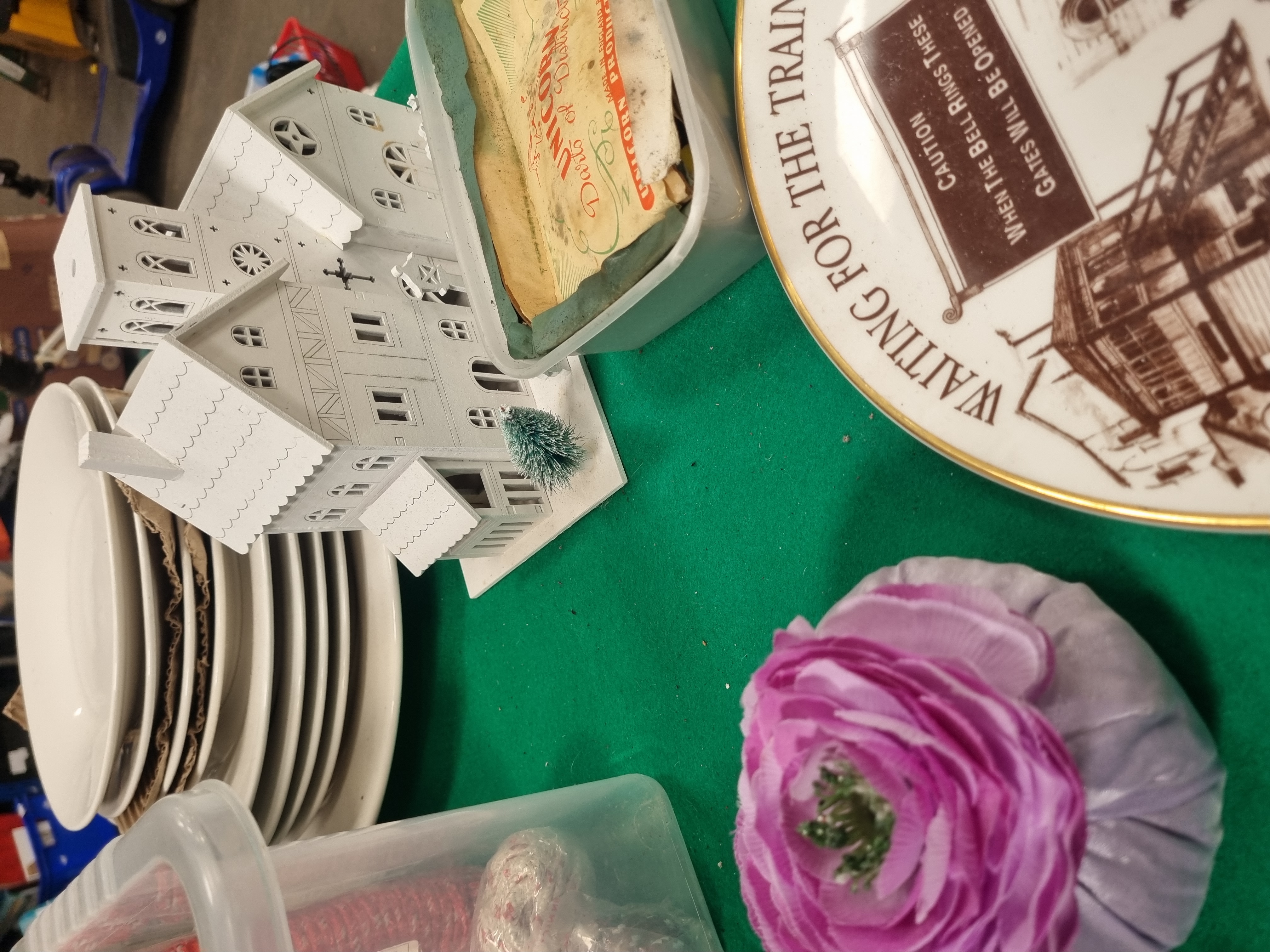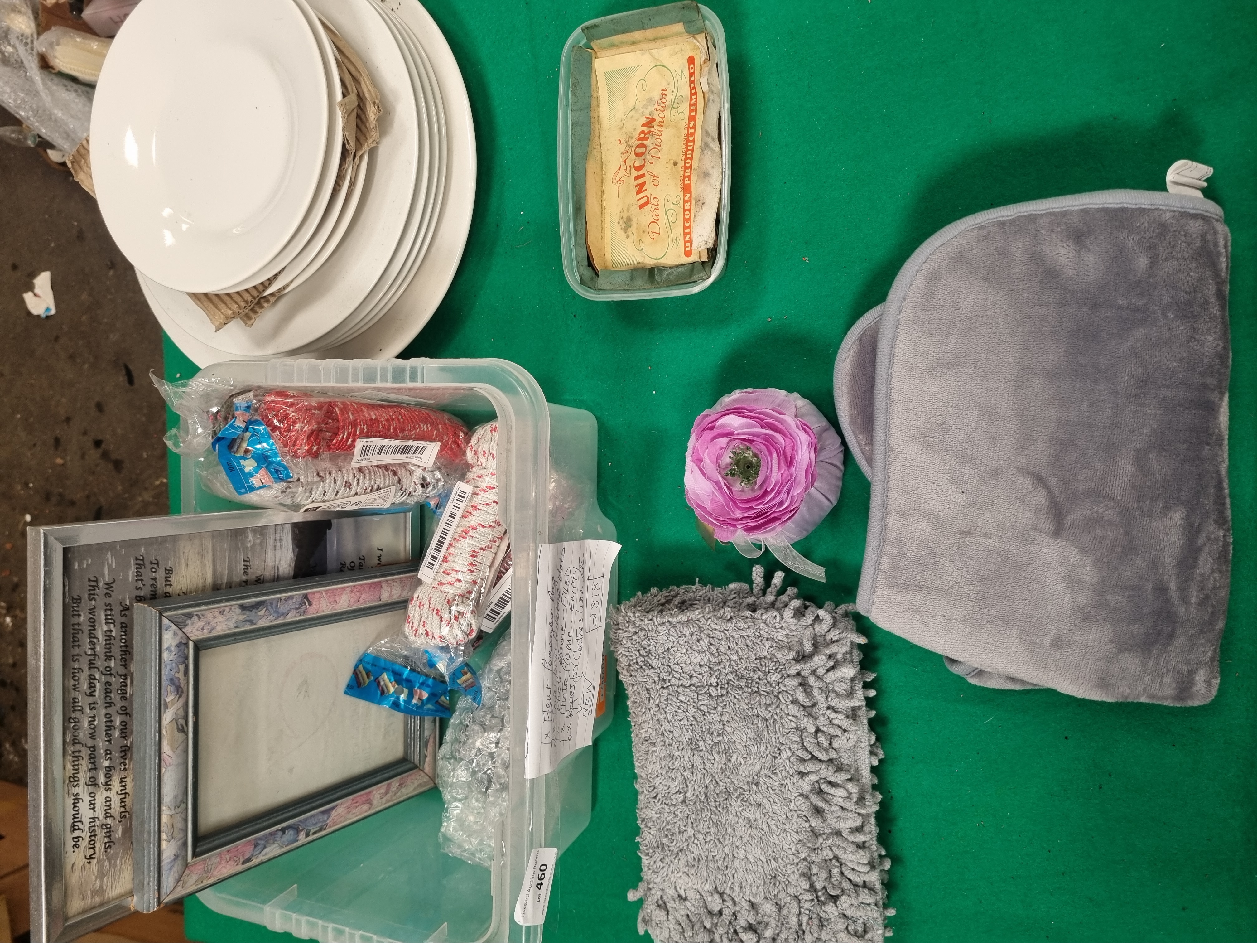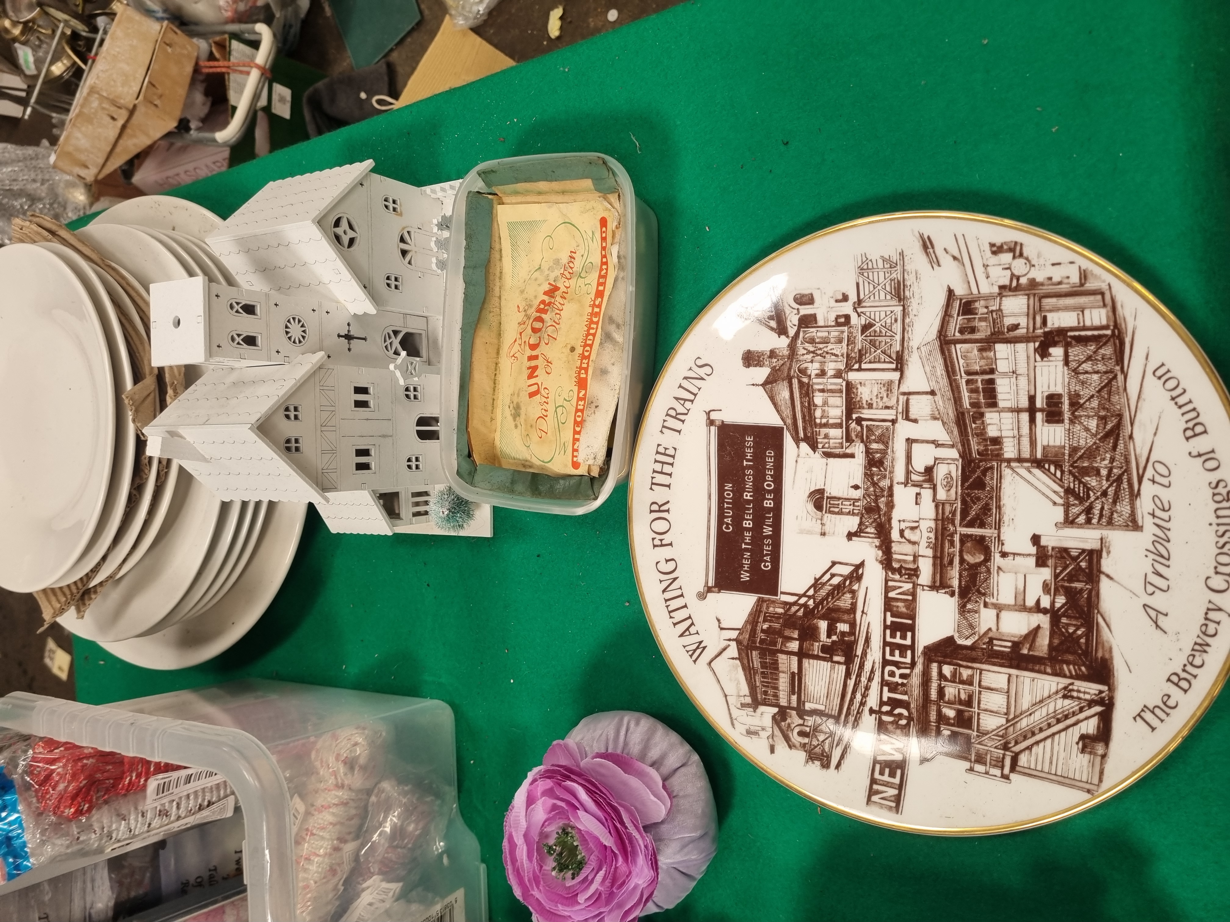 This lot contains an assortment of household items and decorative collectibles. It includes a circular ceramic commemorative wall plate from the A Tribute to The Brewery Crossings of Burton series, depicting New Street with a sepia-toned illustration and a gilded rim. There is a stack of plain white ceramic dinner plates and a white-painted architectural model of a multi-gabled building featuring cut-out windows and a small decorative tree. A vintage cardboard box for Unicorn Products Limited Darts of Distinction is included. The textile items comprise one purple fabric Fleur pomander bag and two grey pedestal mats, one featuring a shaggy pile and the other a plush finish. Miscellaneous items include six packaged coils of synthetic clothesline rope in red and grey, and two picture frames, one containing a printed sentimental poem and one empty. The lot is presented in a clear plastic storage container.