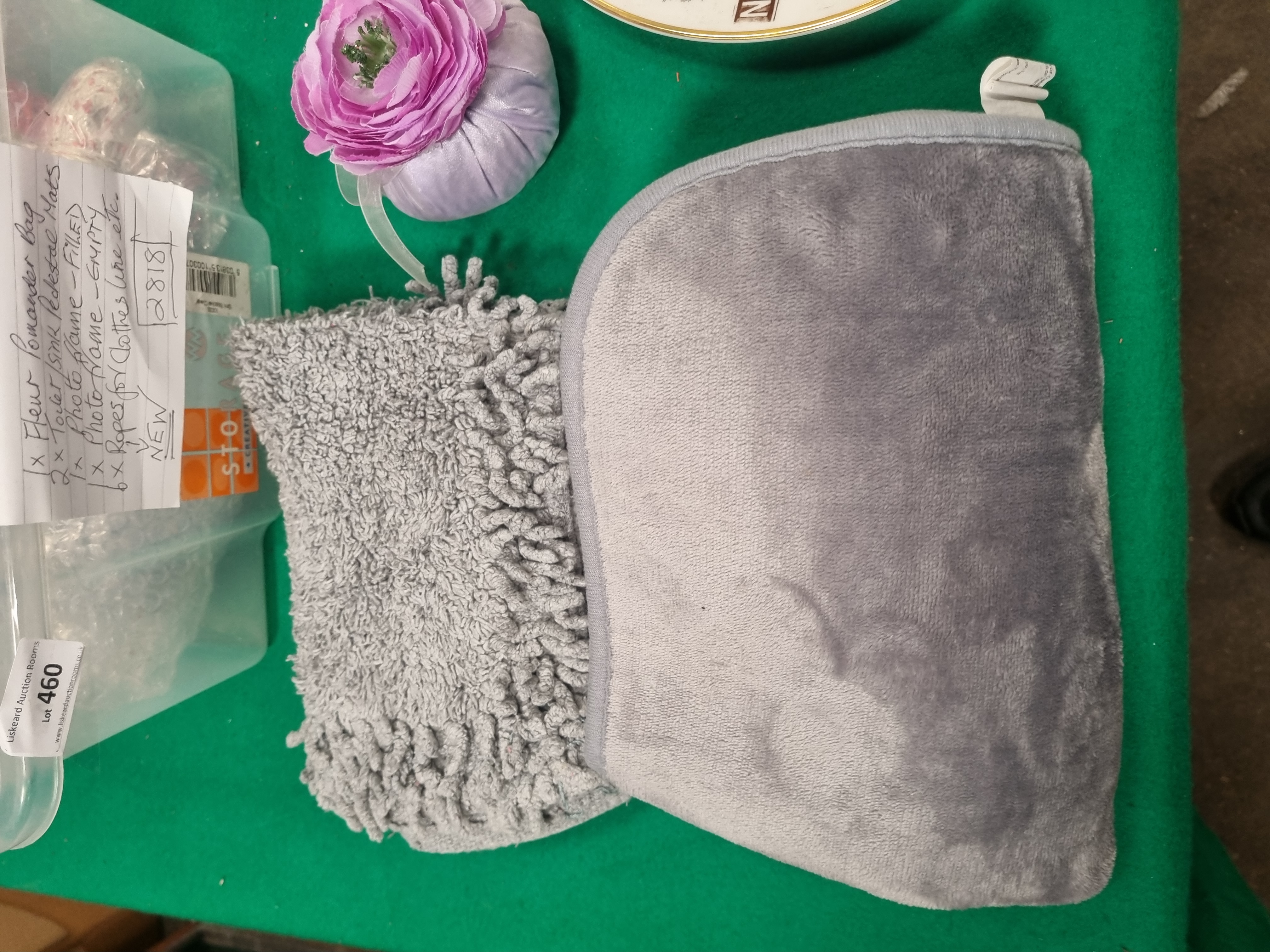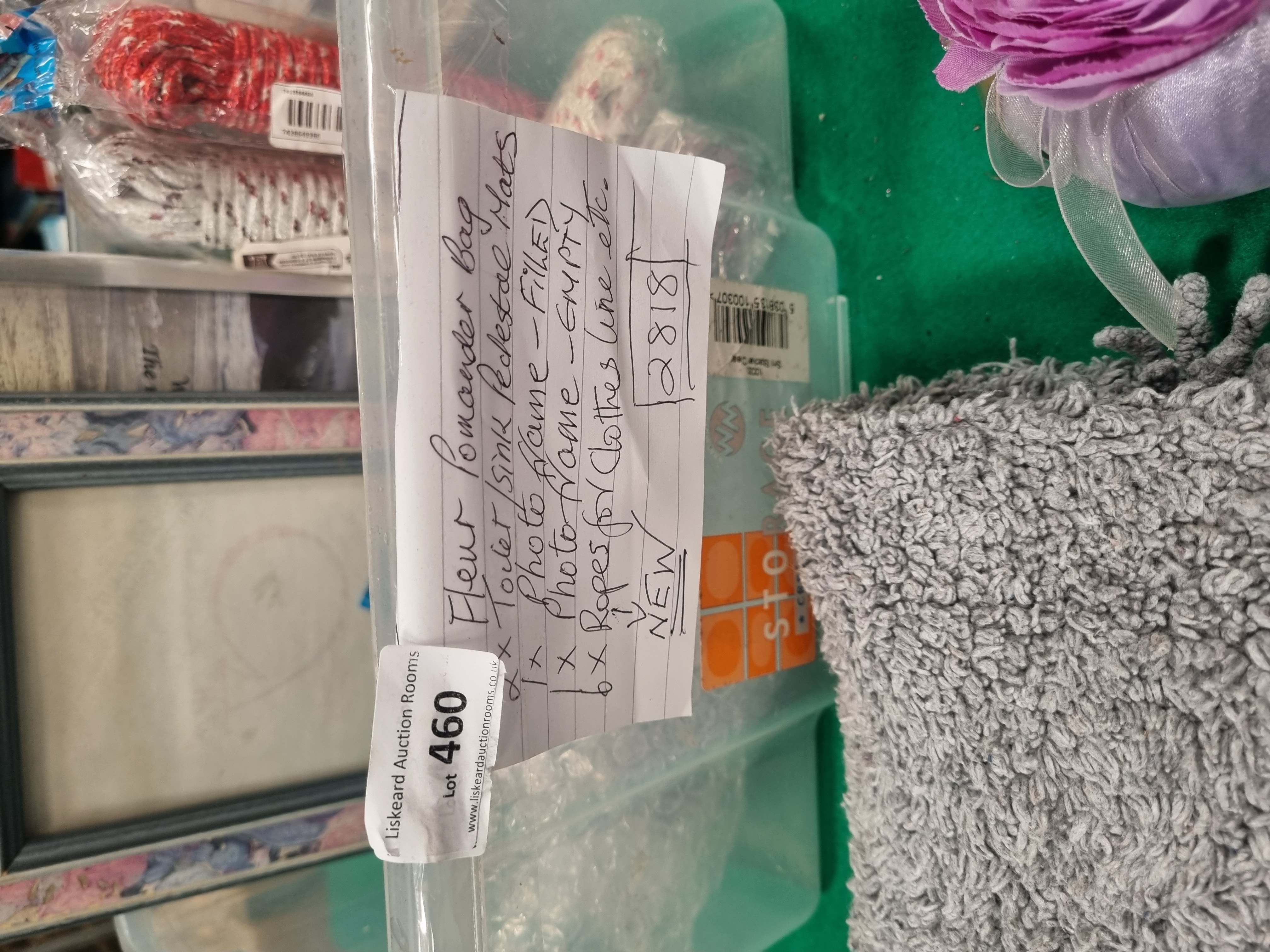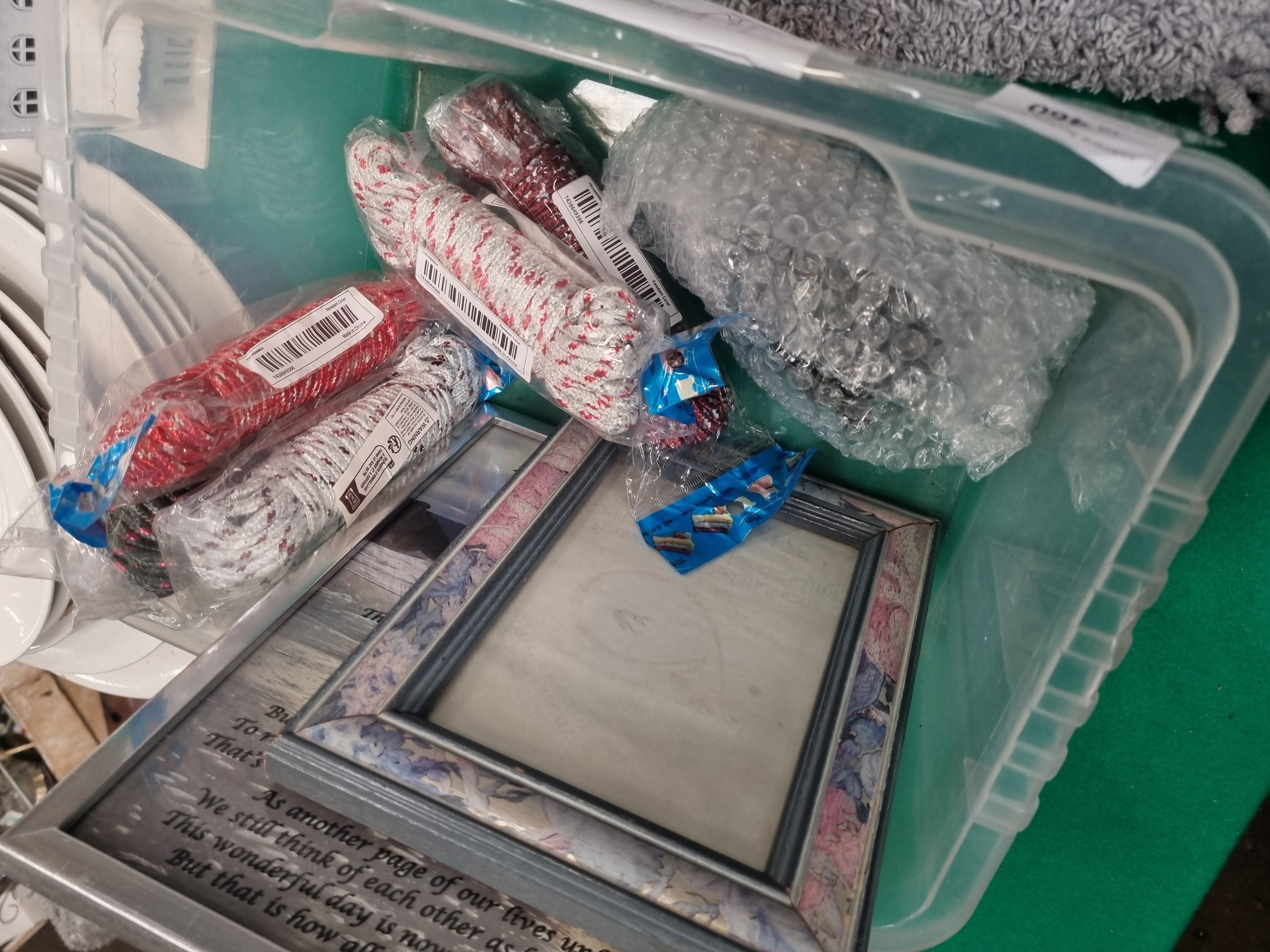 This lot contains an assortment of household items and decorative collectibles. It includes a circular ceramic commemorative wall plate from the A Tribute to The Brewery Crossings of Burton series, depicting New Street with a sepia-toned illustration and a gilded rim. There is a stack of plain white ceramic dinner plates and a white-painted architectural model of a multi-gabled building featuring cut-out windows and a small decorative tree. A vintage cardboard box for Unicorn Products Limited Darts of Distinction is included. The textile items comprise one purple fabric Fleur pomander bag and two grey pedestal mats, one featuring a shaggy pile and the other a plush finish. Miscellaneous items include six packaged coils of synthetic clothesline rope in red and grey, and two picture frames, one containing a printed sentimental poem and one empty. The lot is presented in a clear plastic storage container.
