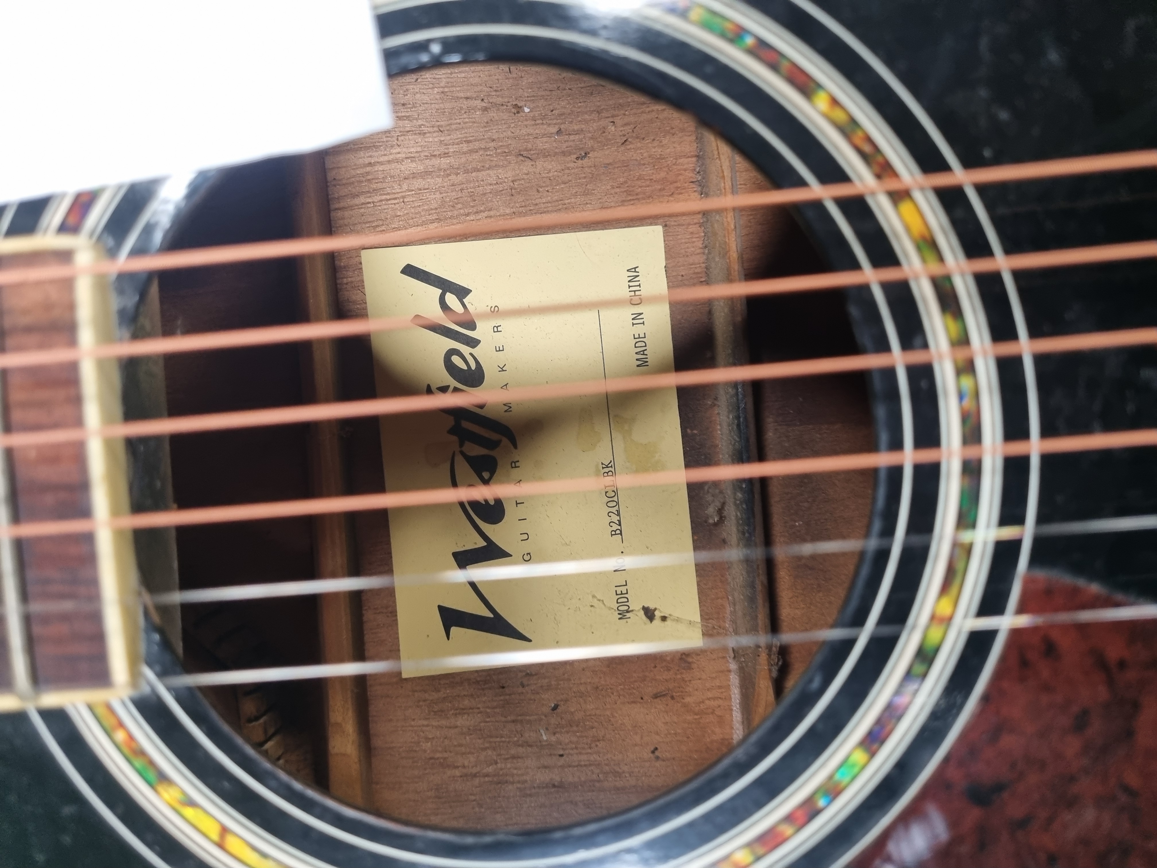 A left-handed jumbo cutaway acoustic guitar manufactured by Westfield, model B220CBK. The instrument features a body with a black gloss finish and cream-coloured binding. It is constructed with a dark wood fretboard, likely rosewood, featuring pearloid dot position inlays and a matching dark wood bridge. The headstock is equipped with six chrome-enclosed tuning machines. A tortoiseshell-effect pickguard is fitted to the body, bearing the maker’s logo. The interior soundhole label is printed with Westfield Guitar Makers, Model No. B220CBK, and Made in China. The Westfield brand name appears in a stylized script on the headstock, pickguard, and internal label. An accompanying handwritten note identifies the model as B220LBK.
