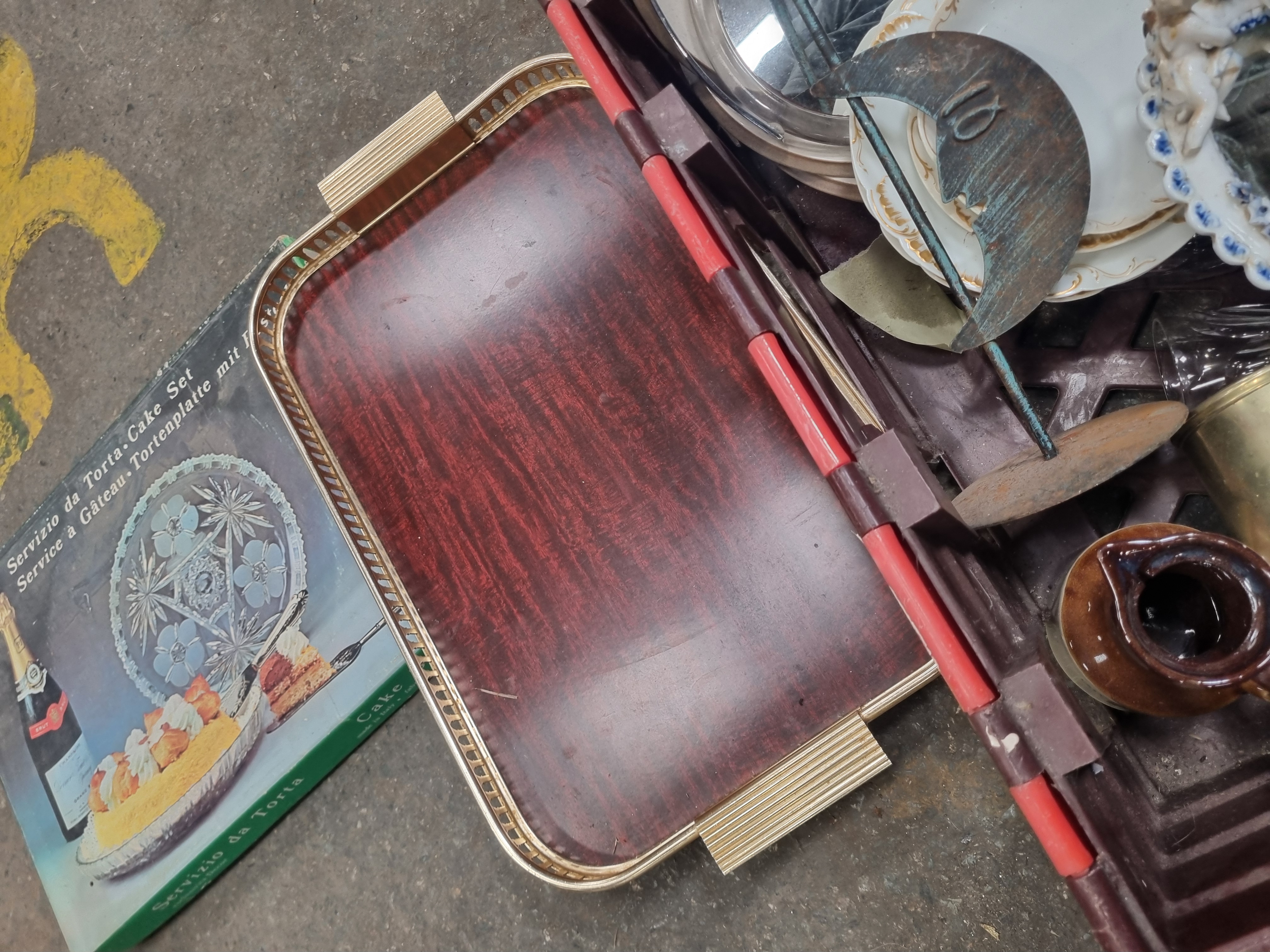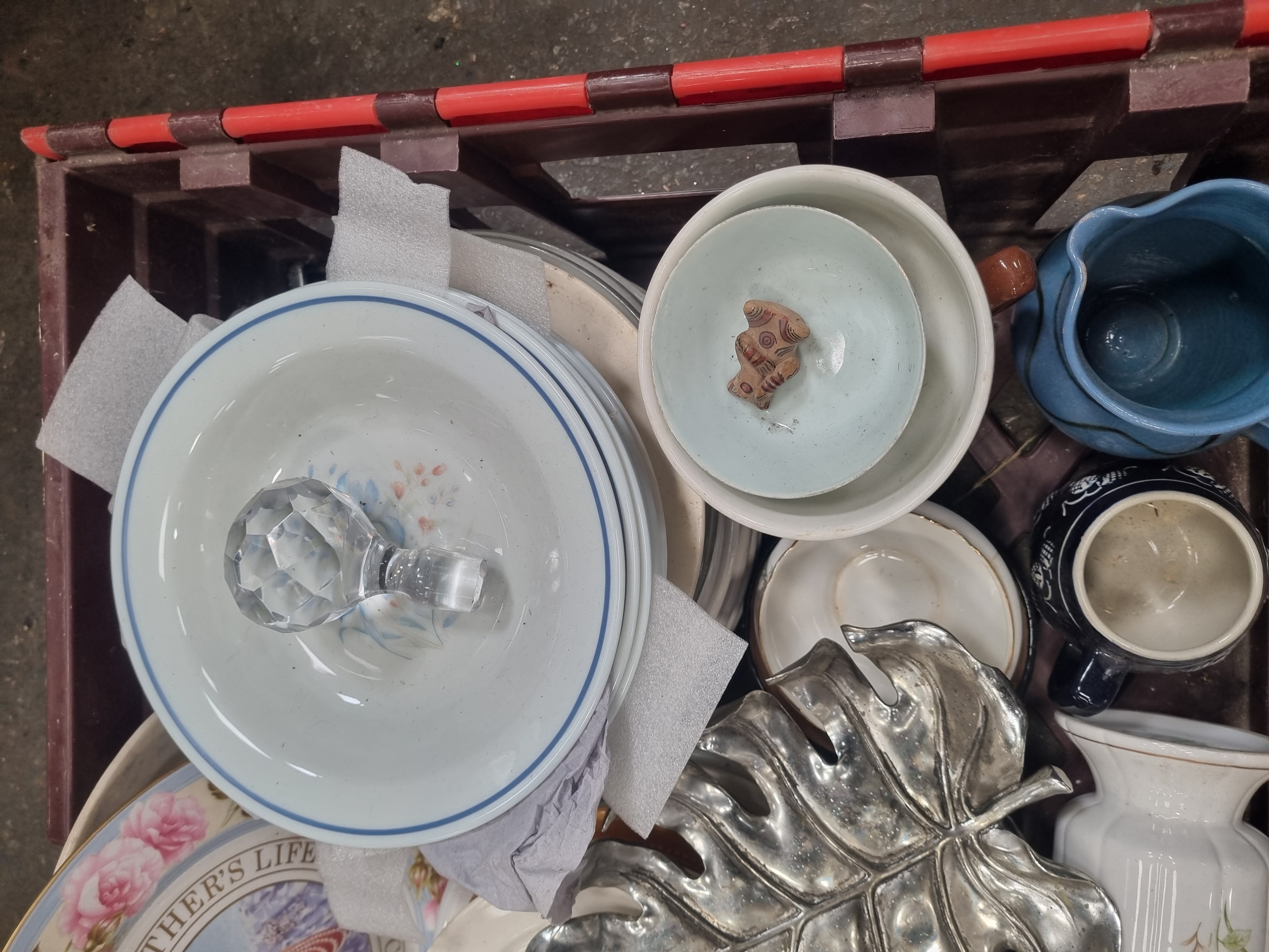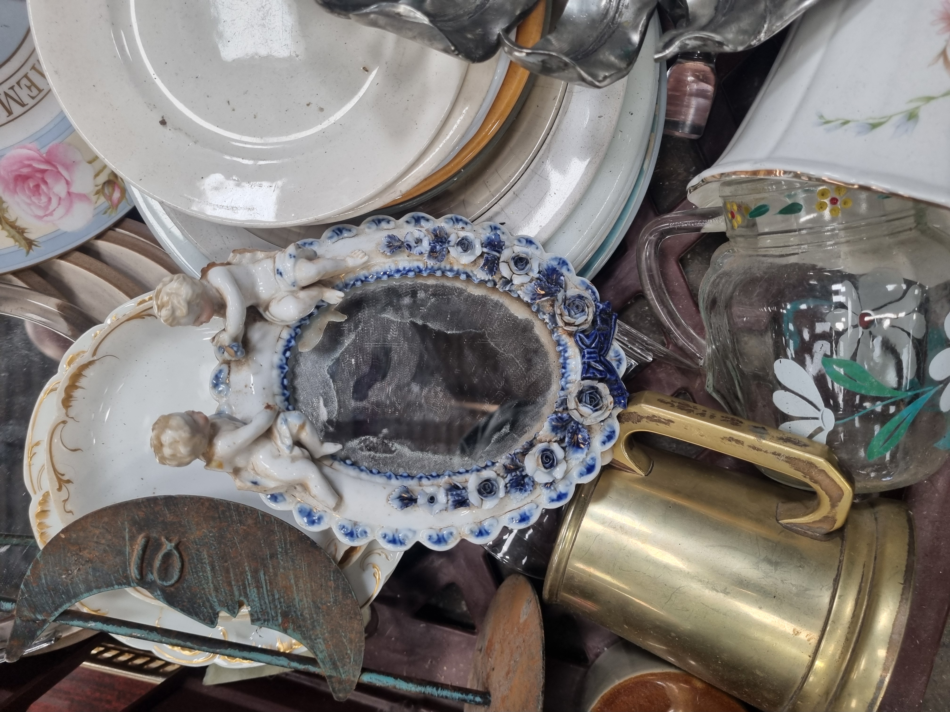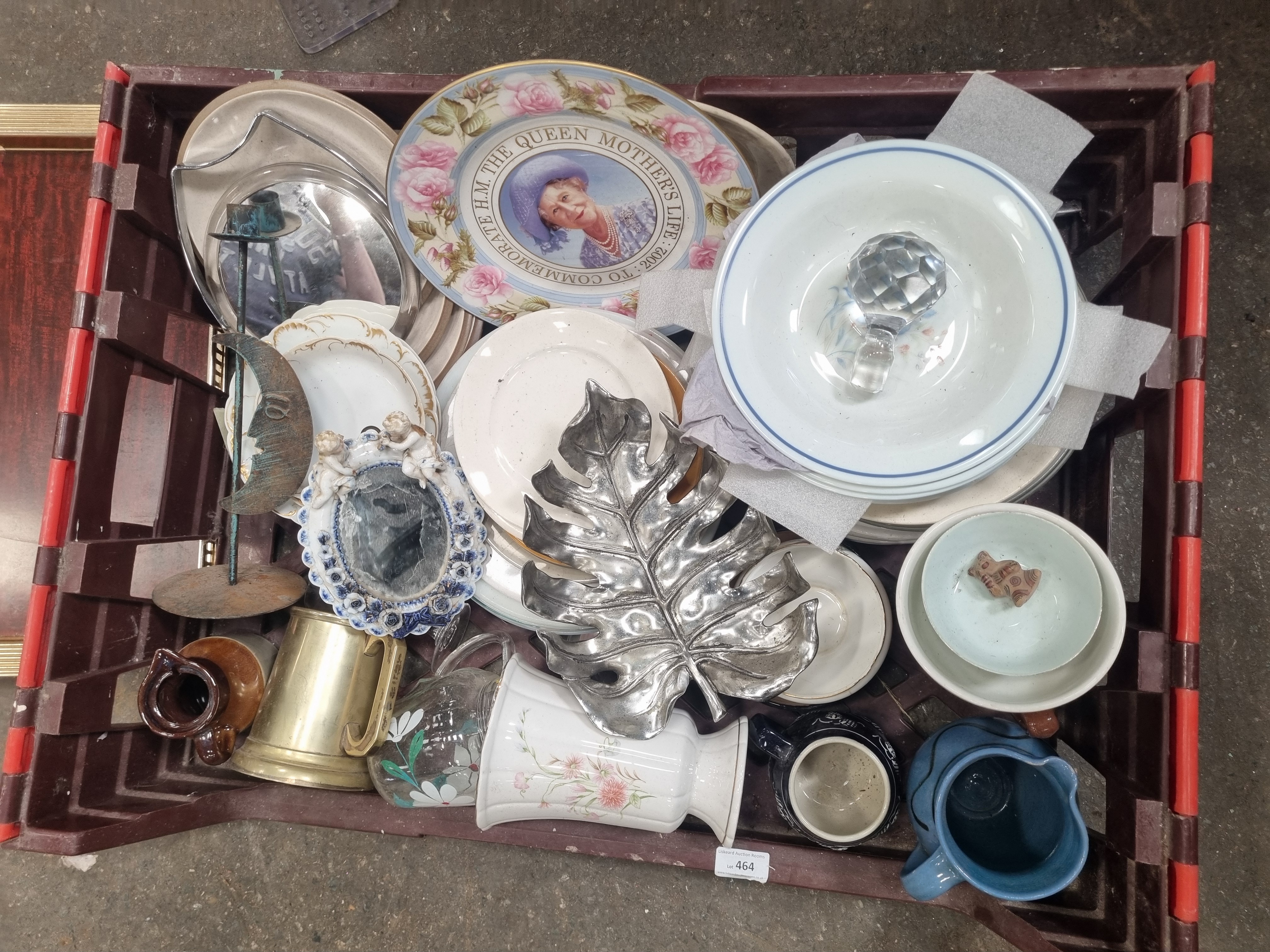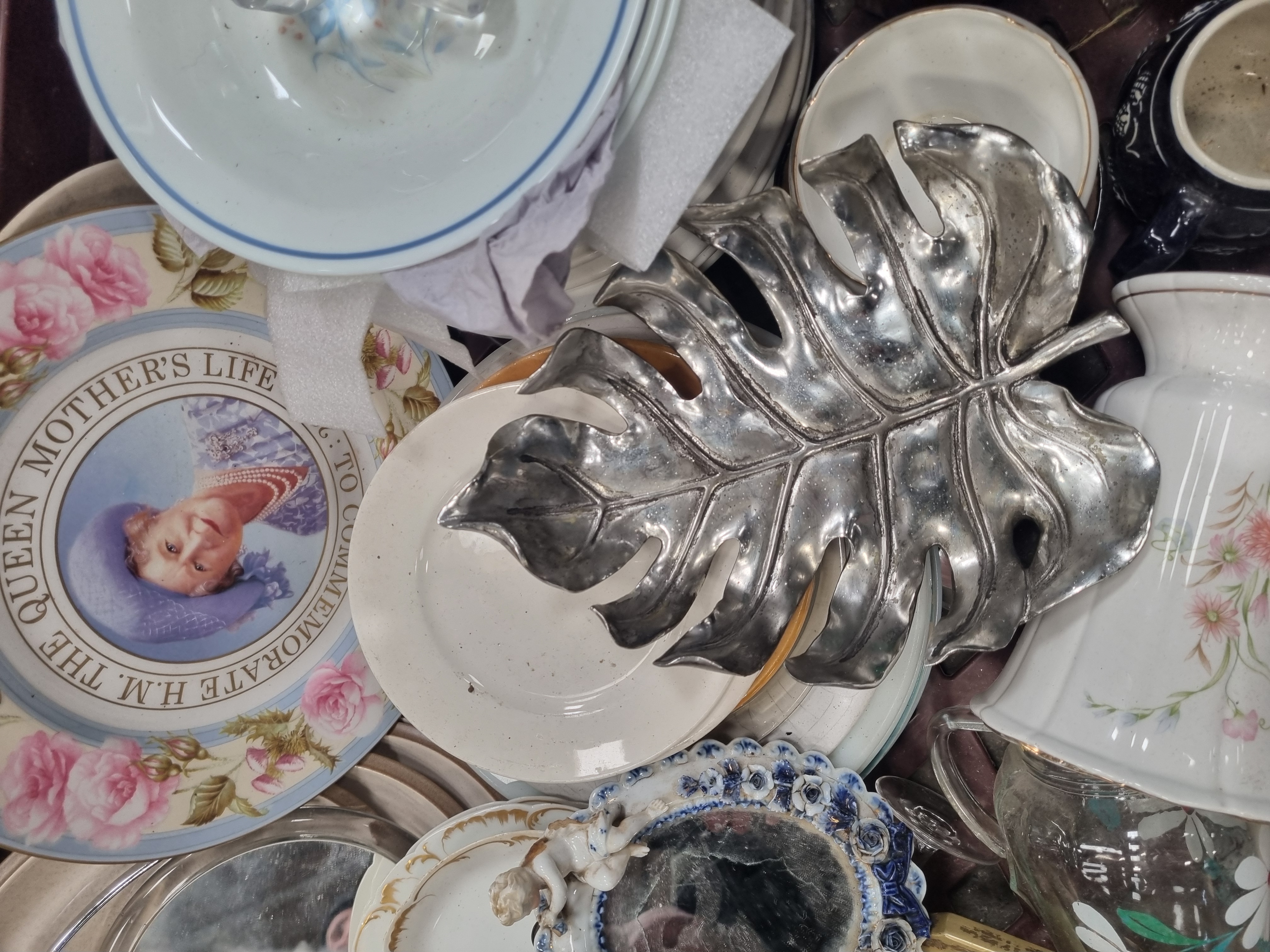 This mixed lot comprises a variety of decorative and functional household objects. The ceramic component includes a commemorative porcelain plate for H.M. Queen Elizabeth The Queen Mother (1900-2002), featuring a central transfer-printed portrait within a rose-decorated border. A white porcelain vase with a fluted rim displays a floral spray and bears the base mark Porcroft Made in England. Further ceramics include a small oval mirror frame with applied blue and white roses and twin cherub figures, a celadon-glazed bowl containing a small terracotta figure, a blue-glazed jug, and a selection of earthenware and porcelain plates and bowls. Metalware items include a large silver-tone decorative dish in the form of a monstera leaf, a heavy brass tankard with a loop handle, a patinated crescent moon ornament with a cut-out number 10, and a rectangular gallery tray with a faux-mahogany laminate base and pierced gilt-metal rim. Glassware includes a large multi-faceted clear glass decanter stopper and a jug with white floral motifs. The lot also contains a boxed Italian Servizio da Torta cake set.