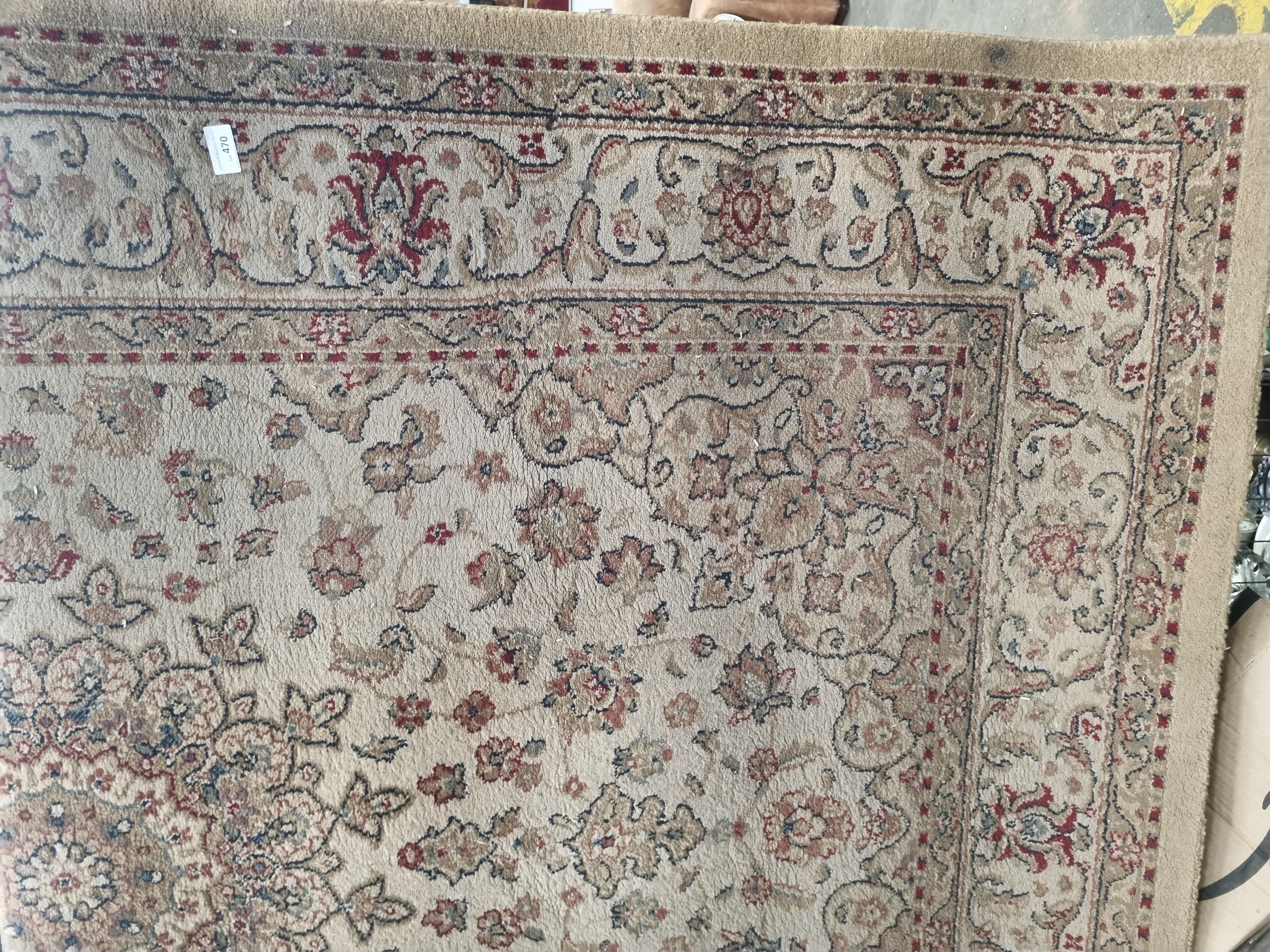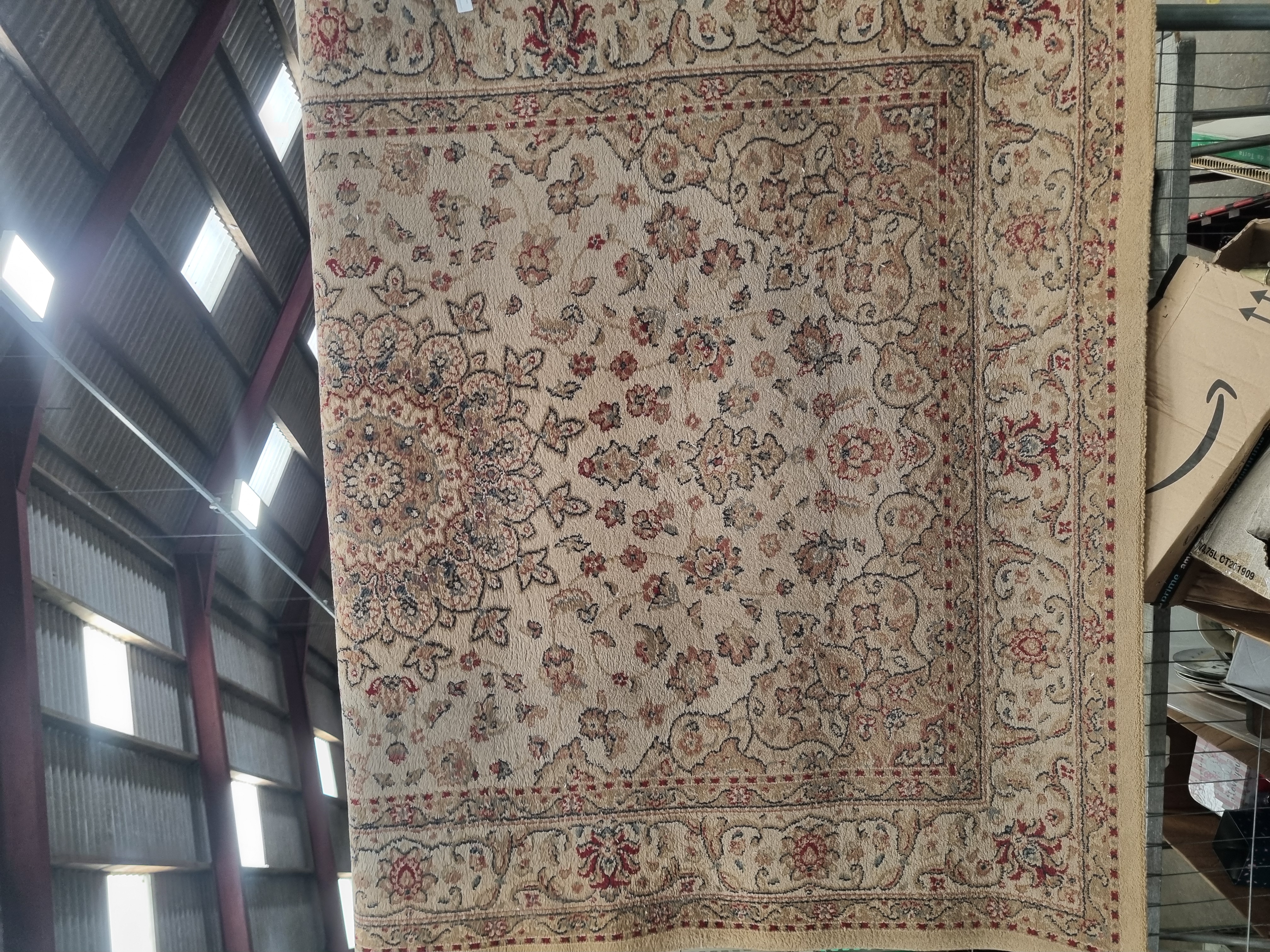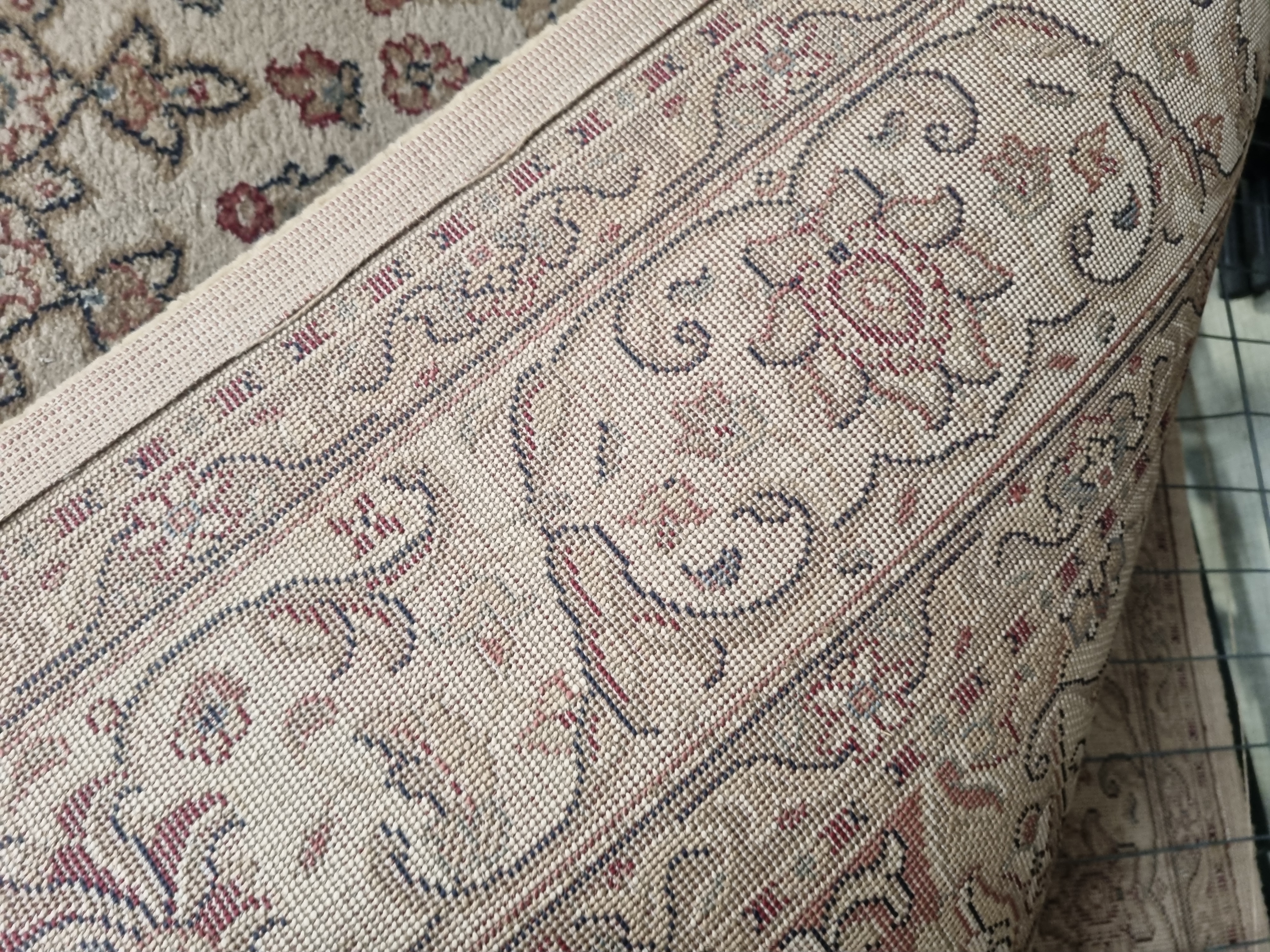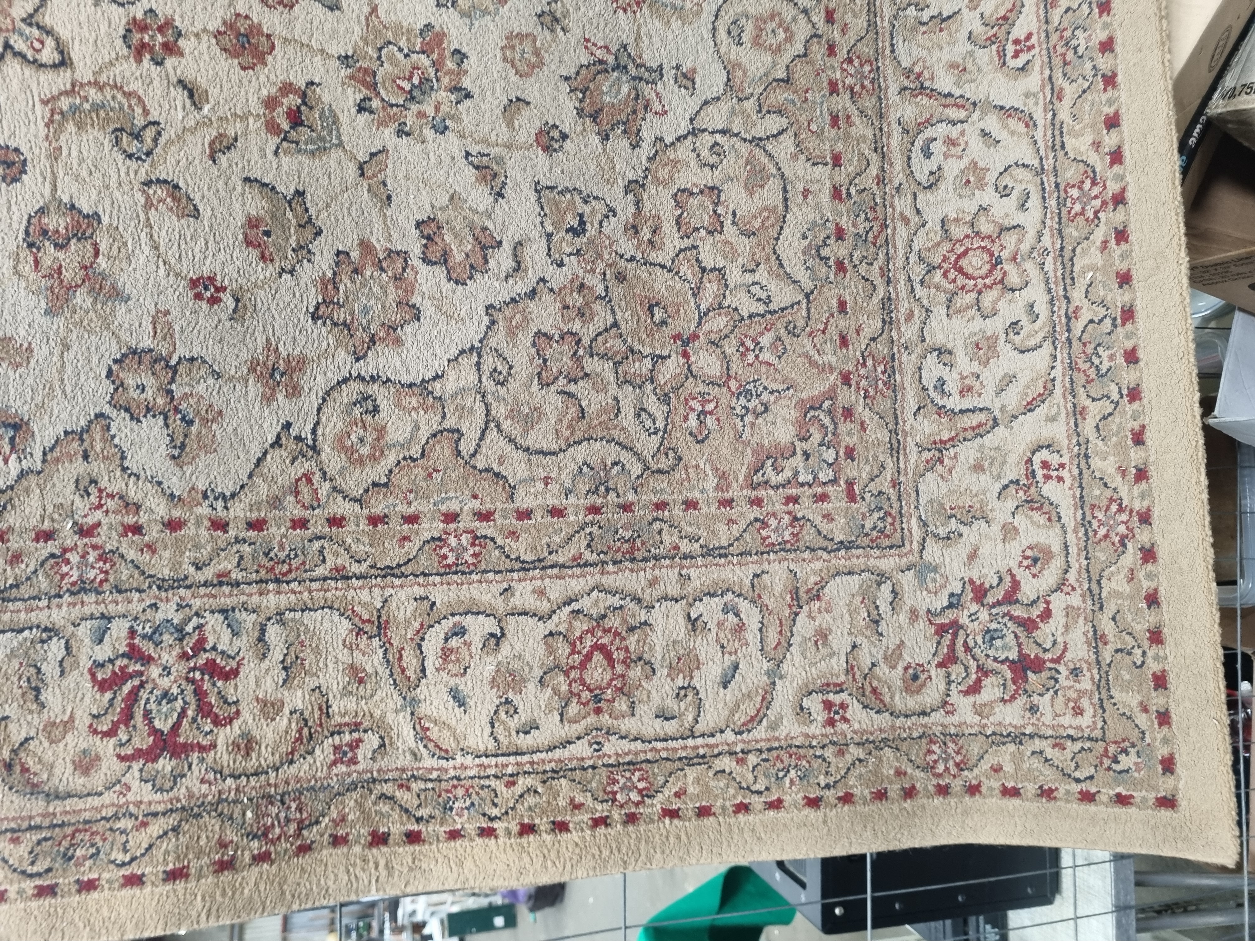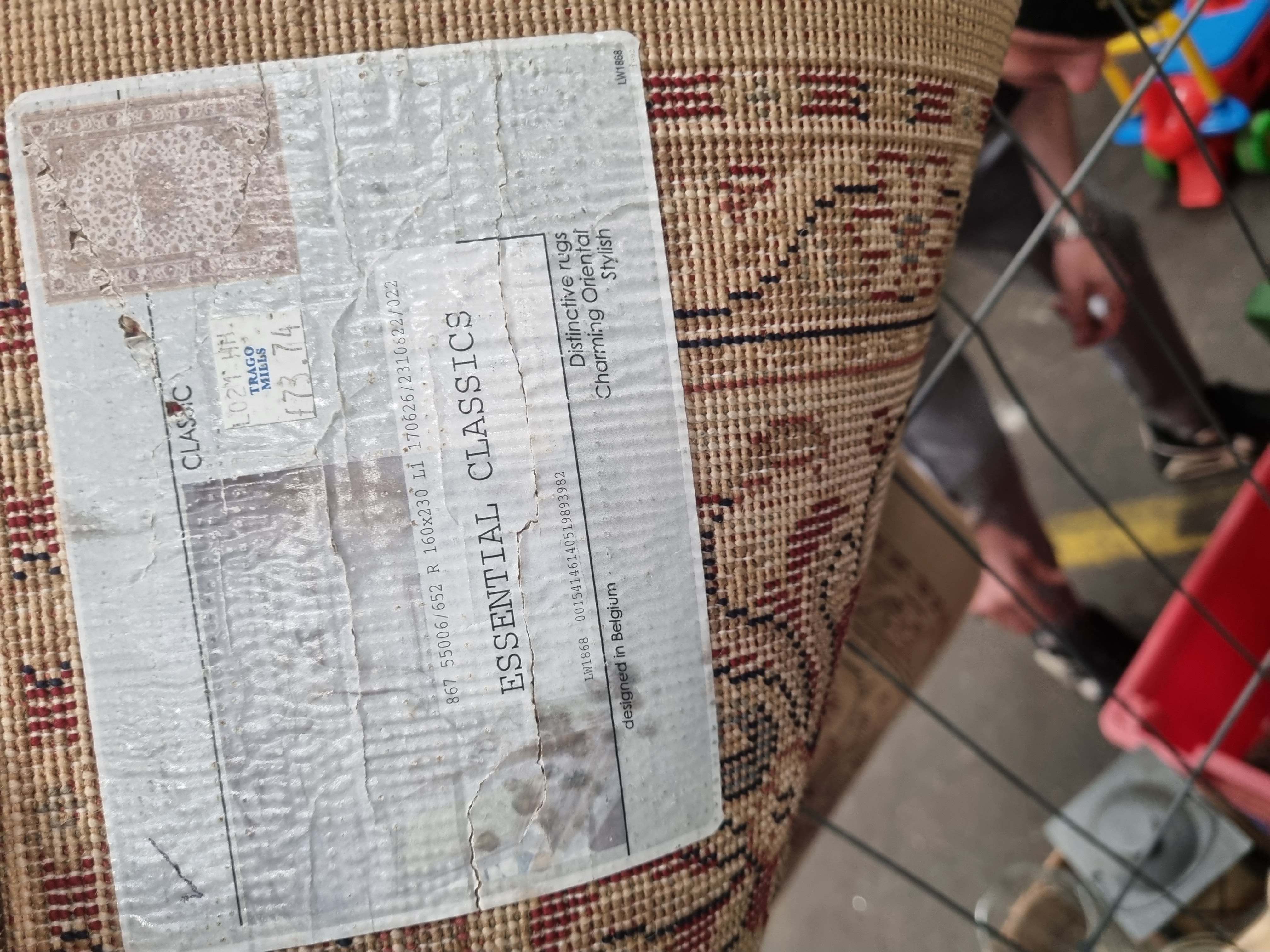 This machine-woven rug is from the Essential Classics collection and was designed in Belgium. It features a traditional Tabriz-inspired pattern, characterised by a large central floral medallion on a cream ground with an all-over design of scrolling vines and palmettes. The field is framed by a decorative multi-banded border containing complementary botanical motifs. The colour palette consists of cream, terracotta red, navy blue, and tan. The reverse side retains the original manufacturer label and a retail tag from the UK retailer Trago Mills.