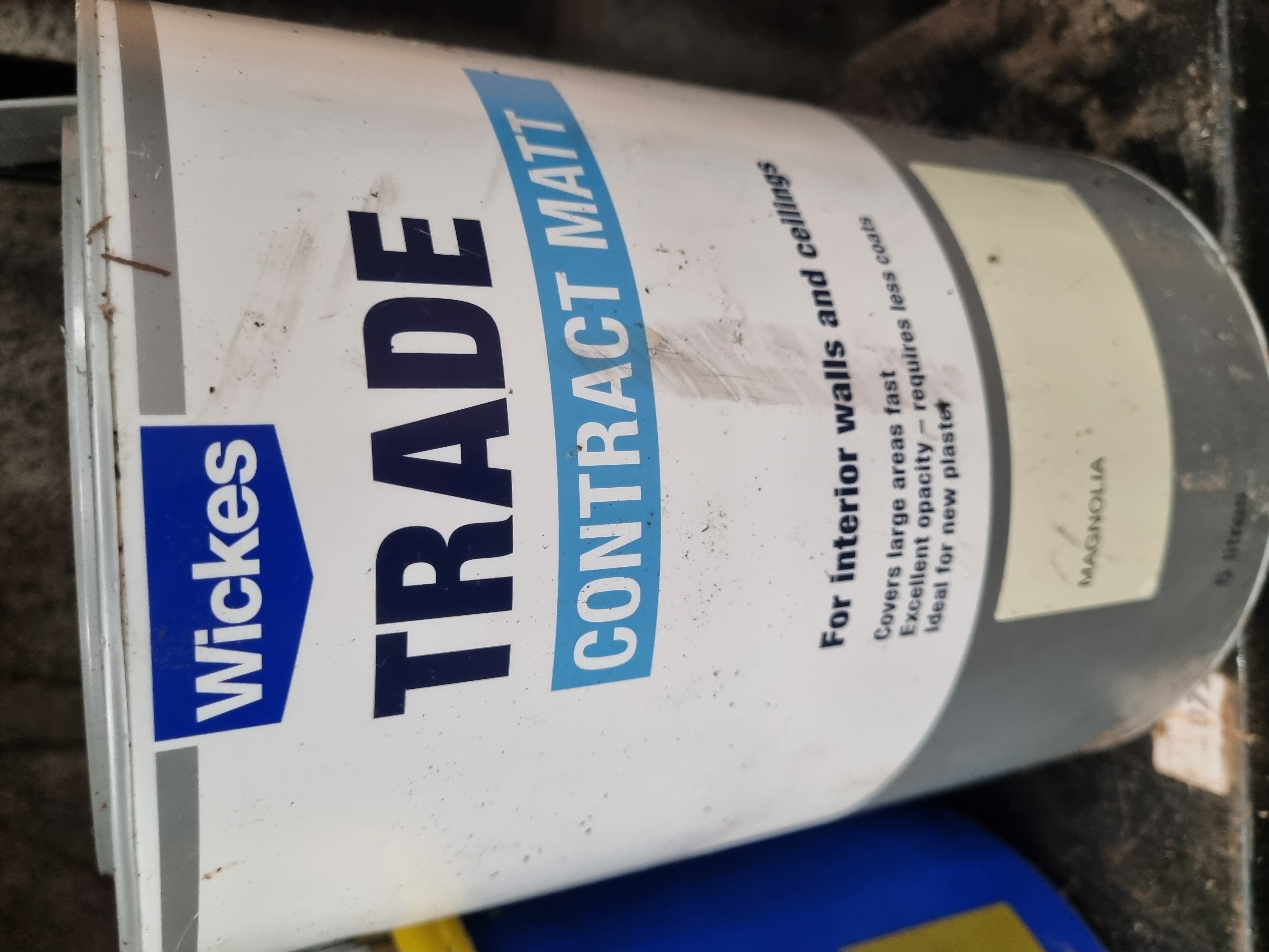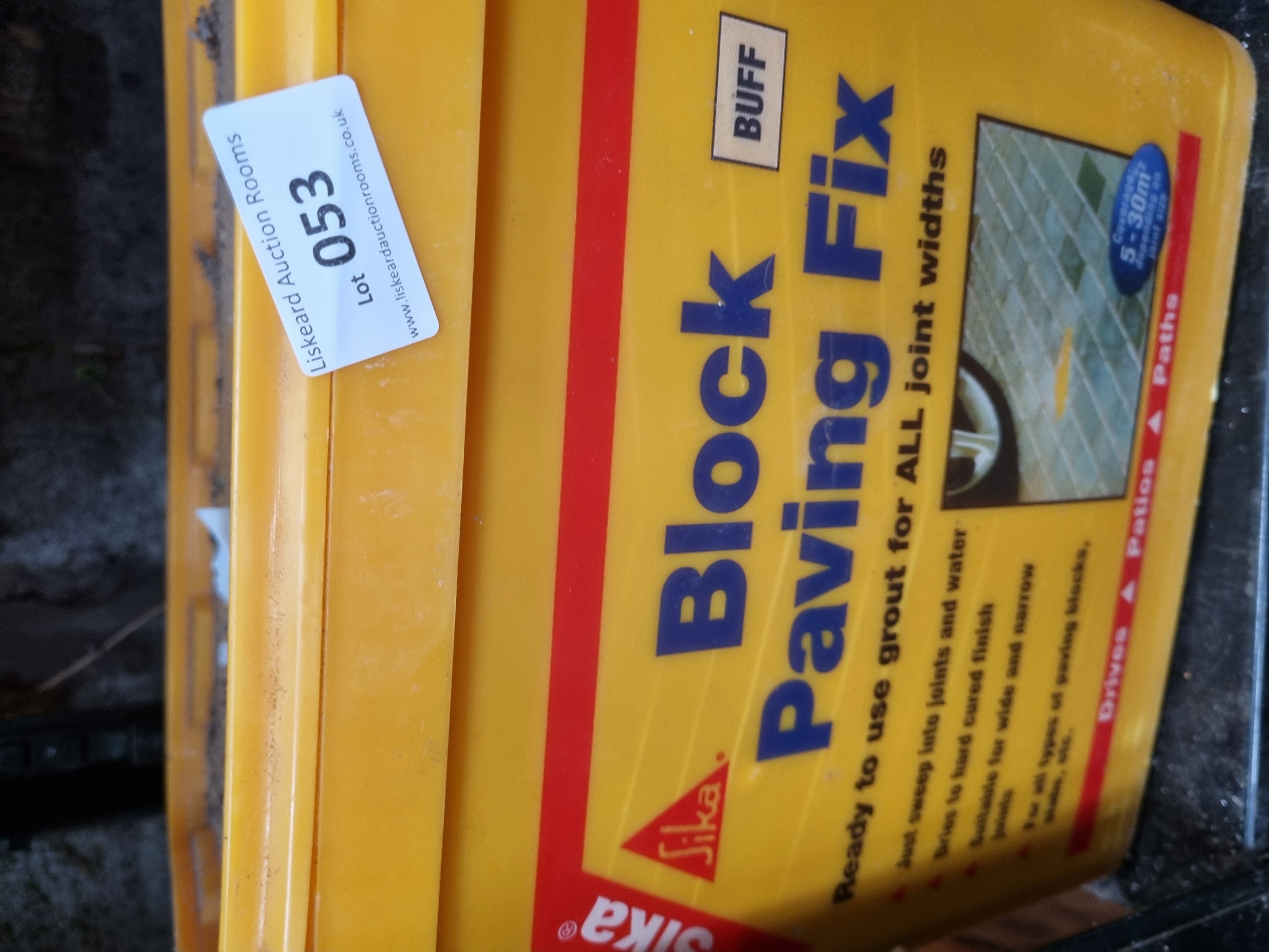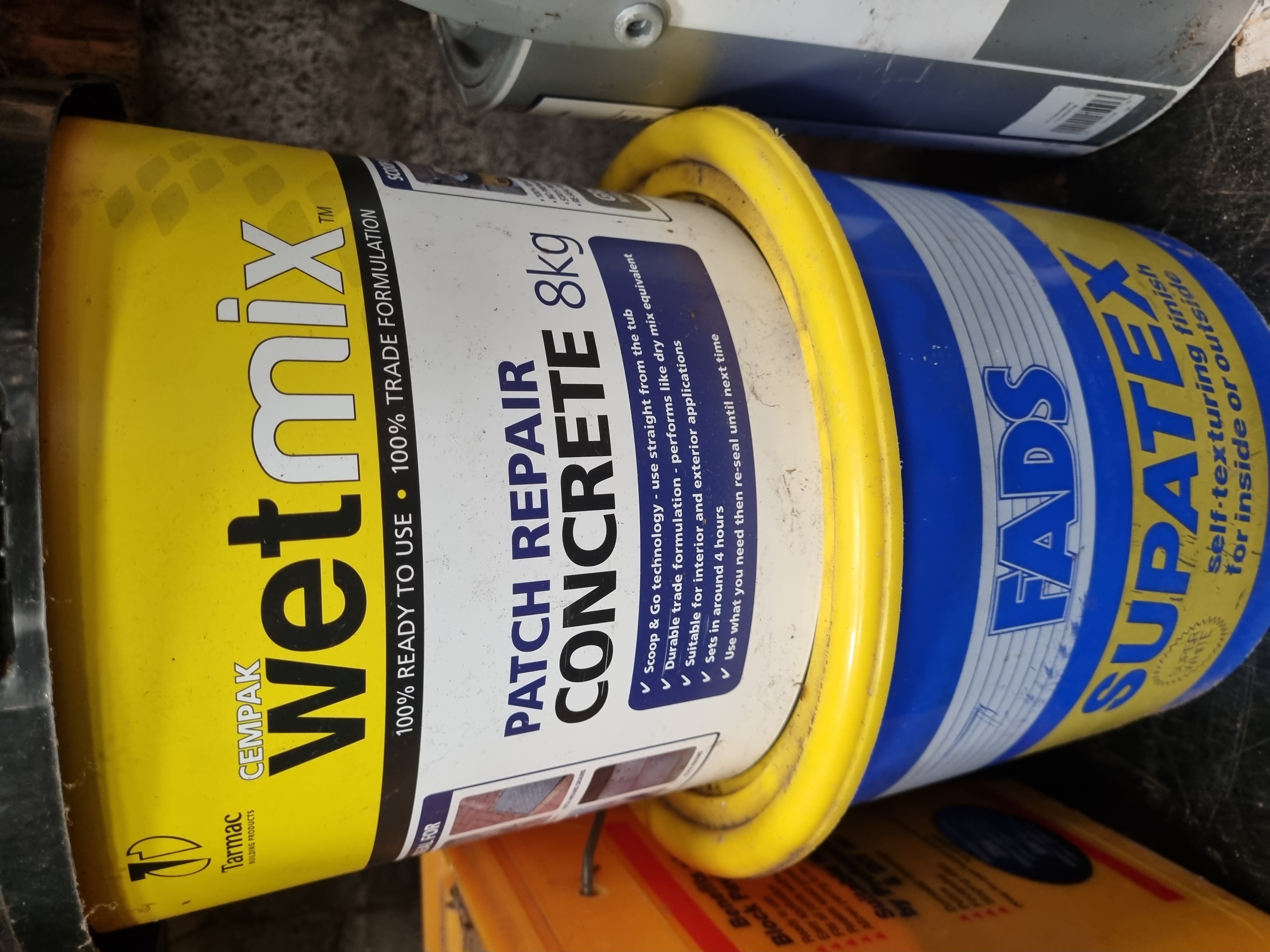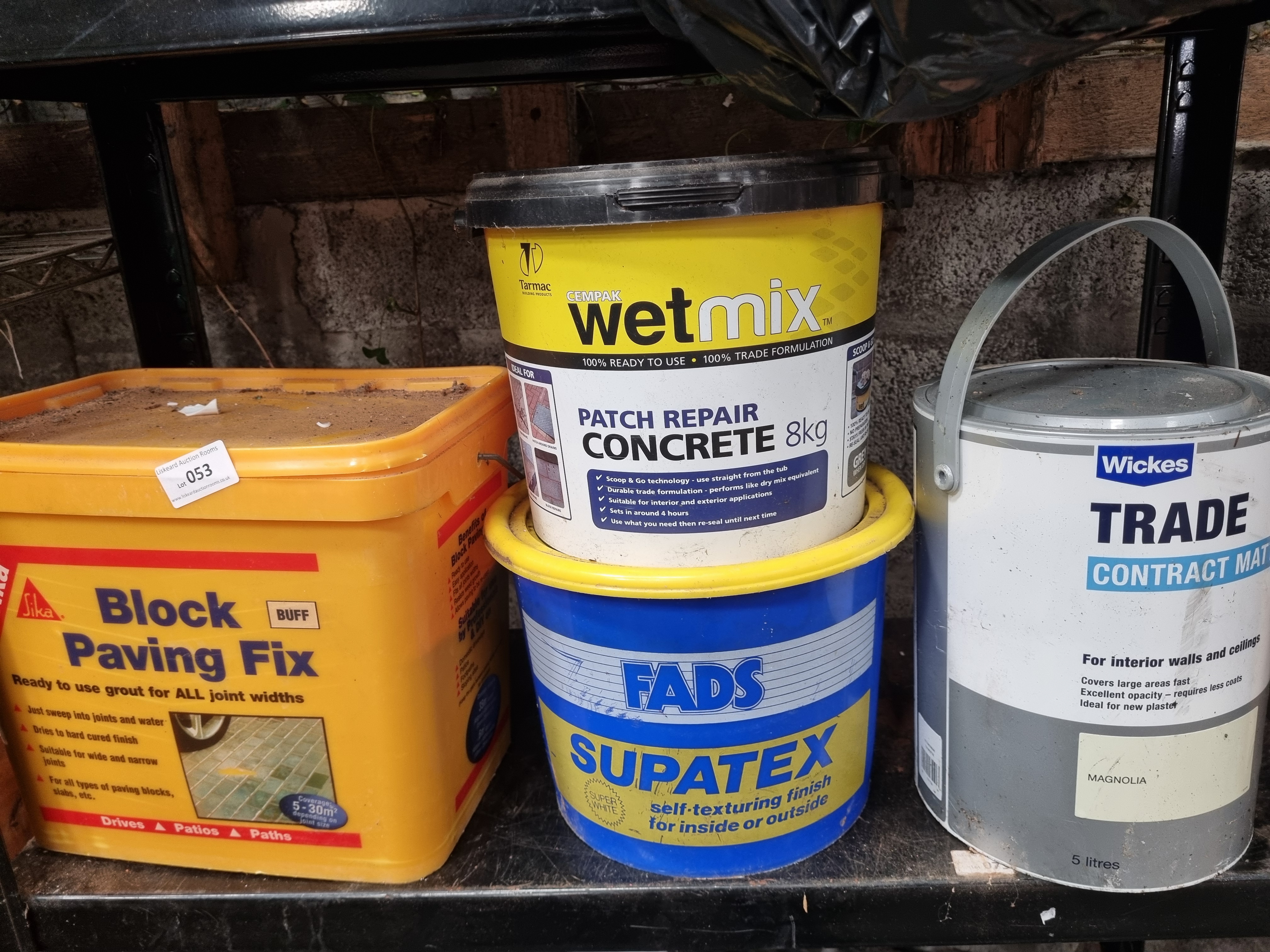 An assortment of trade building and decorating materials. The collection includes a tub of Tarmac Cempak Wetmix Patch Repair Concrete (8kg), a container of Sika Block Paving Fix grout in Buff colour, a tub of FADS Supatex self-texturing finish for interior or exterior use, and a tin of Wickes Trade Contract Matt interior wall and ceiling paint in Magnolia (5 litres). The materials are contained within original plastic tubs and a metal tin. A lot sticker for Liskeard Auction Rooms is visible on the Sika container.