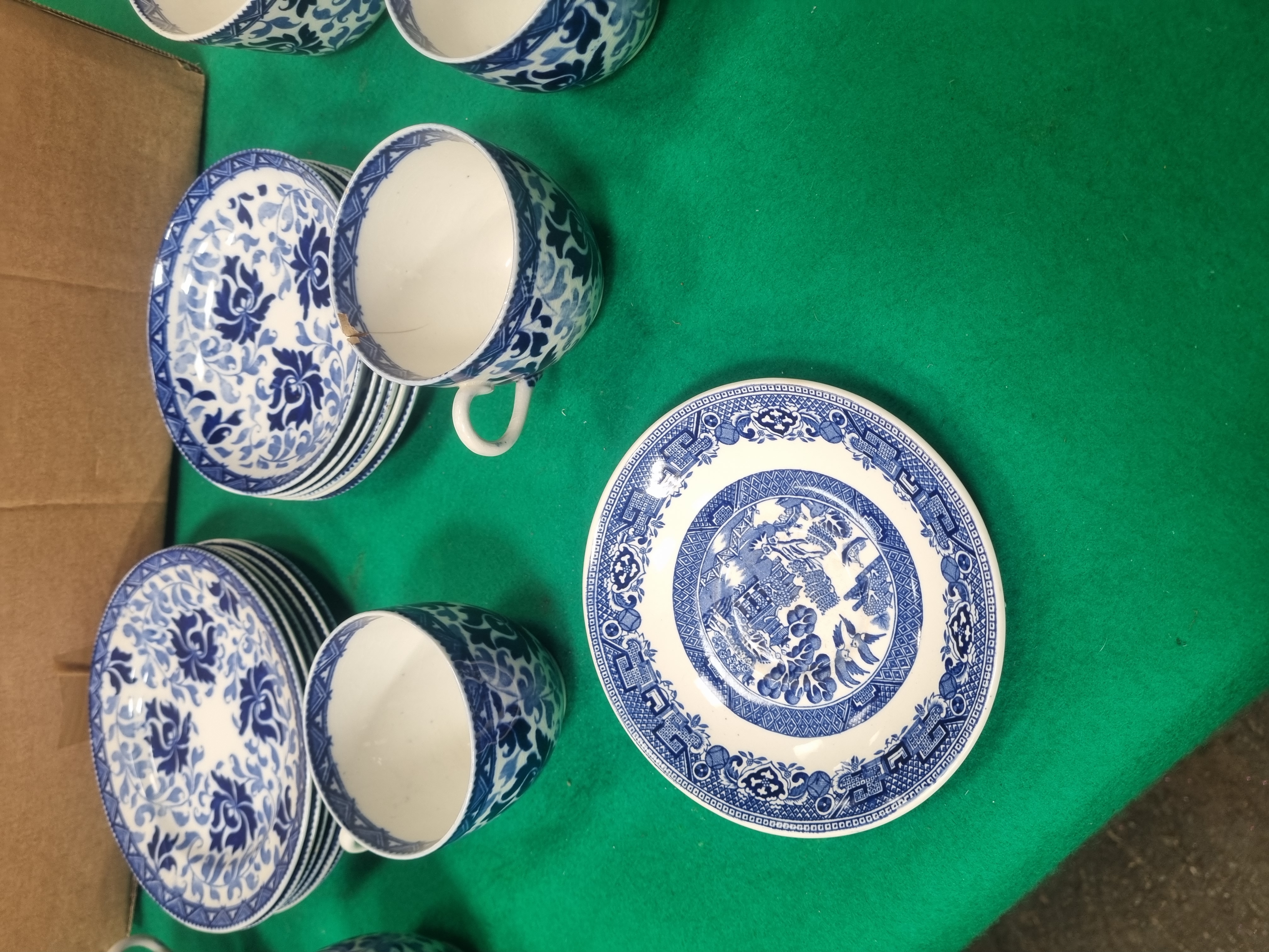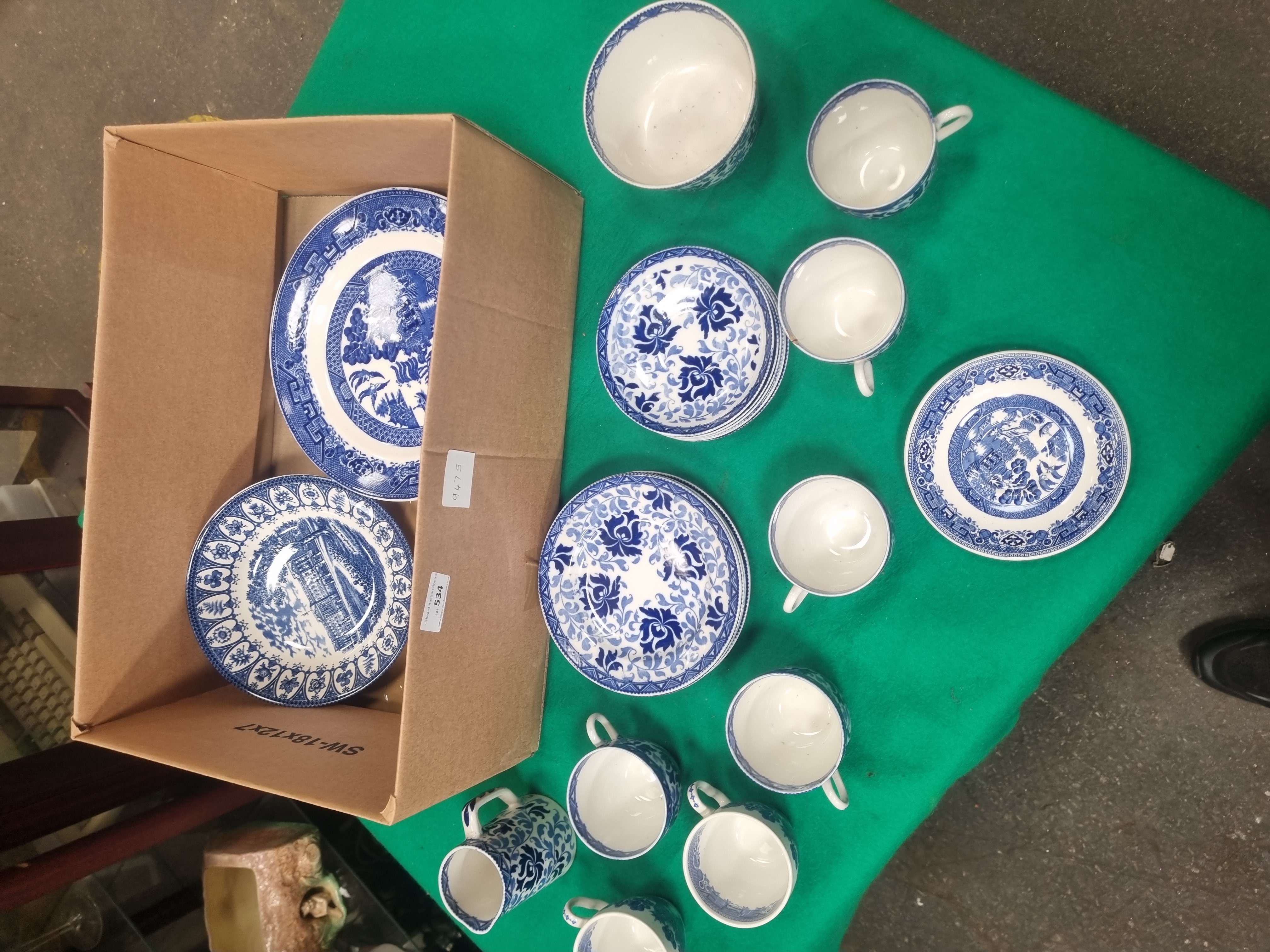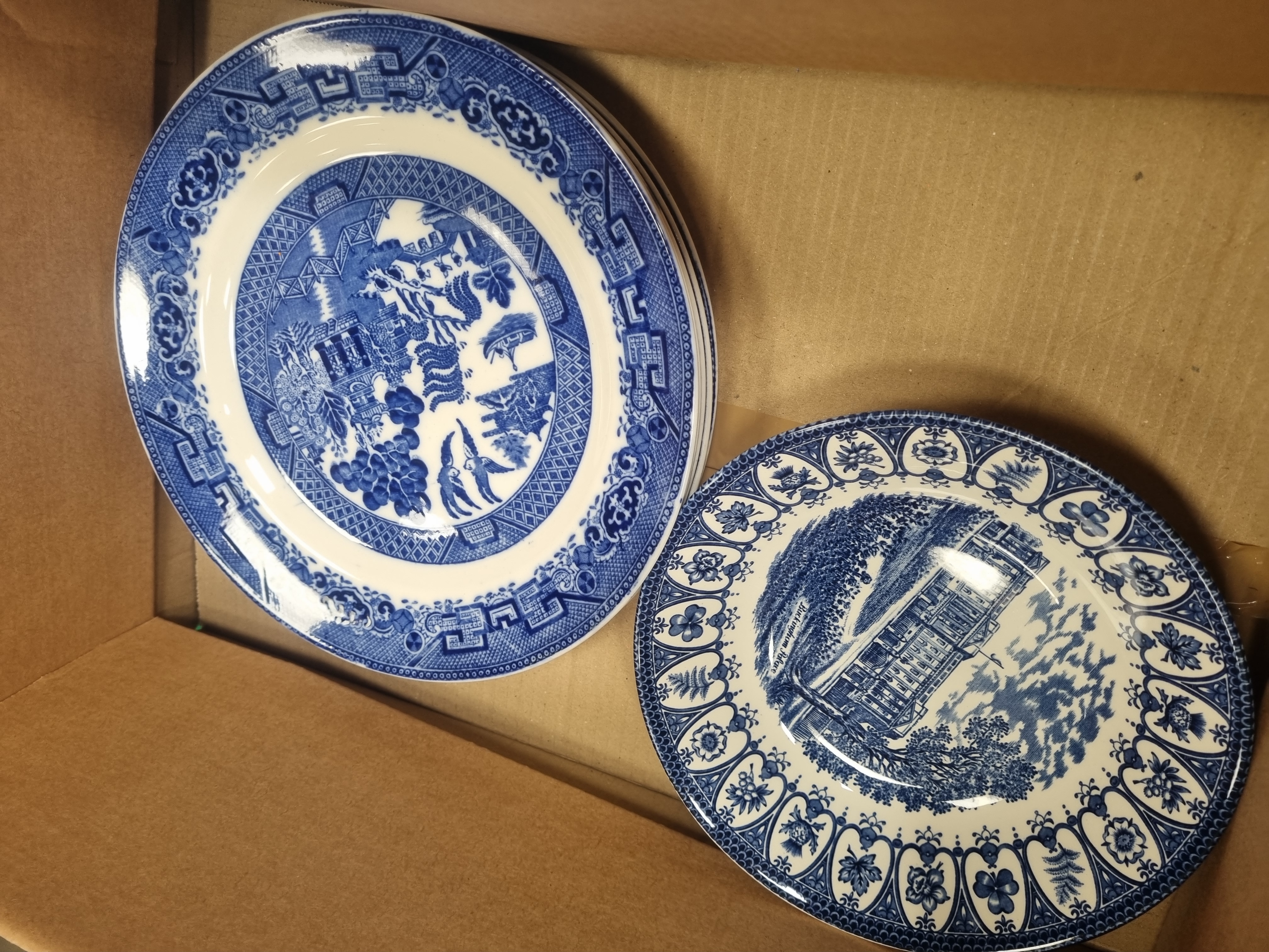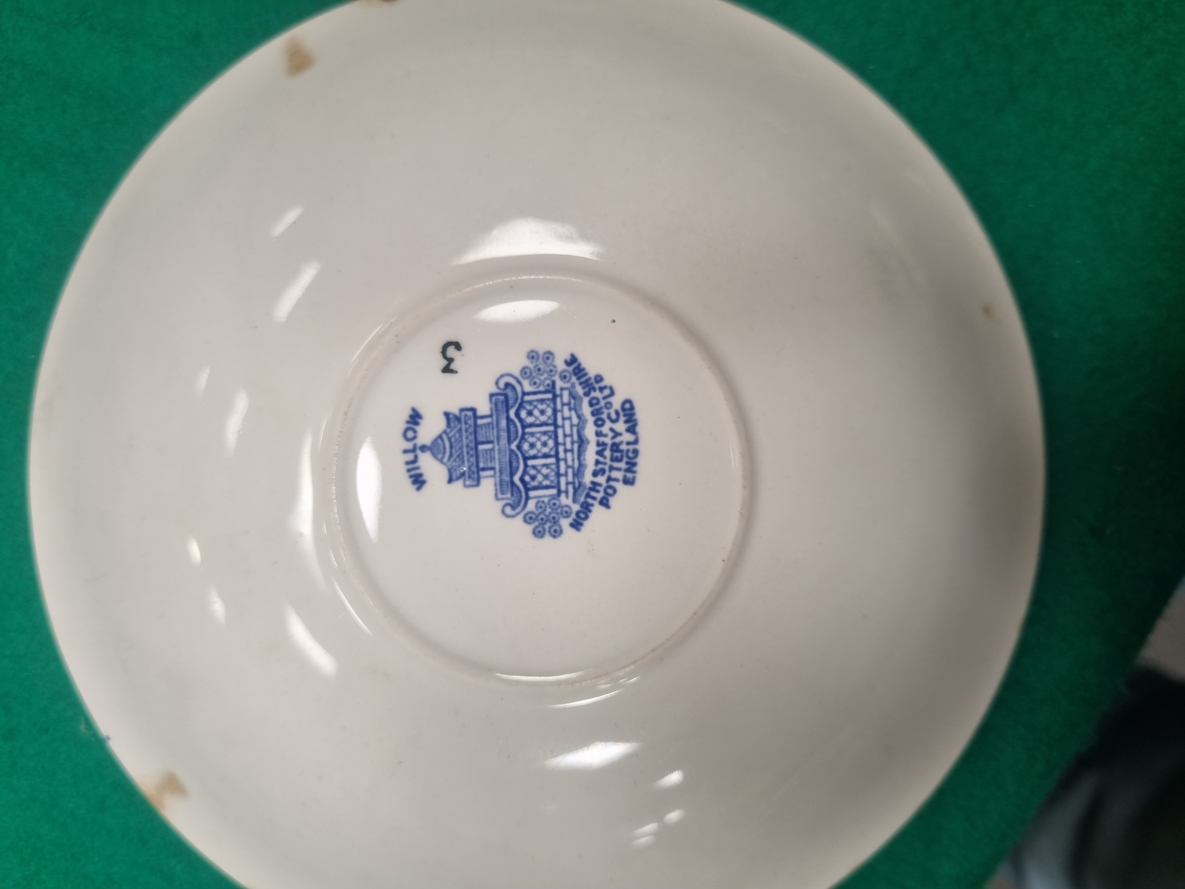 An assortment of English blue and white transfer-printed glazed earthenware tableware produced by various manufacturers. The lot includes items with backstamps for the North Staffordshire Pottery Co. Ltd and Soho Pottery, Cobridge. The collection features several decorative patterns, most notably the traditional Chinoiserie Willow pattern. Other designs include a dense floral and foliate pattern and a topographical plate featuring a central view of Buckingham Palace. The group consists of a stack of Willow pattern dinner plates, a Buckingham Palace decorative plate, multiple floral-patterned teacups and matching saucers, an individual Willow pattern saucer, a large open bowl with a patterned rim, and a mug.