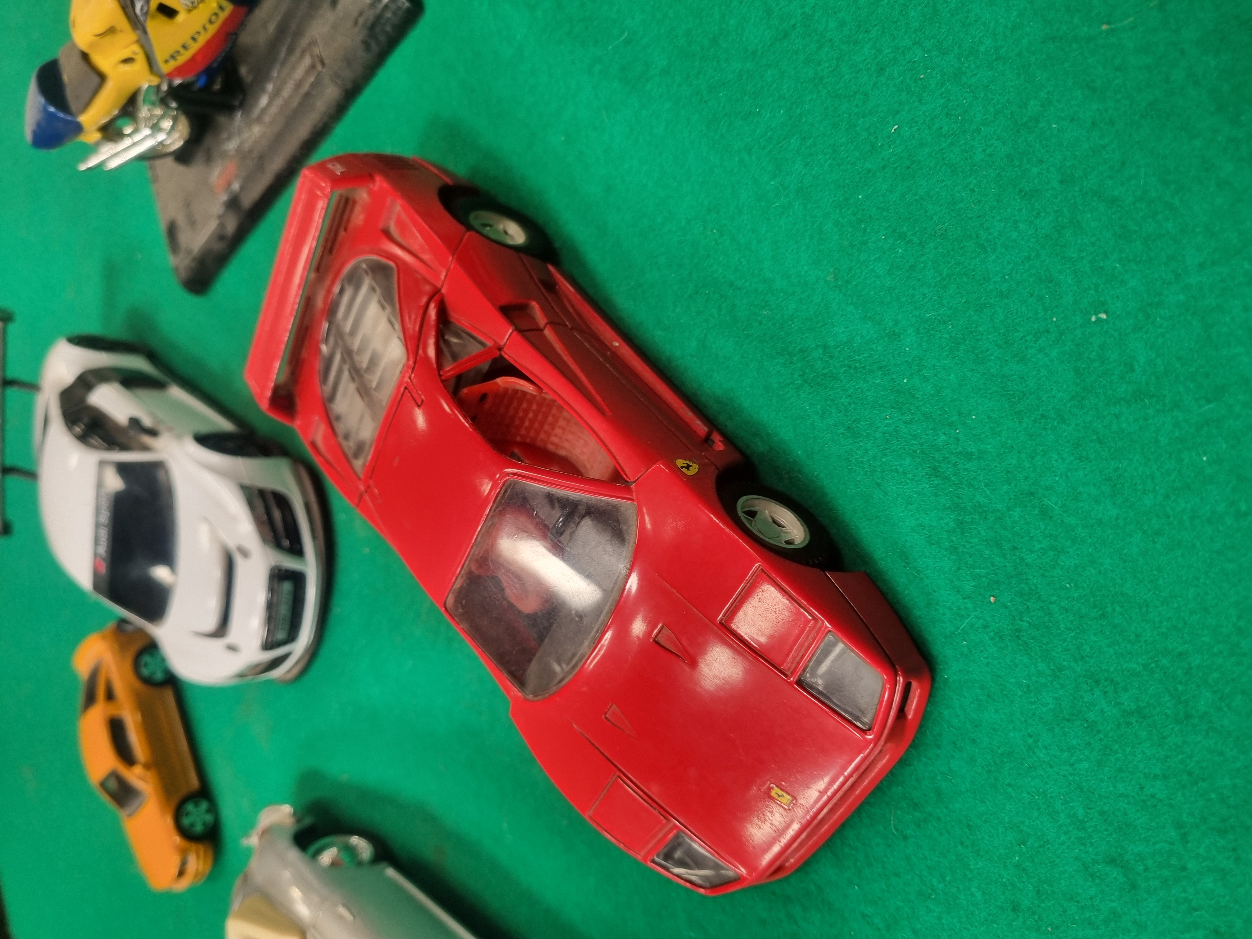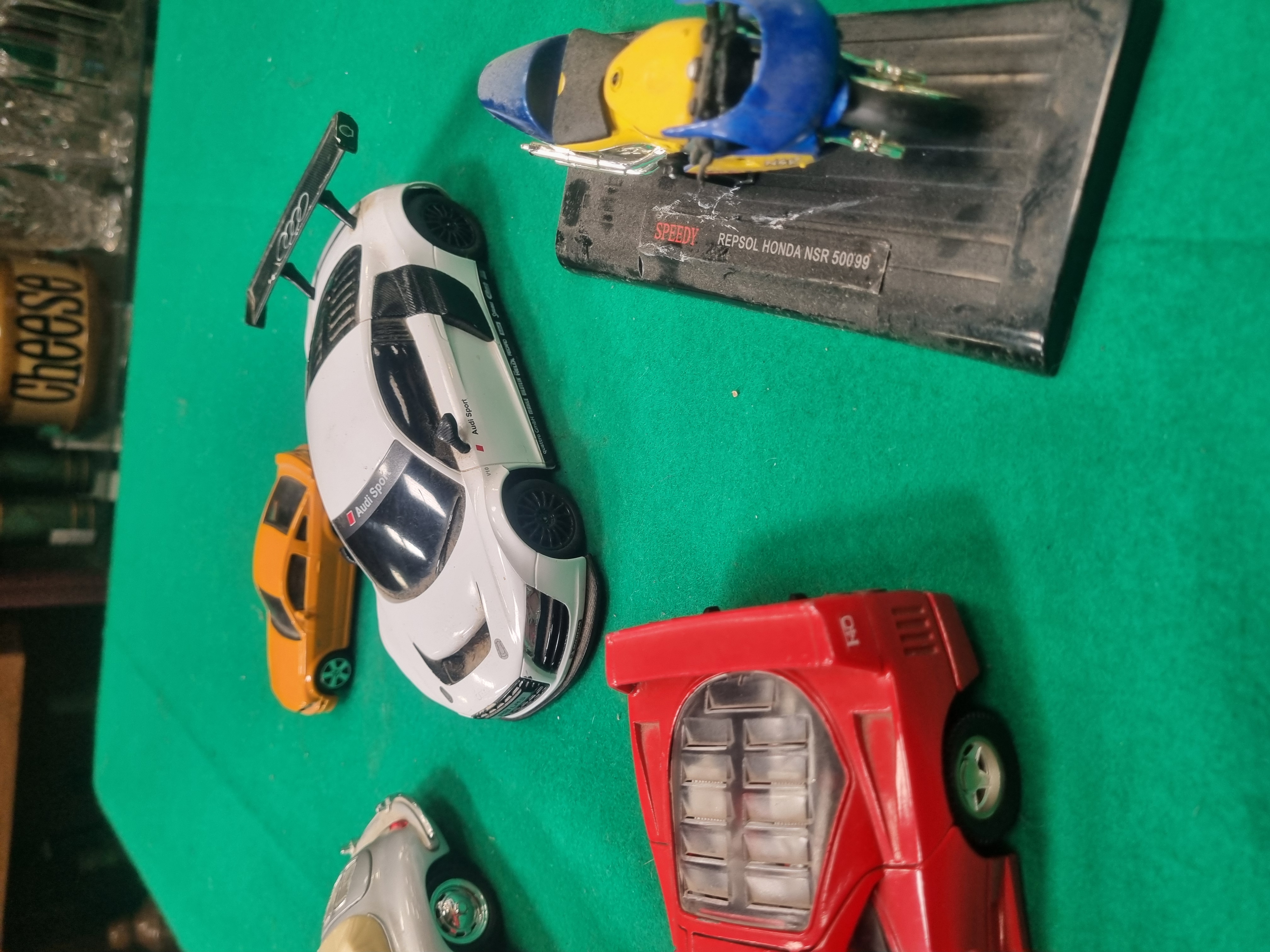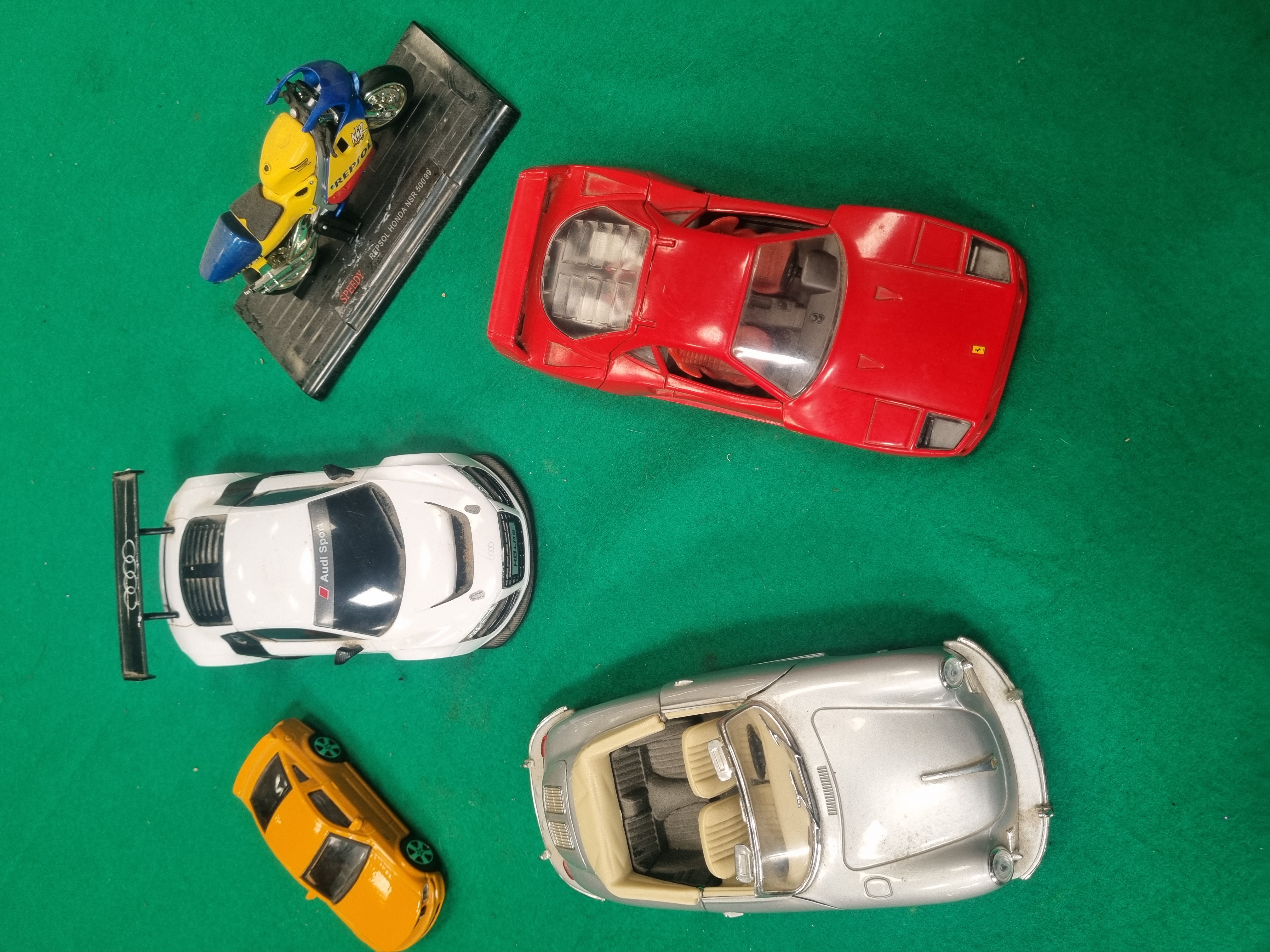 This collection features a variety of die-cast and plastic model vehicles from various manufacturers and scales. The group includes a 1/25 scale Ferrari F40 by Polistil Tonka, finished in red with an opening rear engine cover. The base of the vehicle is embossed with markings including Made in Italy, Polistil, Tonka Corp., Tonka, Ferrari F40, and 1/25. Also included is a 1/24 scale silver Porsche 356B convertible by Welly, featuring a tan interior. The base is marked Welly, Made in China, and Porsche 356B, and carries a secondary paper auction label for Lot 537. The collection is further comprised of a large-scale white Audi R8 LMS race car with Audi Sport and V10 decals and a black rear wing, a Speedy Repsol Honda NSR 500’99 racing motorcycle in blue and yellow livery on its original black display plinth, and a small-scale orange toy sports car.