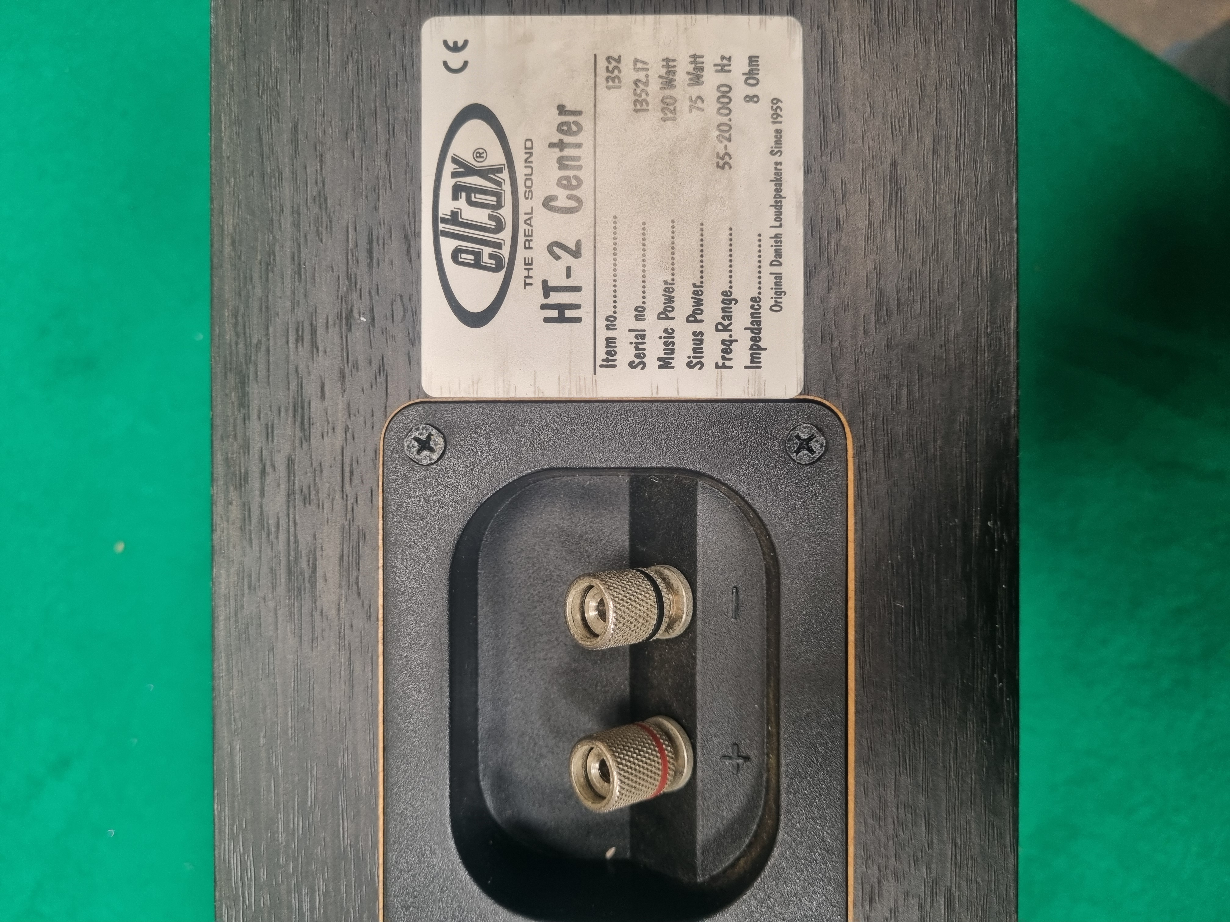An Eltax HT-2 Centre channel loudspeaker finished in a black wood-effect veneer. The unit features a dual-woofer configuration with a central tweeter positioned behind a removable black fabric-covered grille. The manufacturer logo is present on the front grille, the tweeter faceplate, and the rear identification label. Technical specifications listed on the rear label include a music power rating of 120 Watts, sinus power of 75 Watts, a frequency range of 55-20,000 Hz, and an impedance of 8 Ohms. The label identifies the unit as item number 1352 with serial number 1352.17 and notes the brand as Original Danish Loudspeakers Since 1959. Connectivity is provided via a single pair of binding post terminals located in a recessed rear panel.