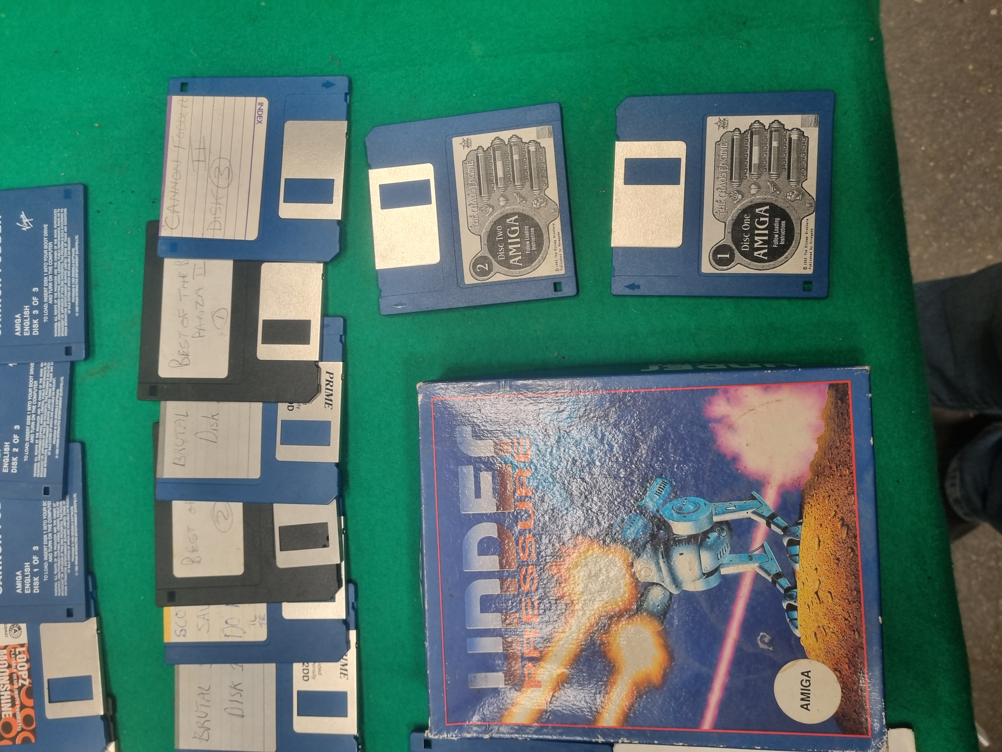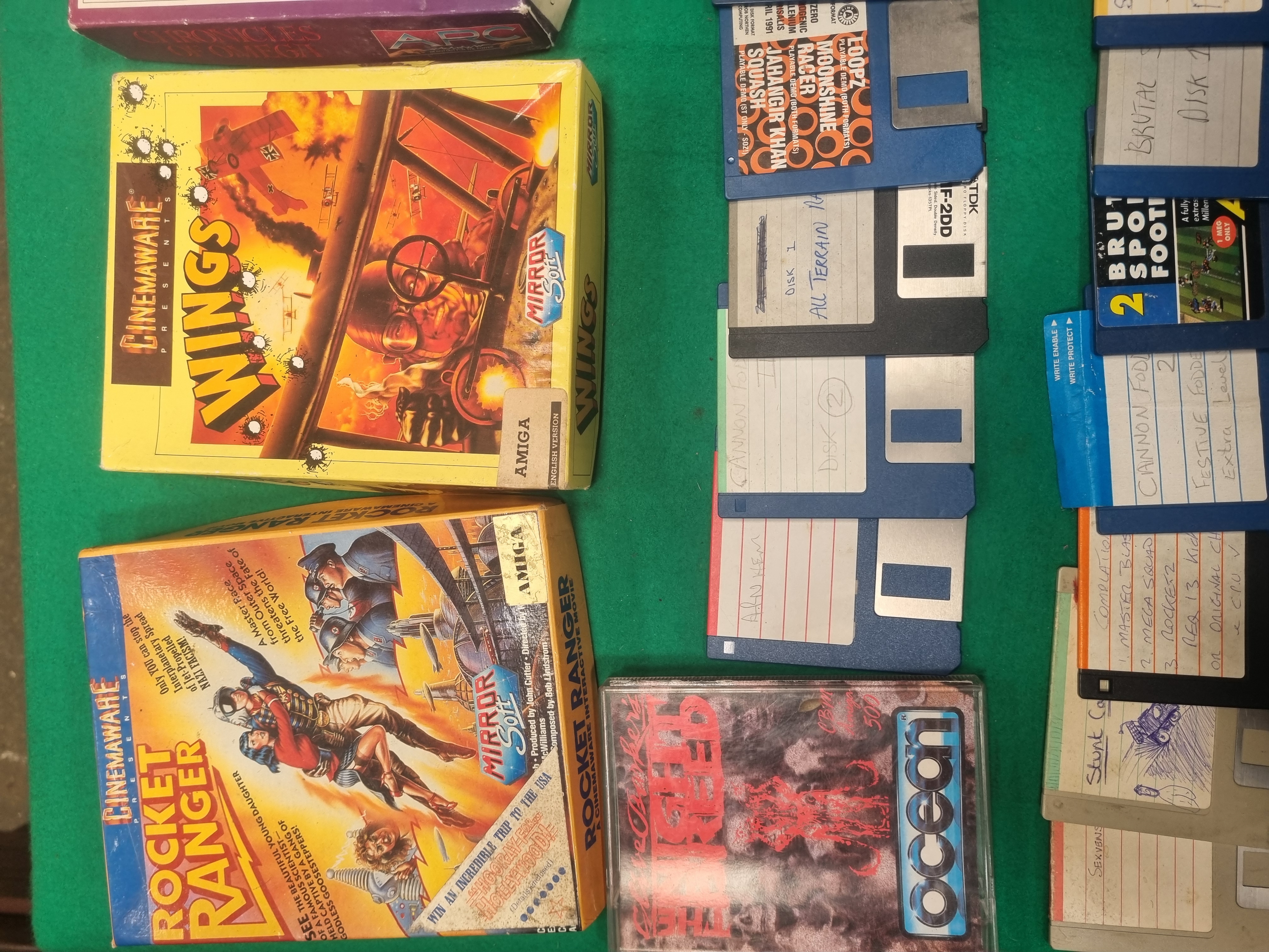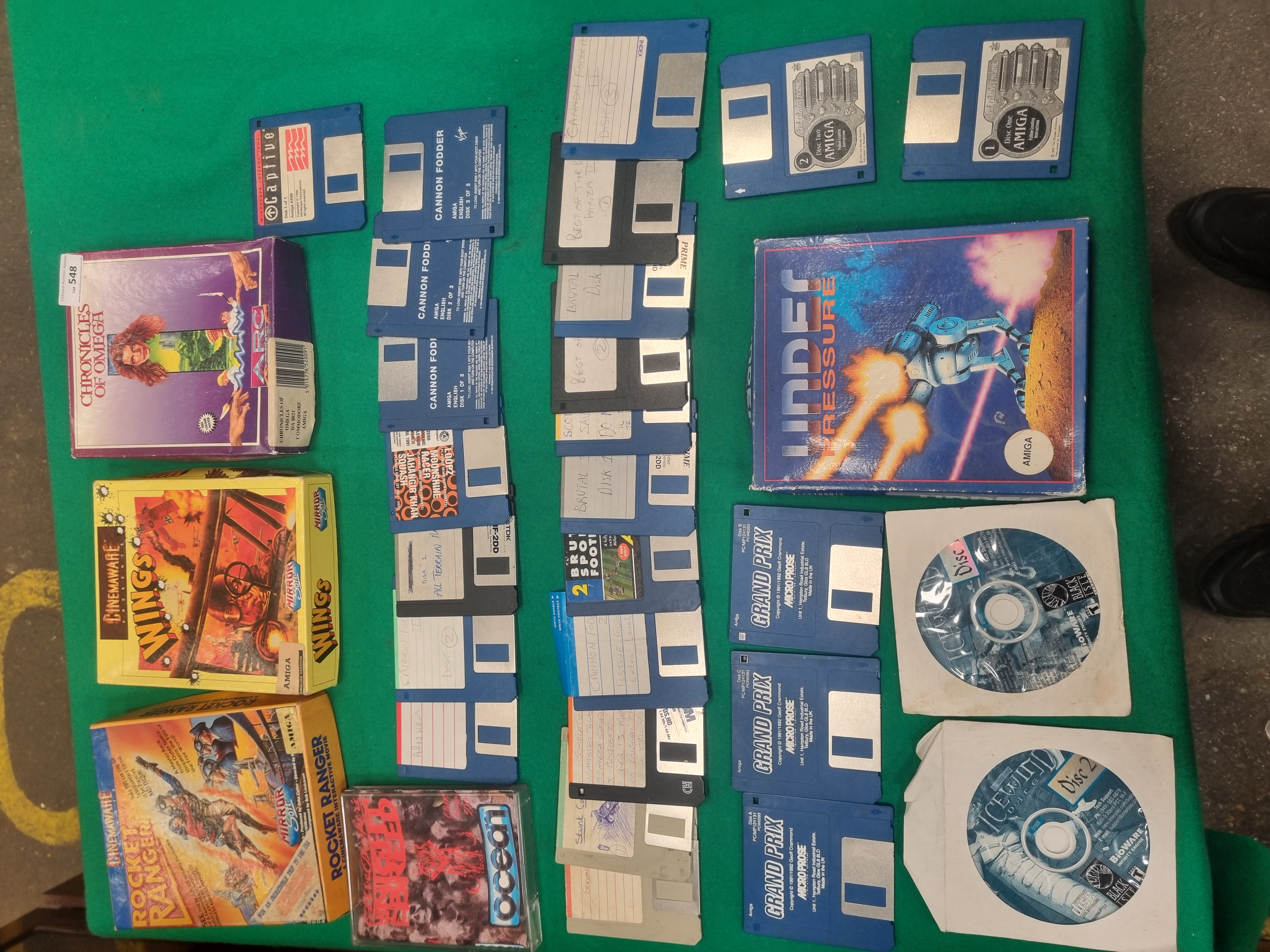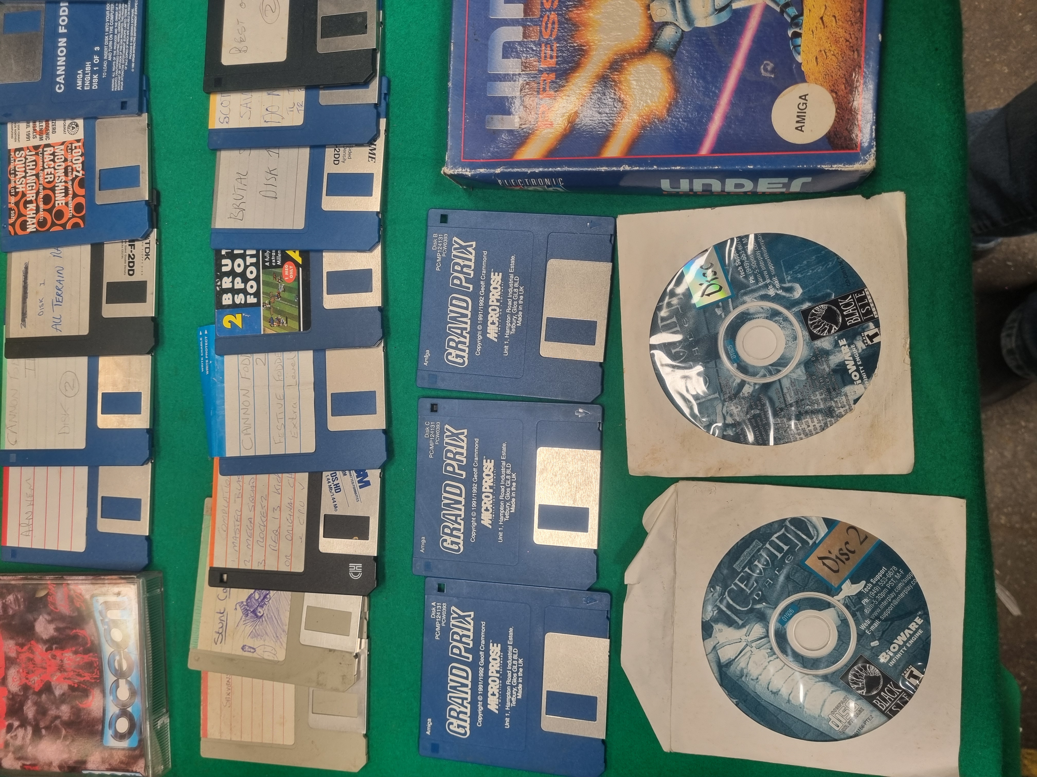This collection features an assortment of vintage computer software, primarily for the Commodore Amiga system, alongside PC CD-ROM titles. Notable boxed games include Chronicles of Omega published by ARC, Wings and Rocket Ranger by Cinemaware under the Mirrorsoft label, and Under Pressure by Electronic Arts is an empty box only. The lot also contains Speedball 2: Brutal Deluxe by Ocean in a jewel case. The collection includes a variety of 3.5-inch floppy disks, with retail examples such as Captive by Mindscape, a three-disk set of Cannon Fodder by Virgin, a two-disk set of The Chaos Engine by Renegade, and a three-disk set of Formula One Grand Prix by MicroProse. Several magazine cover disks and handwritten backup disks are present, featuring titles such as Cannon Fodder II, Stunt Car Racer, and All Terrain Racing. PC software is represented by two Icewind Dale CD-ROMs in paper sleeves, developed by BioWare and Black Isle. The items are constructed from printed cardboard, plastic, and magnetic/optical media.